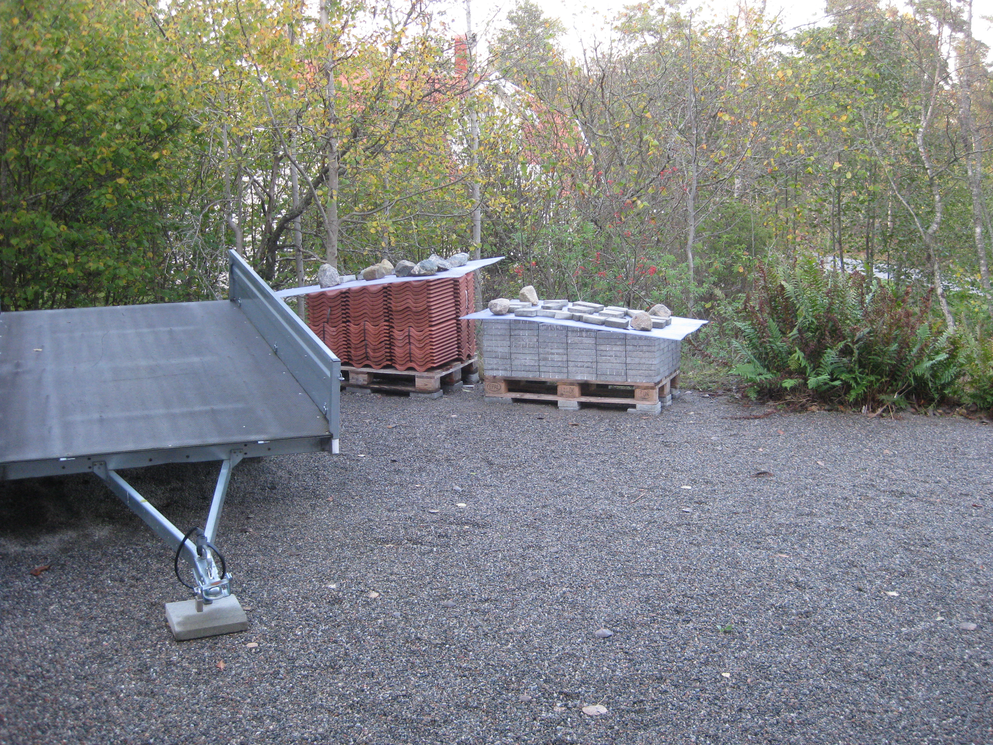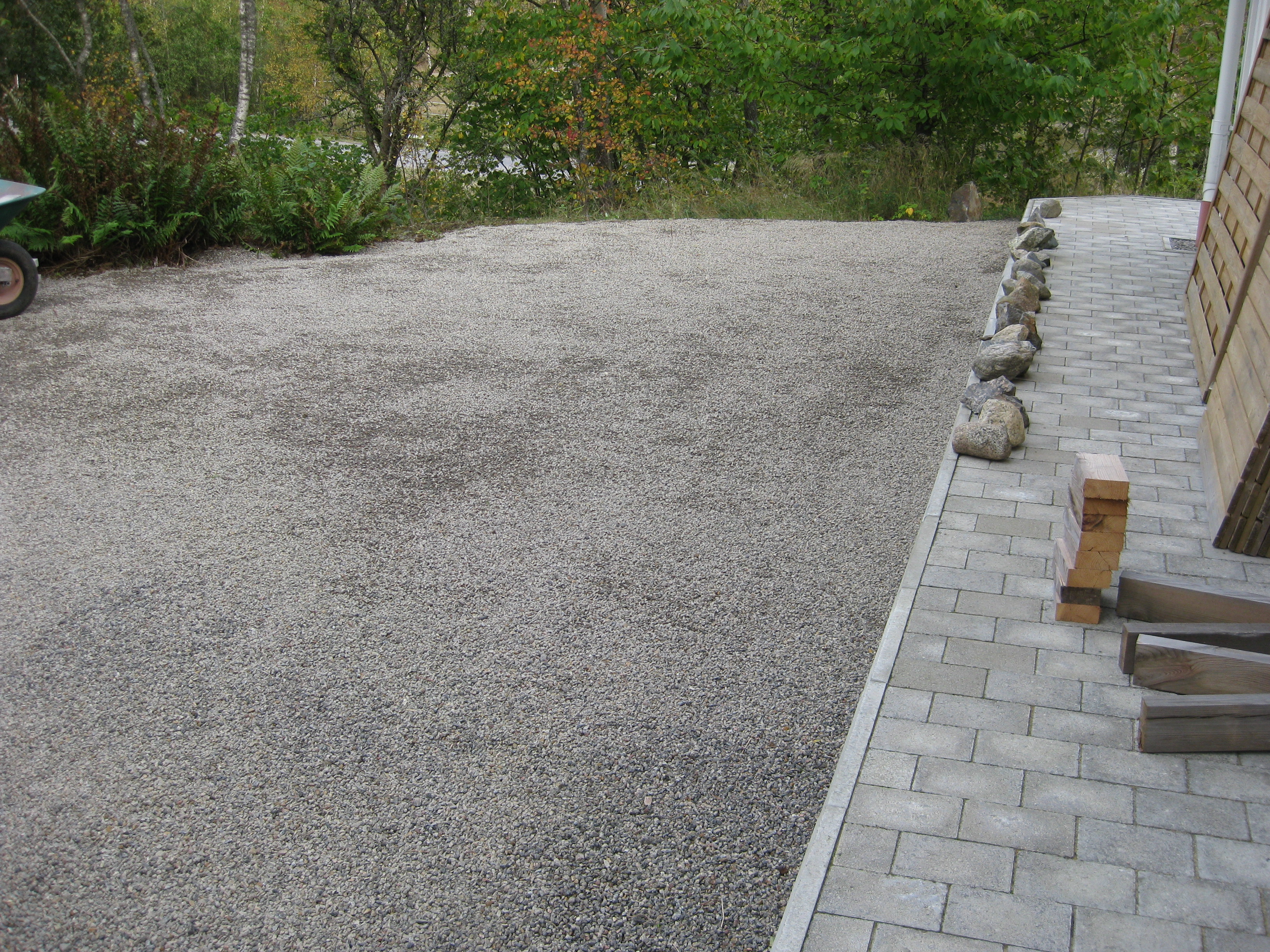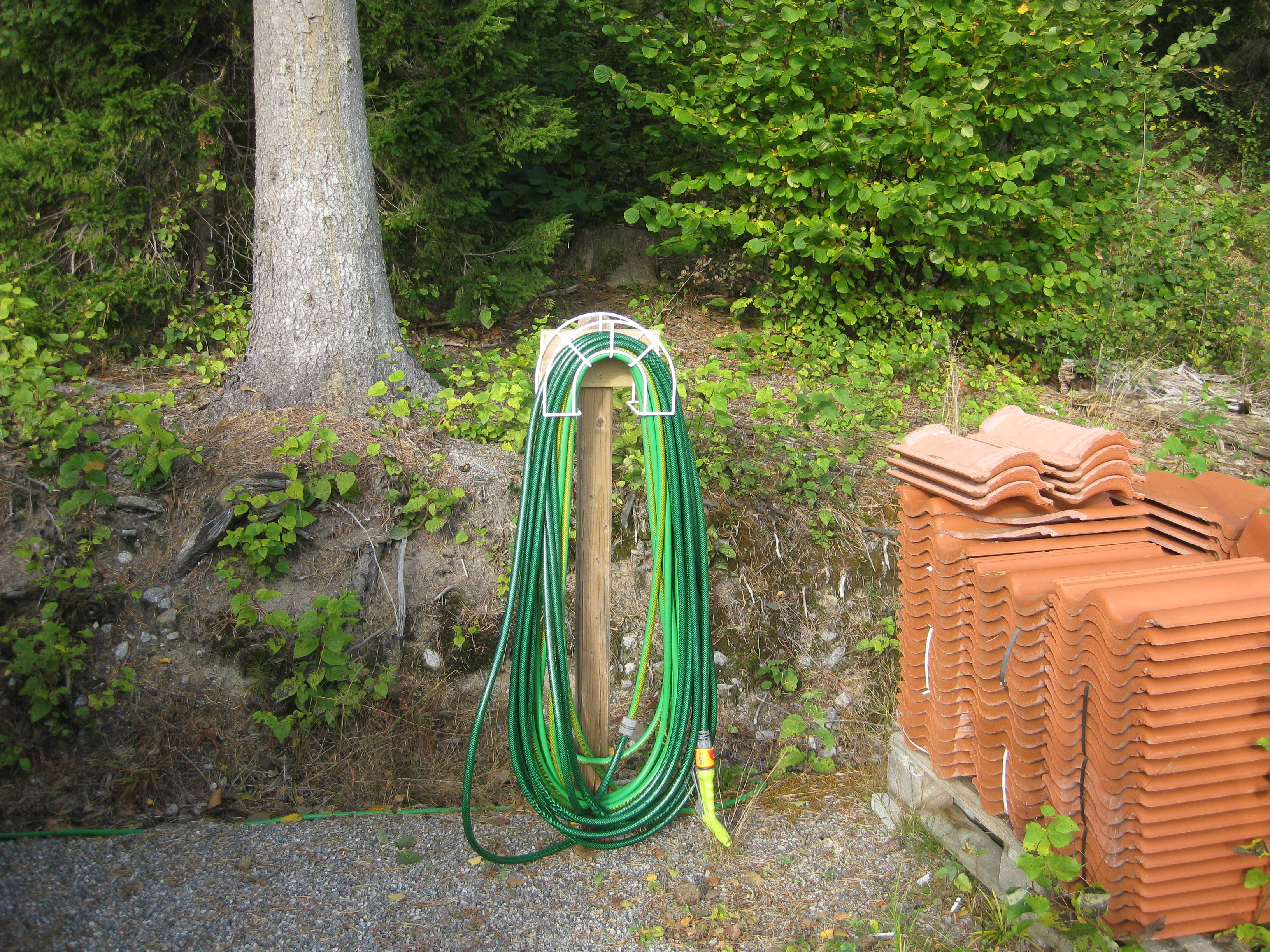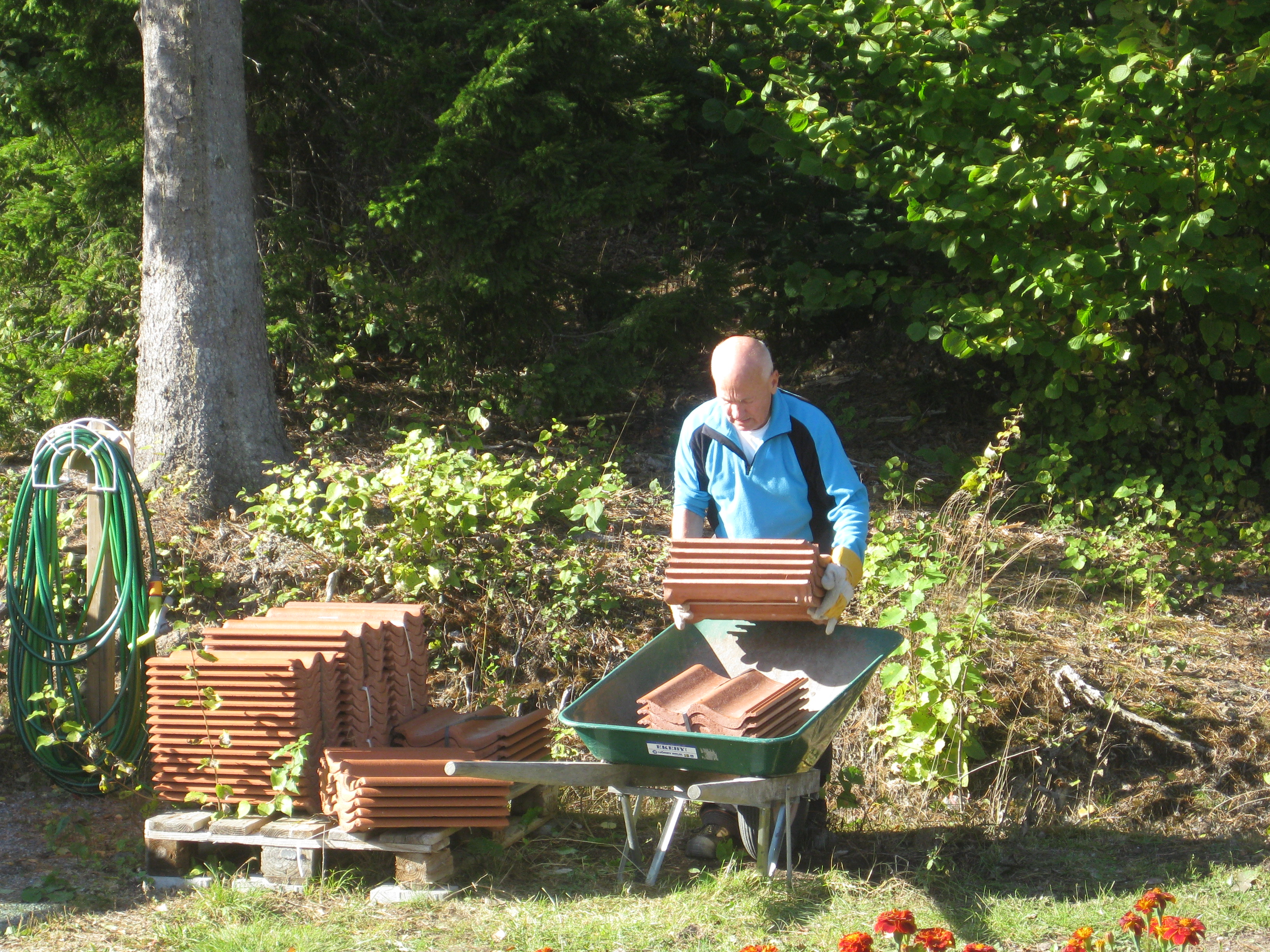 Håkan har ordnat upphängning till vattenslangarna och burit in ved i garaget och lagt plattor fram till verkstaden. Fint!