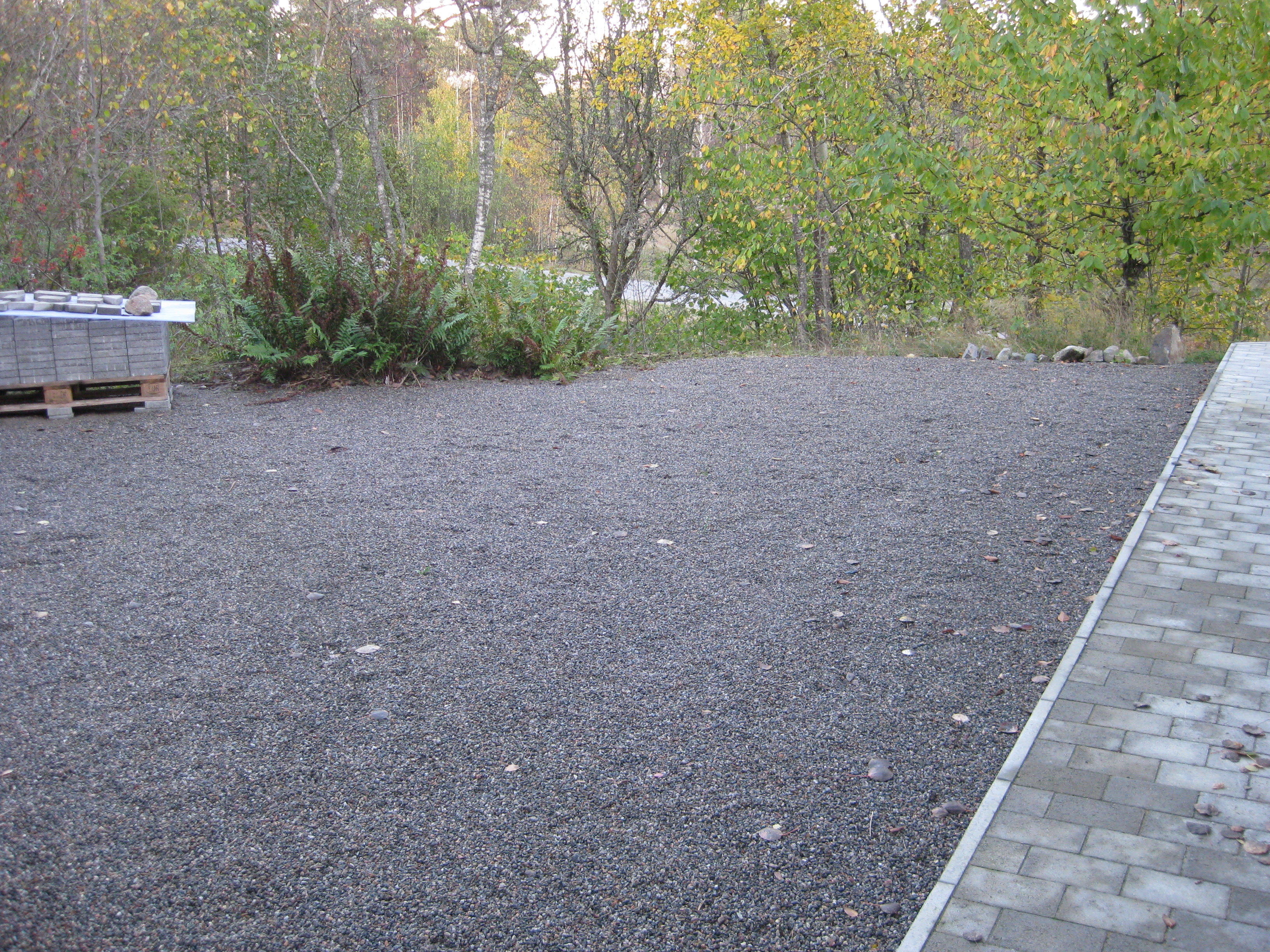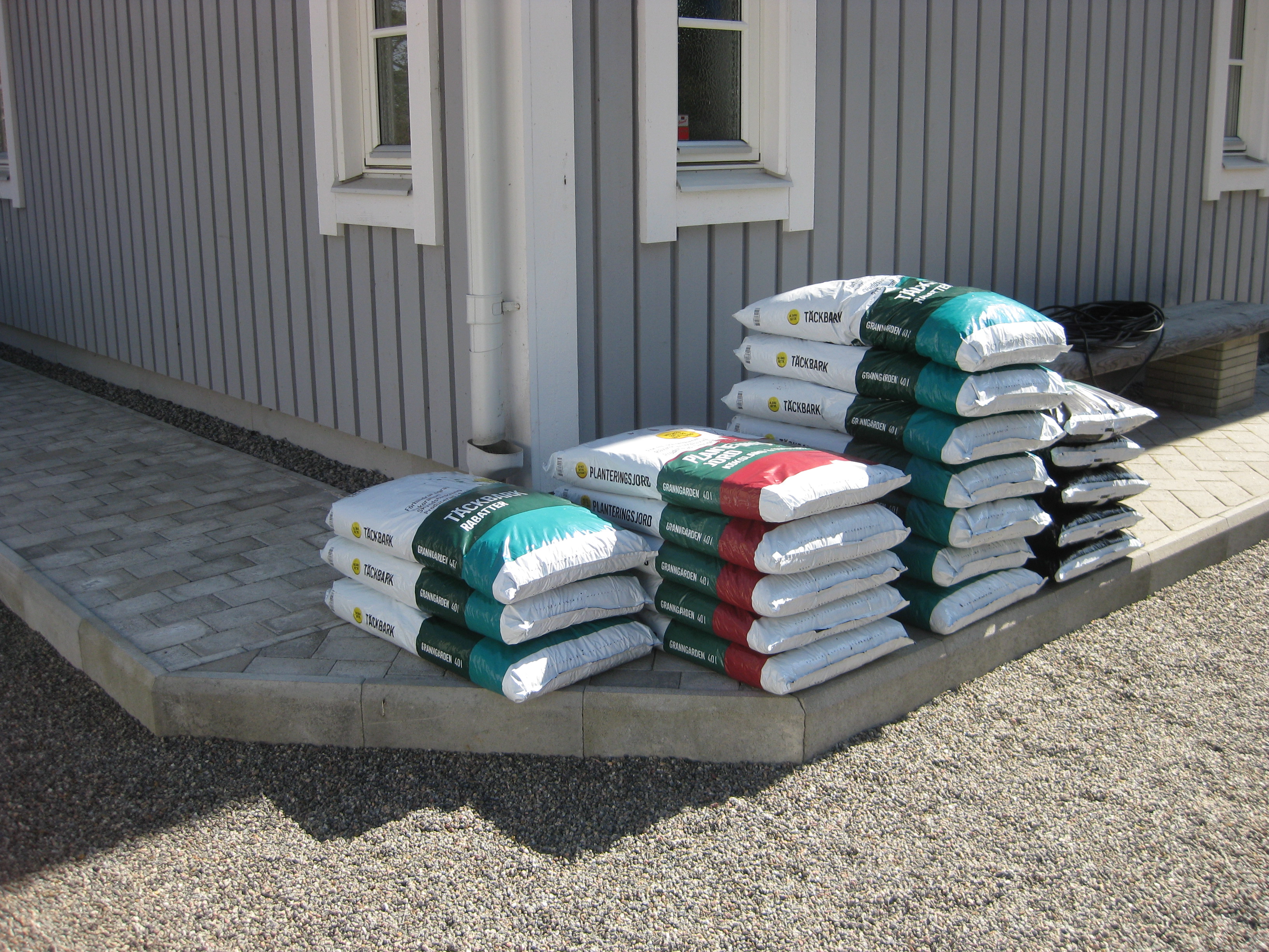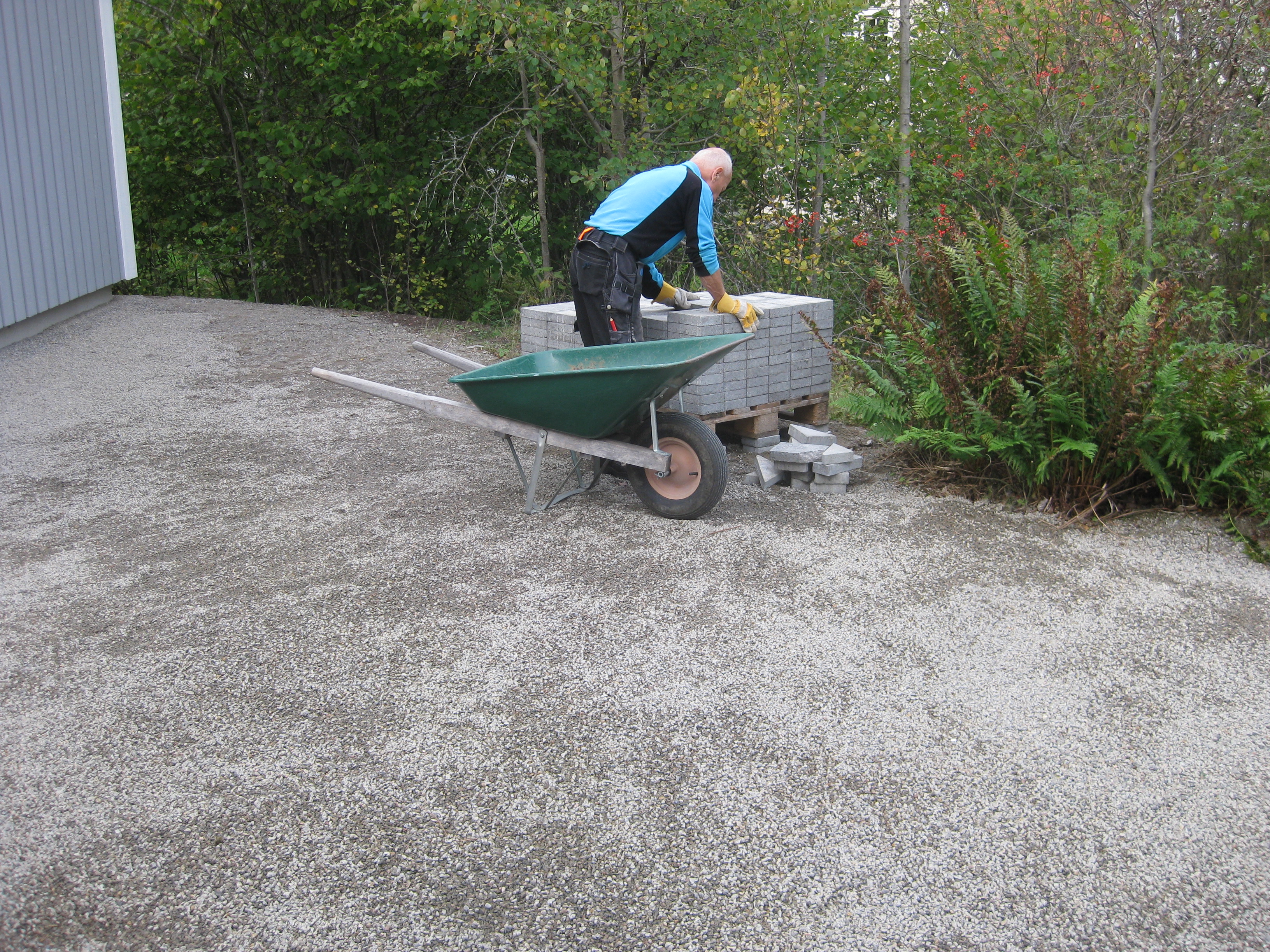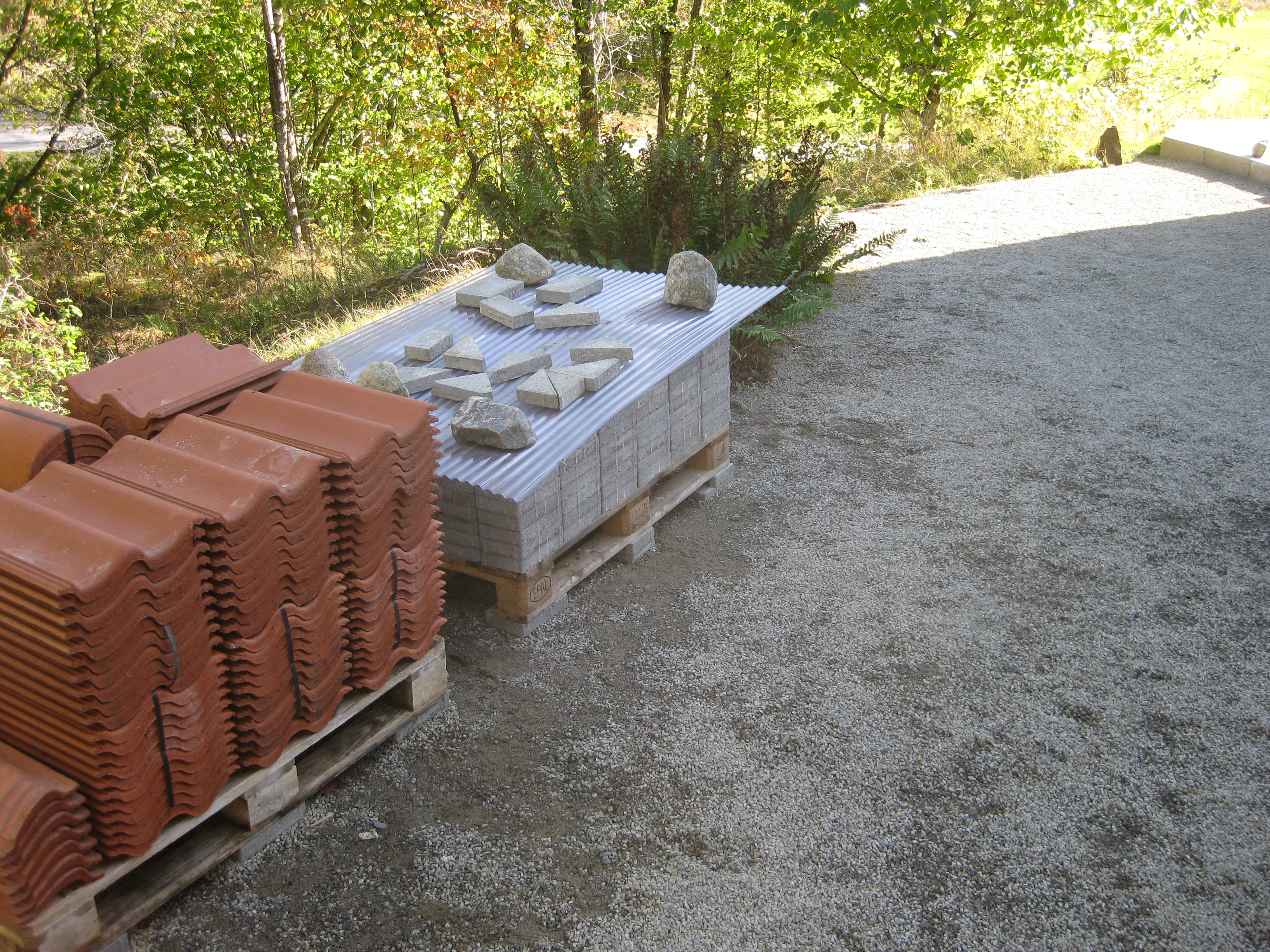 Håkan har ordnat upphängning till vattenslangarna och burit in ved i garaget och lagt plattor fram till verkstaden. Fint!