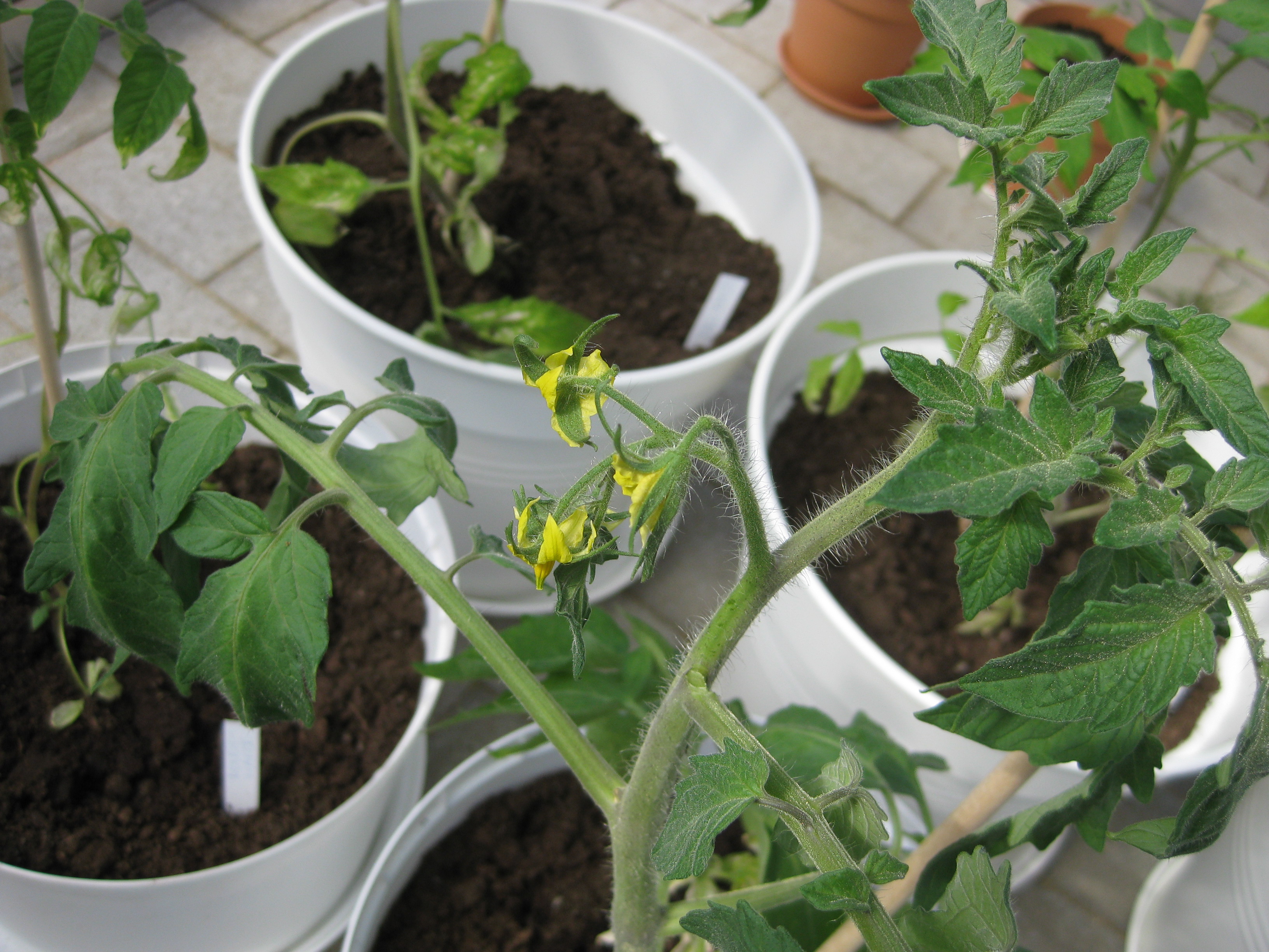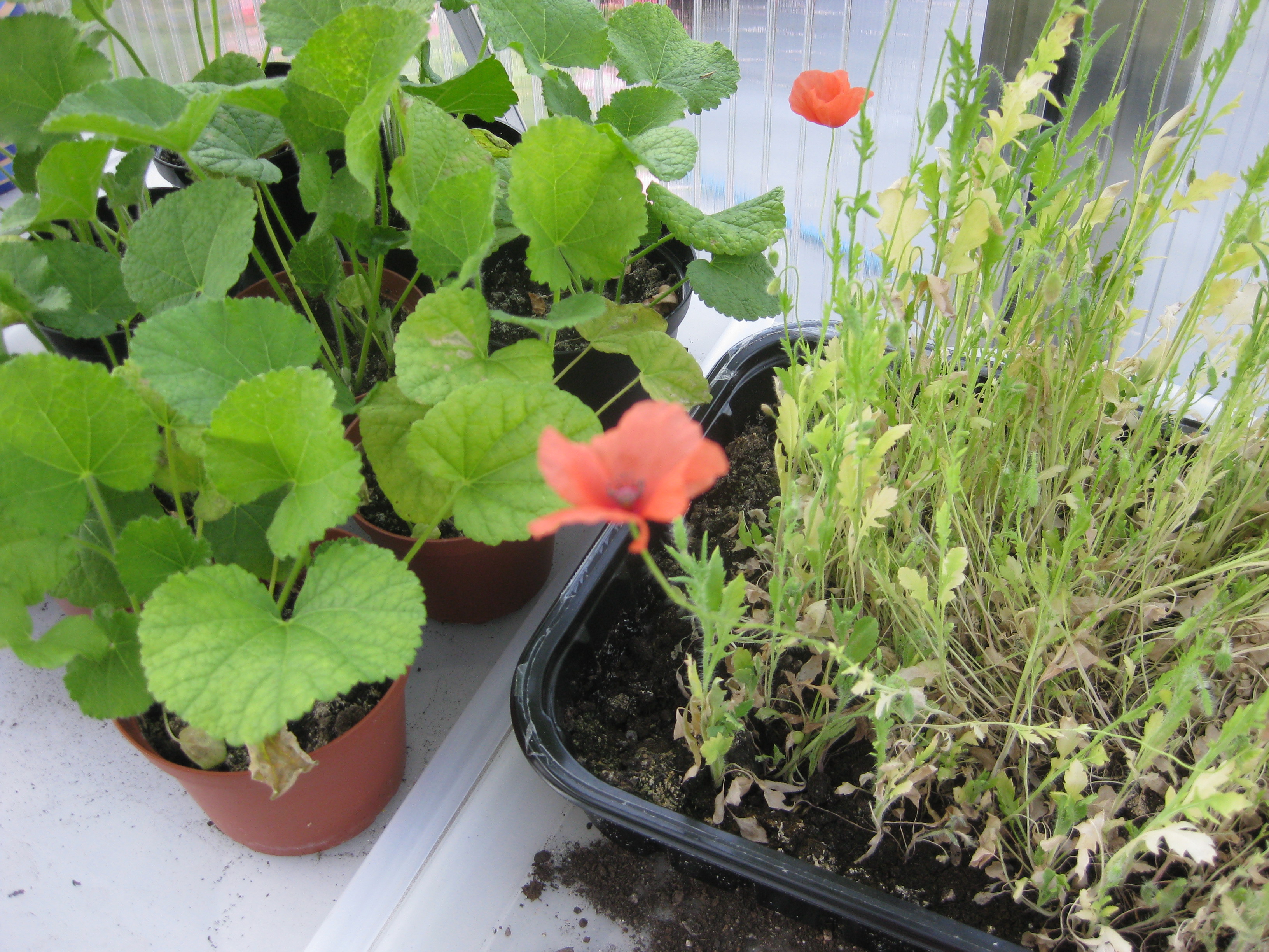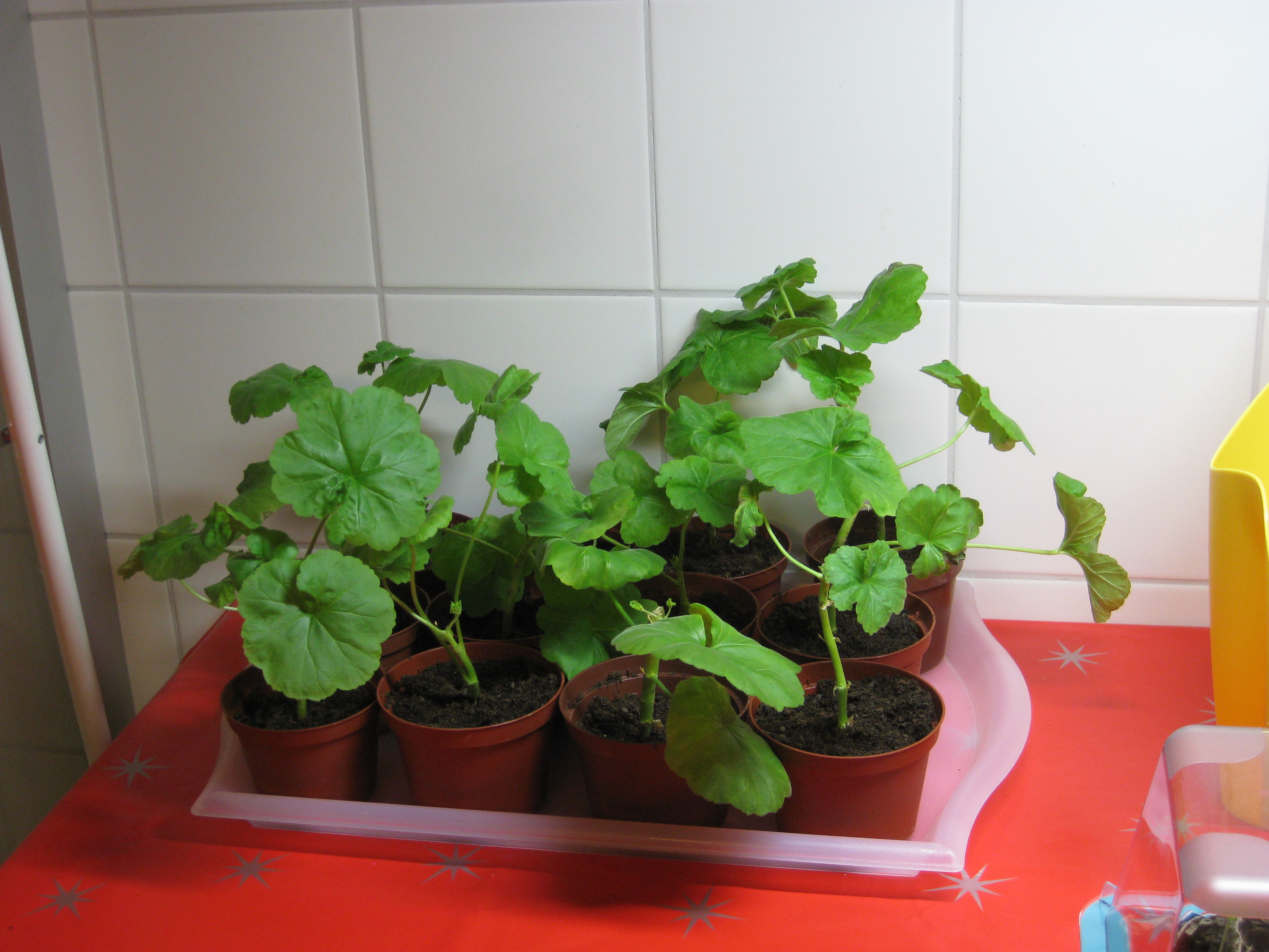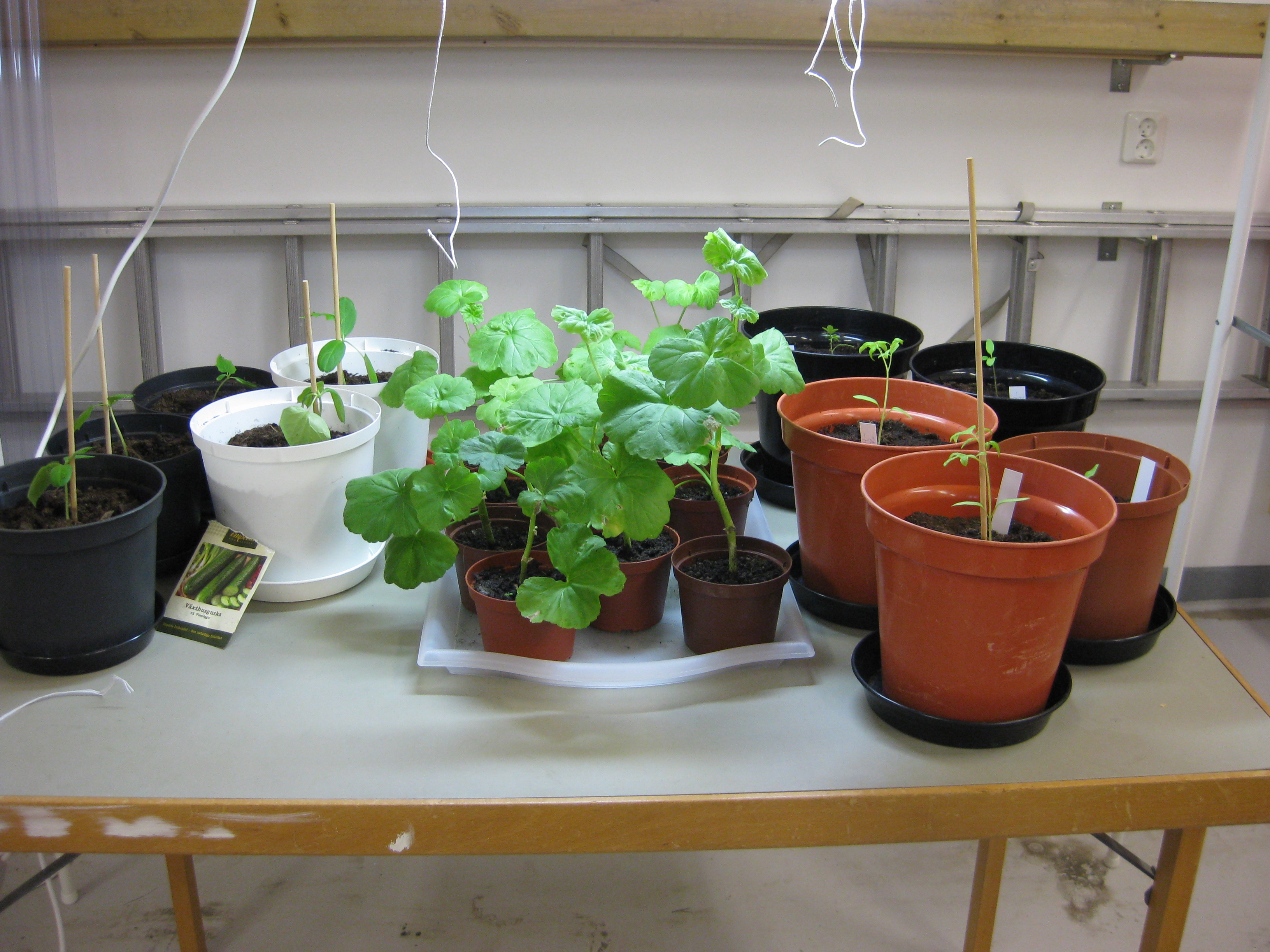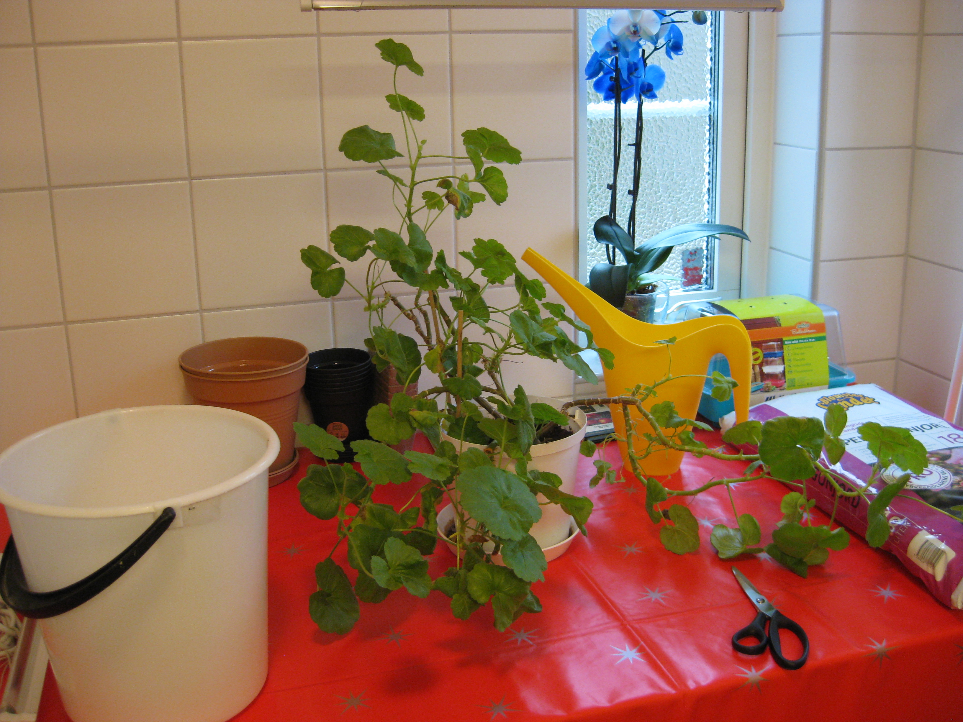 Pelargonsticklingar på tillväxt – och tomatplantor.