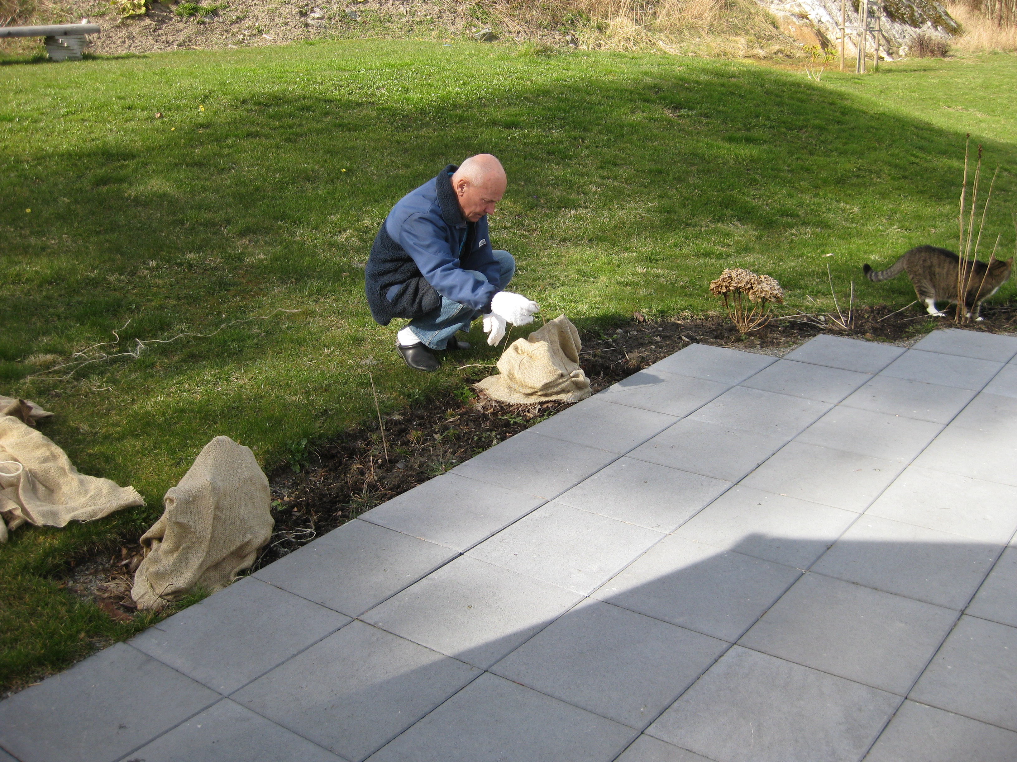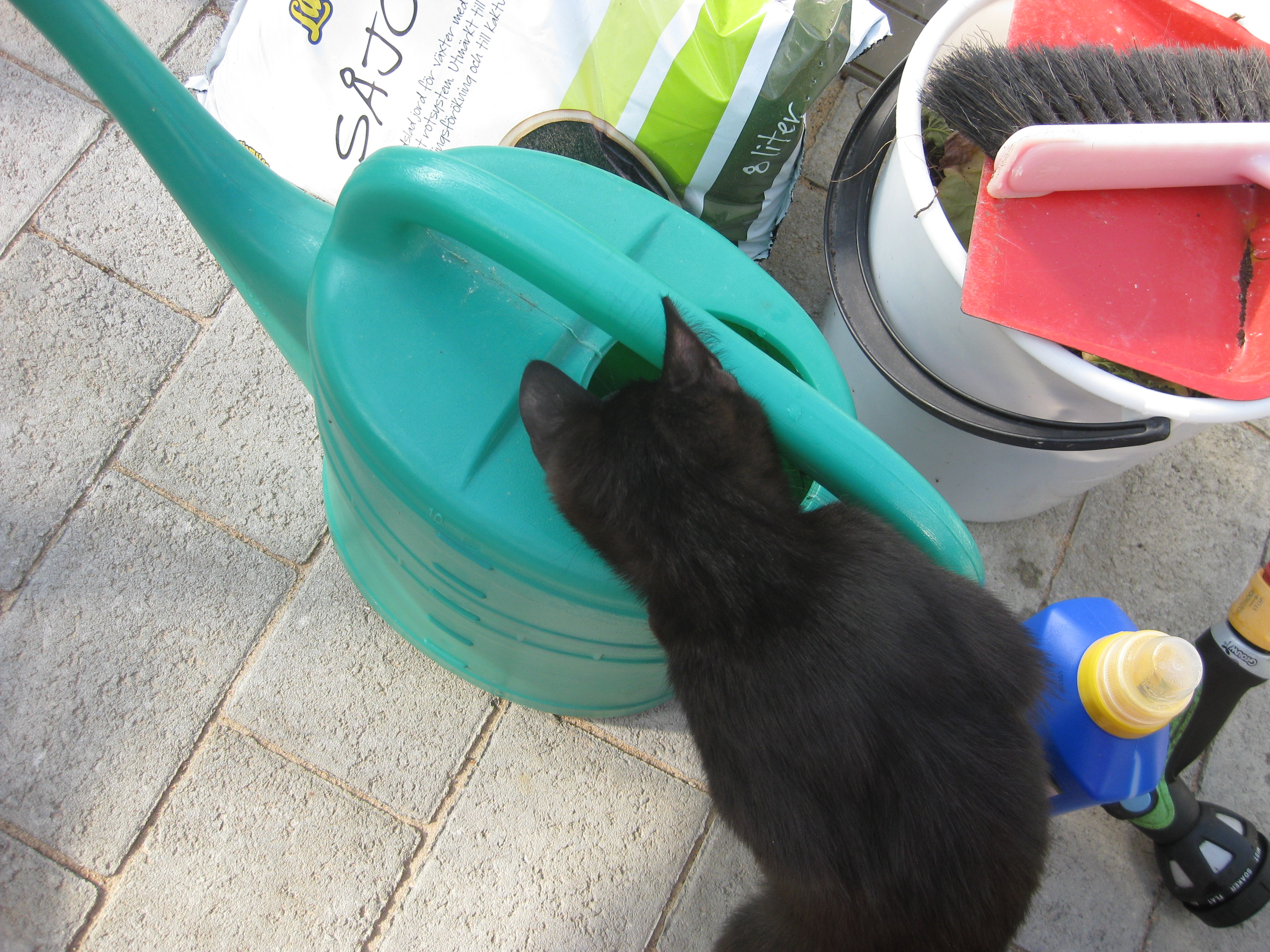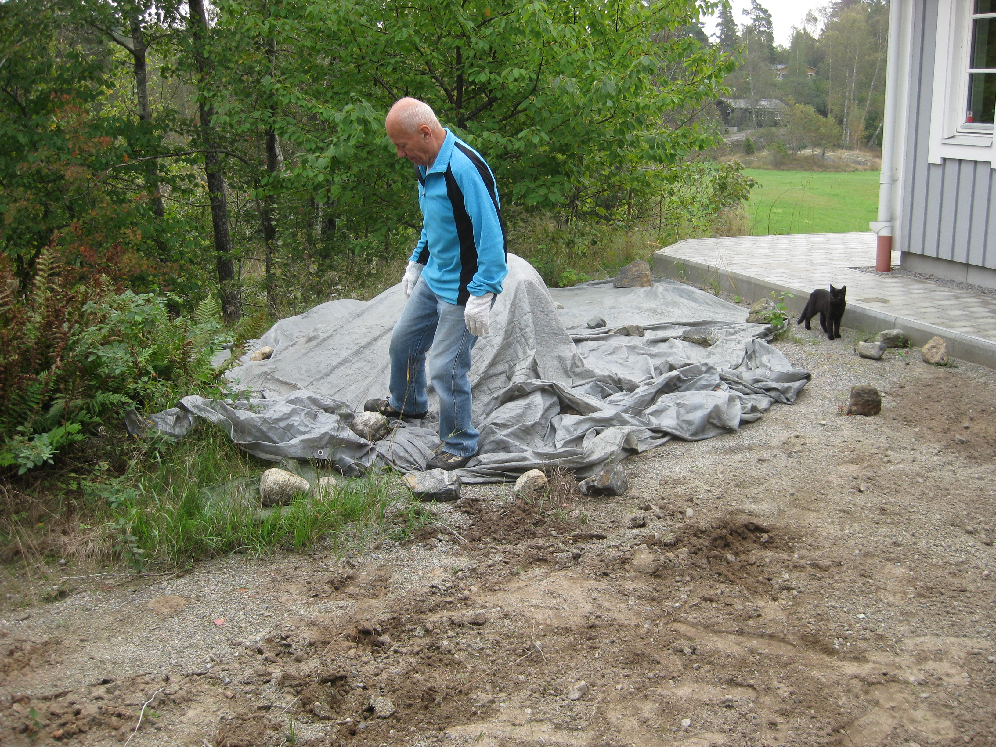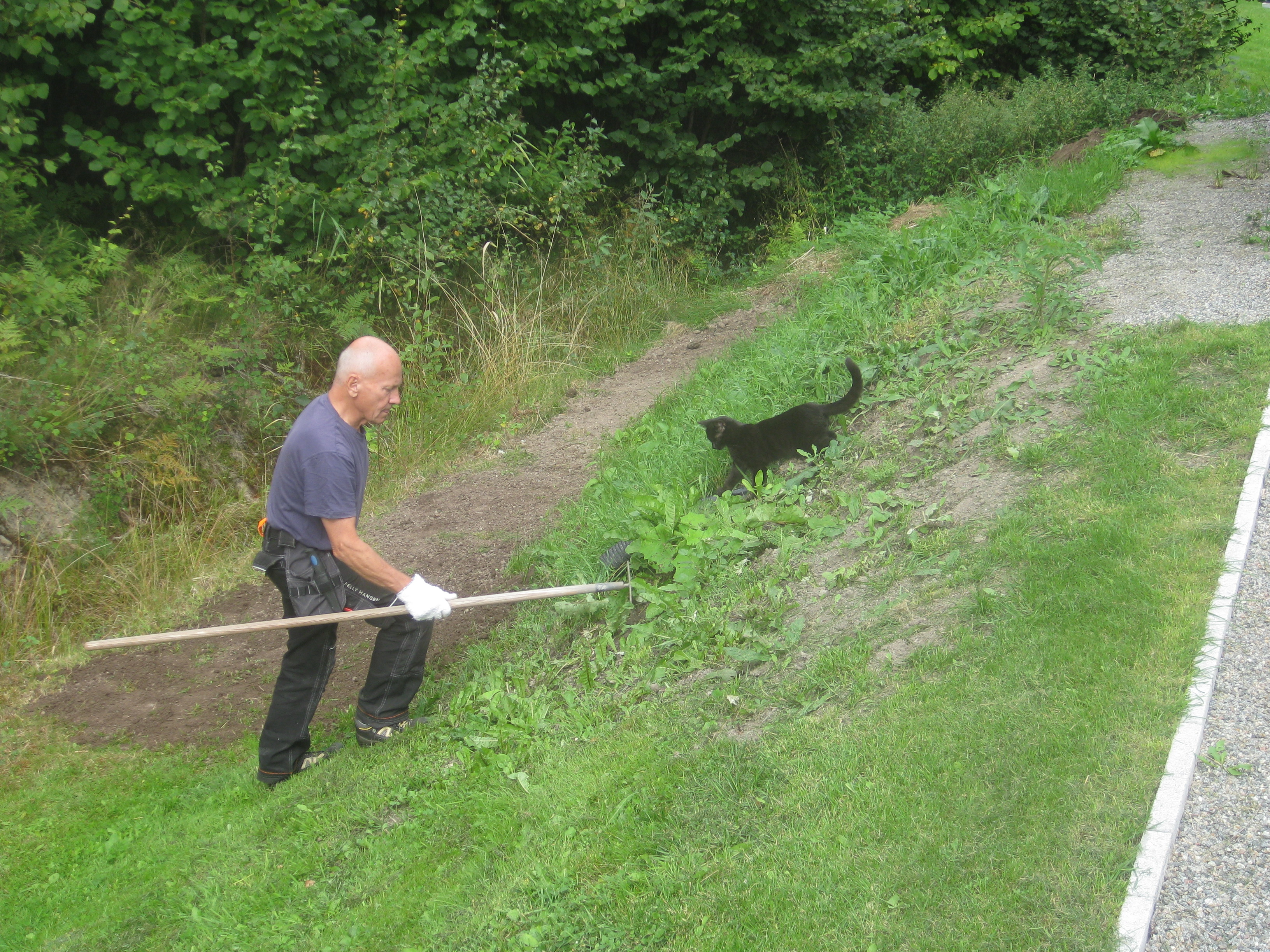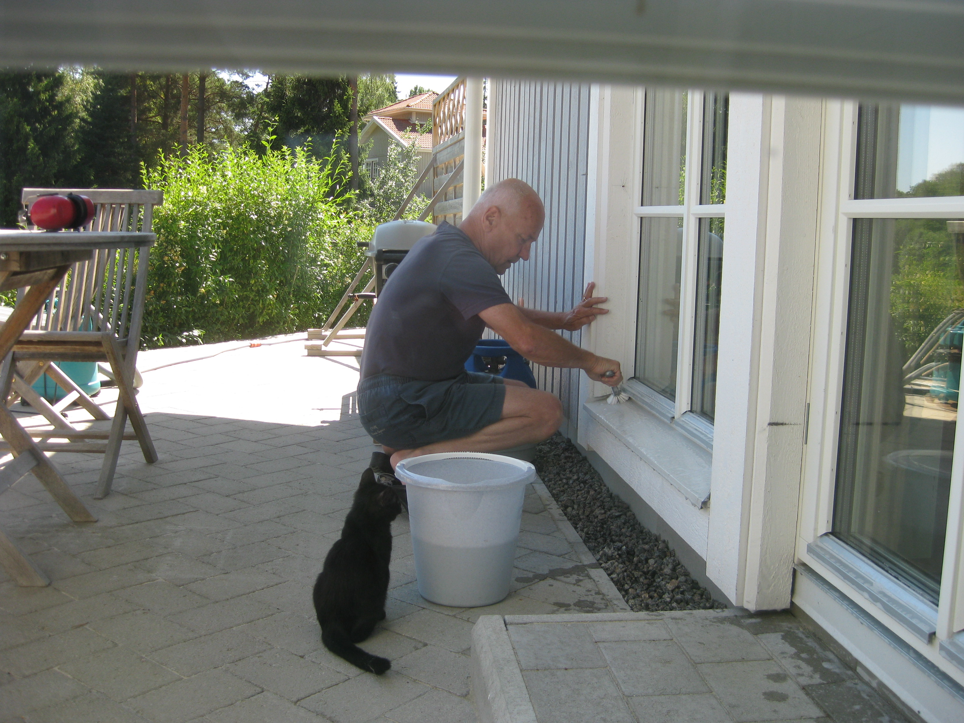 Vi tar itu med att rengöra och tvätta fönster. Katarina får flera komplimanger under dagen av vilket ”slavdrivare” nog är det mest smickrande… 😉 Det är ju flera raster också! Med kattsällskap! Dessutom hinner ju slavdrivaren med att avsluta projektet ”skapa en Stockrosrabatt” – det var vär inte illa?