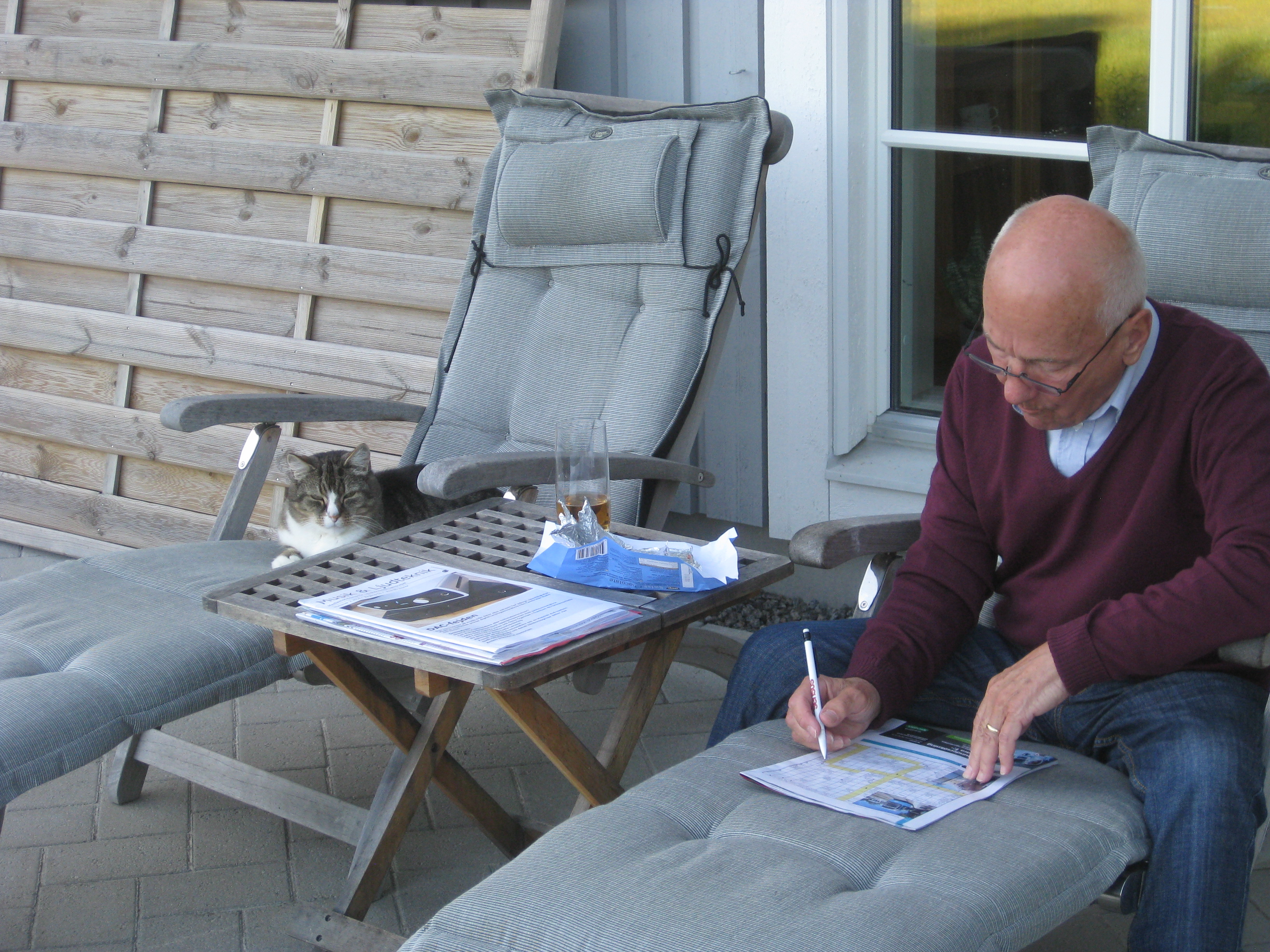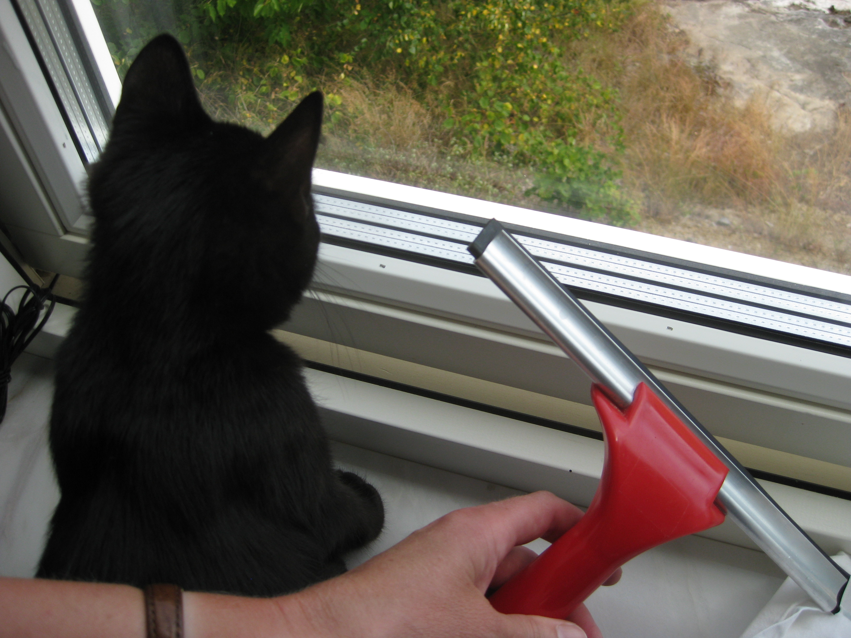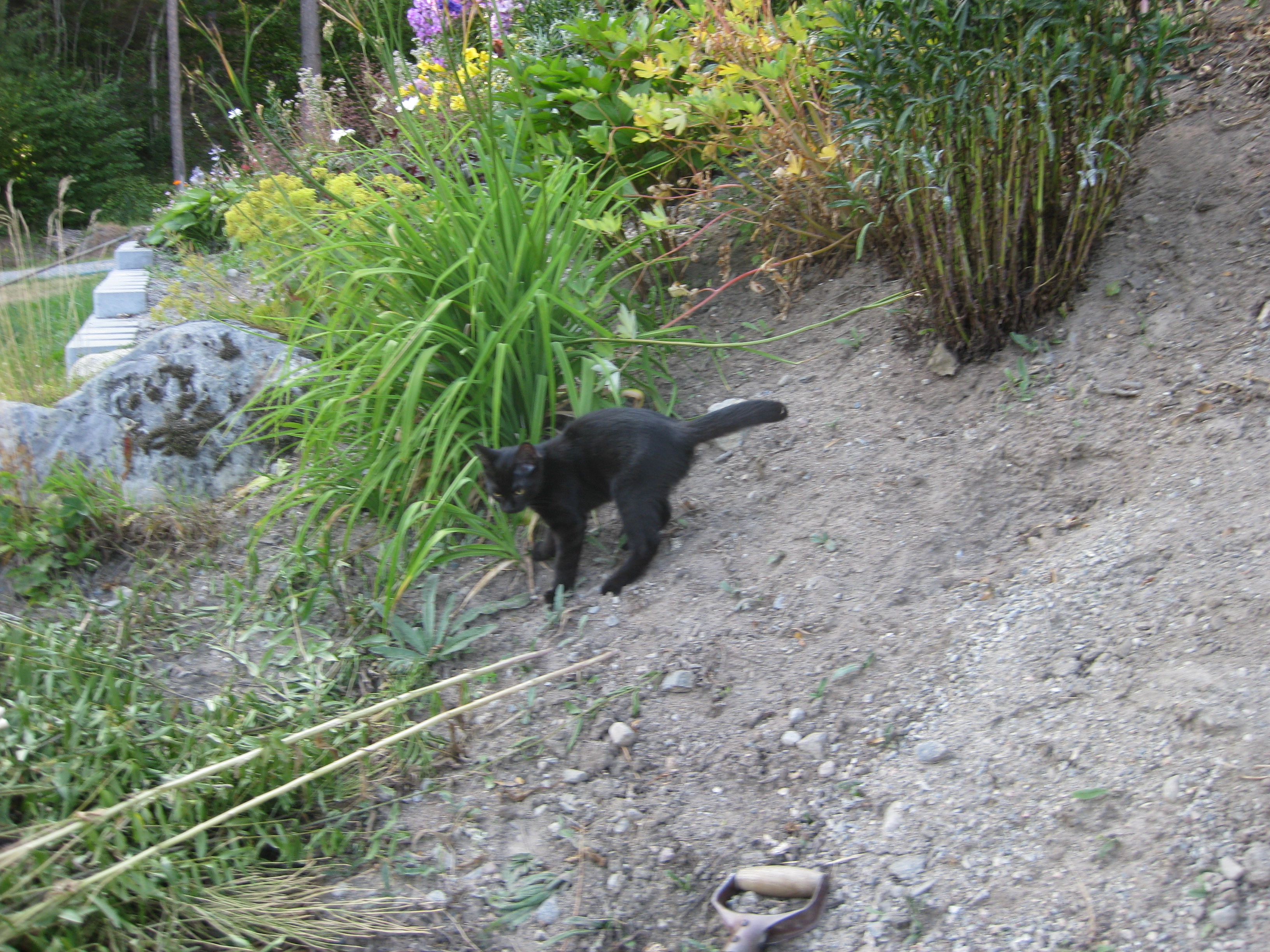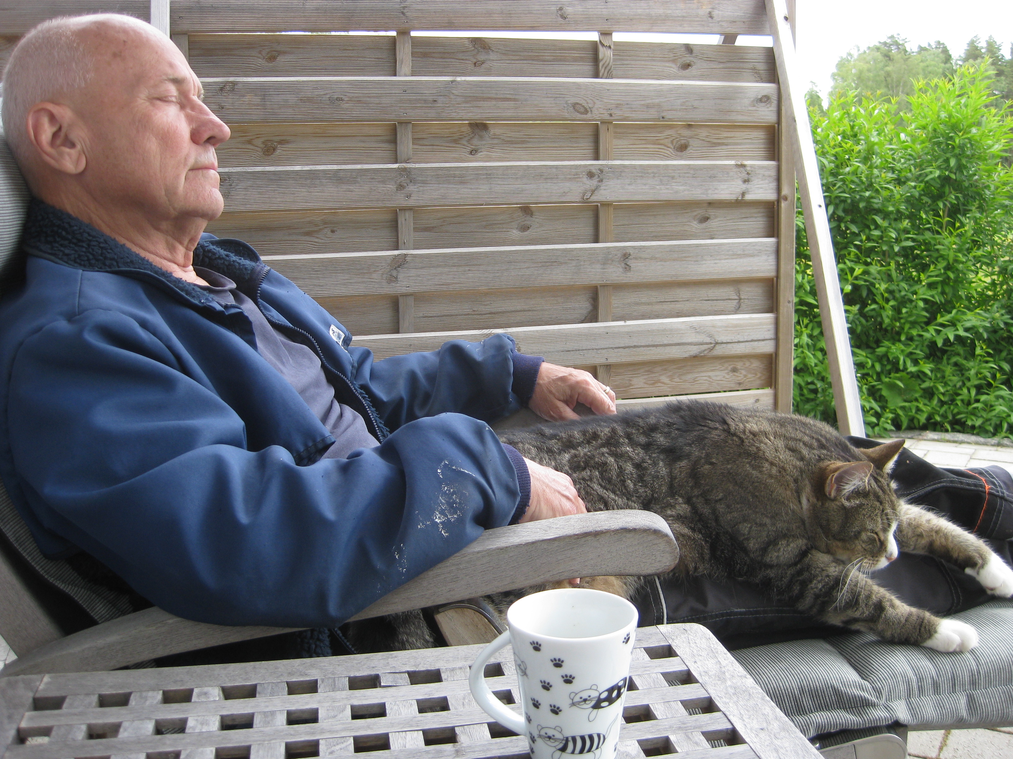 Vi tar itu med att rengöra och tvätta fönster. Katarina får flera komplimanger under dagen av vilket ”slavdrivare” nog är det mest smickrande… 😉 Det är ju flera raster också! Med kattsällskap! Dessutom hinner ju slavdrivaren med att avsluta projektet ”skapa en Stockrosrabatt” – det var vär inte illa?