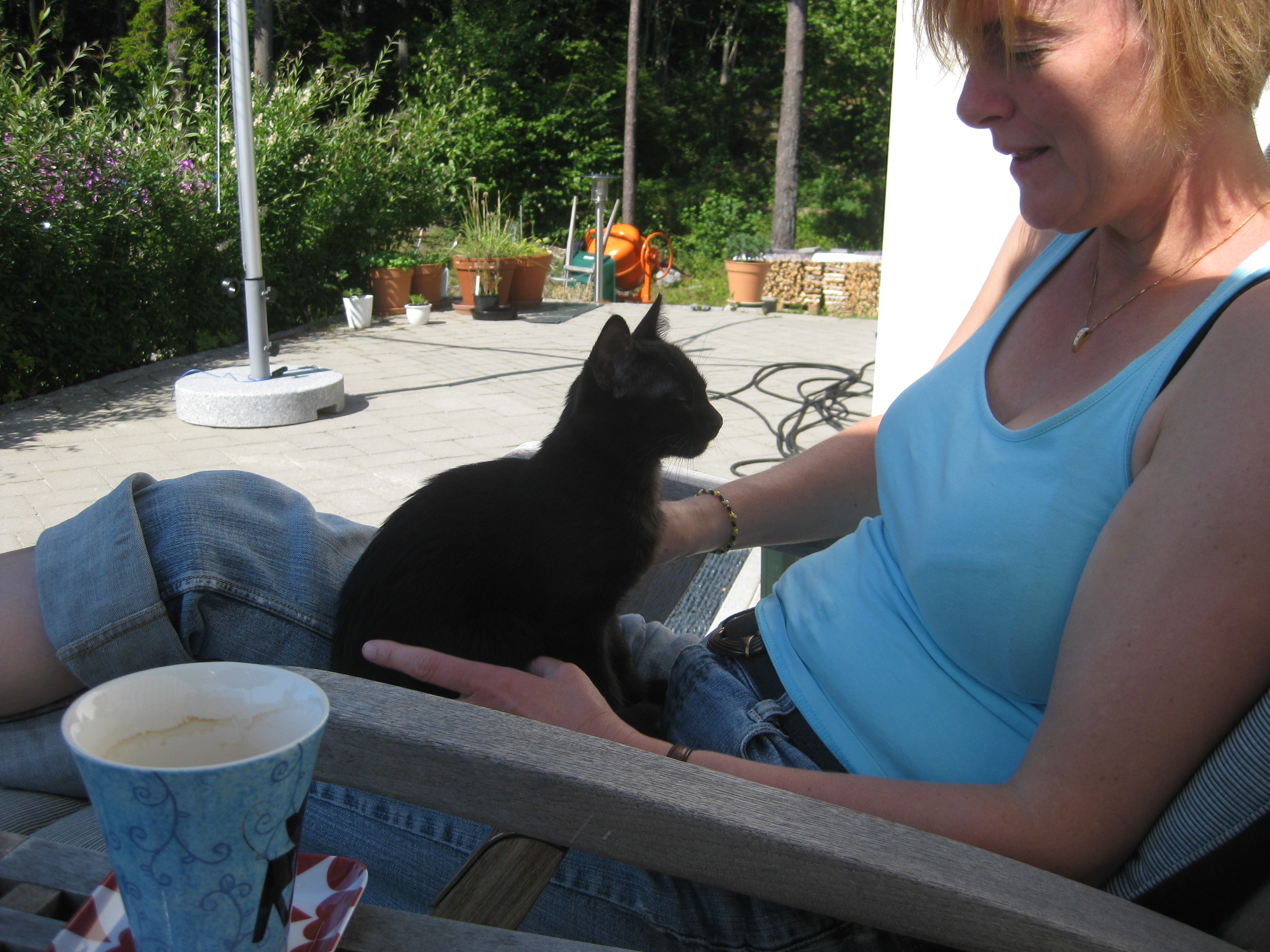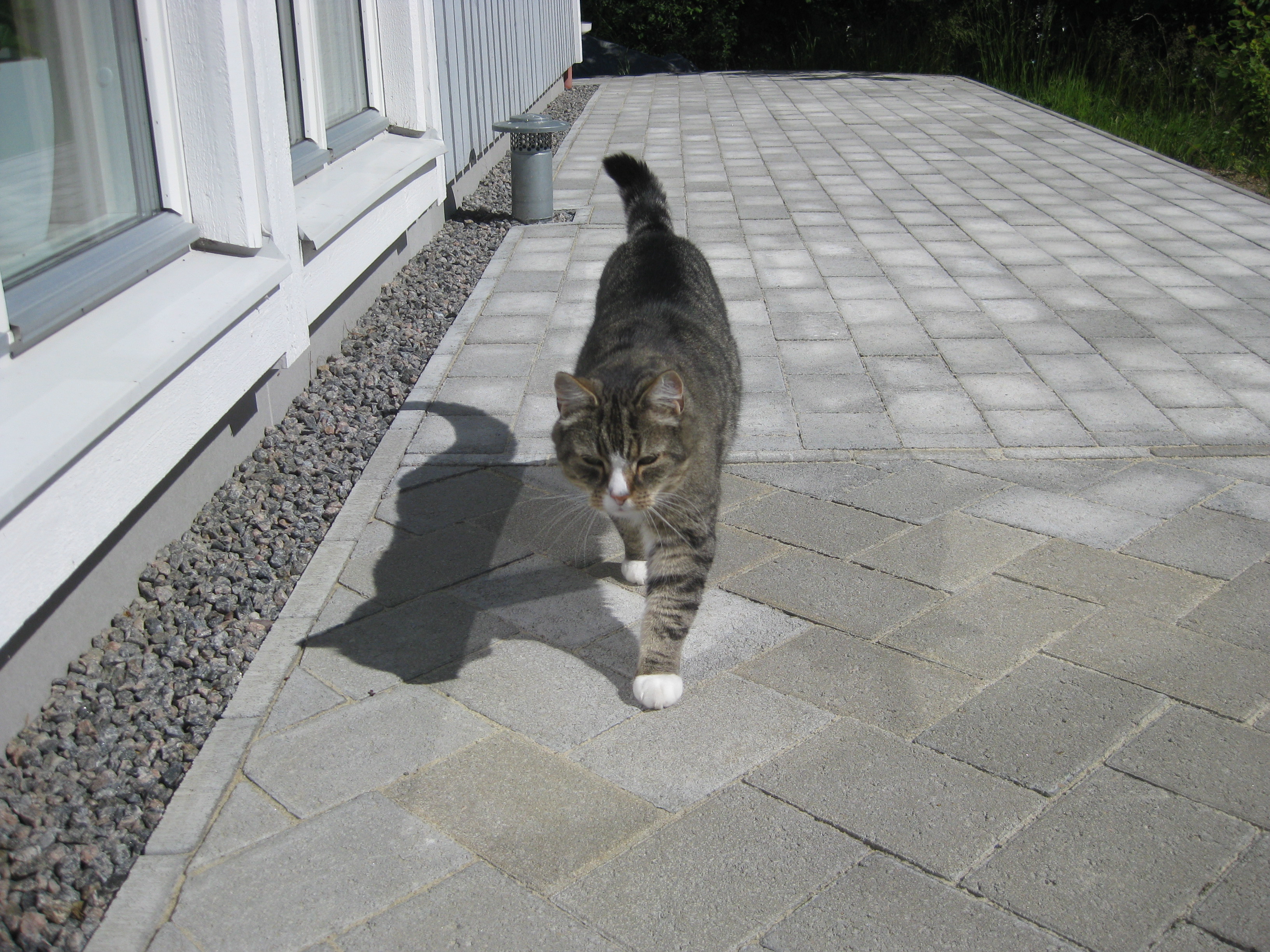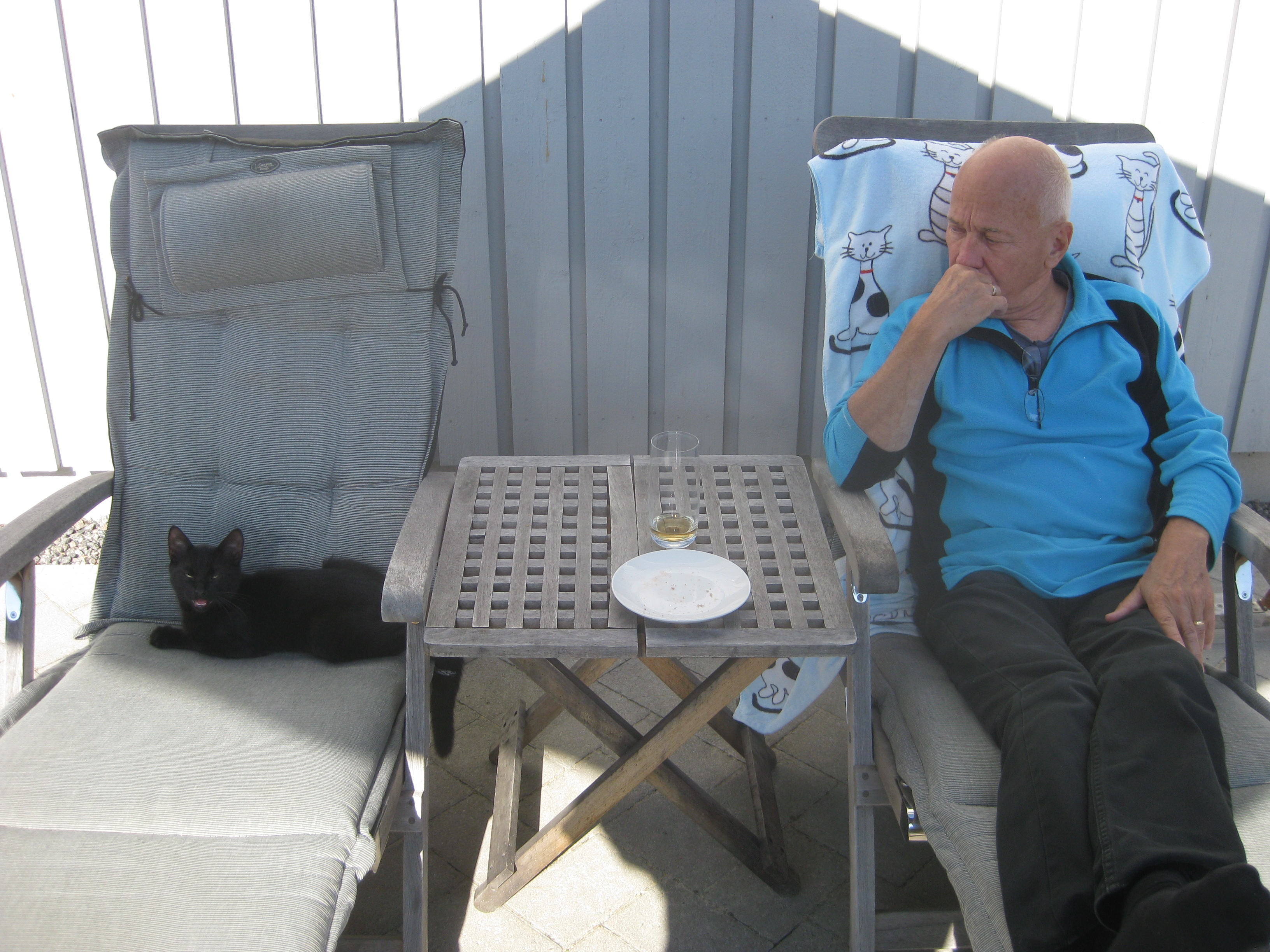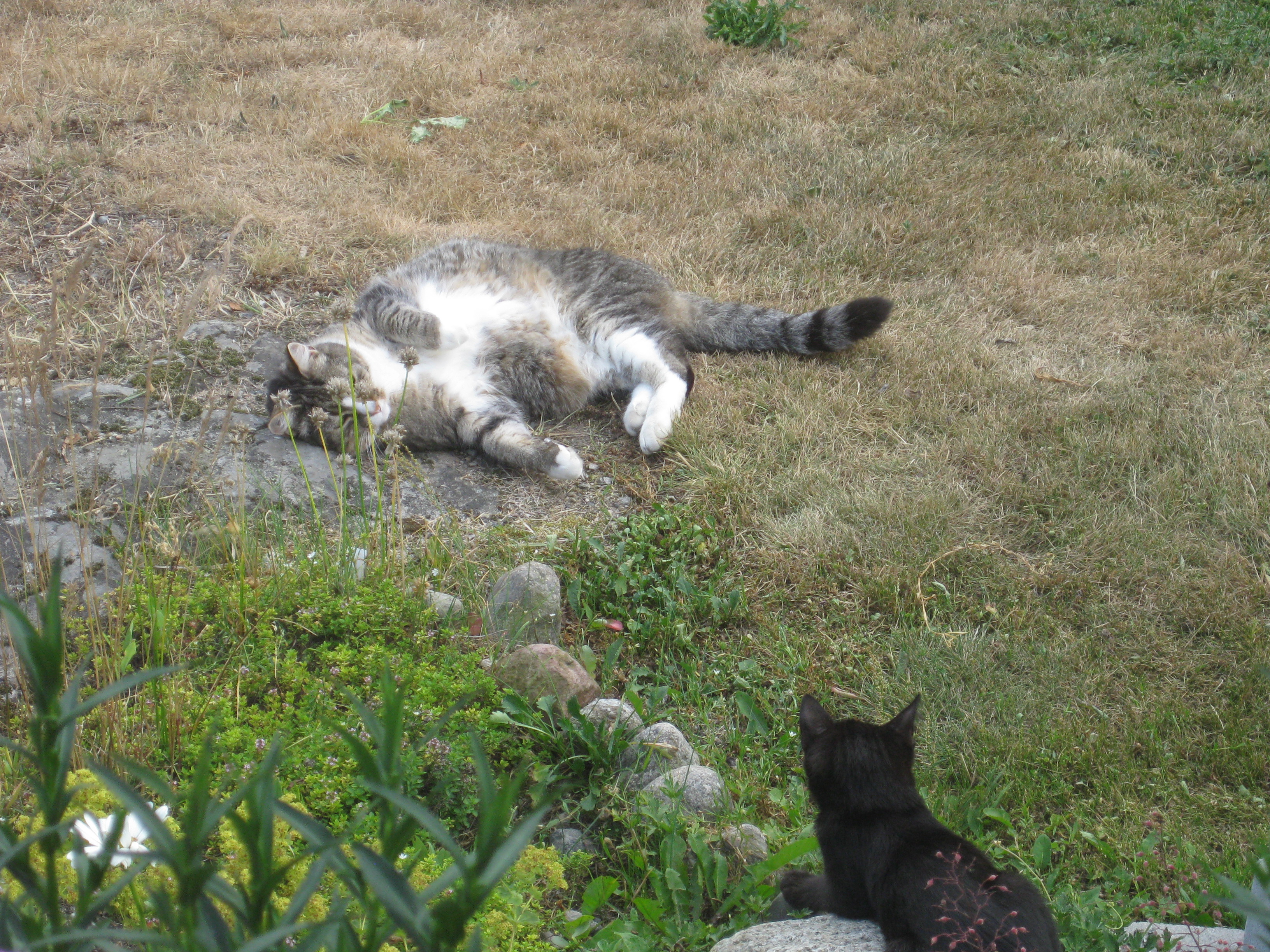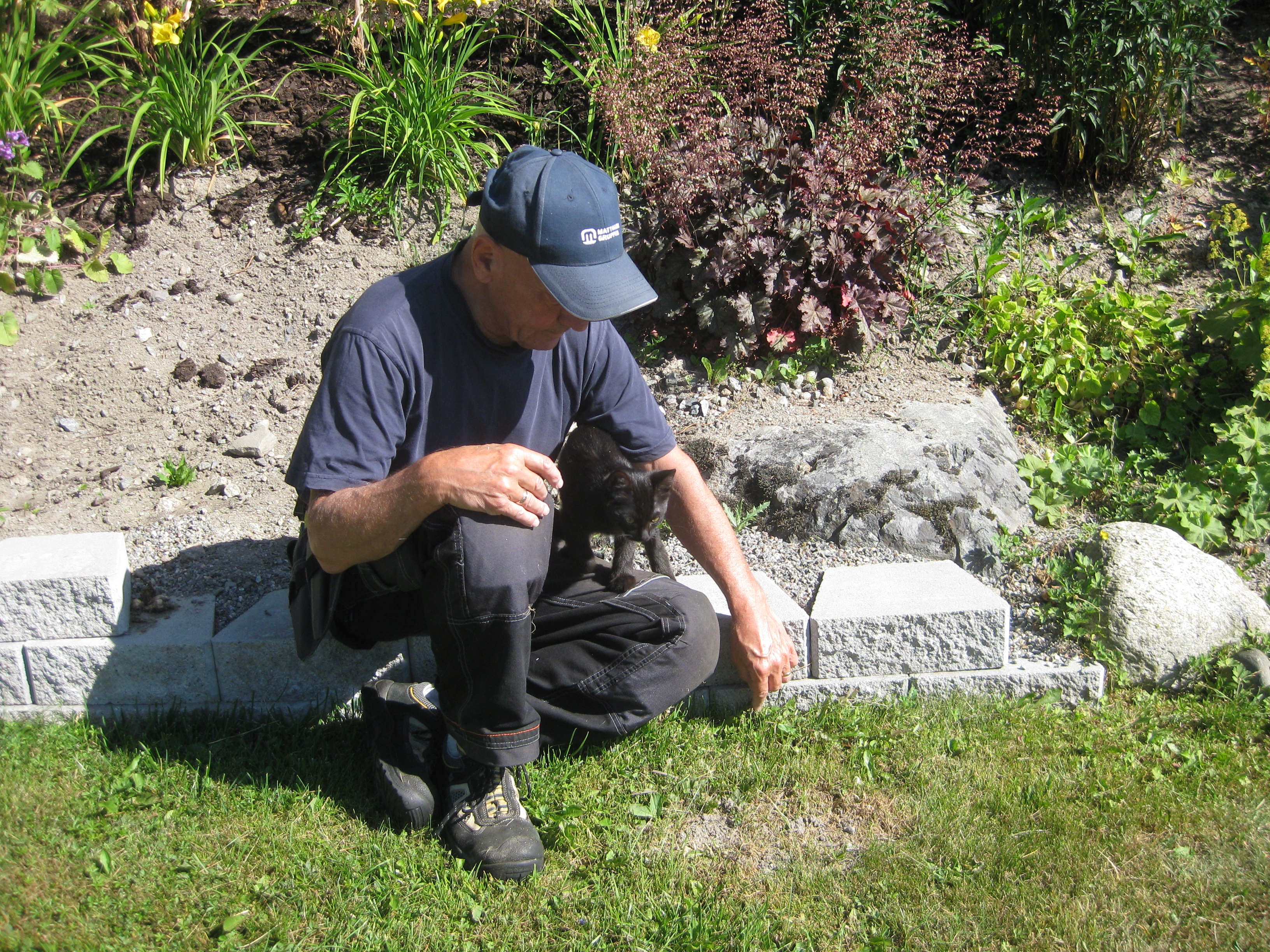 Vi tar itu med att rengöra och tvätta fönster. Katarina får flera komplimanger under dagen av vilket ”slavdrivare” nog är det mest smickrande… 😉 Det är ju flera raster också! Med kattsällskap! Dessutom hinner ju slavdrivaren med att avsluta projektet ”skapa en Stockrosrabatt” – det var vär inte illa?