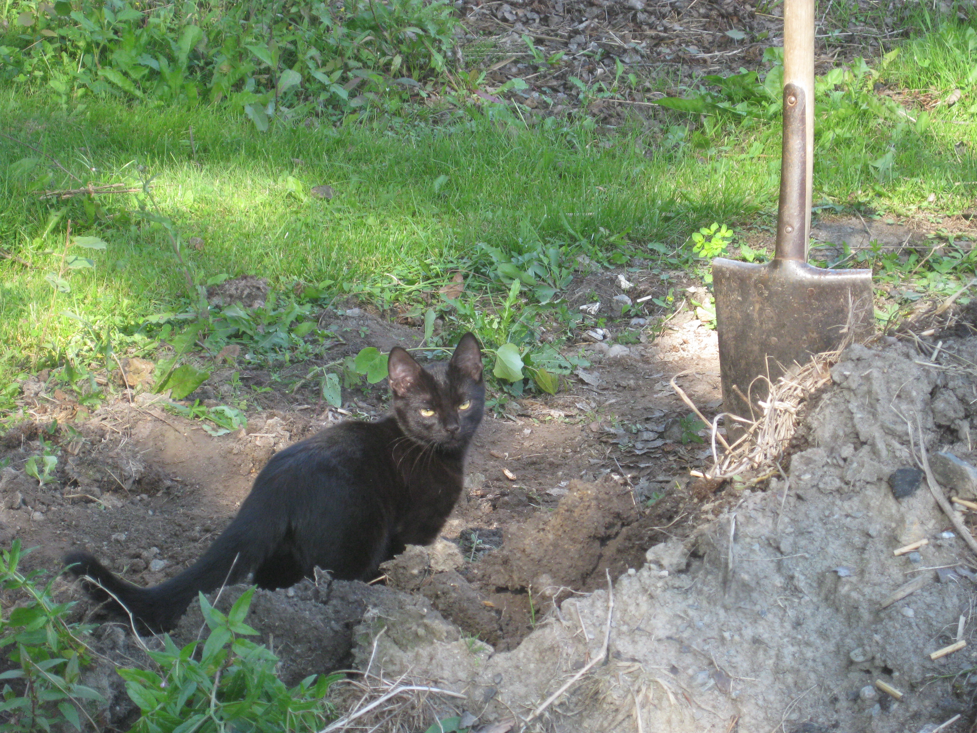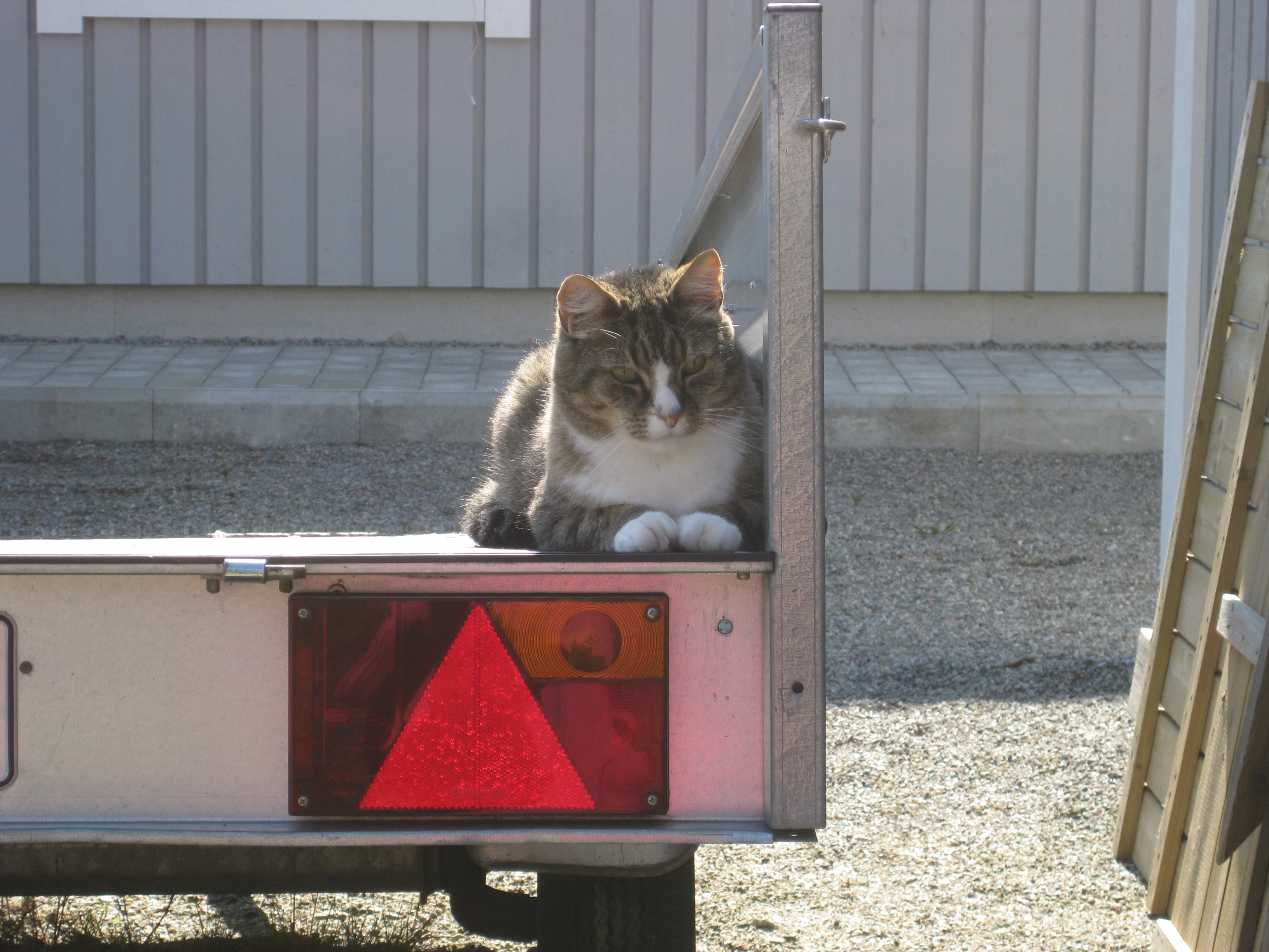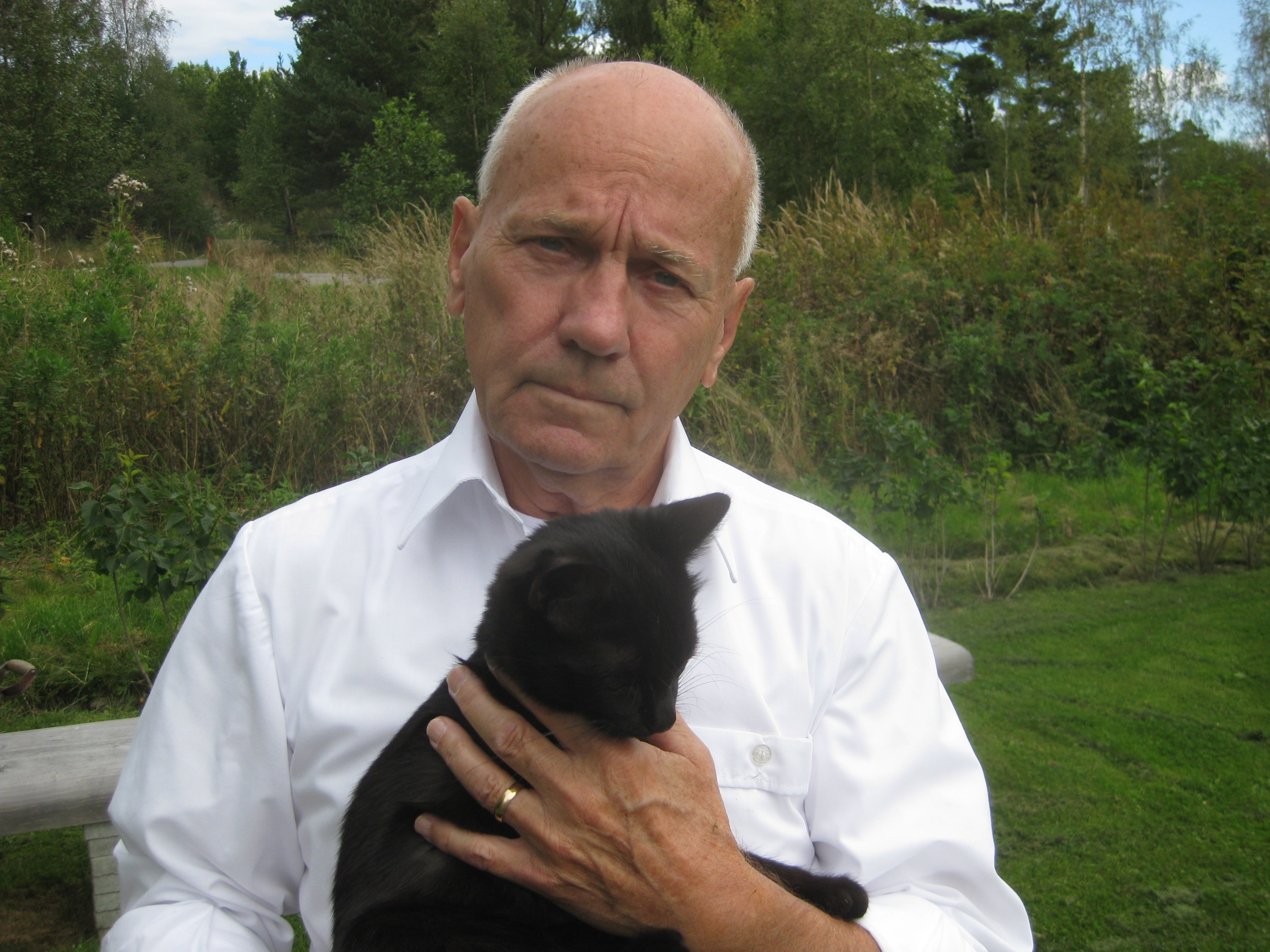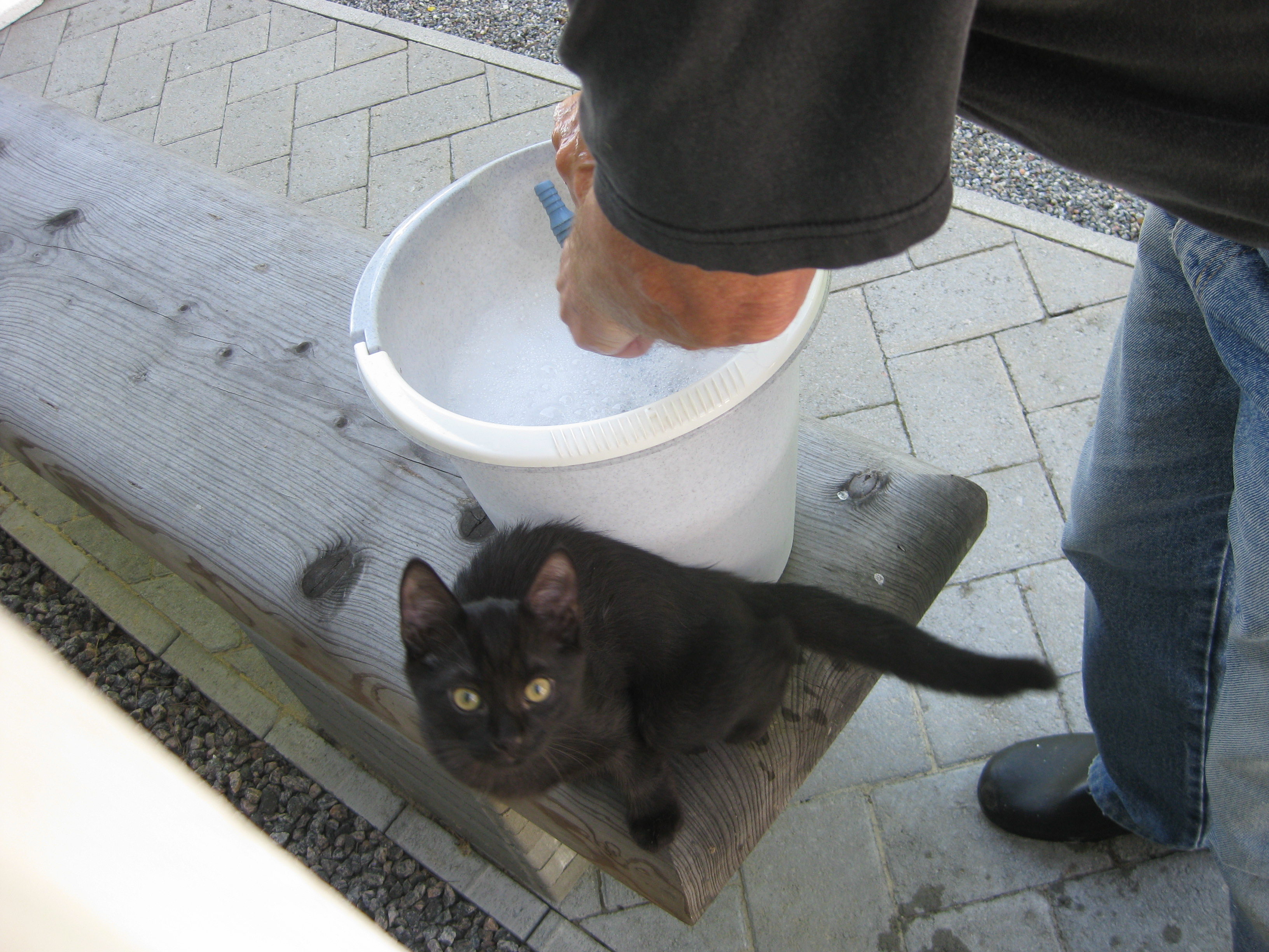 Vi tar itu med att rengöra och tvätta fönster. Katarina får flera komplimanger under dagen av vilket ”slavdrivare” nog är det mest smickrande… 😉 Det är ju flera raster också! Med kattsällskap! Dessutom hinner ju slavdrivaren med att avsluta projektet ”skapa en Stockrosrabatt” – det var vär inte illa?
