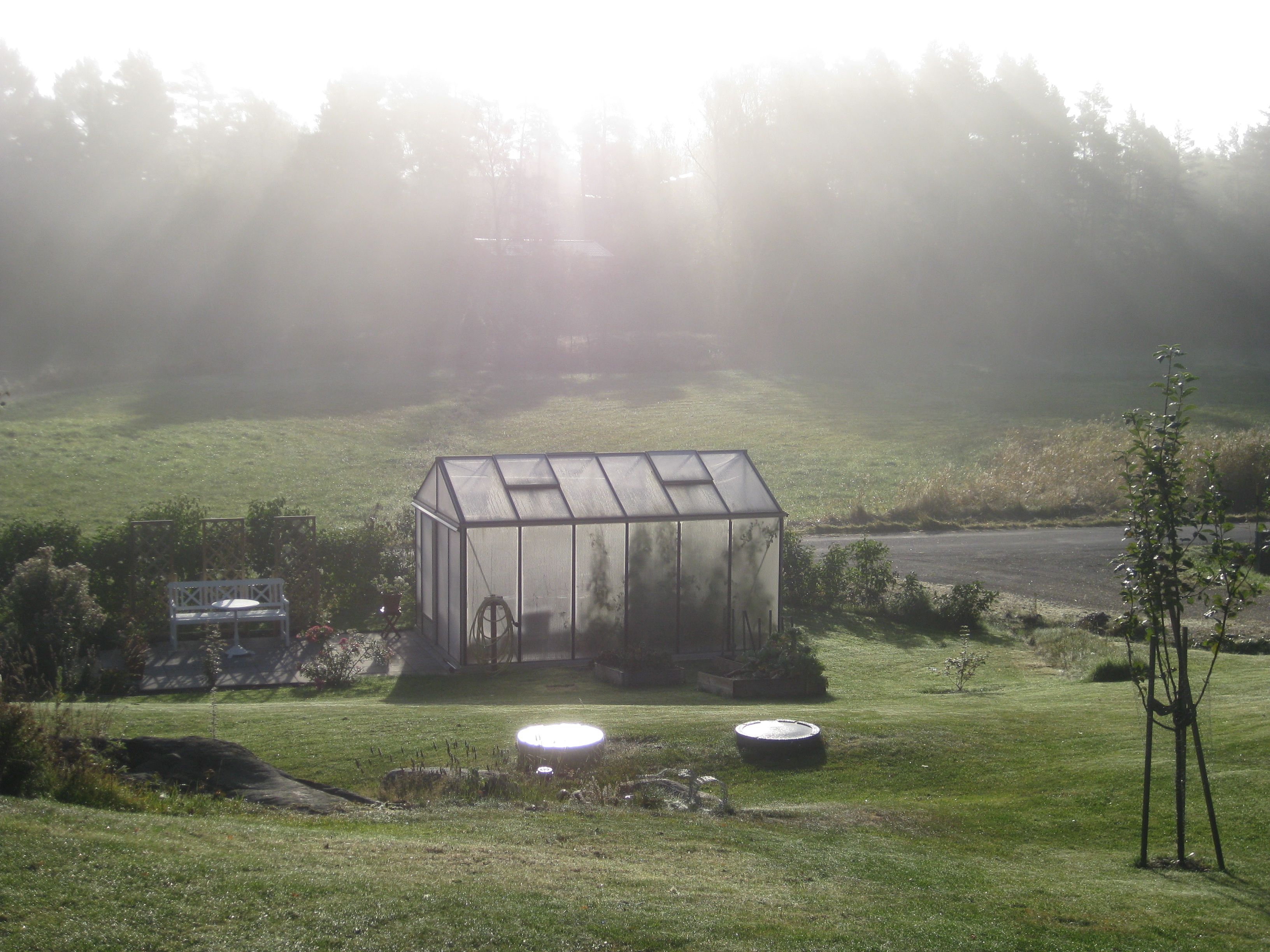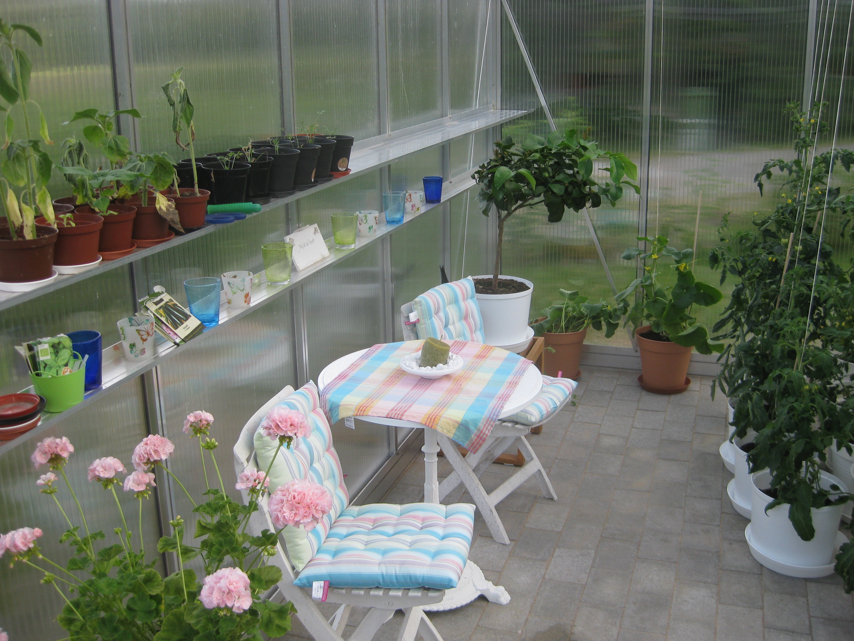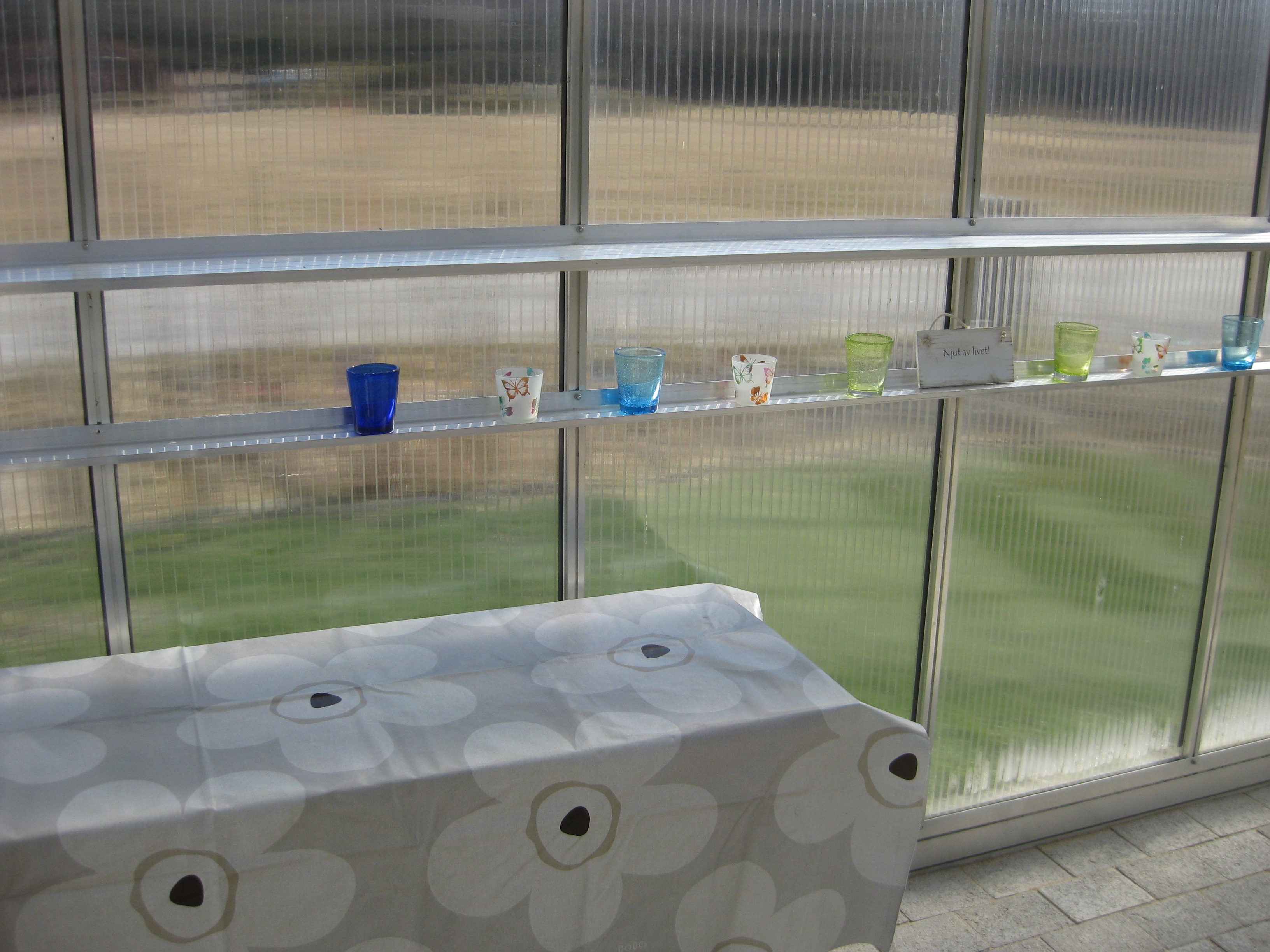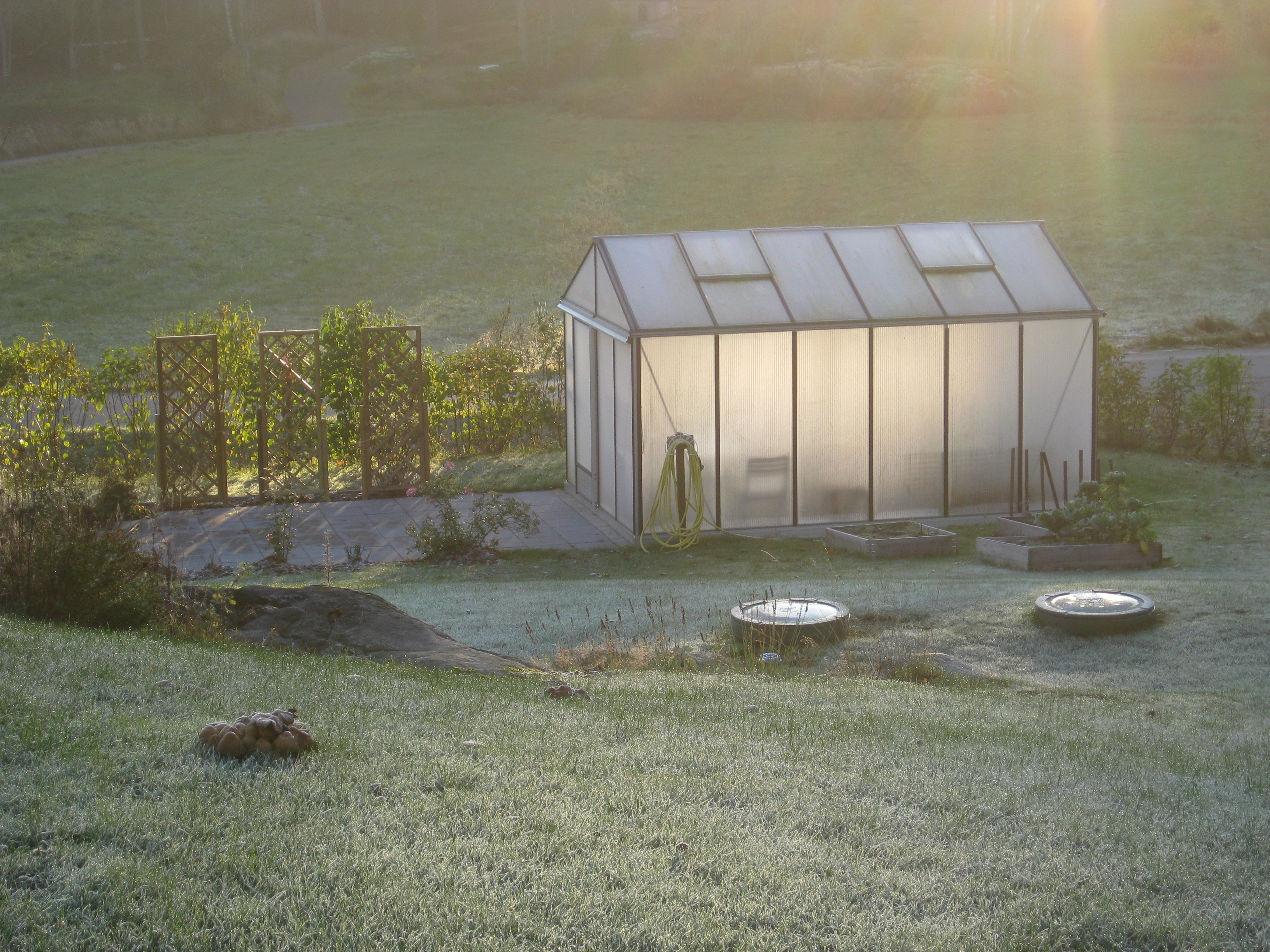 Förmiddagskaffe ute i halvsol och ganska skaplig temperatur. Sedan ägnas dagen åt att skura och tvätta i växthuset, samt ställa in statyer och trädgårdssoffa för vintern. Vi borde göra en ordentlig rengöring även av utsidan som delvis är rätt grön av alger.. Men det verkar mer vara ett vår-projekt, eller hur? 🙂