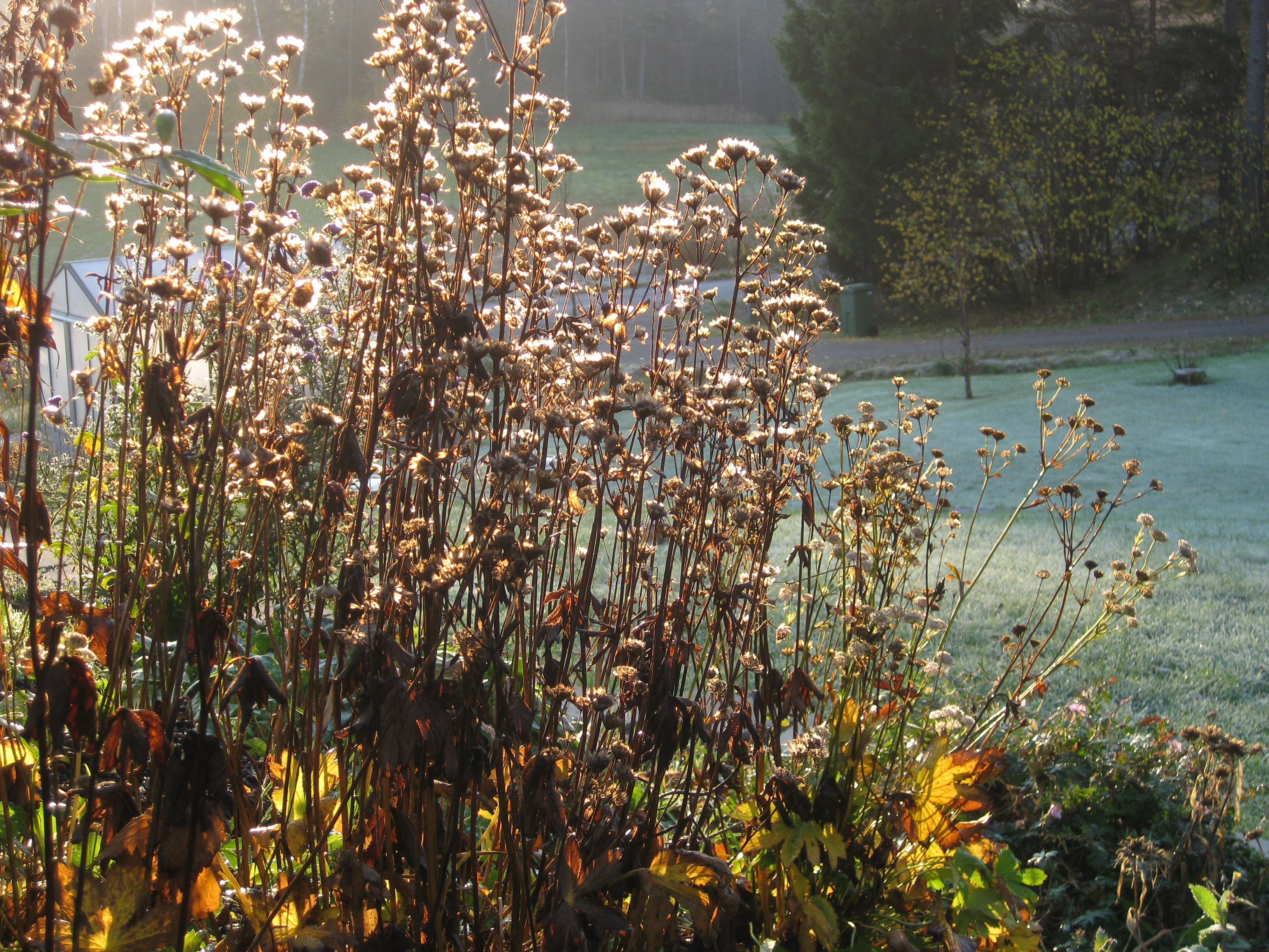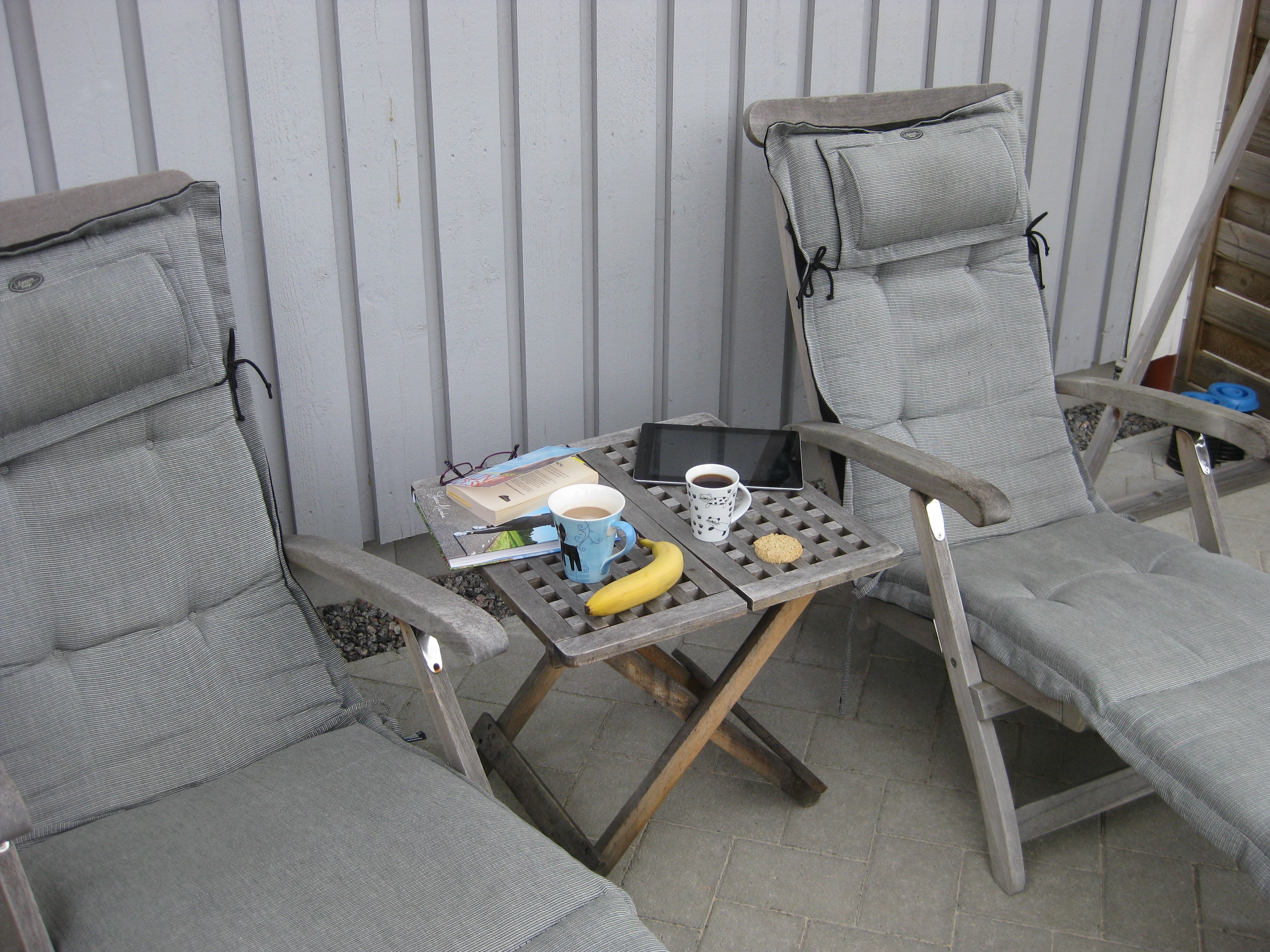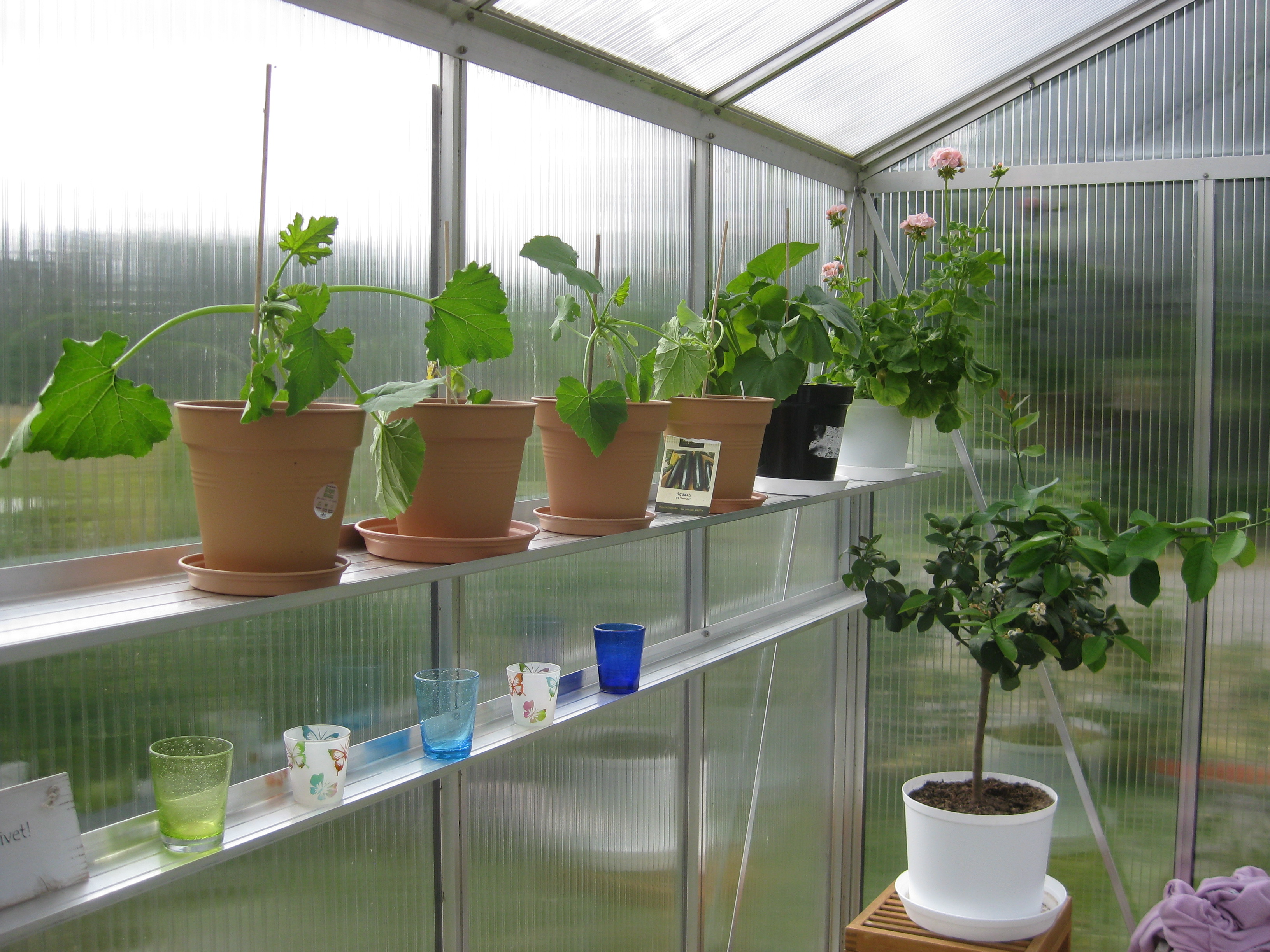 Förmiddagskaffe ute i halvsol och ganska skaplig temperatur. Sedan ägnas dagen åt att skura och tvätta i växthuset, samt ställa in statyer och trädgårdssoffa för vintern. Vi borde göra en ordentlig rengöring även av utsidan som delvis är rätt grön av alger.. Men det verkar mer vara ett vår-projekt, eller hur? 🙂