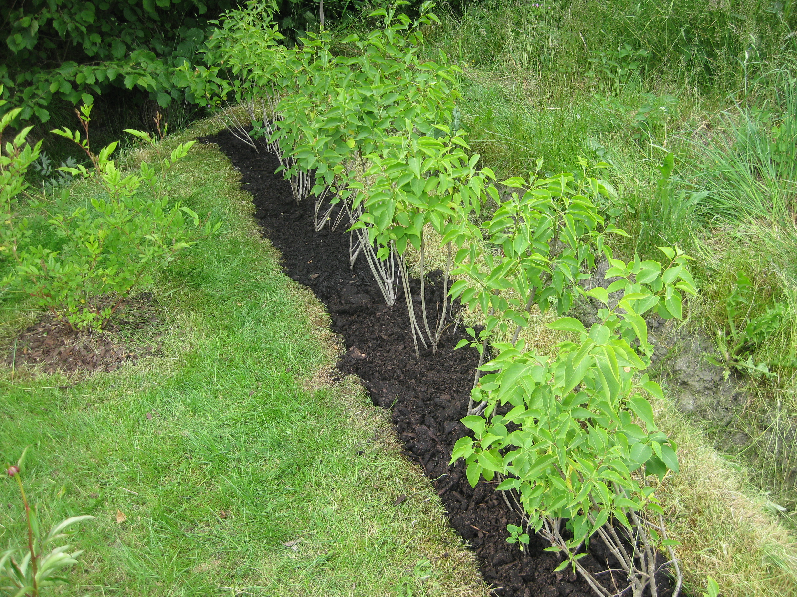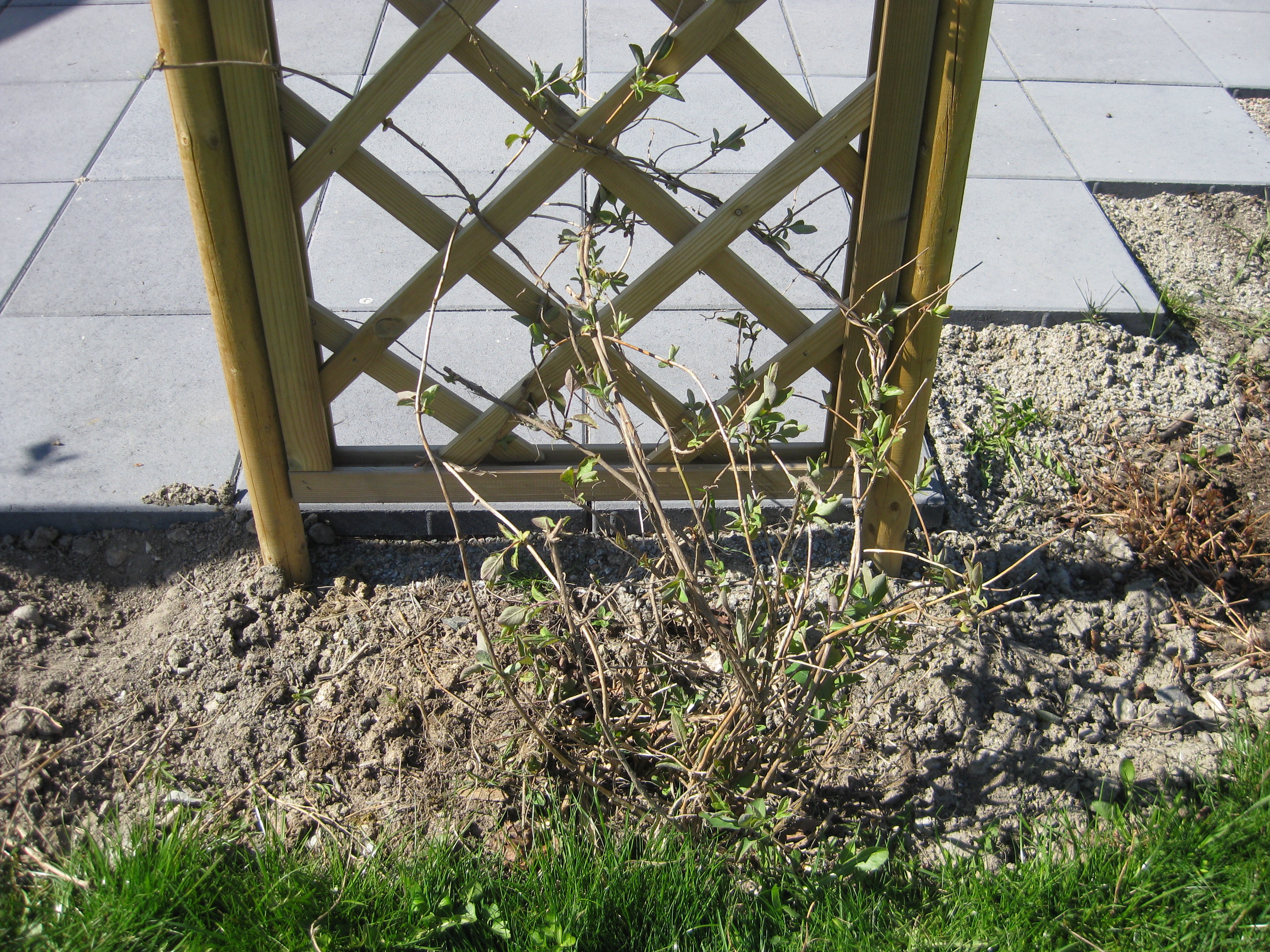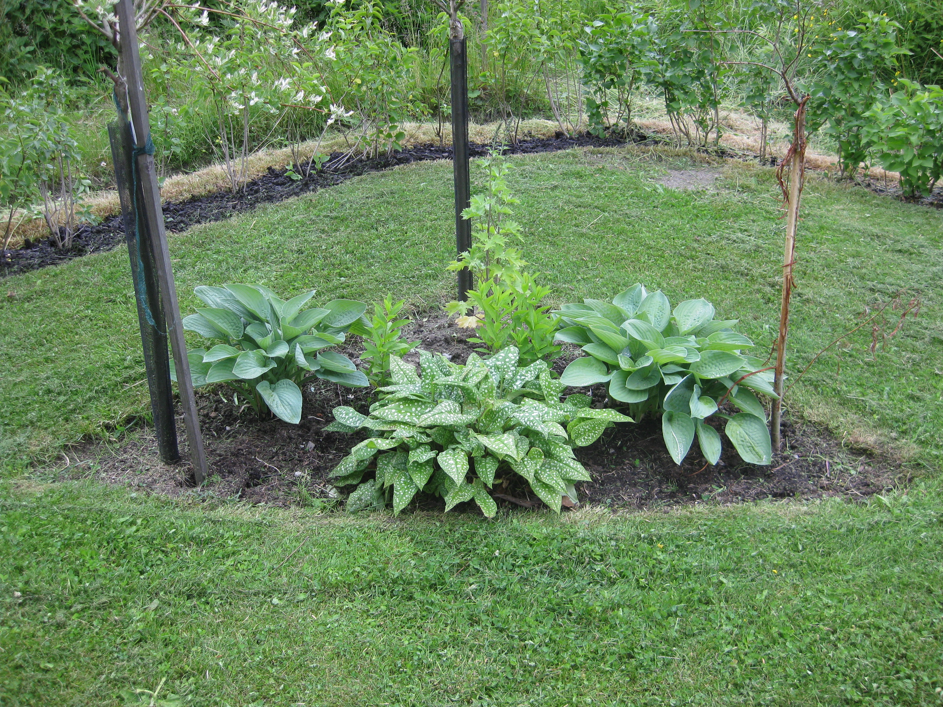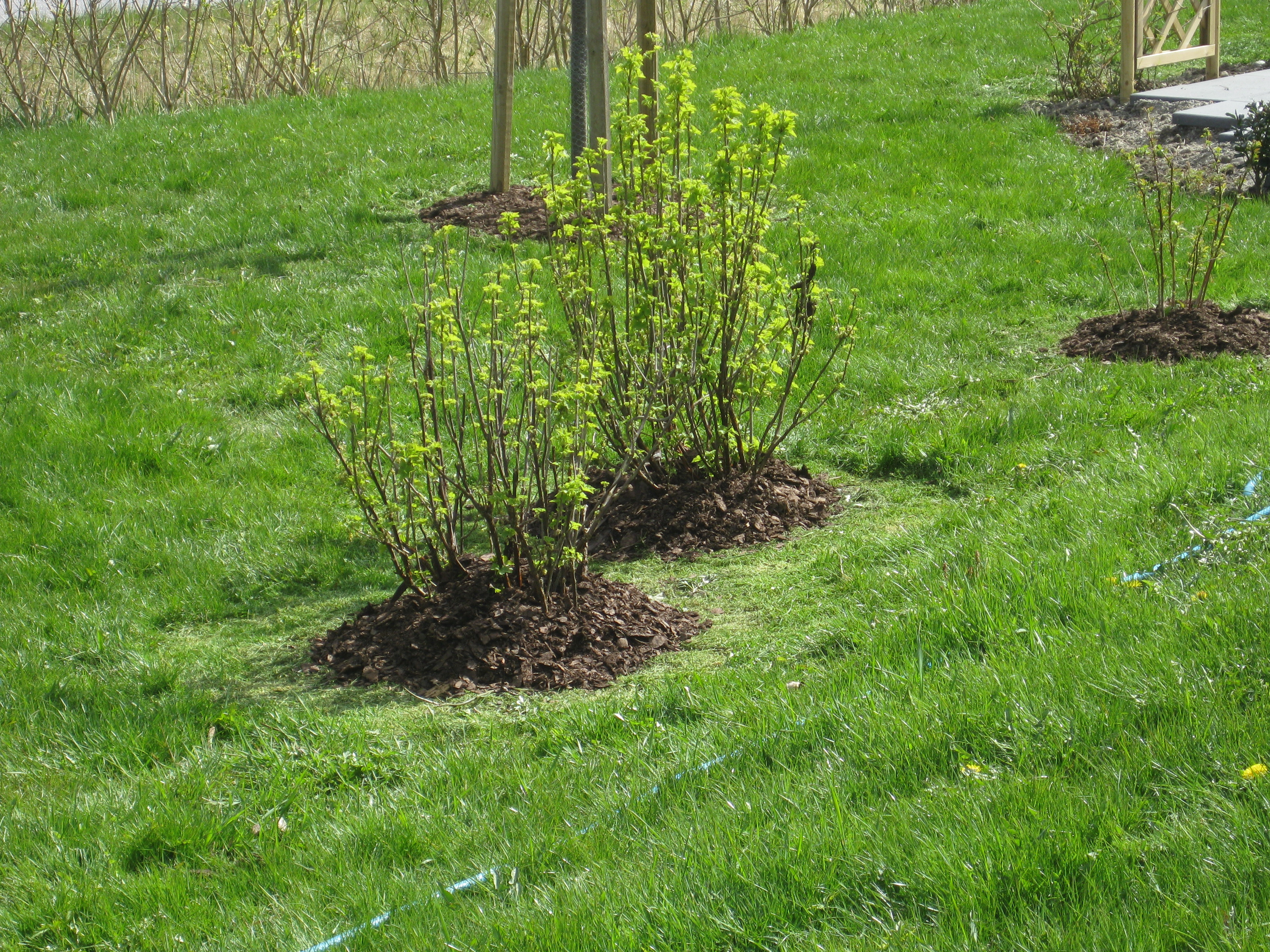 Lite växtlighet tittar upp på trekanten. Det ser ut som om de flesta av de nysatta syrénerna har klarat sig. En dvärgpil har dock dött. Vi täcker av rosorna som har börjat växa.