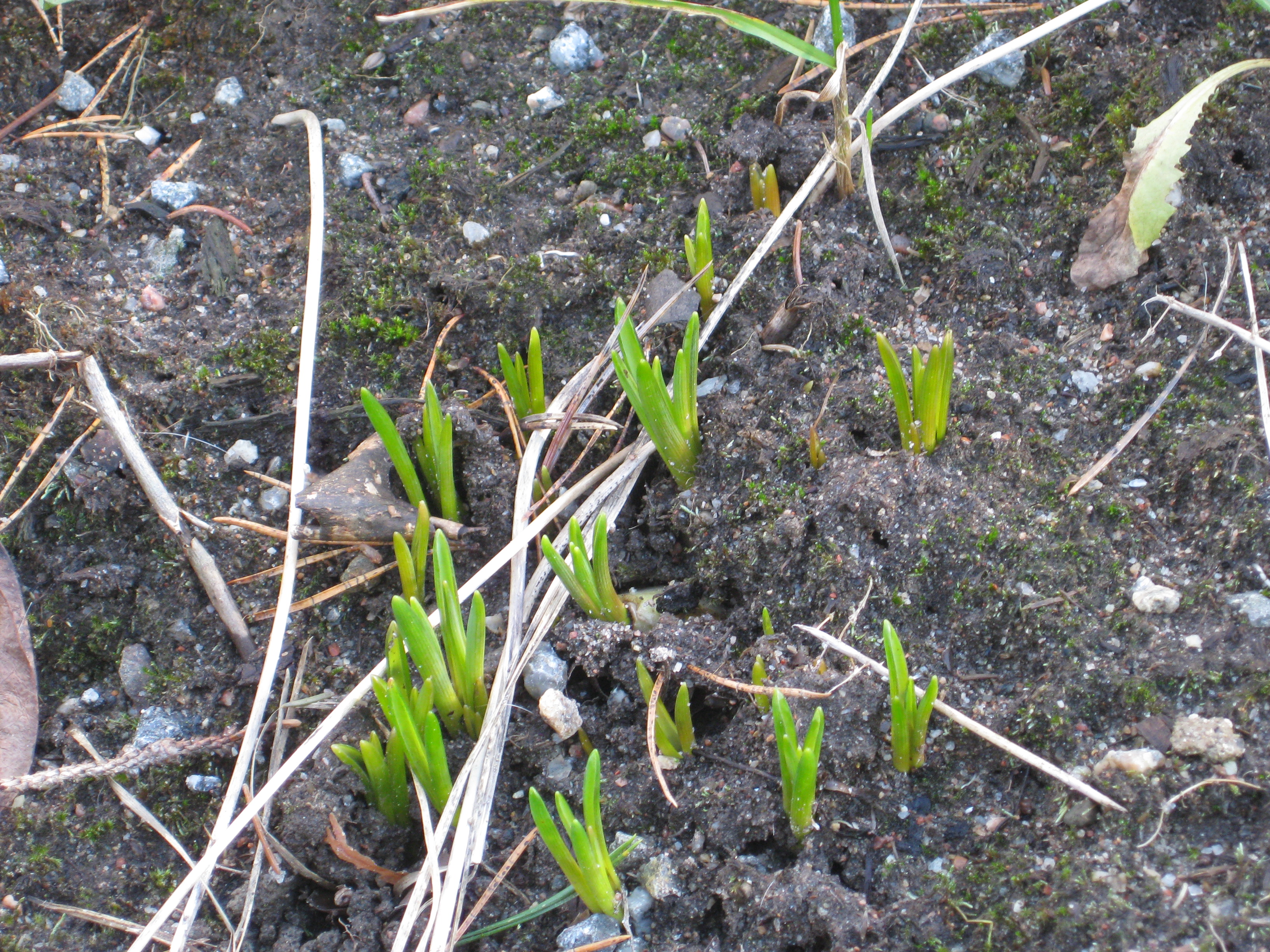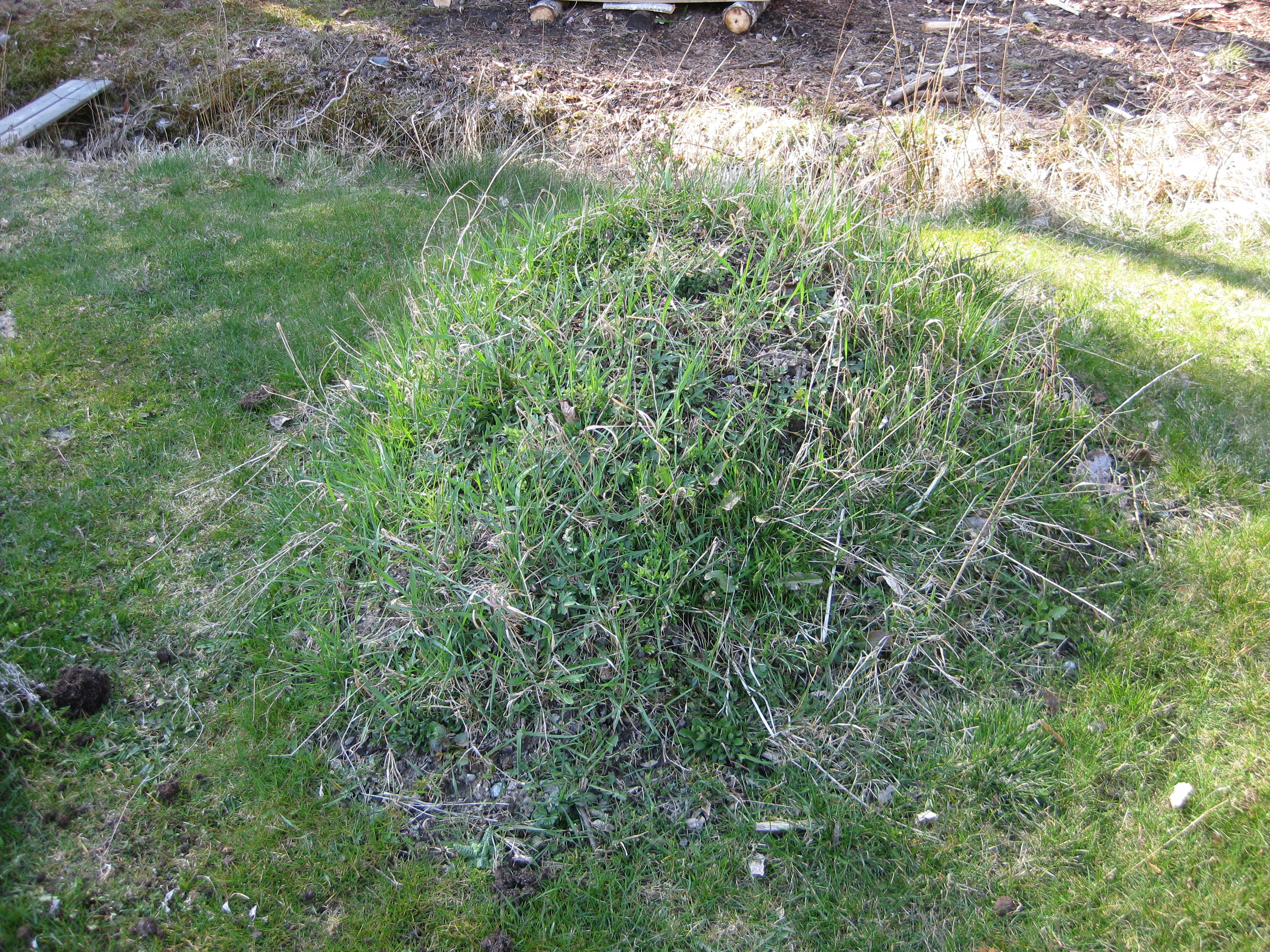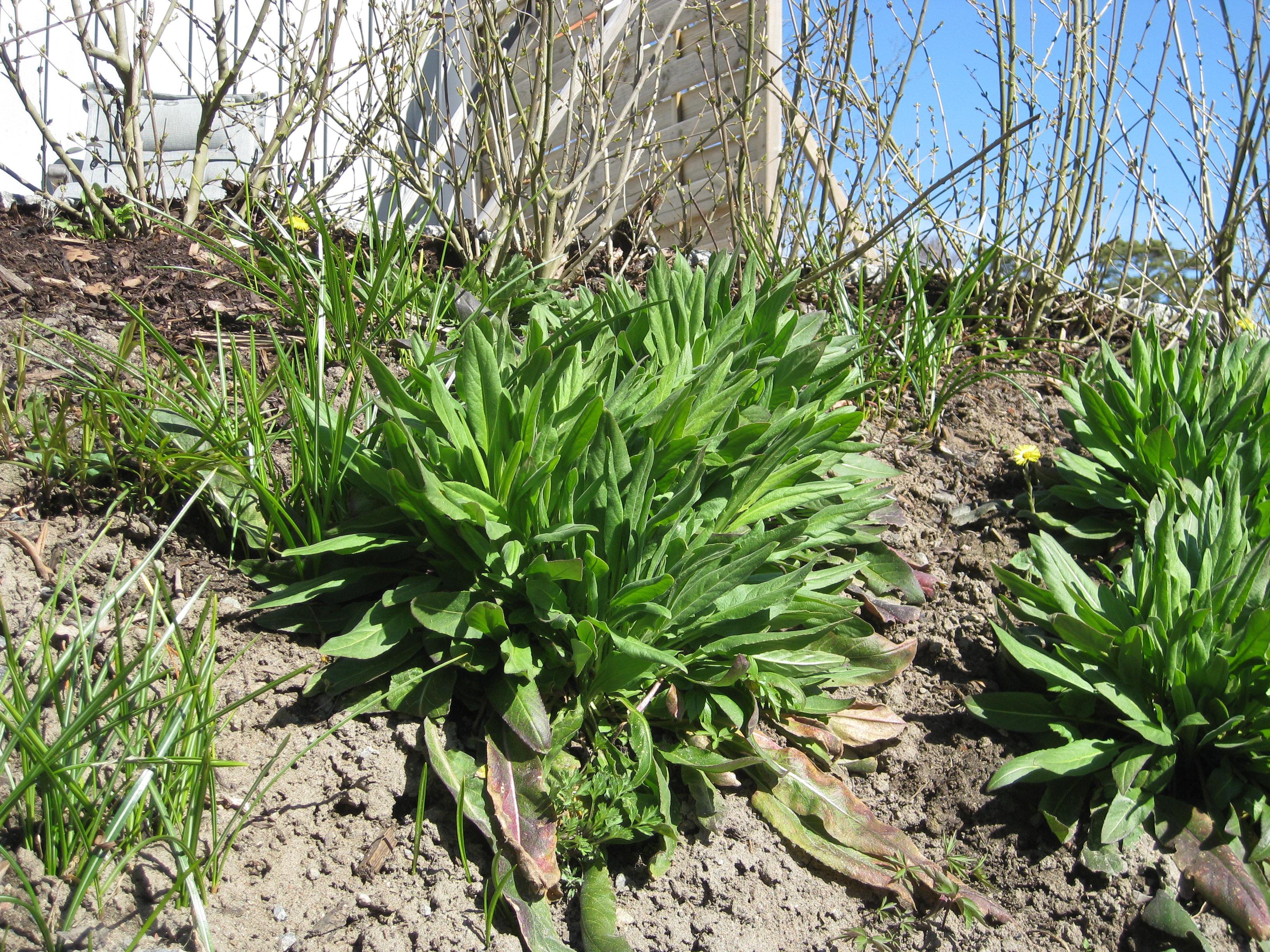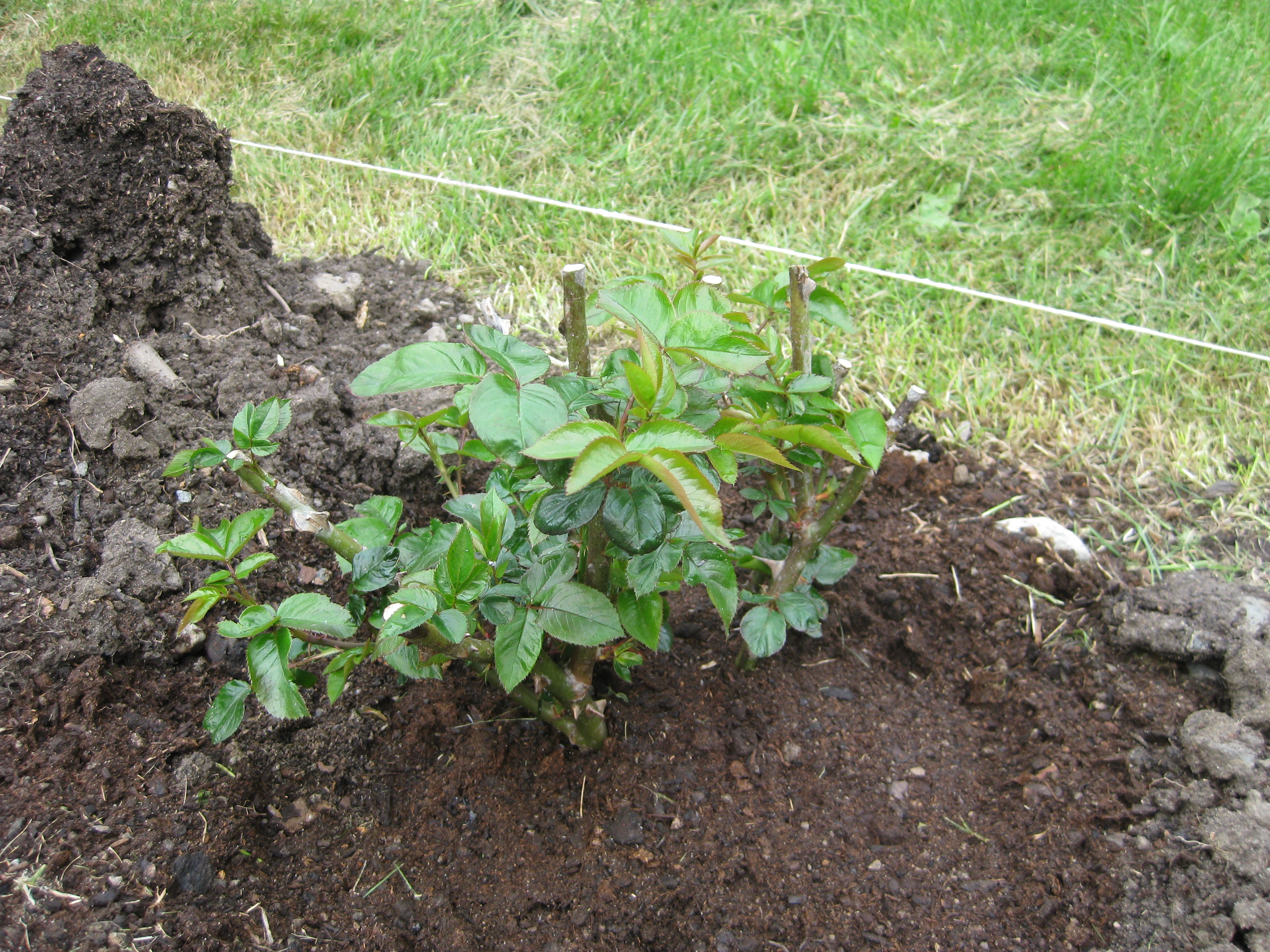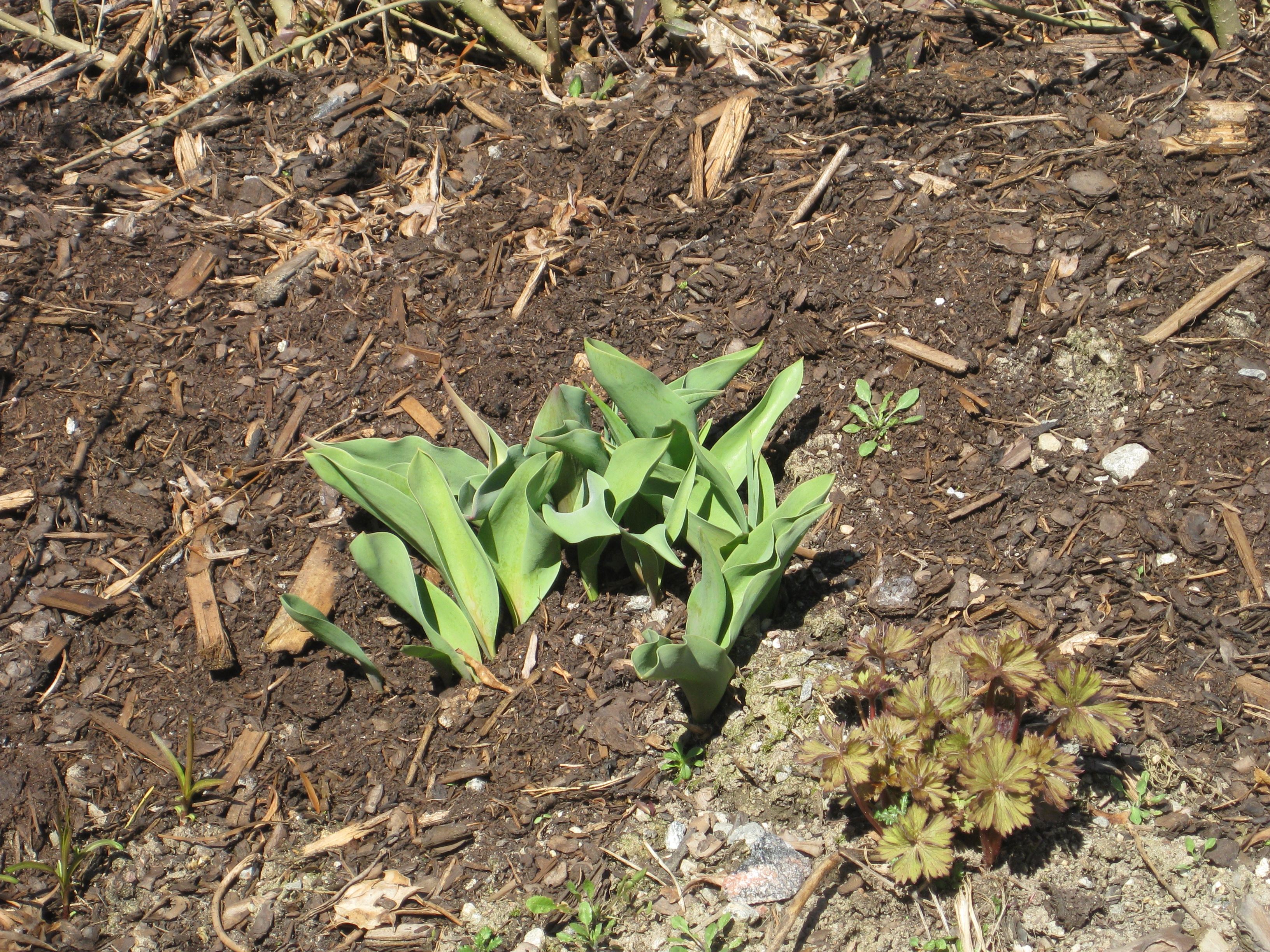 Lite växtlighet tittar upp på trekanten. Det ser ut som om de flesta av de nysatta syrénerna har klarat sig. En dvärgpil har dock dött. Vi täcker av rosorna som har börjat växa.