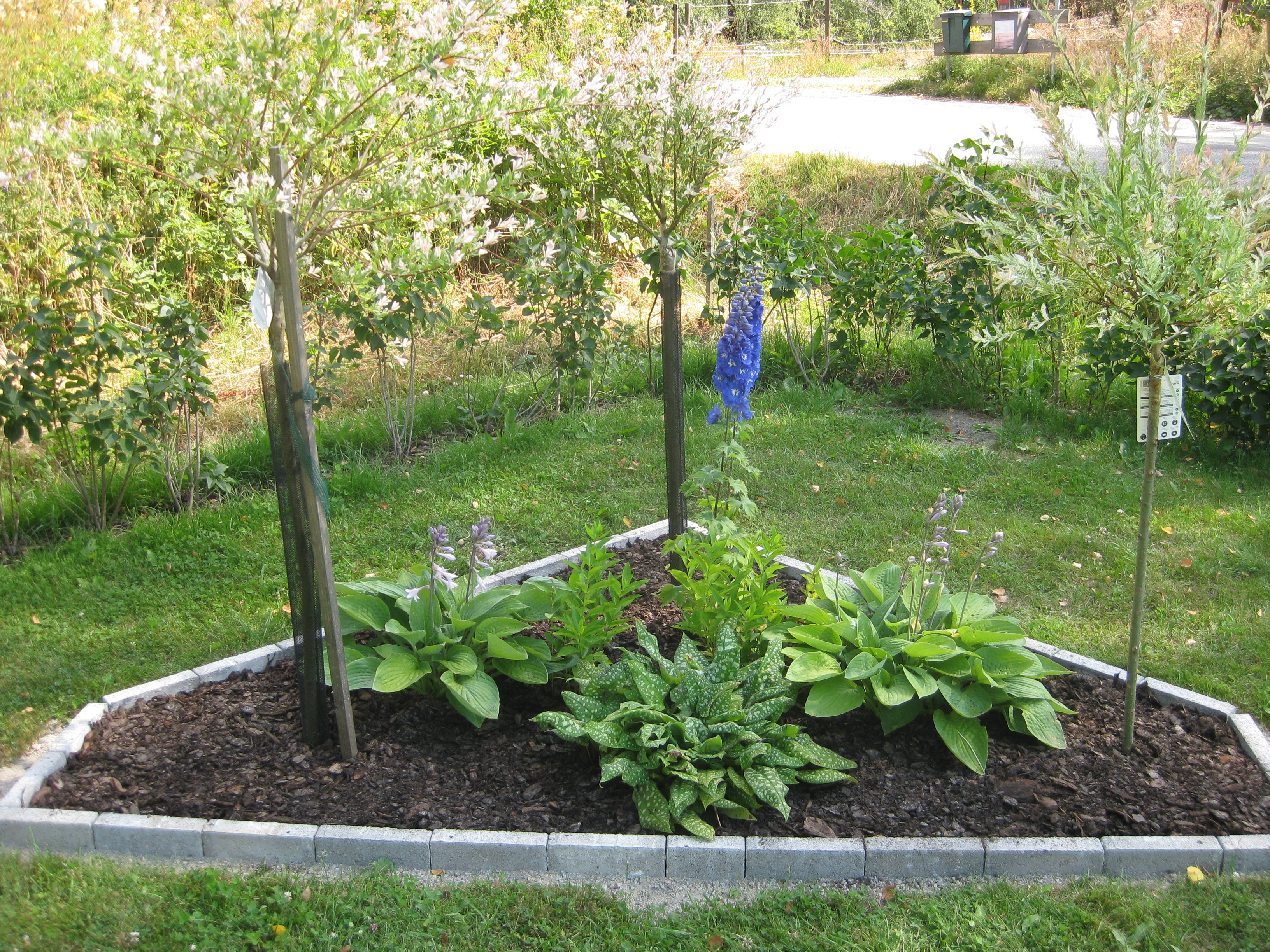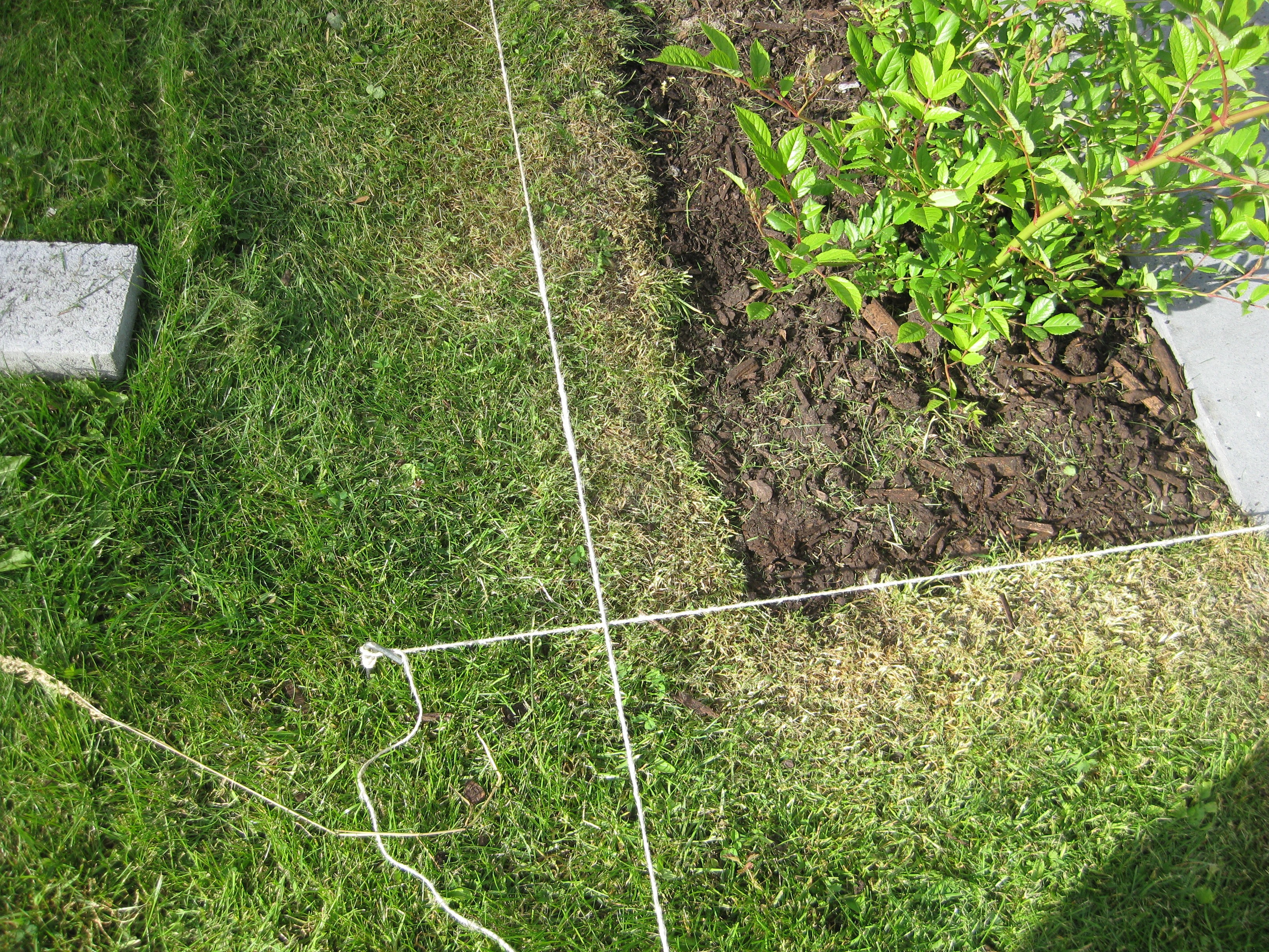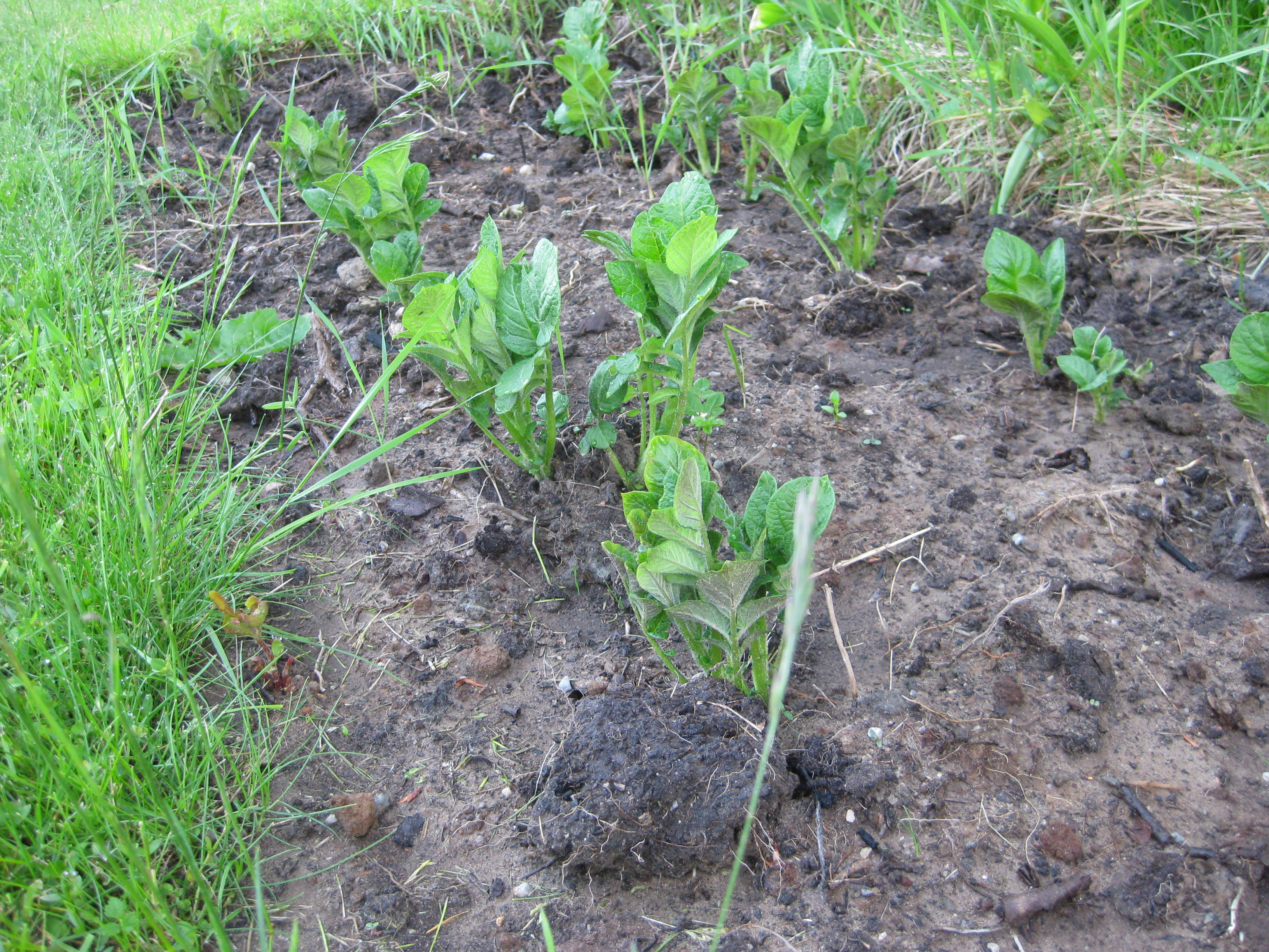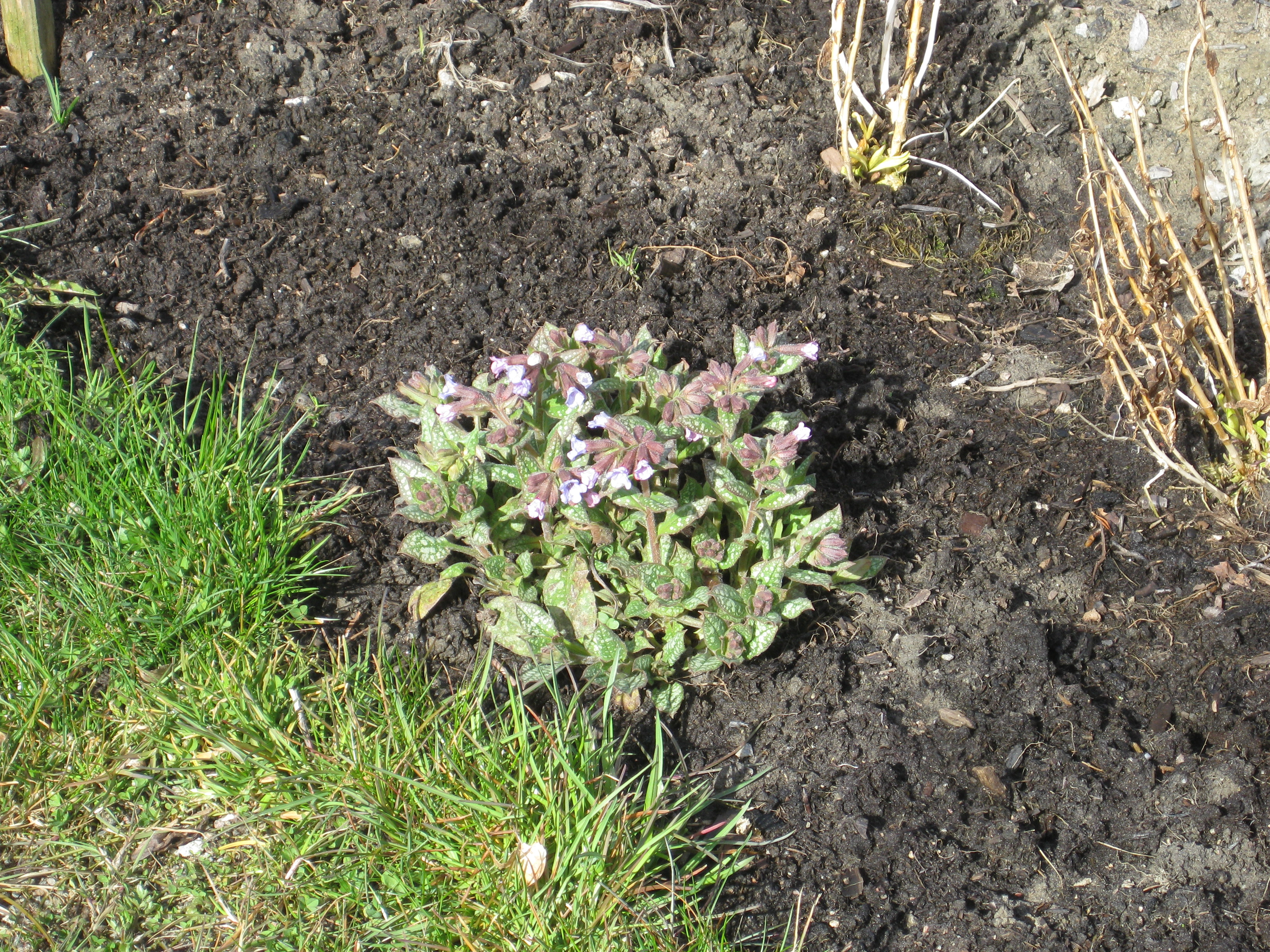 Lite växtlighet tittar upp på trekanten. Det ser ut som om de flesta av de nysatta syrénerna har klarat sig. En dvärgpil har dock dött. Vi täcker av rosorna som har börjat växa.