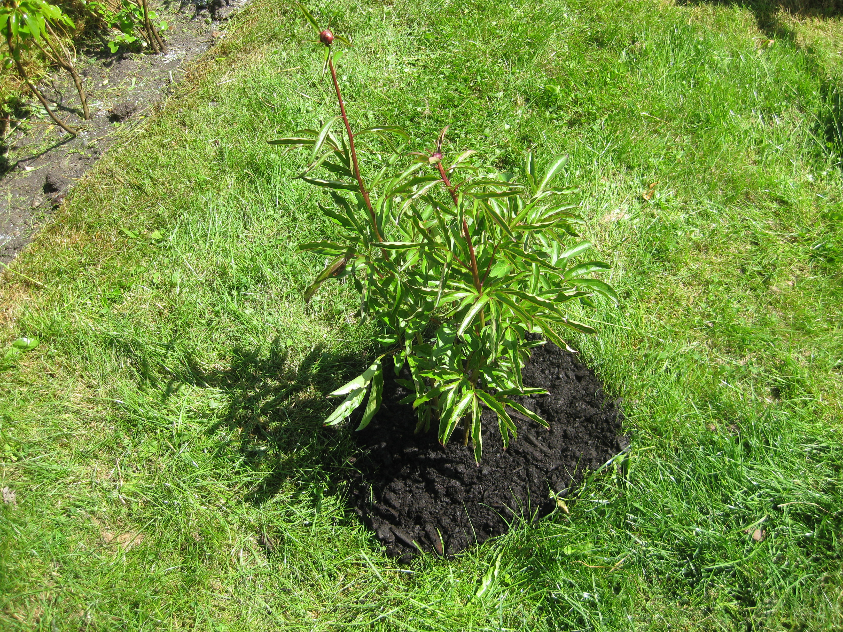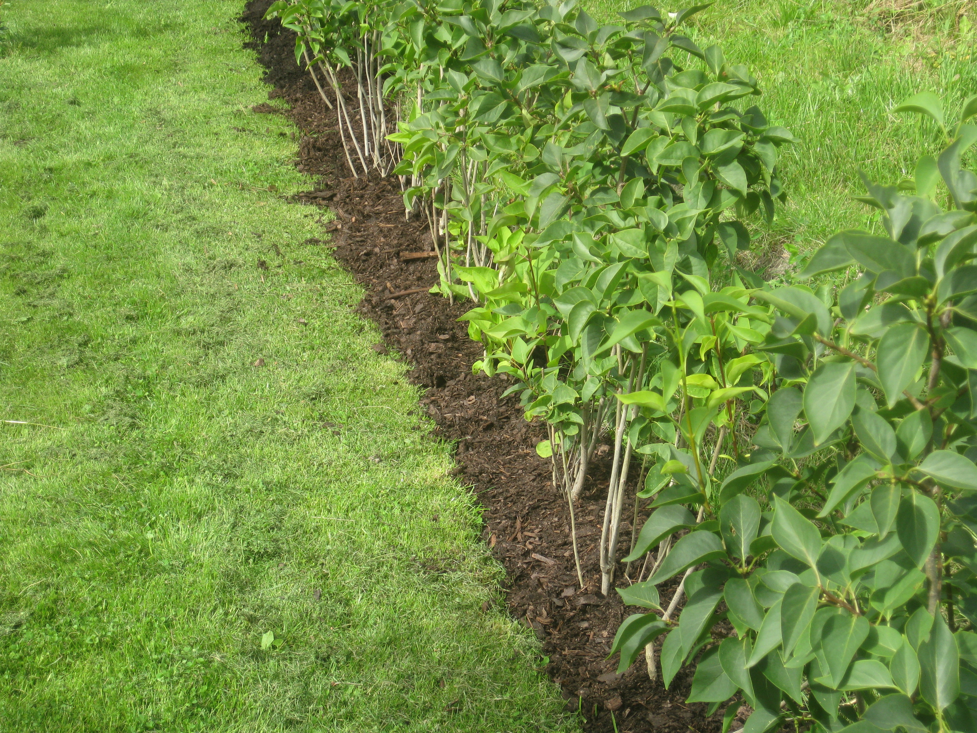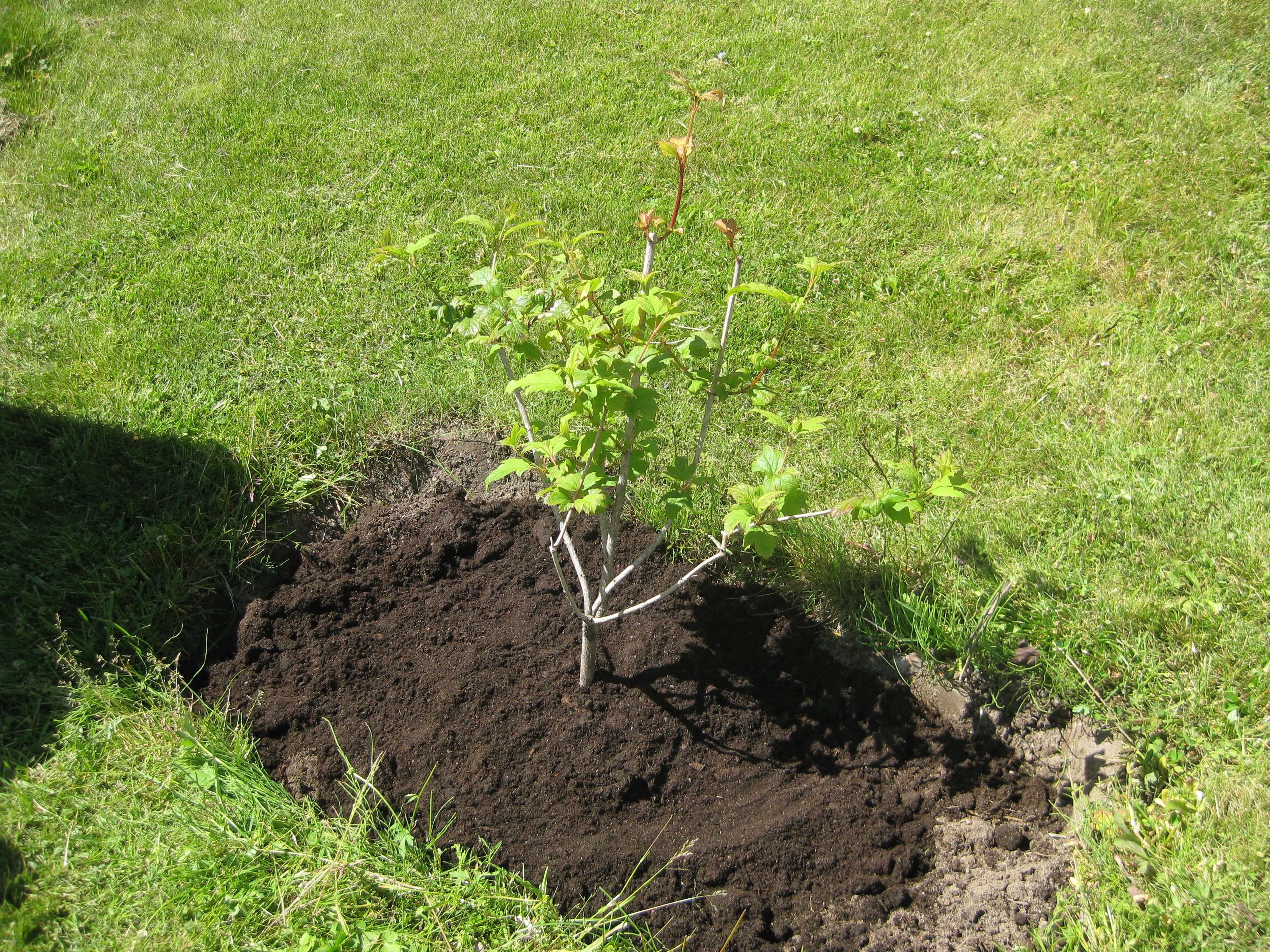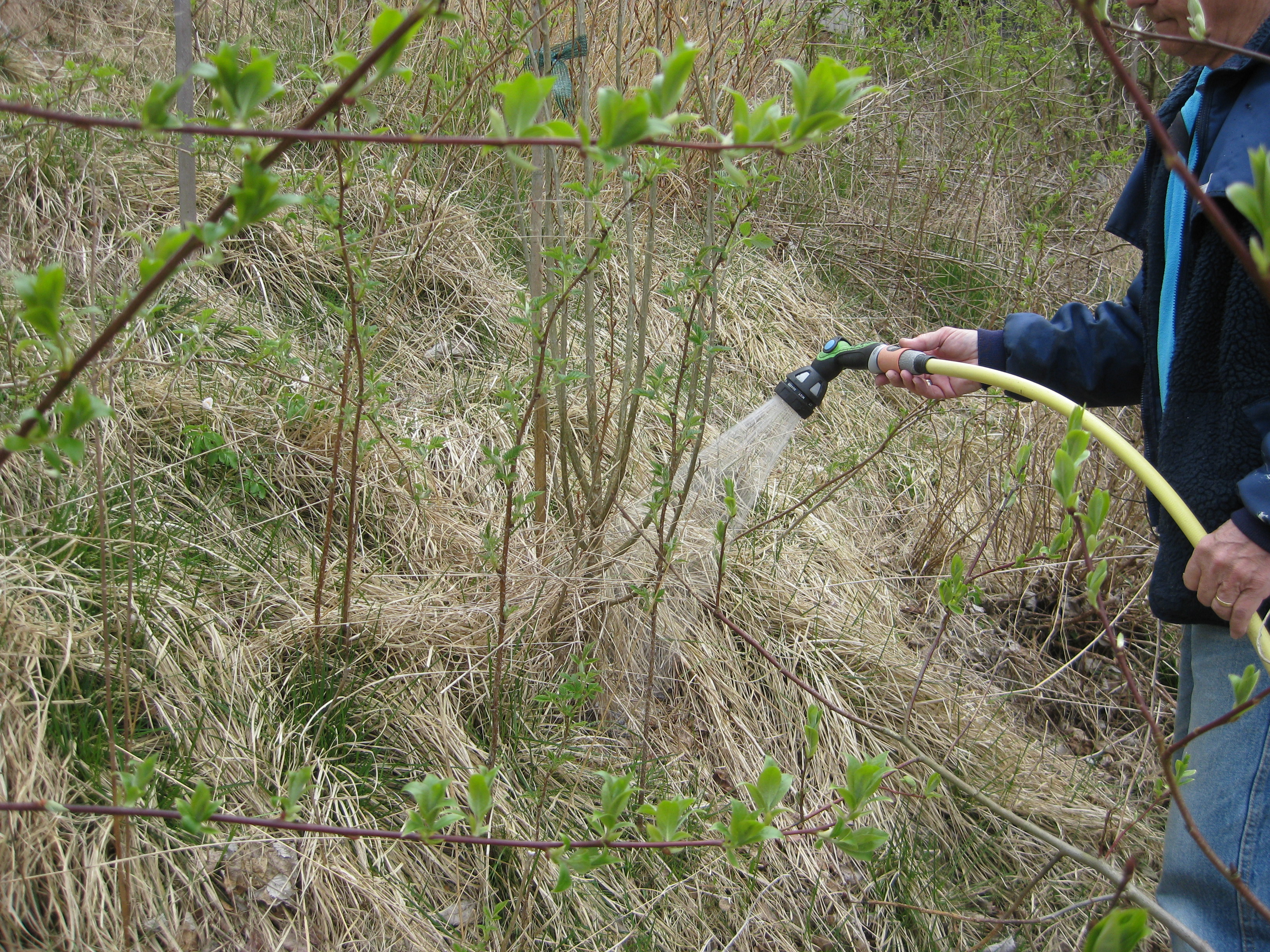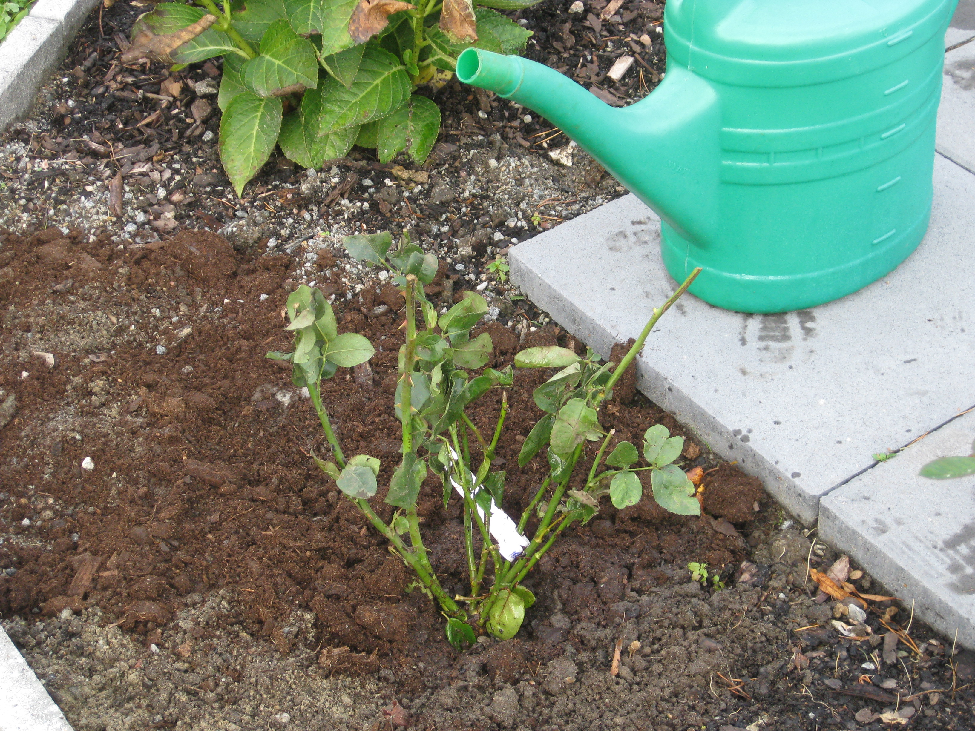 Lite växtlighet tittar upp på trekanten. Det ser ut som om de flesta av de nysatta syrénerna har klarat sig. En dvärgpil har dock dött. Vi täcker av rosorna som har börjat växa.