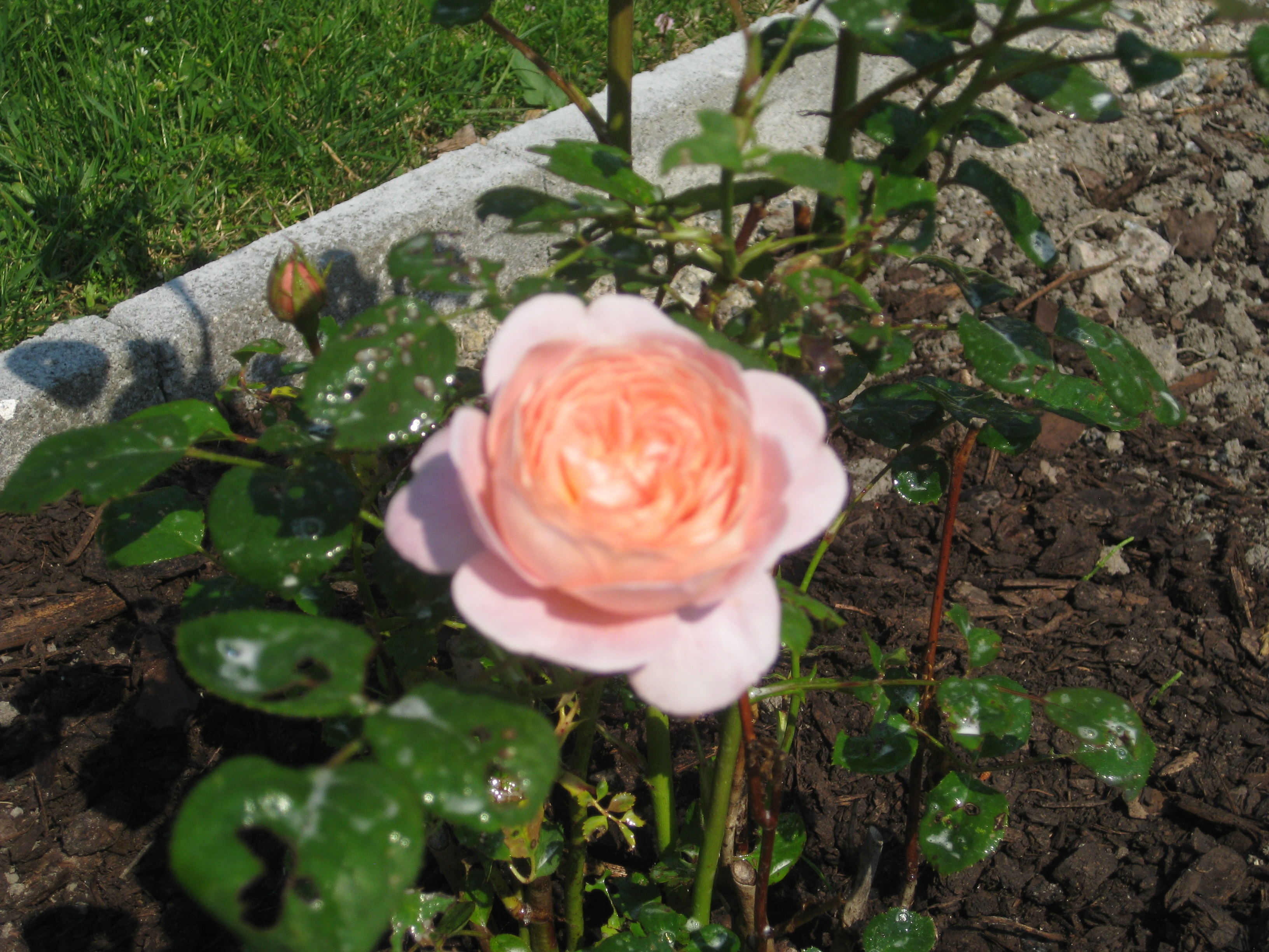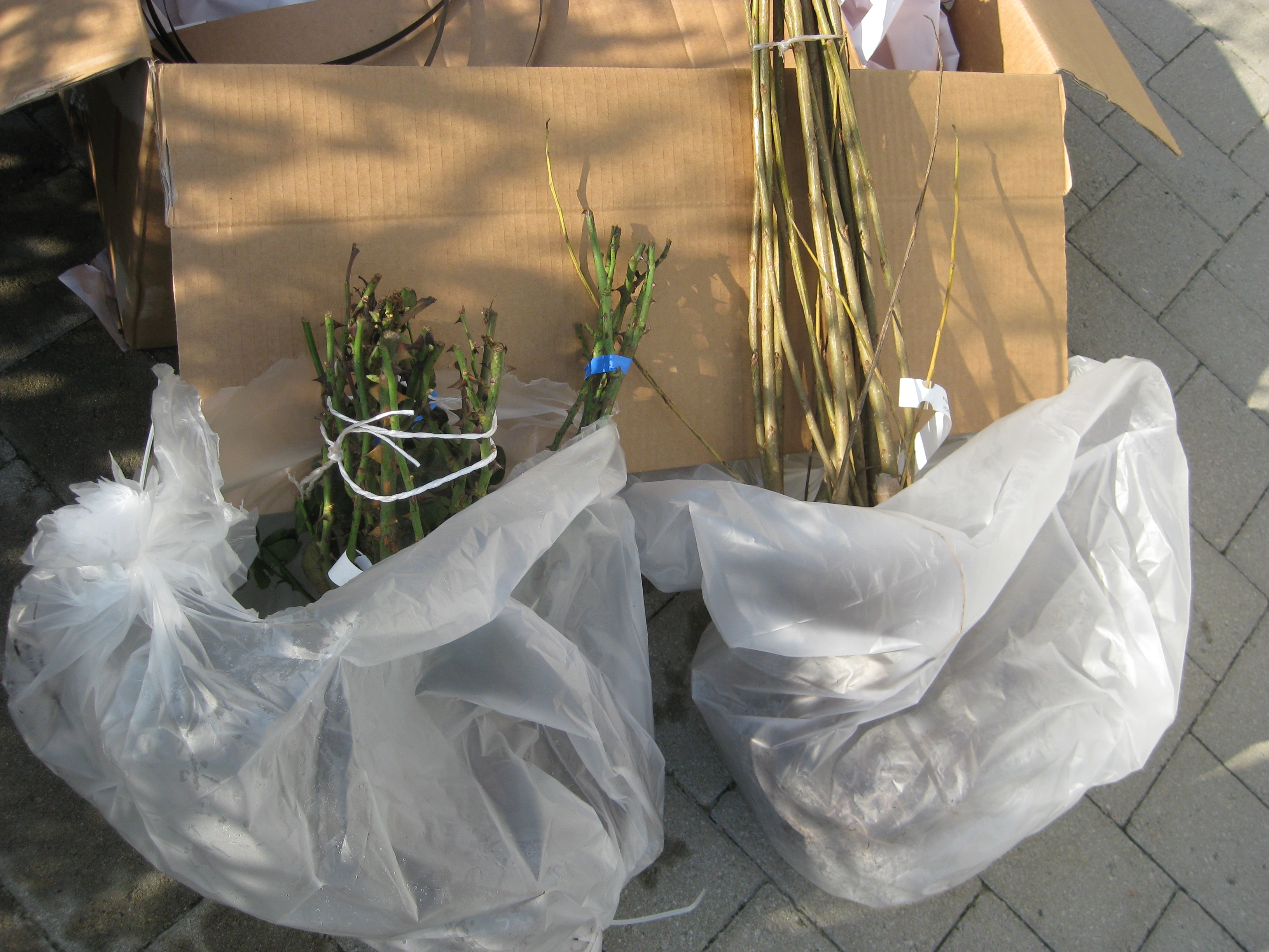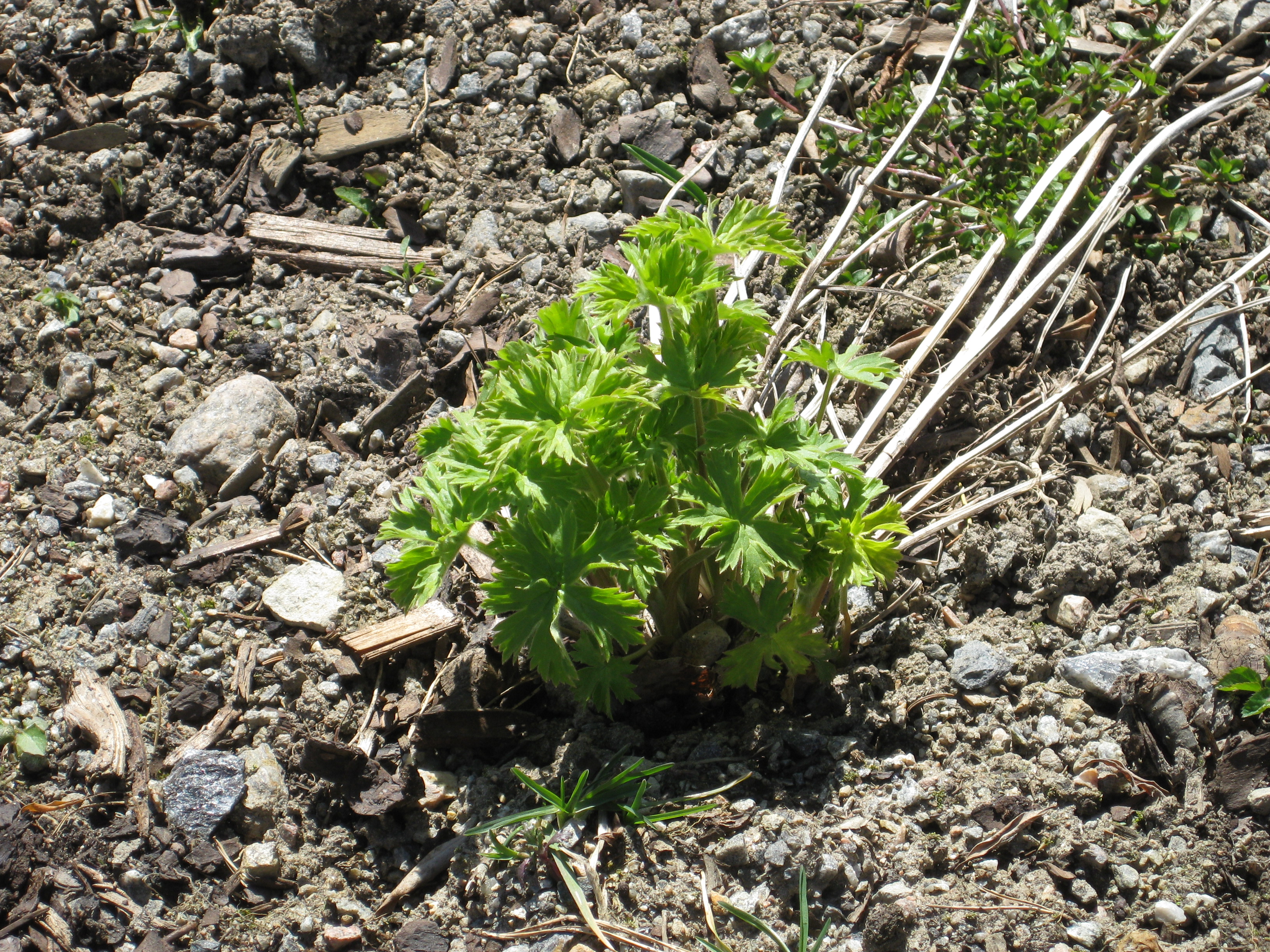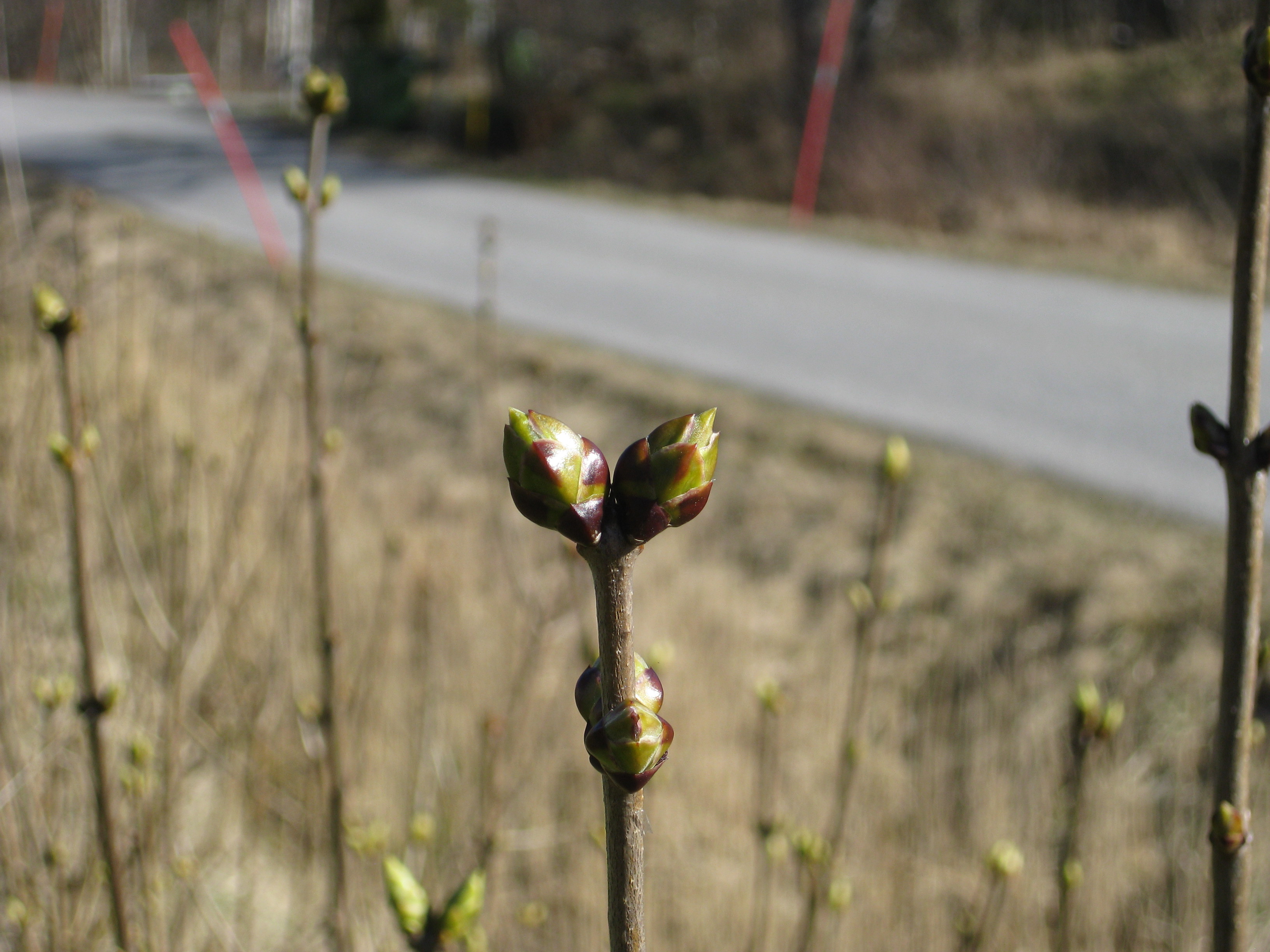 Lite växtlighet tittar upp på trekanten. Det ser ut som om de flesta av de nysatta syrénerna har klarat sig. En dvärgpil har dock dött. Vi täcker av rosorna som har börjat växa.