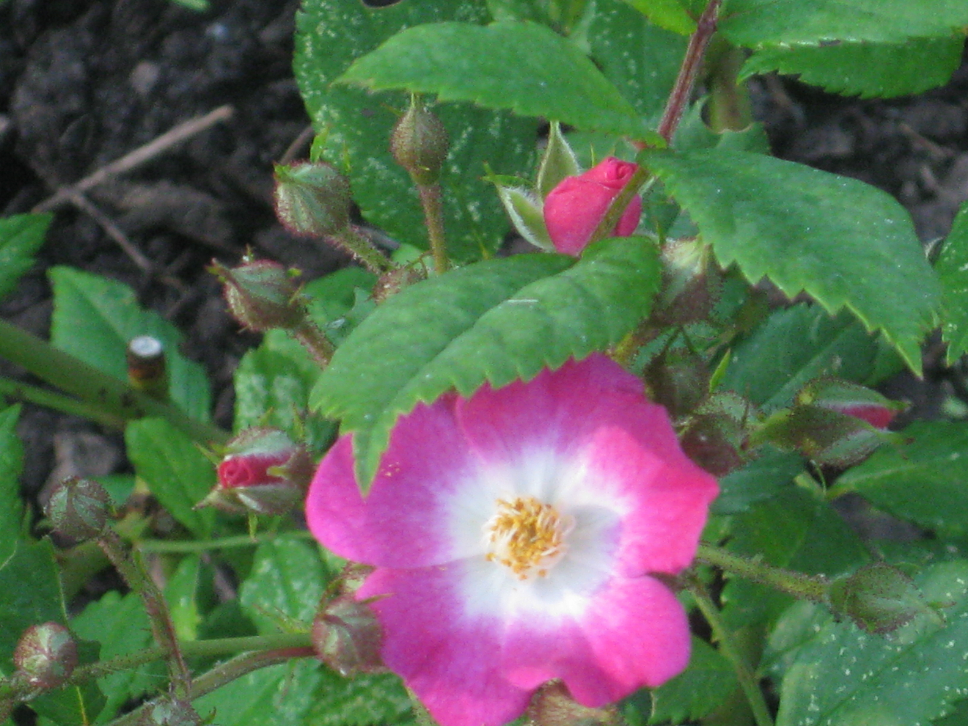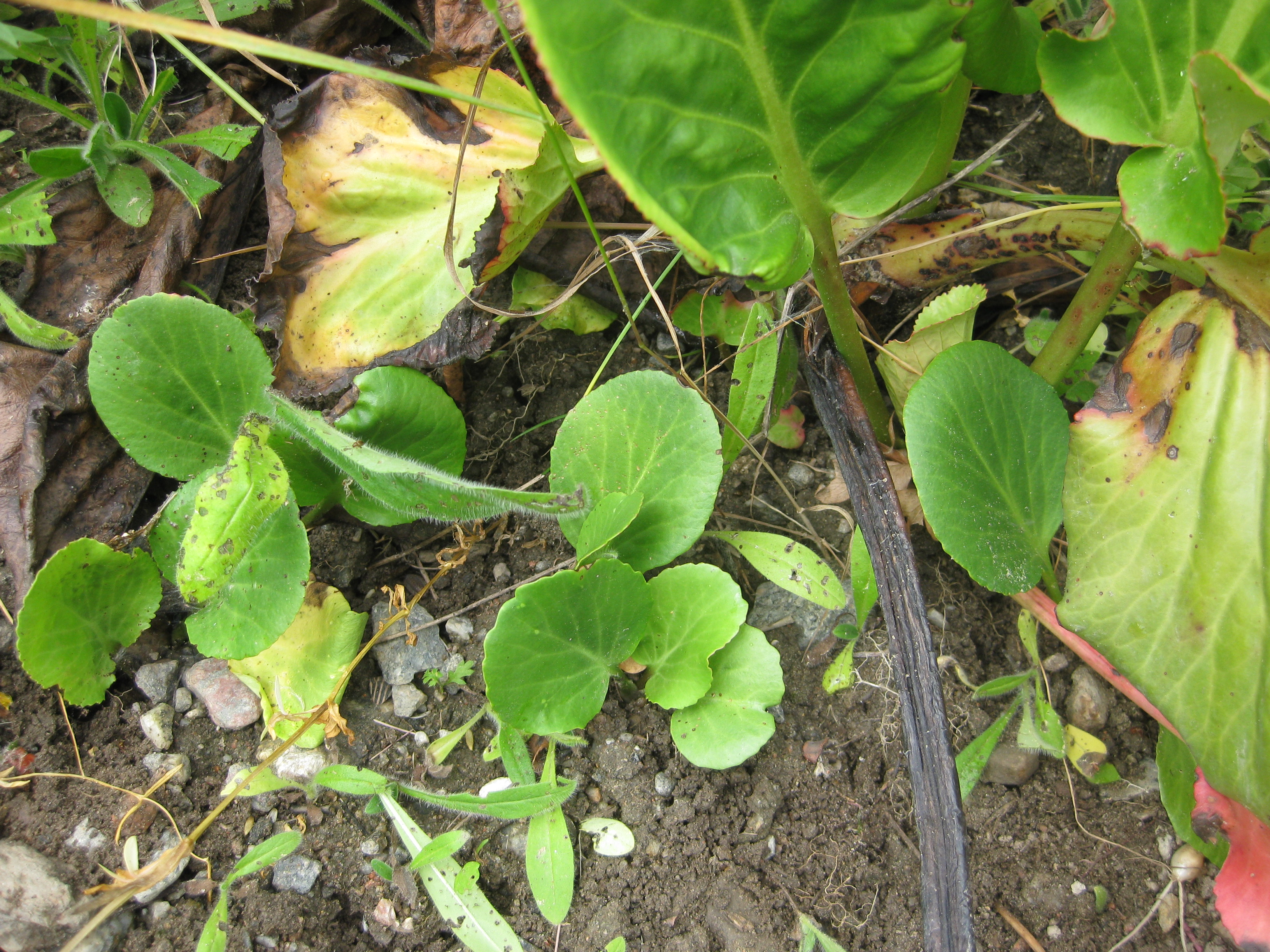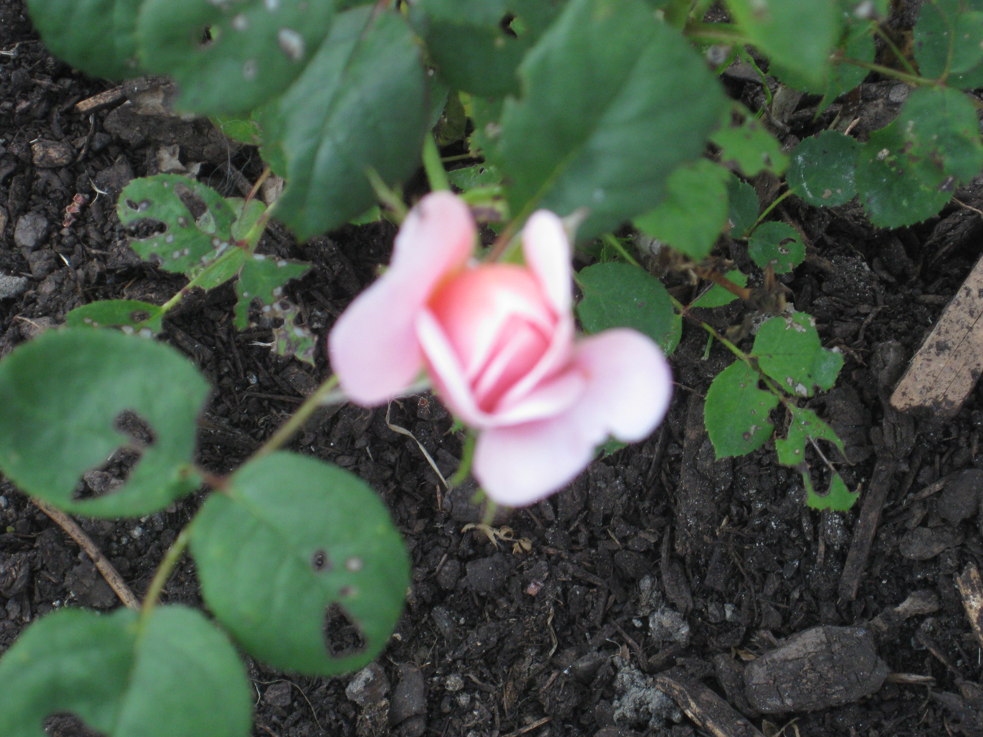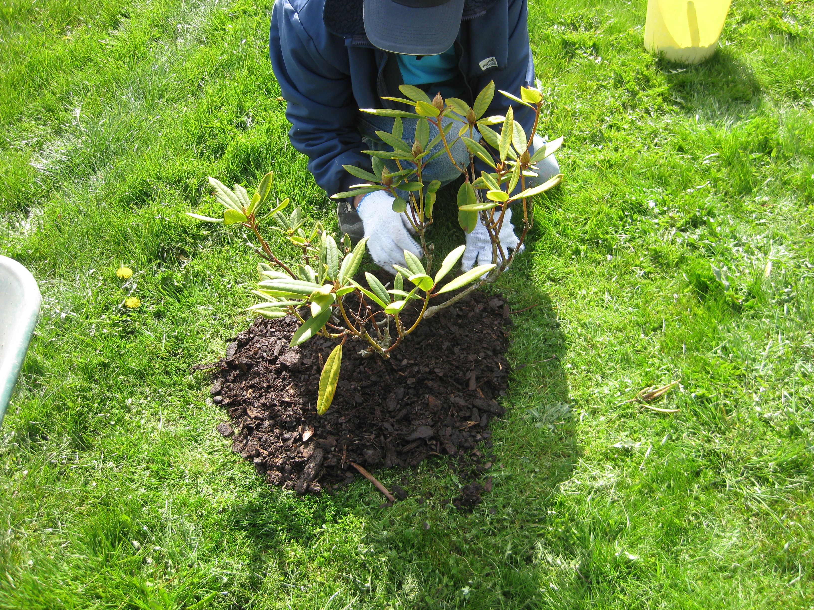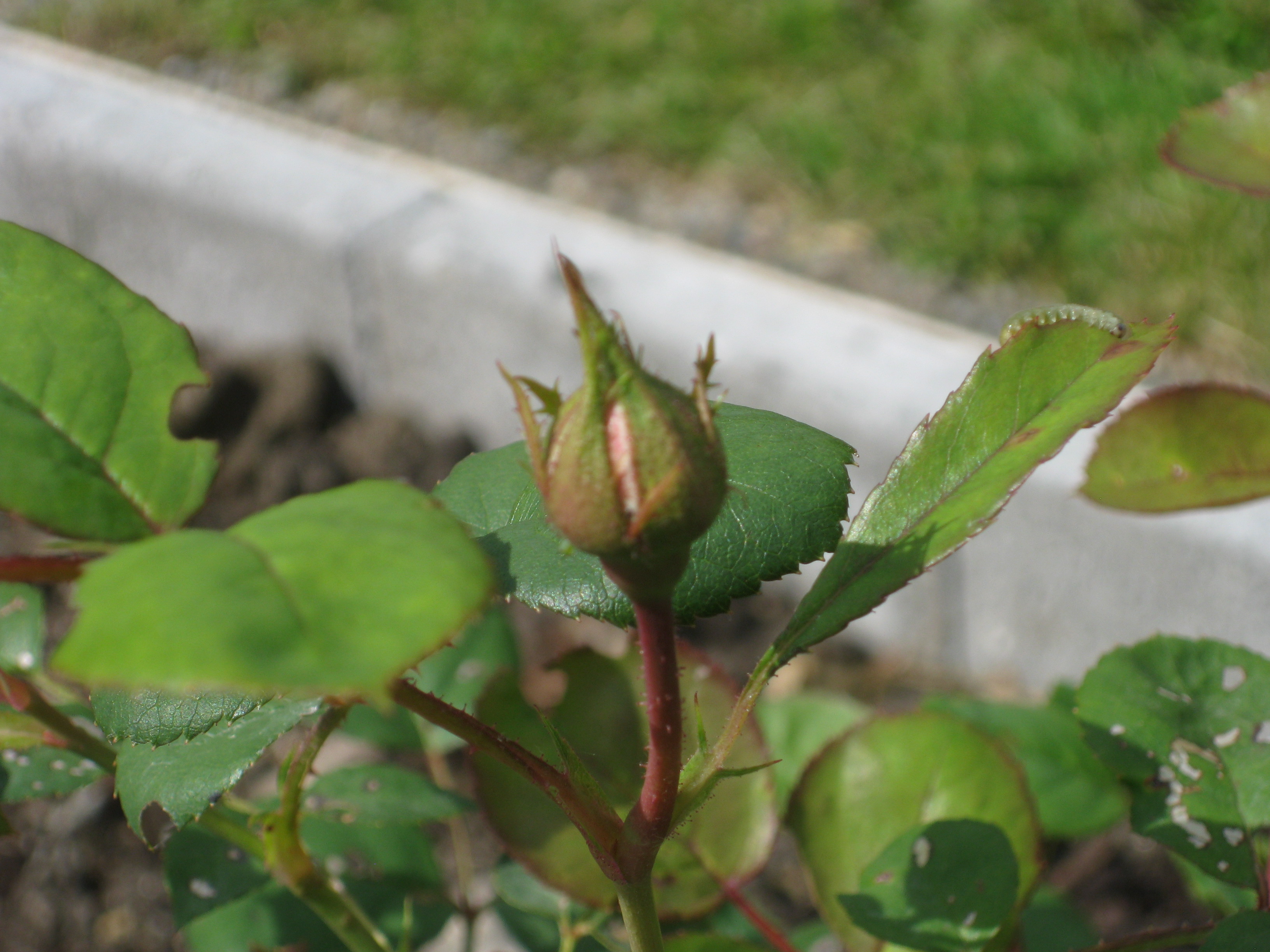 Lite växtlighet tittar upp på trekanten. Det ser ut som om de flesta av de nysatta syrénerna har klarat sig. En dvärgpil har dock dött. Vi täcker av rosorna som har börjat växa.