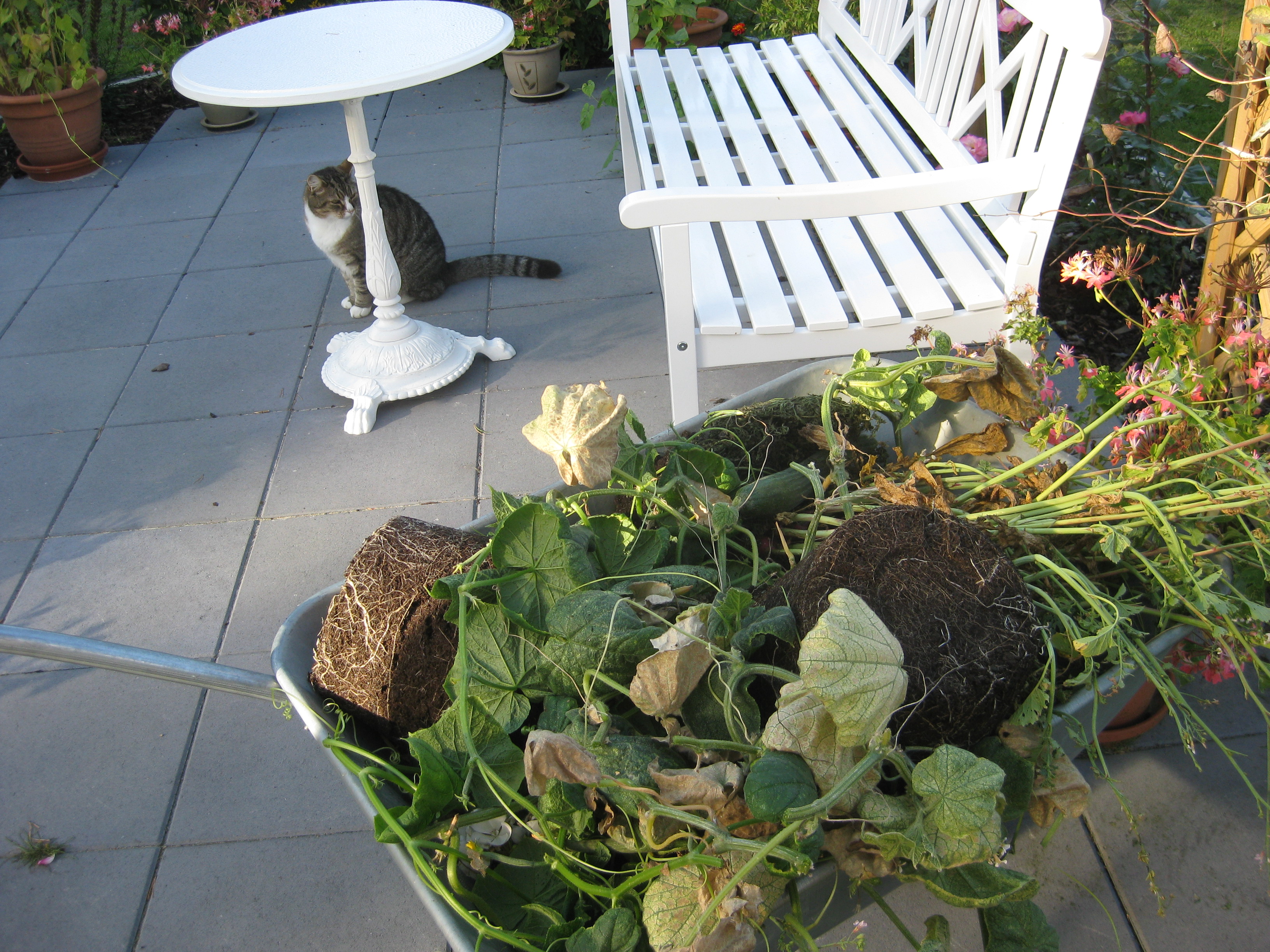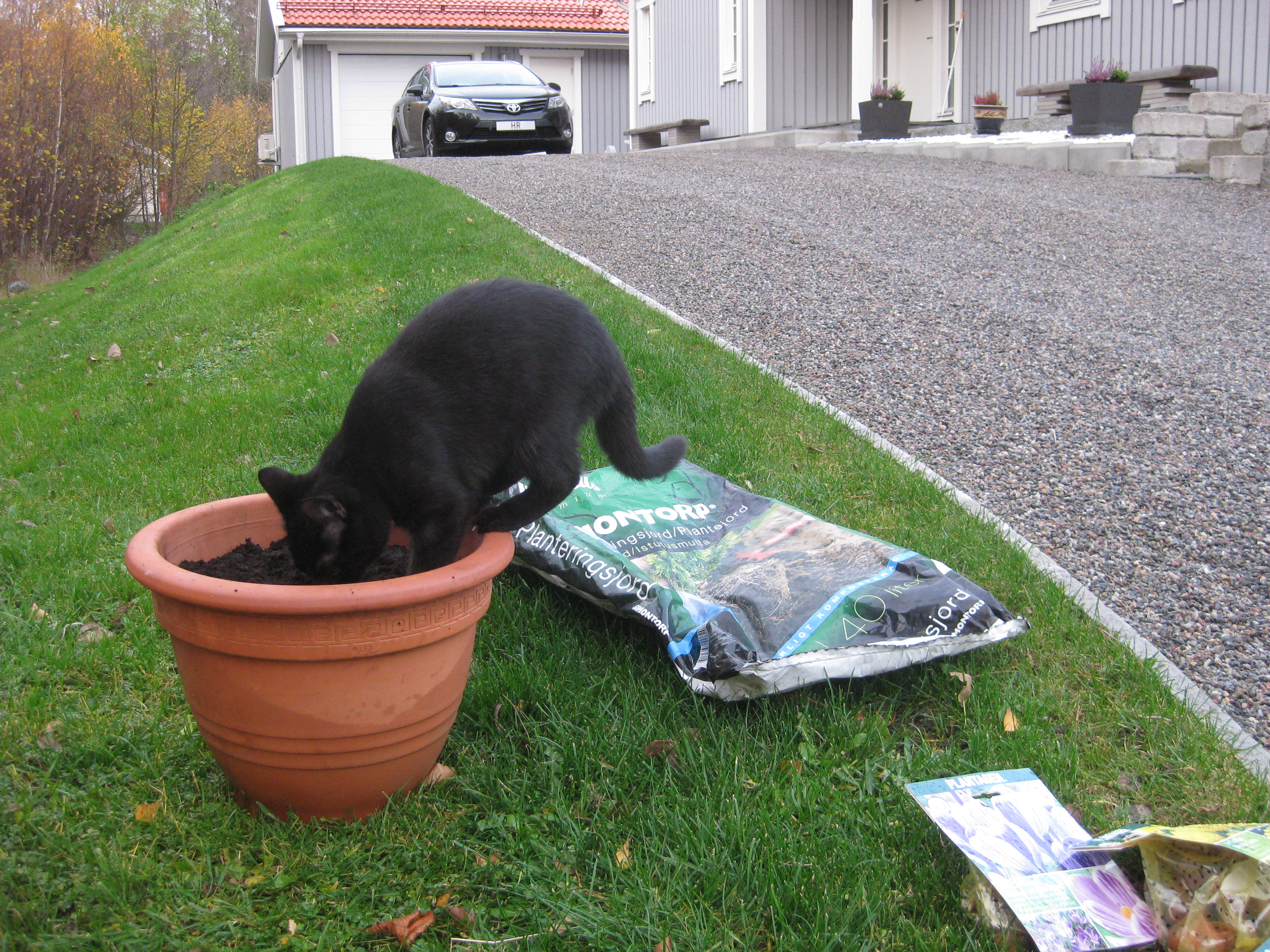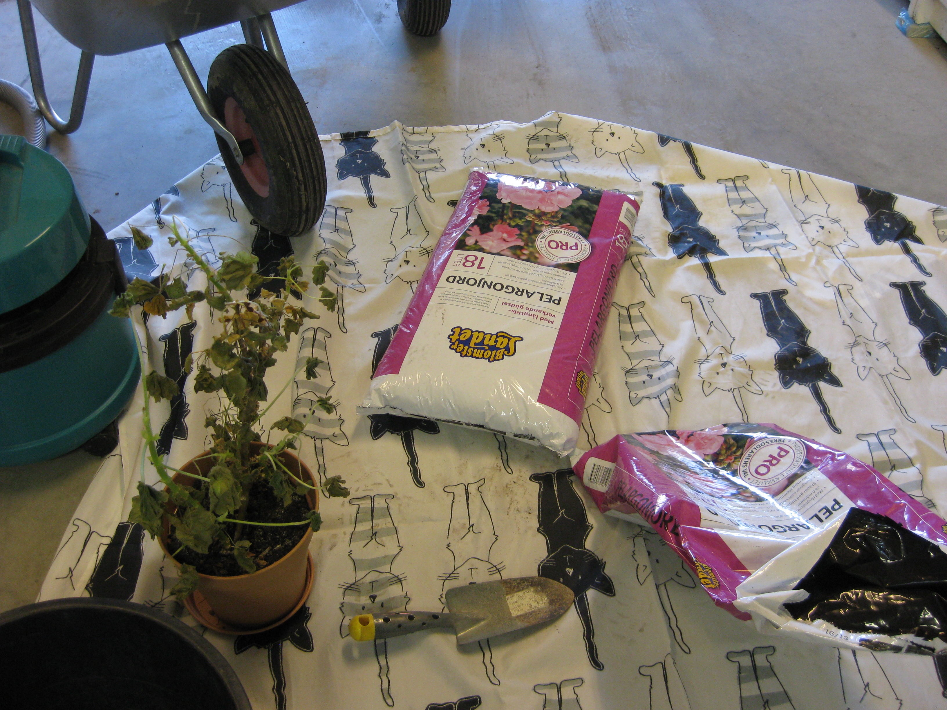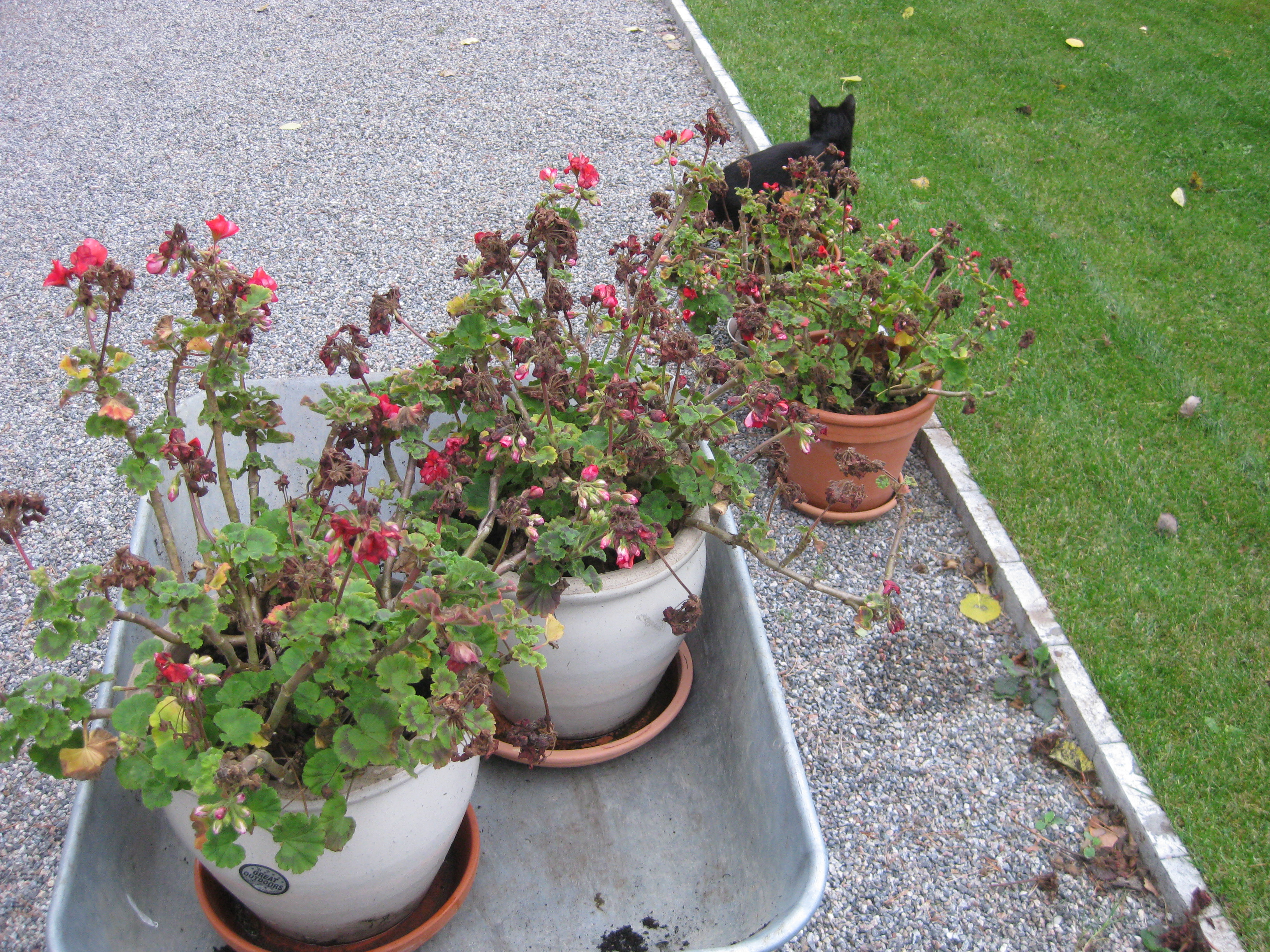 Dags för lite höstblommor i krukorna. Och dags att ta in pelargoner. Planterar en jordärtskocka, och studerar kattbeteenden.