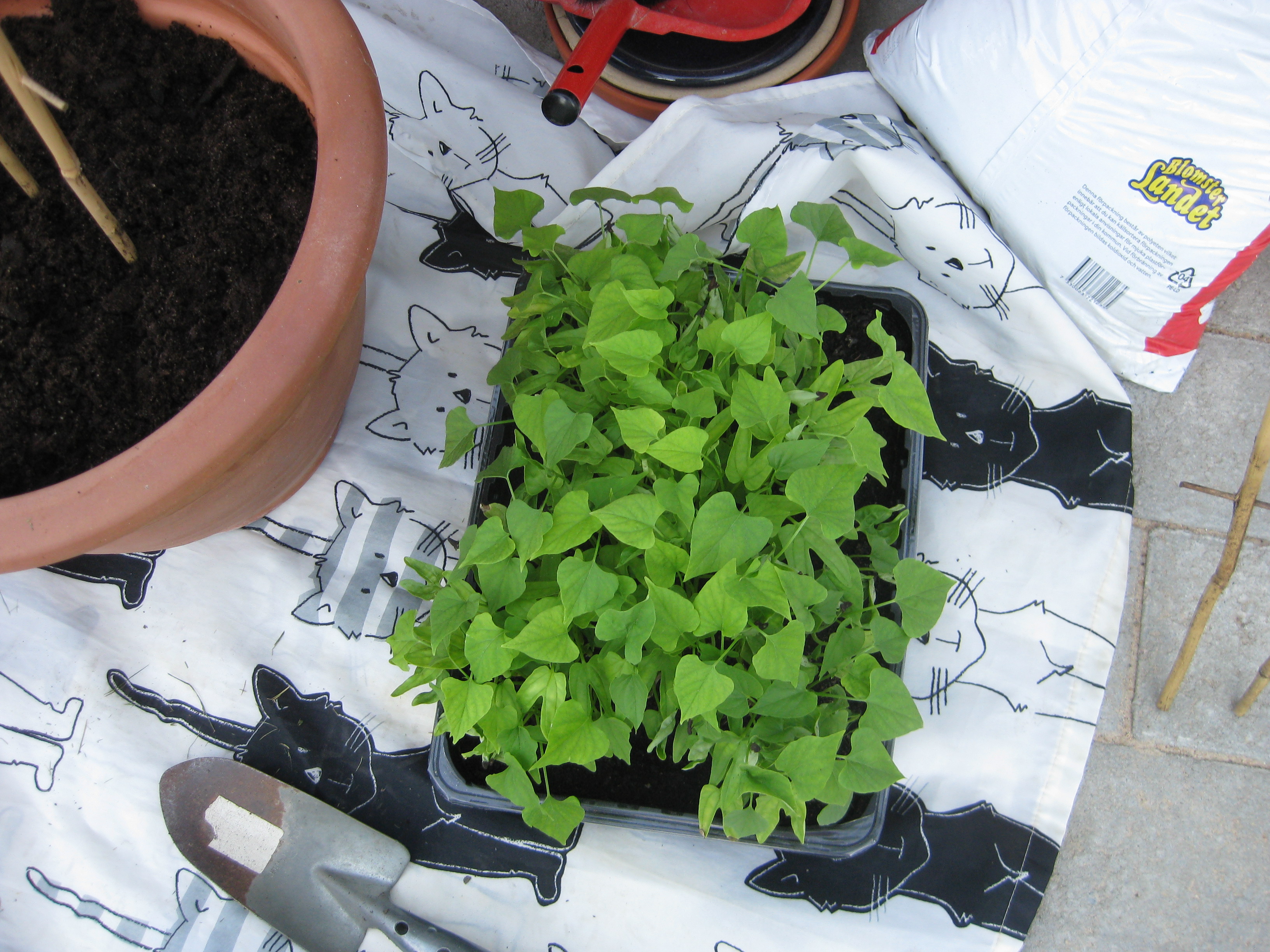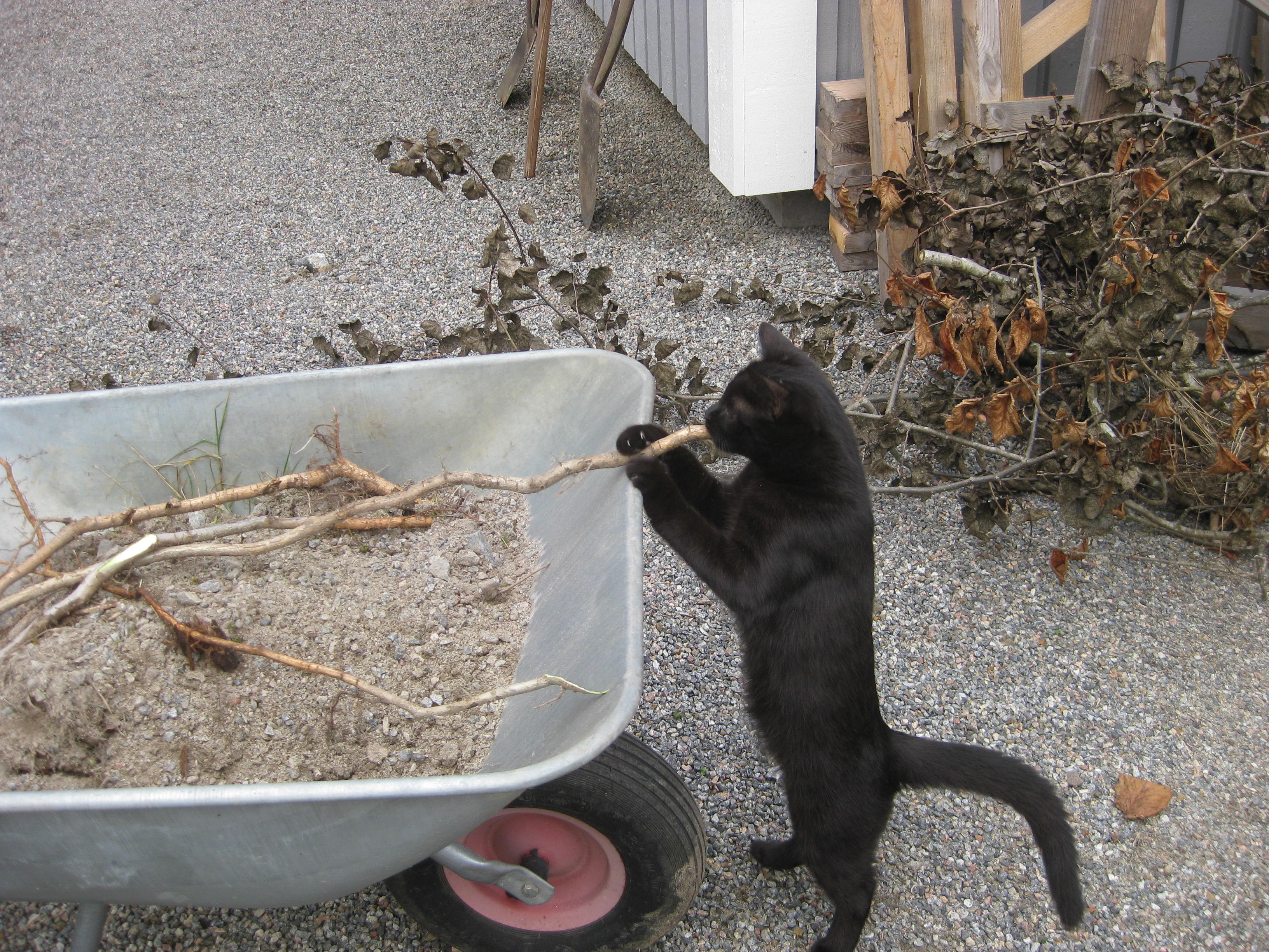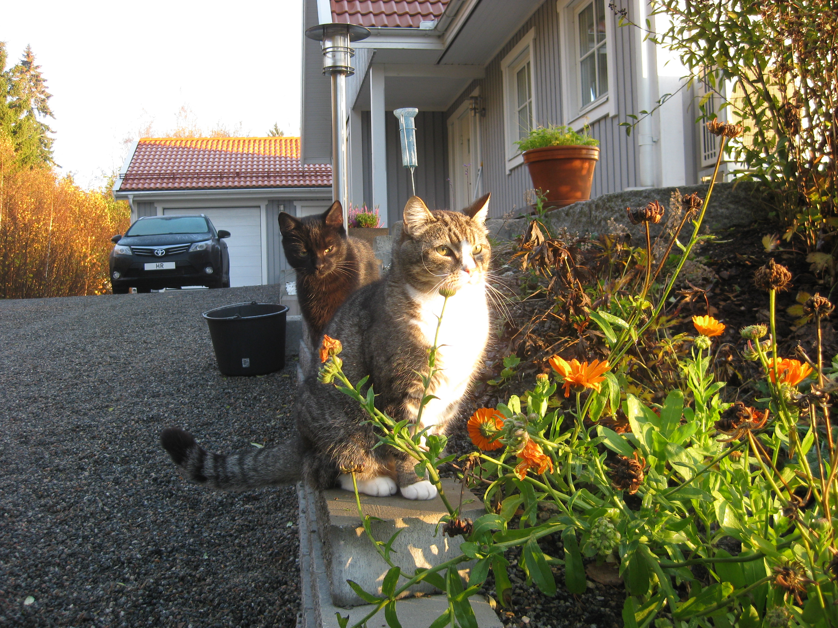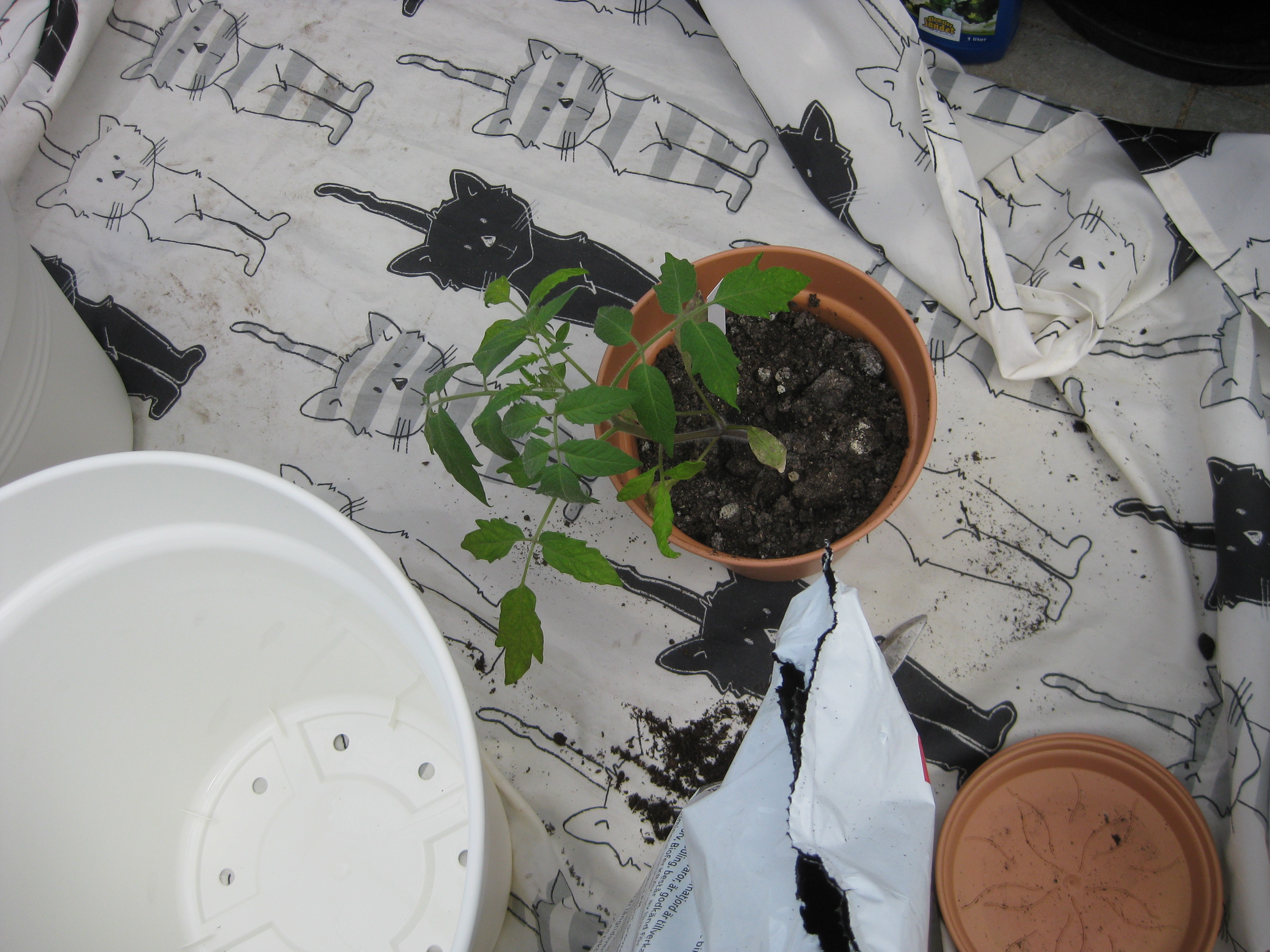 Dags för lite höstblommor i krukorna. Och dags att ta in pelargoner. Planterar en jordärtskocka, och studerar kattbeteenden.