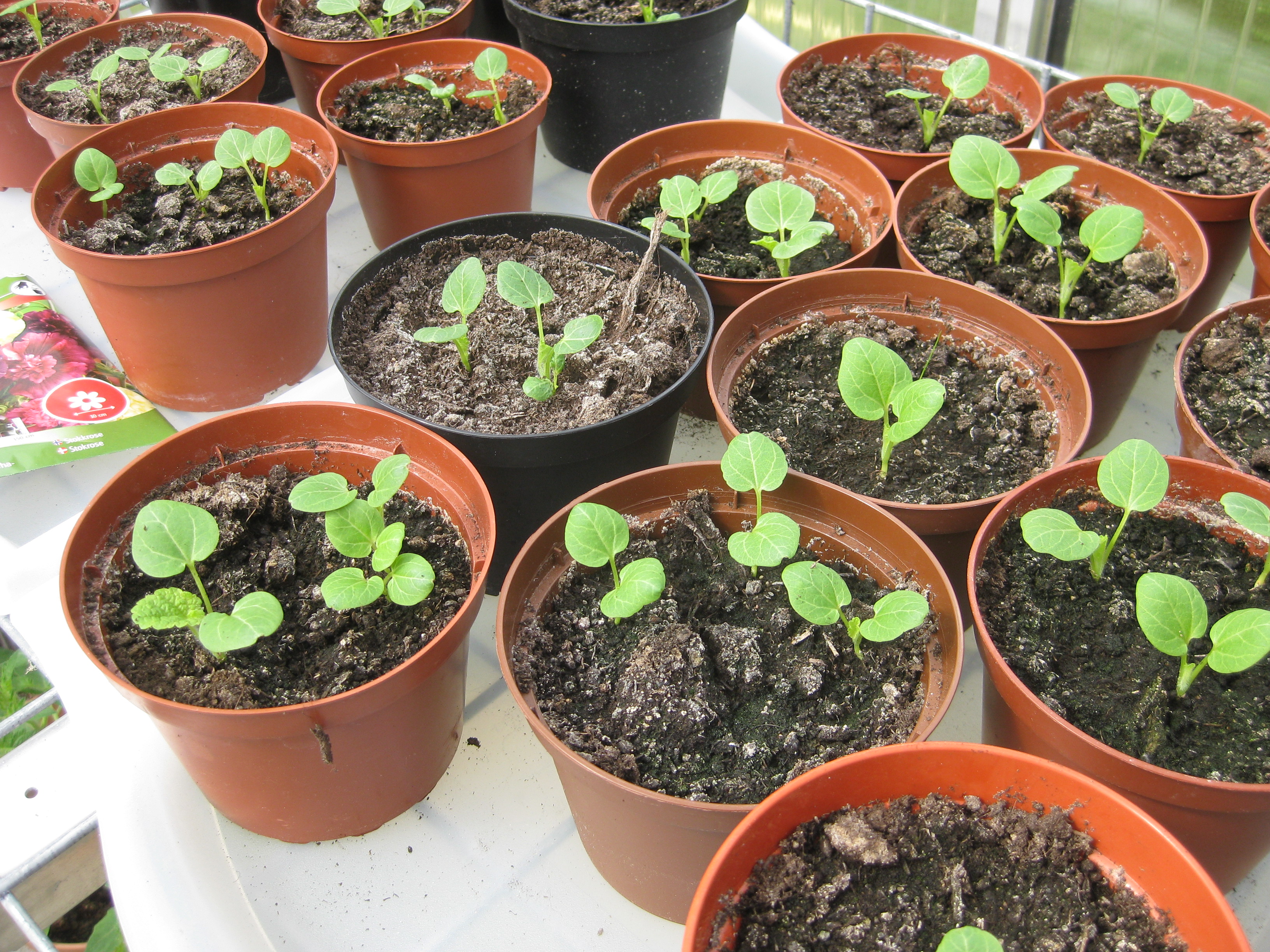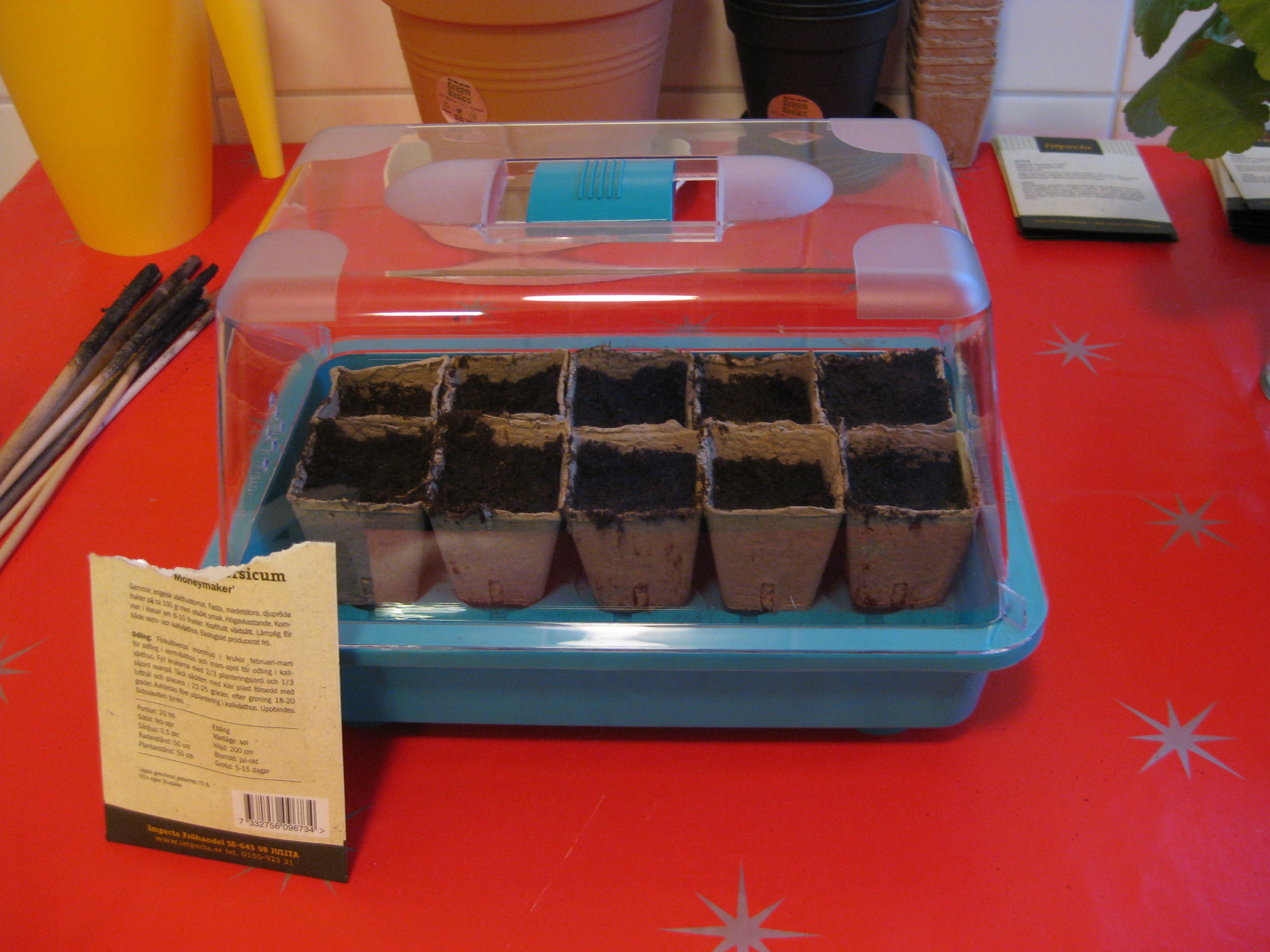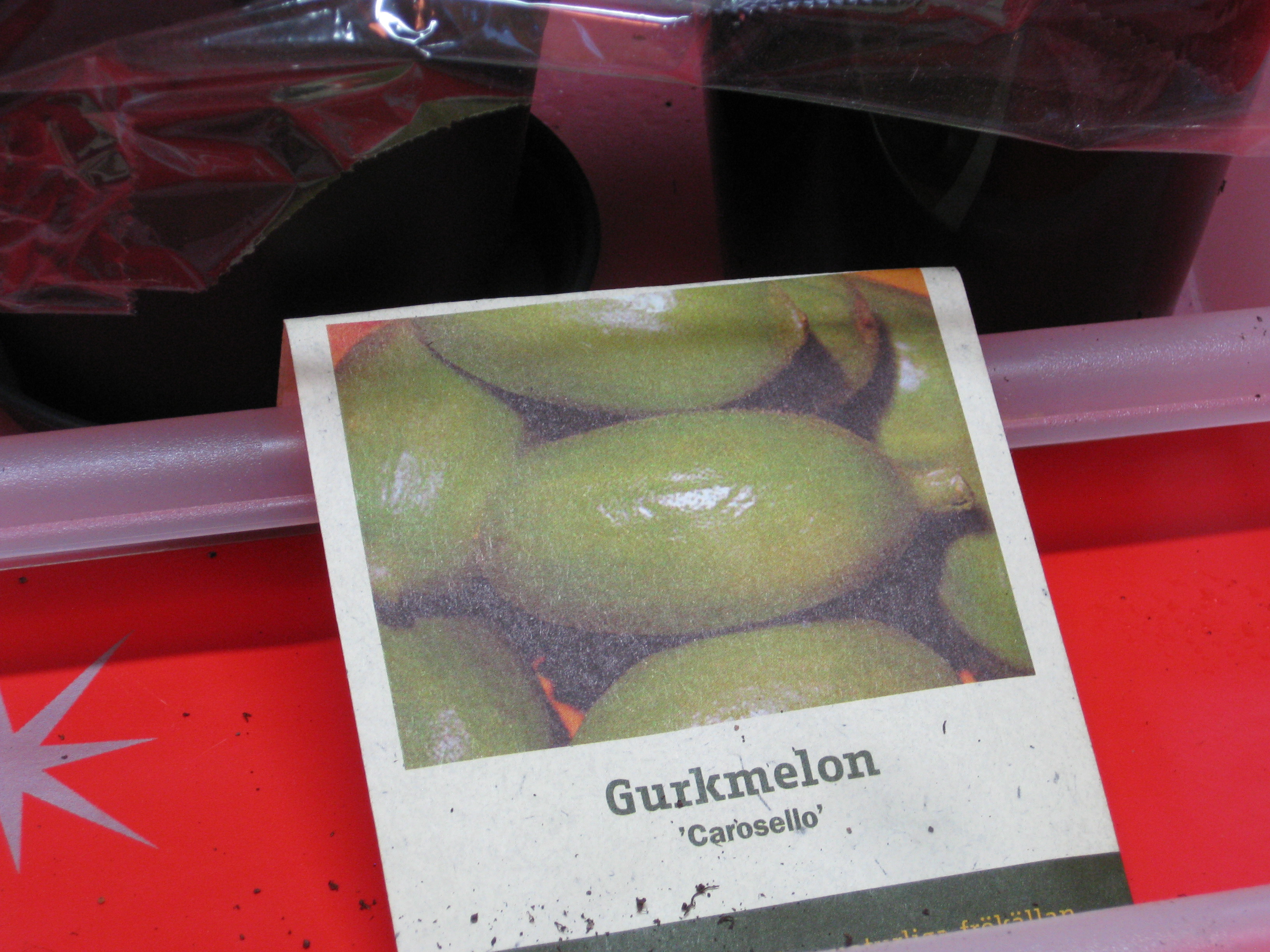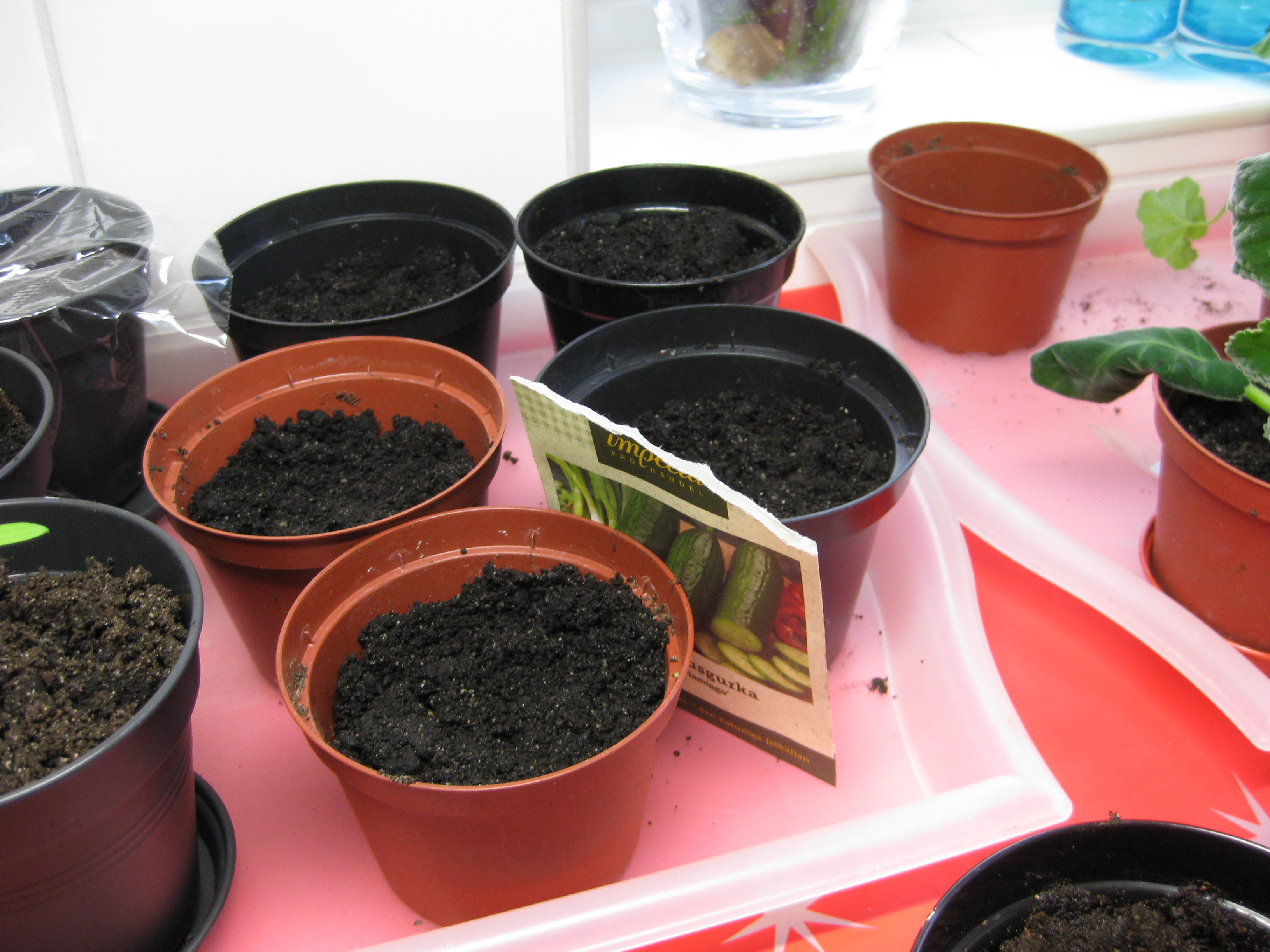 Tomat- och gurkplantor, som blivit 8-10 cm stora, planteras om i större krukor och flyttas ut i garaget. Vi fyller på tomrummet i badrummet med att så lite sommarblommor och ”gurkmelon” – en ny bekantskap.