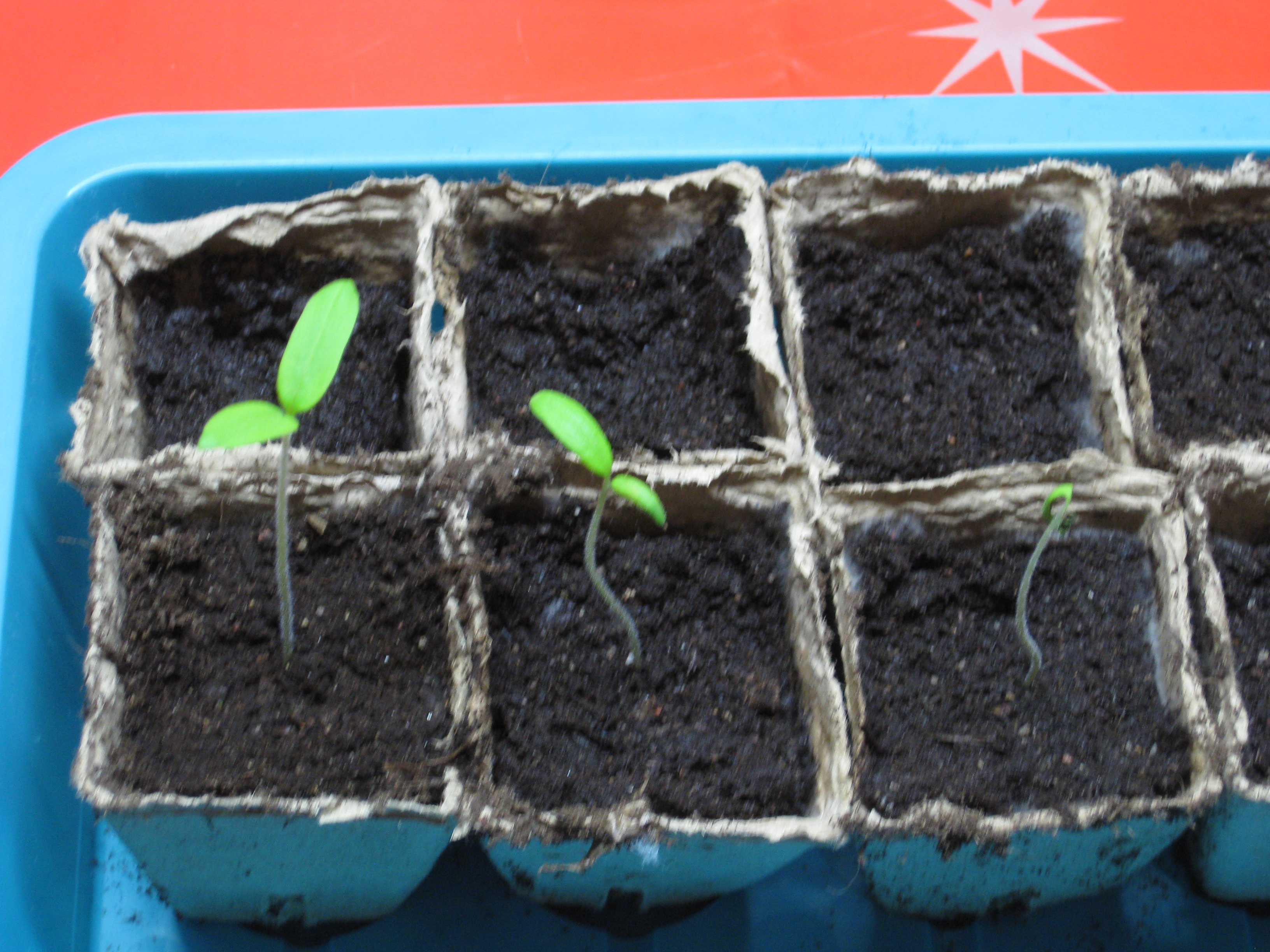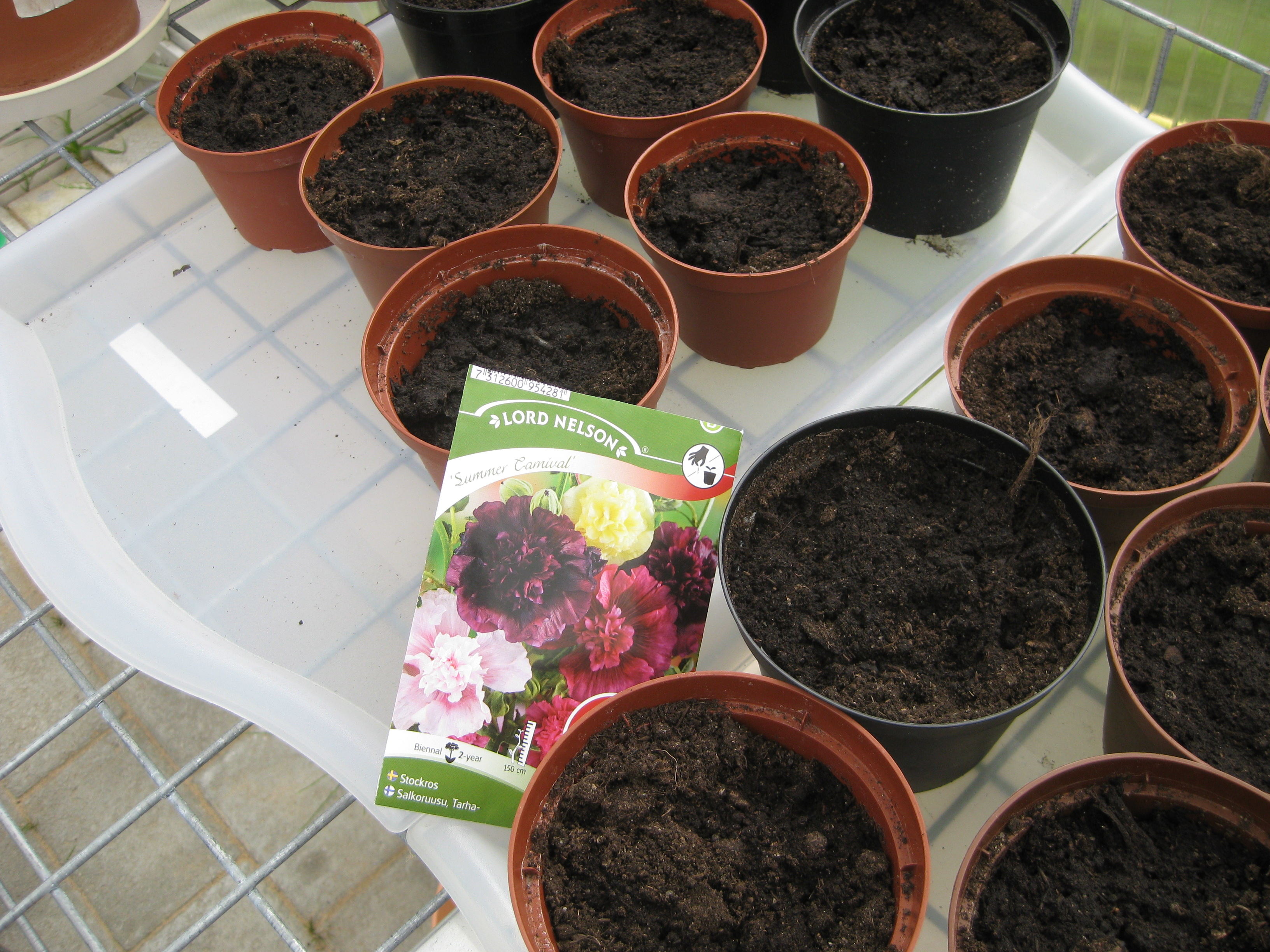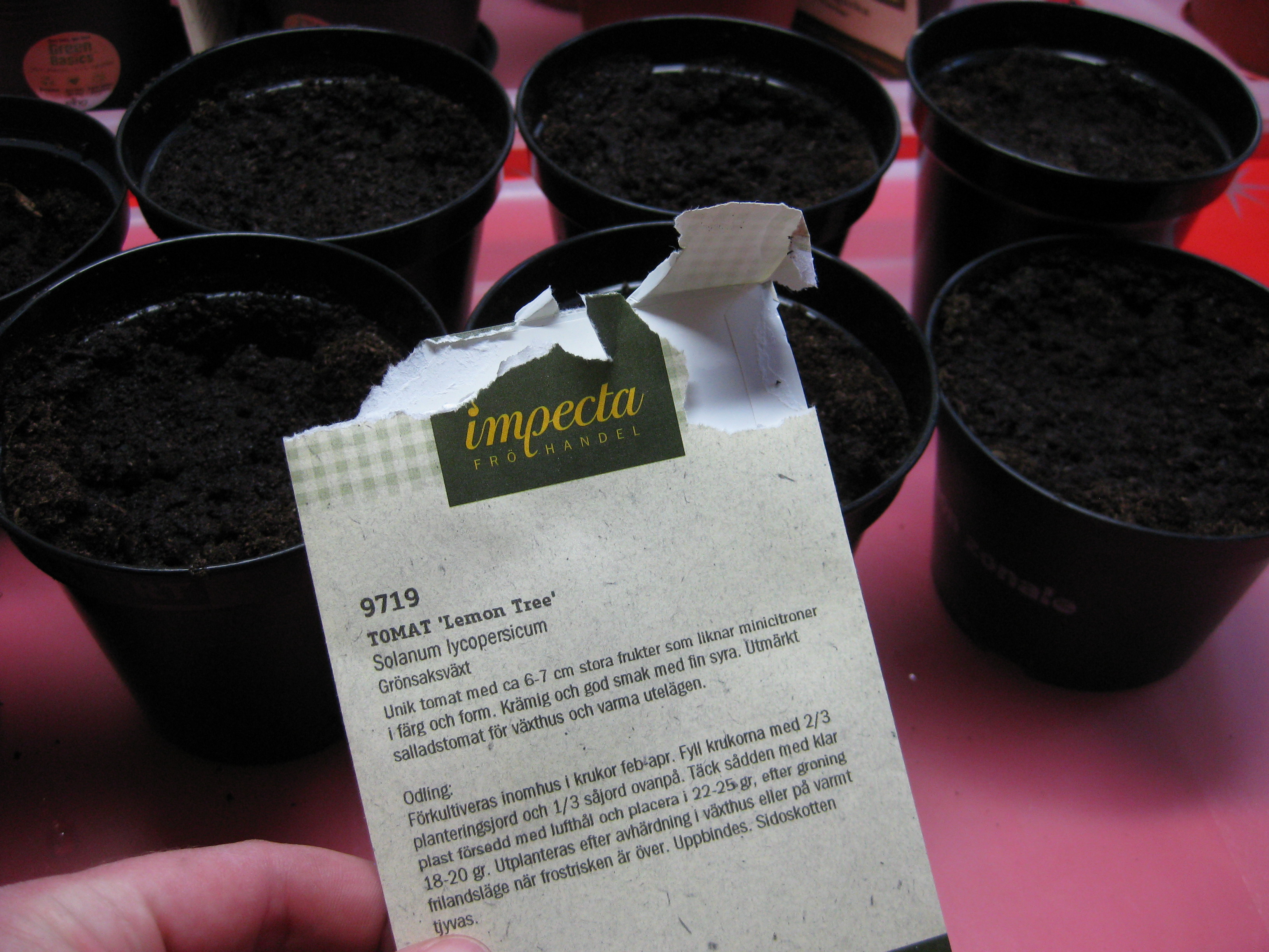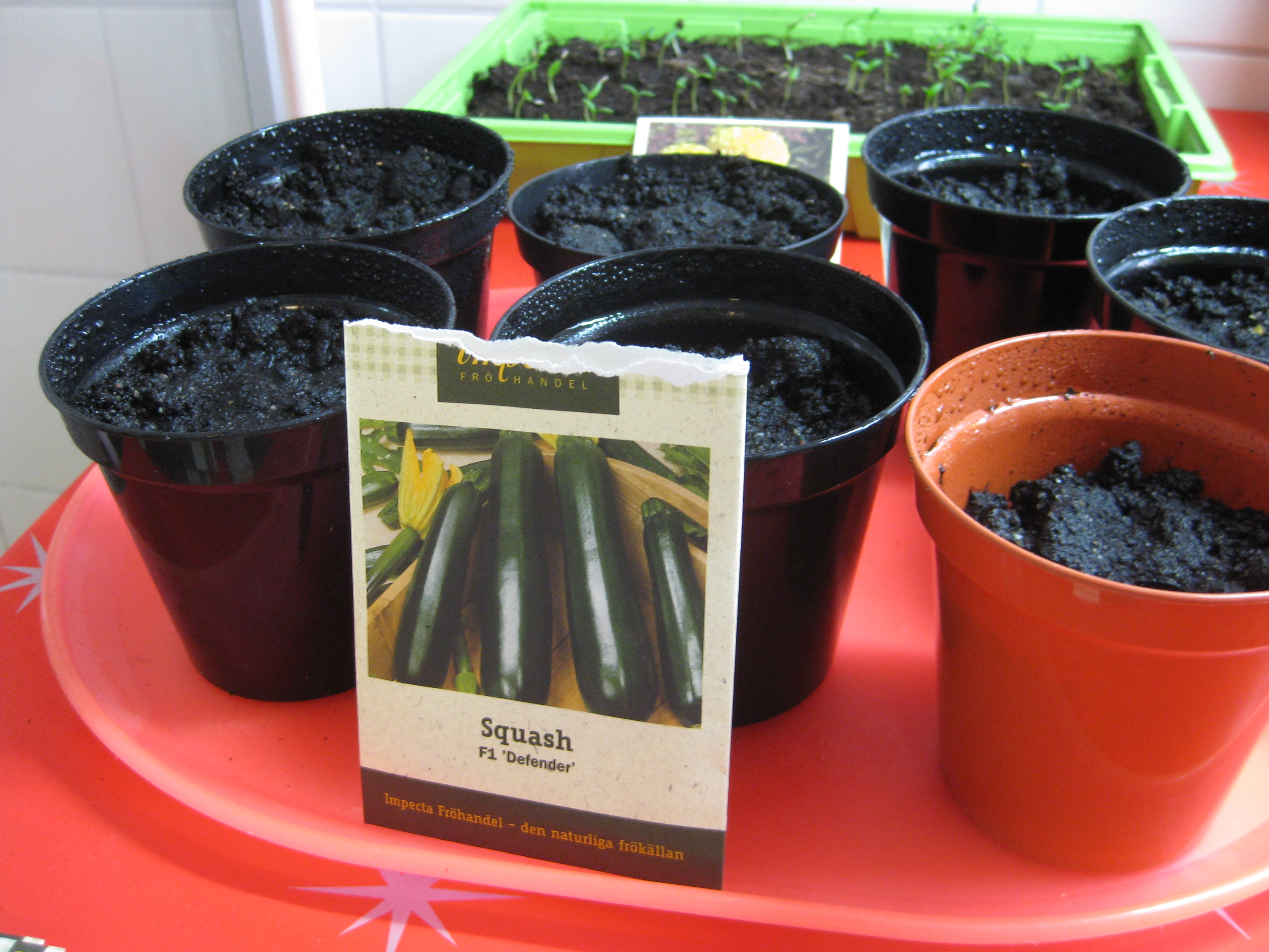 Tomat- och gurkplantor, som blivit 8-10 cm stora, planteras om i större krukor och flyttas ut i garaget. Vi fyller på tomrummet i badrummet med att så lite sommarblommor och ”gurkmelon” – en ny bekantskap.