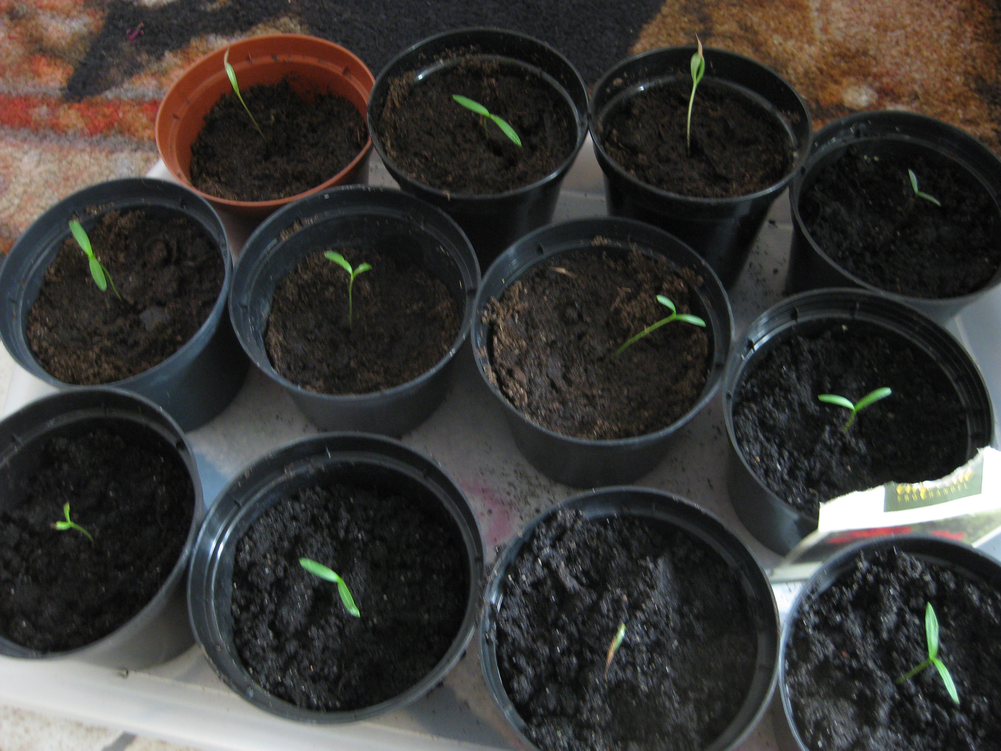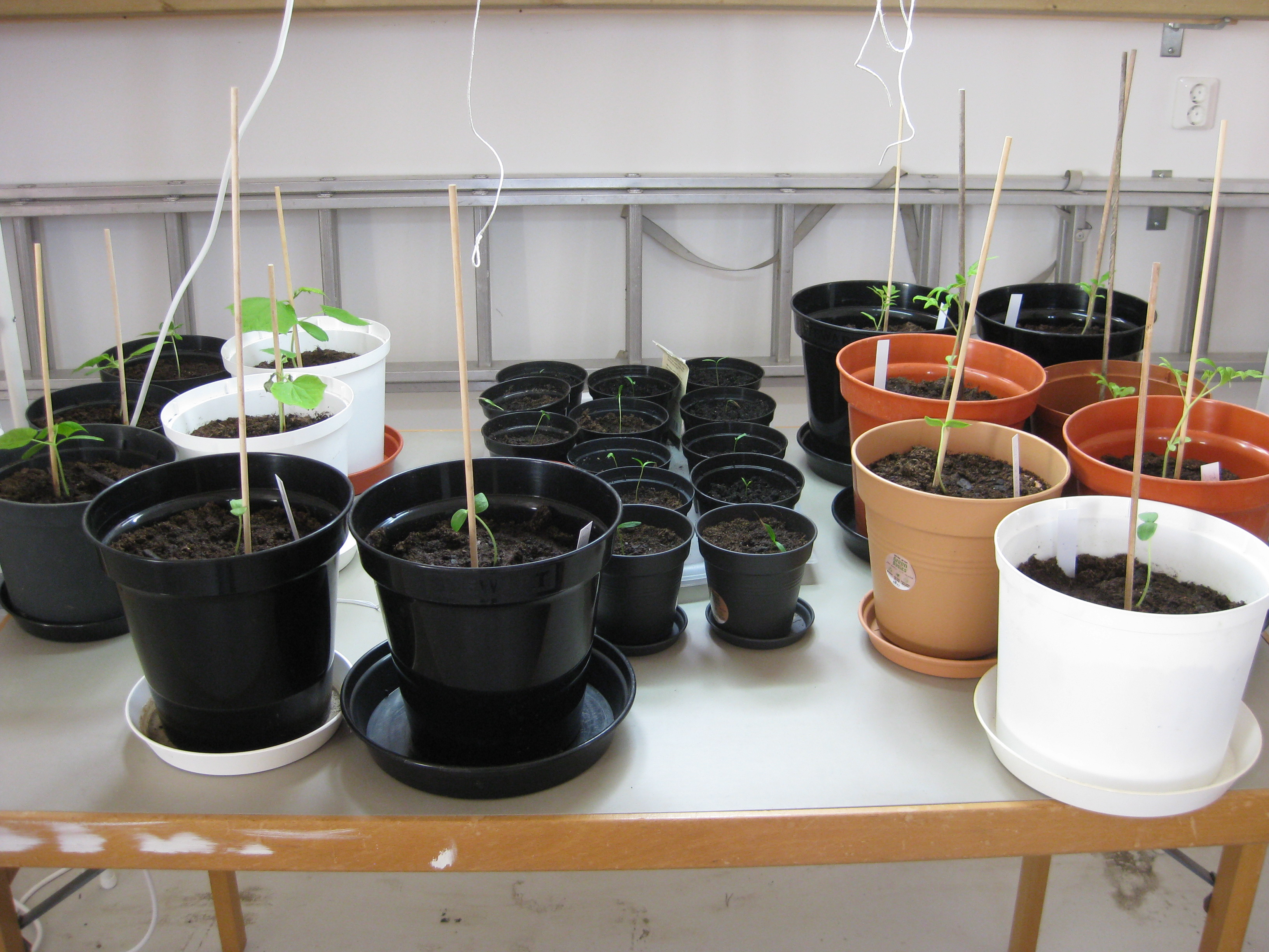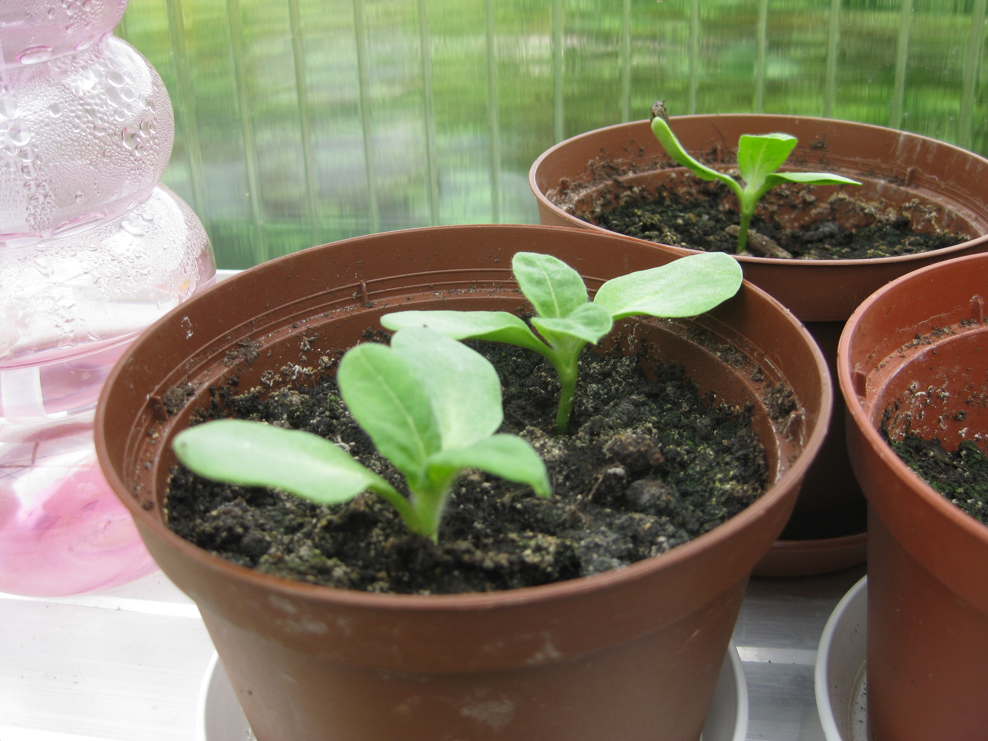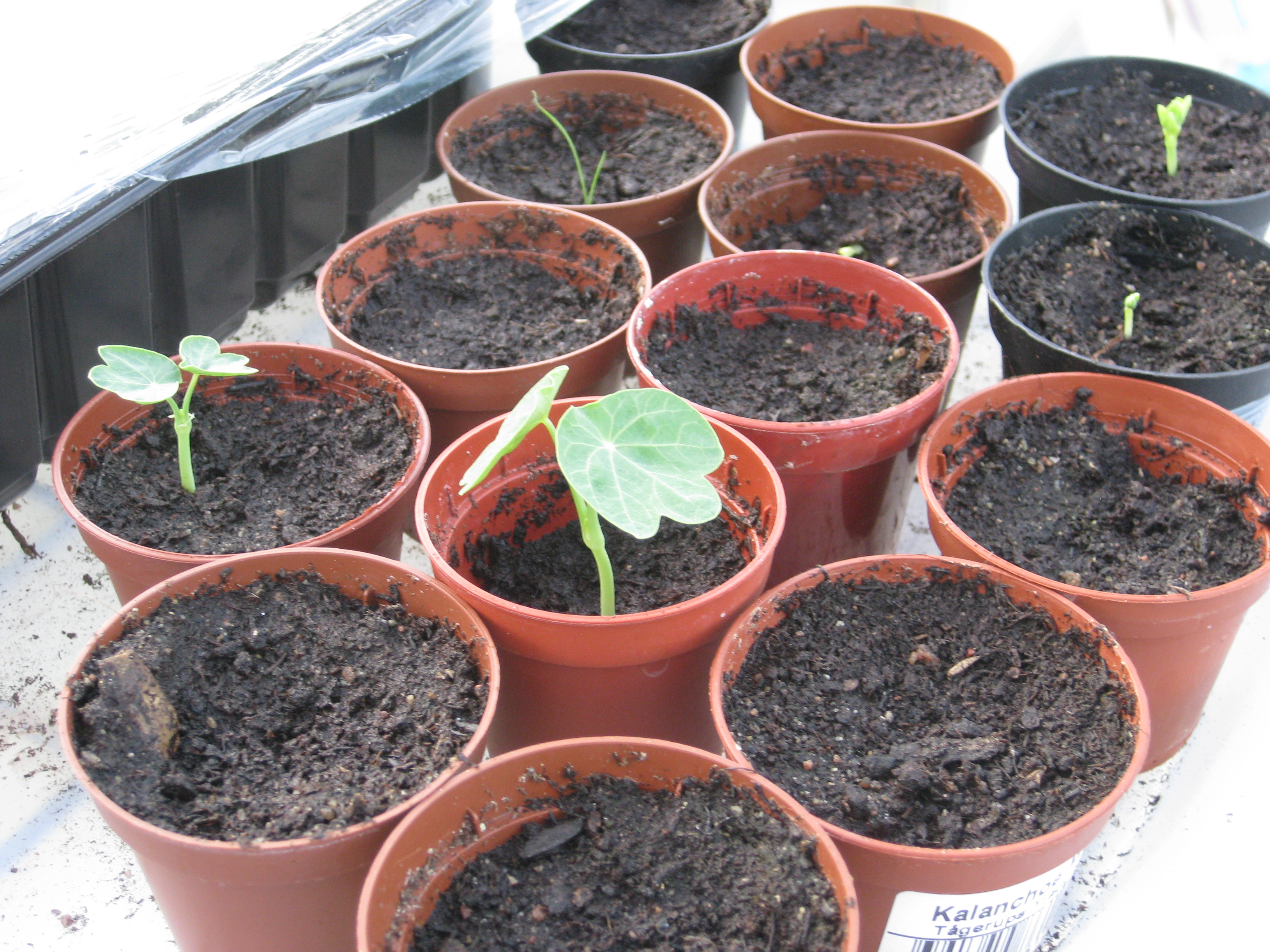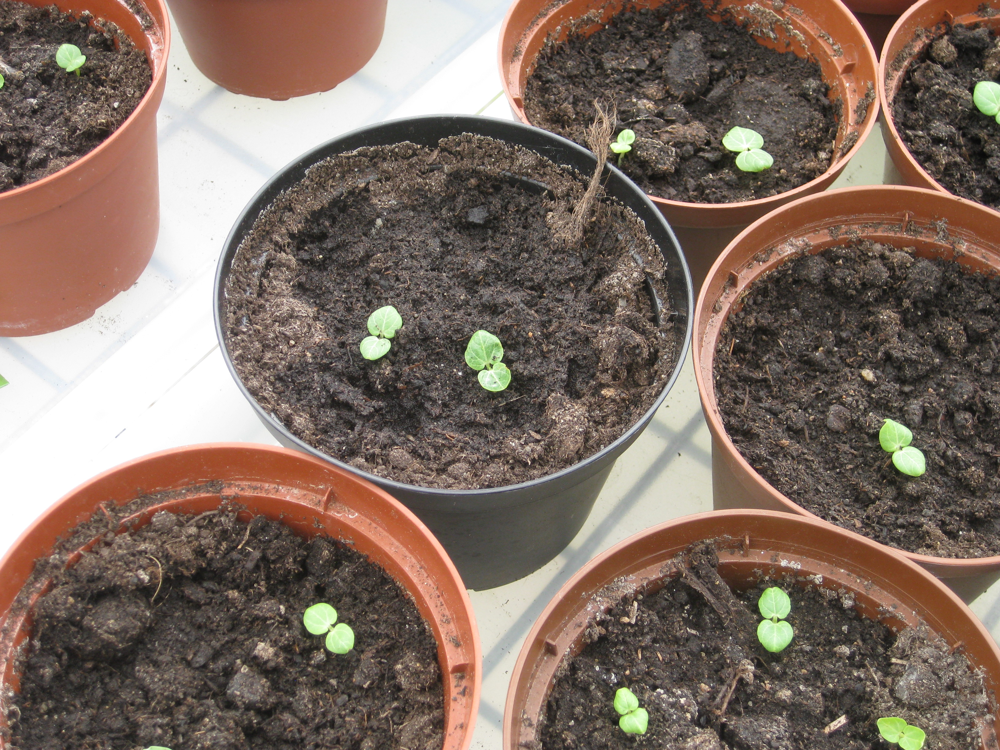 Tomat- och gurkplantor, som blivit 8-10 cm stora, planteras om i större krukor och flyttas ut i garaget. Vi fyller på tomrummet i badrummet med att så lite sommarblommor och ”gurkmelon” – en ny bekantskap.