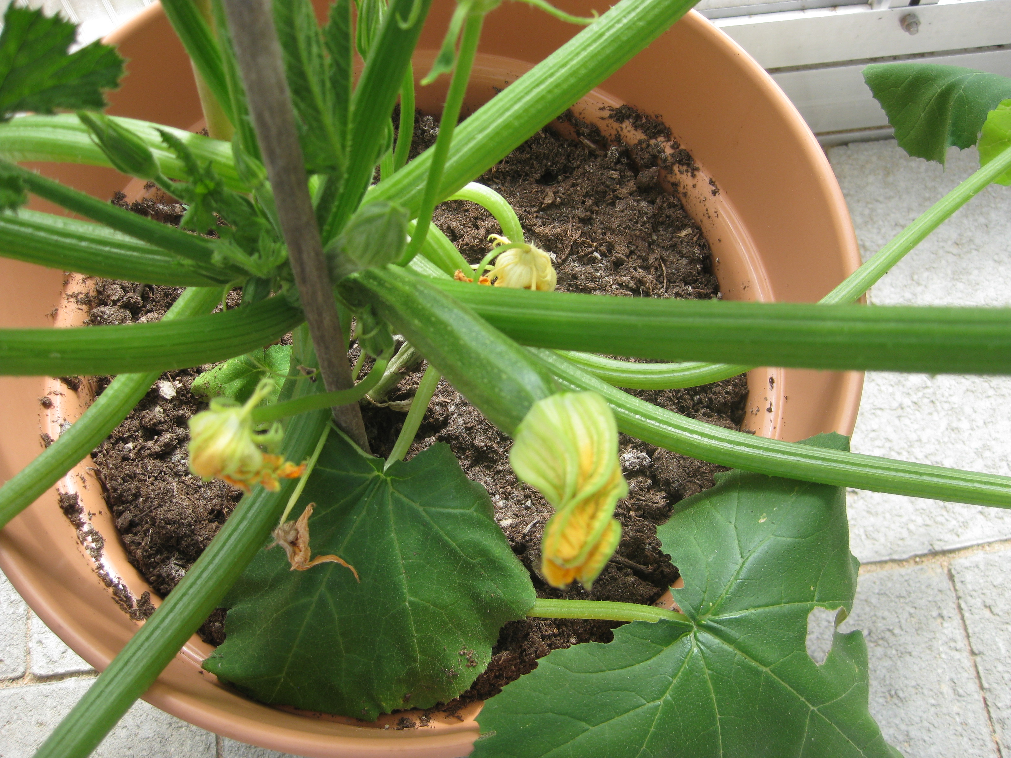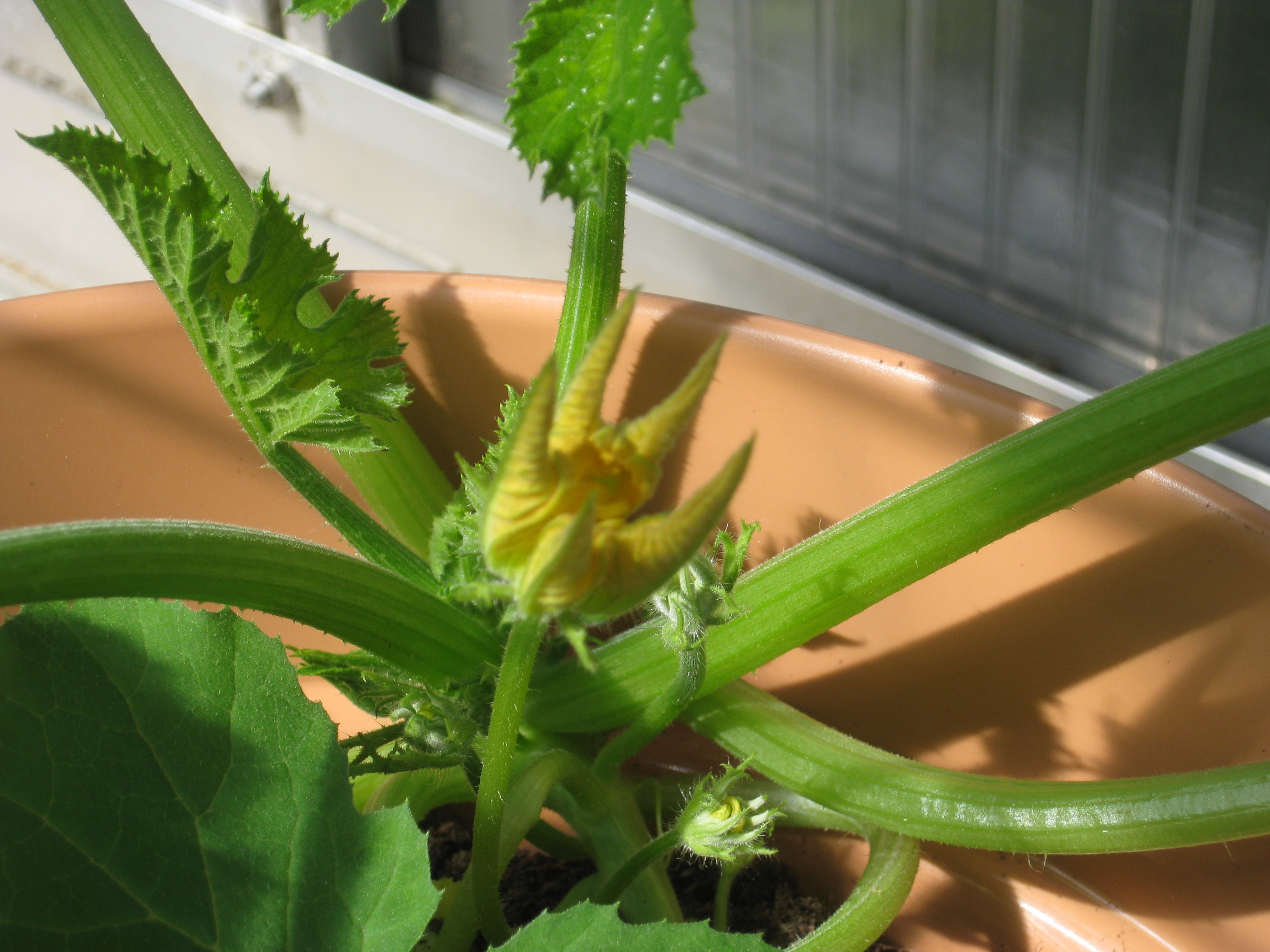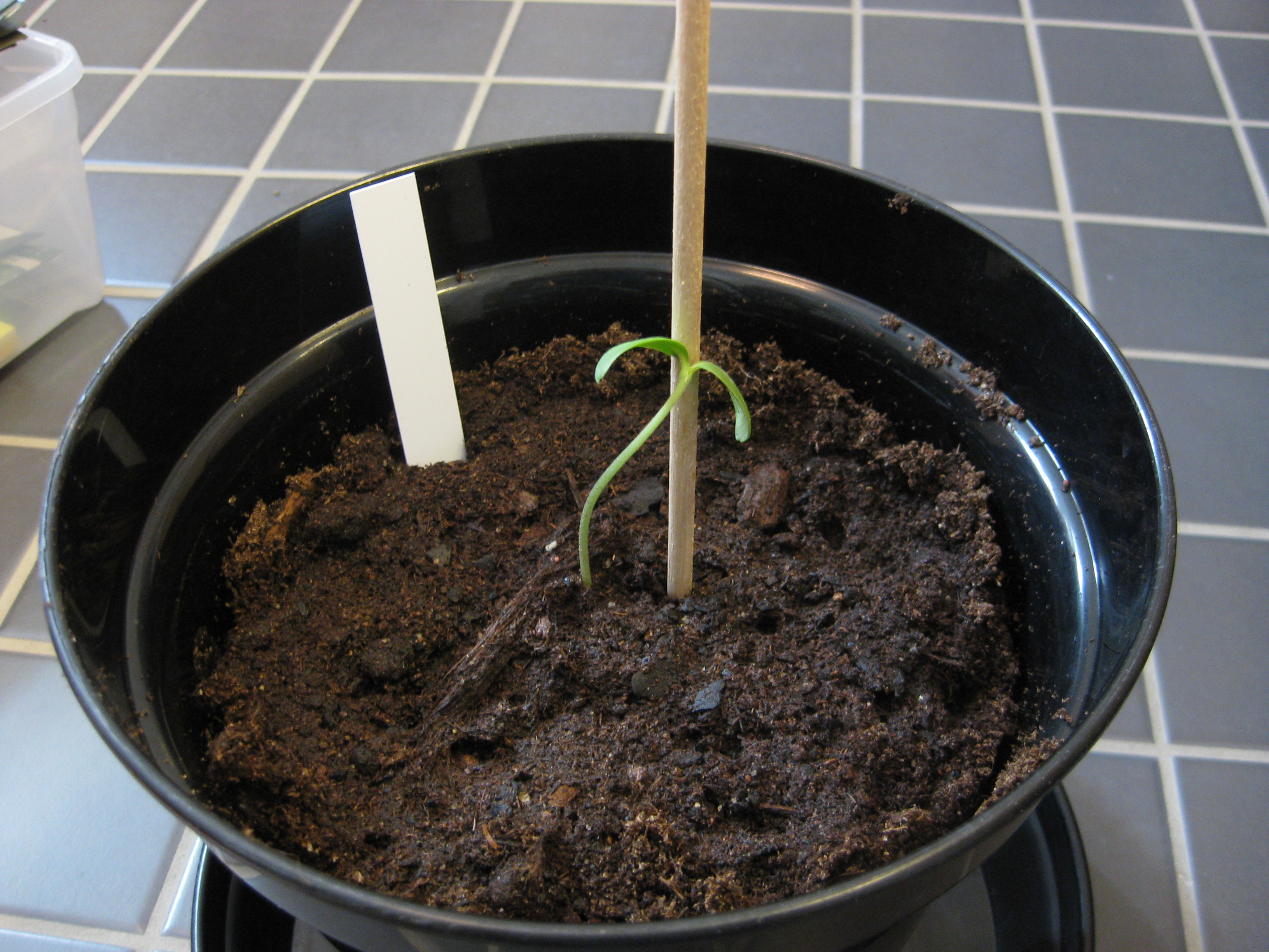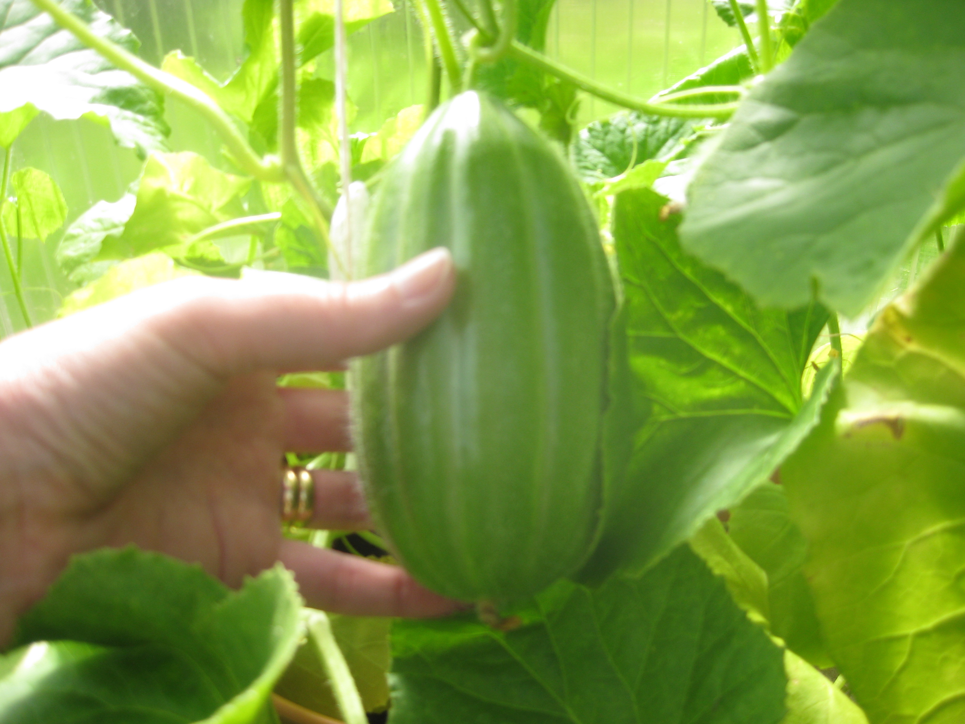 Tomat- och gurkplantor, som blivit 8-10 cm stora, planteras om i större krukor och flyttas ut i garaget. Vi fyller på tomrummet i badrummet med att så lite sommarblommor och ”gurkmelon” – en ny bekantskap.