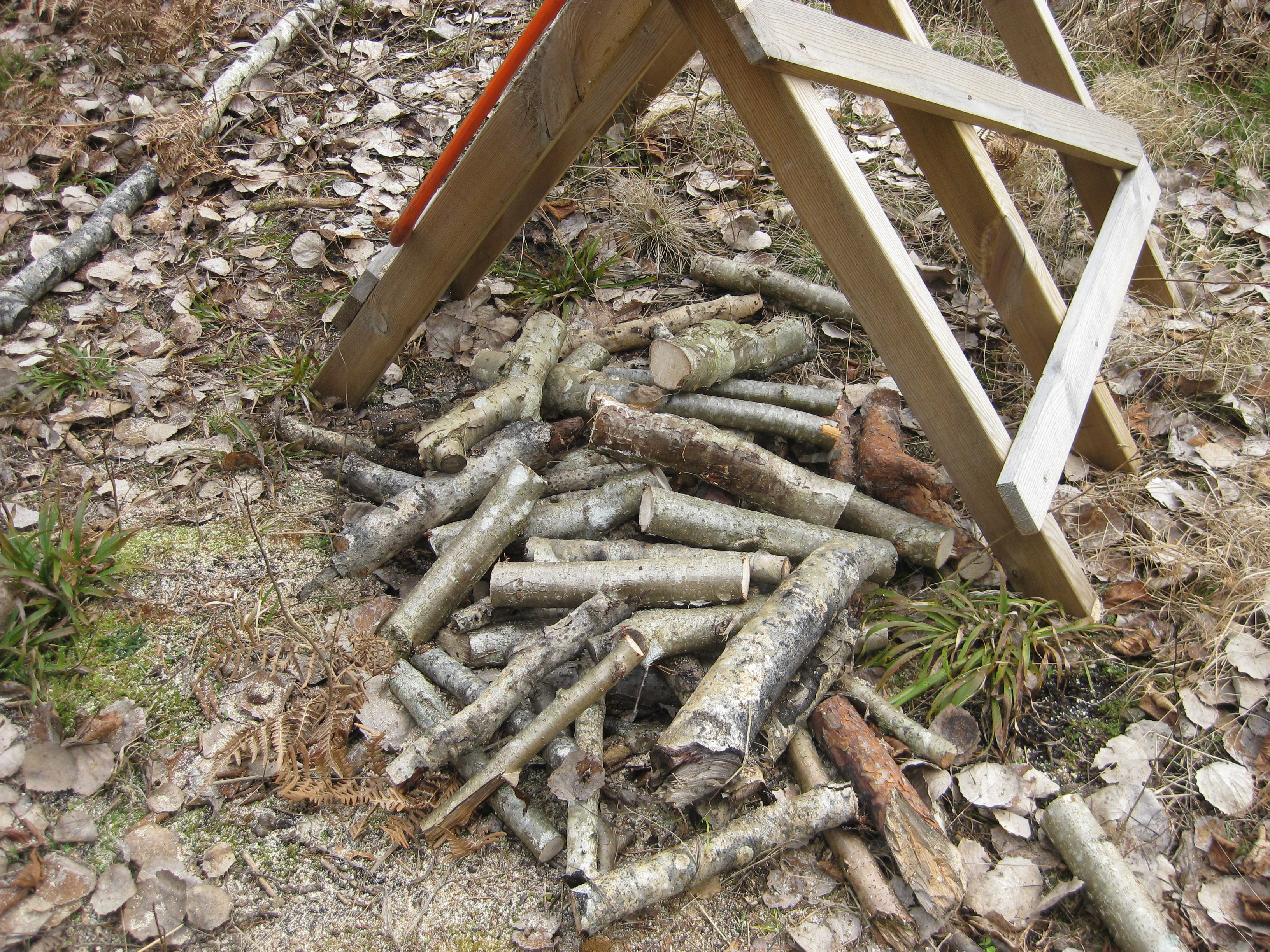 Dags att göra något i trädgården. Vi tar fram en såg och sågar lite ved. Dessutom siktar vi årets första tussilago. 🙂