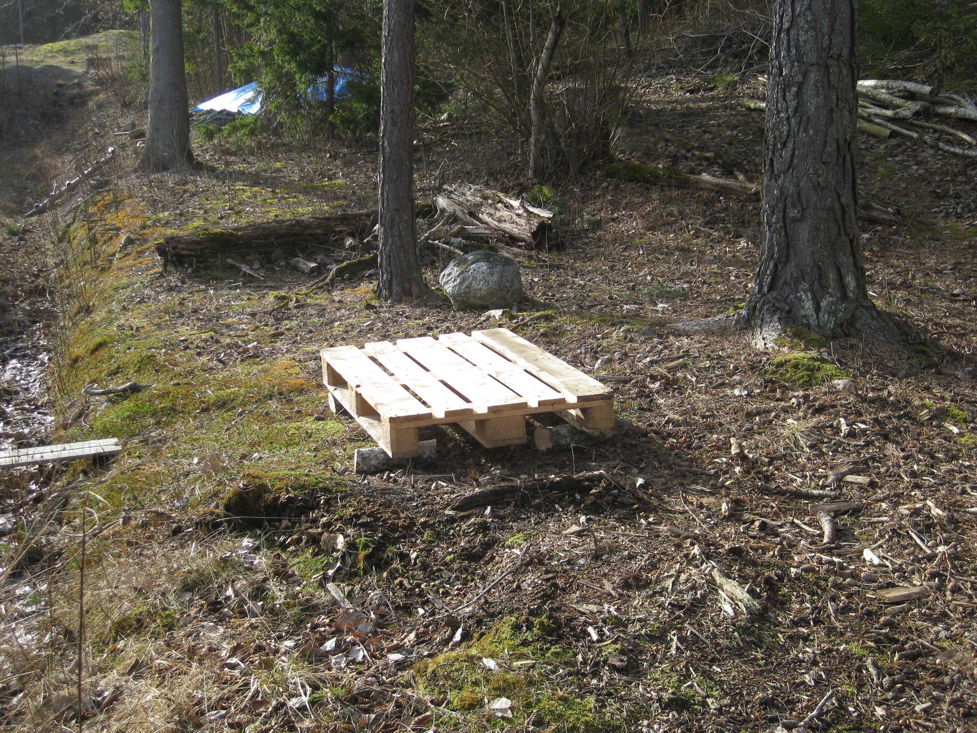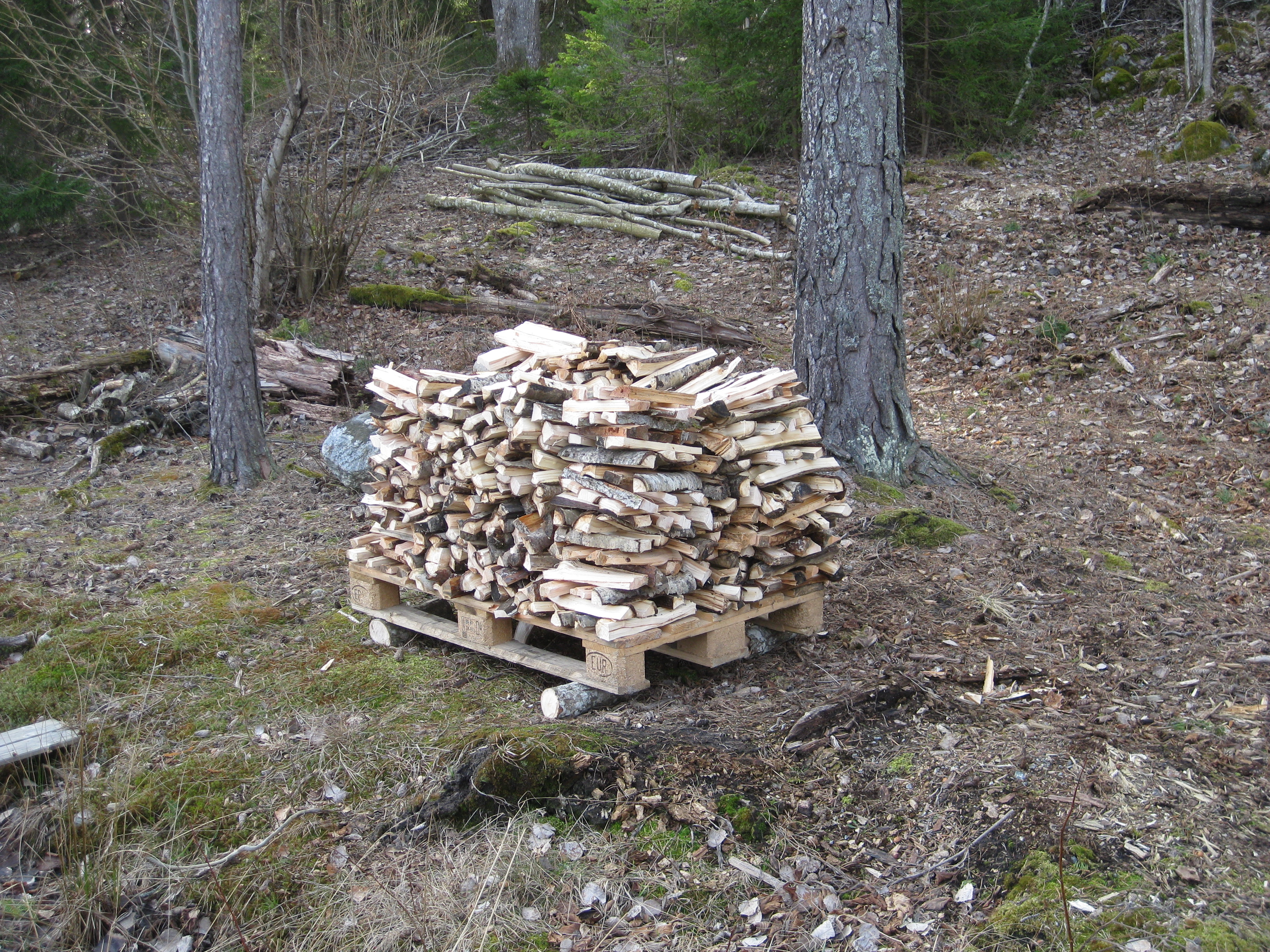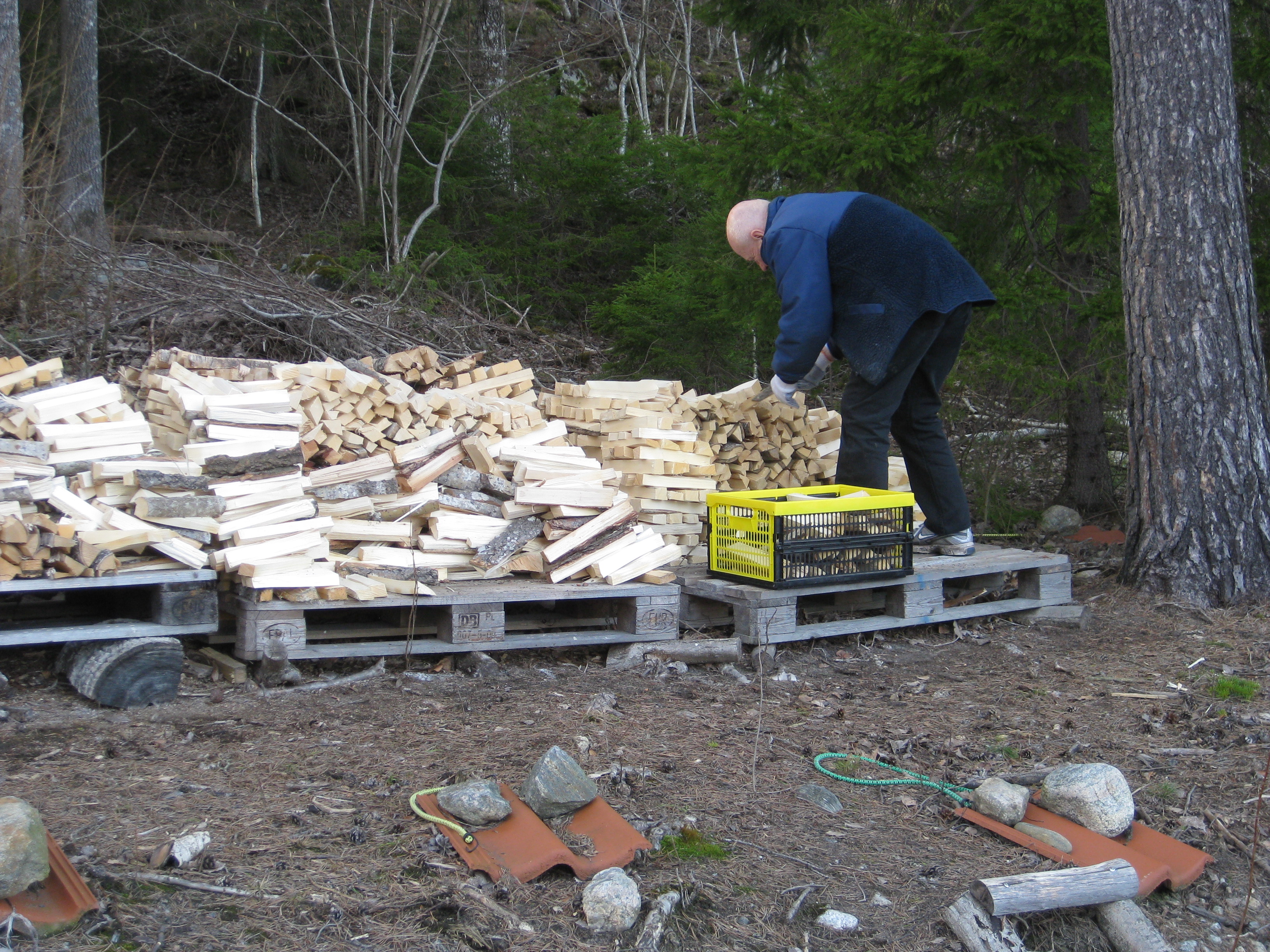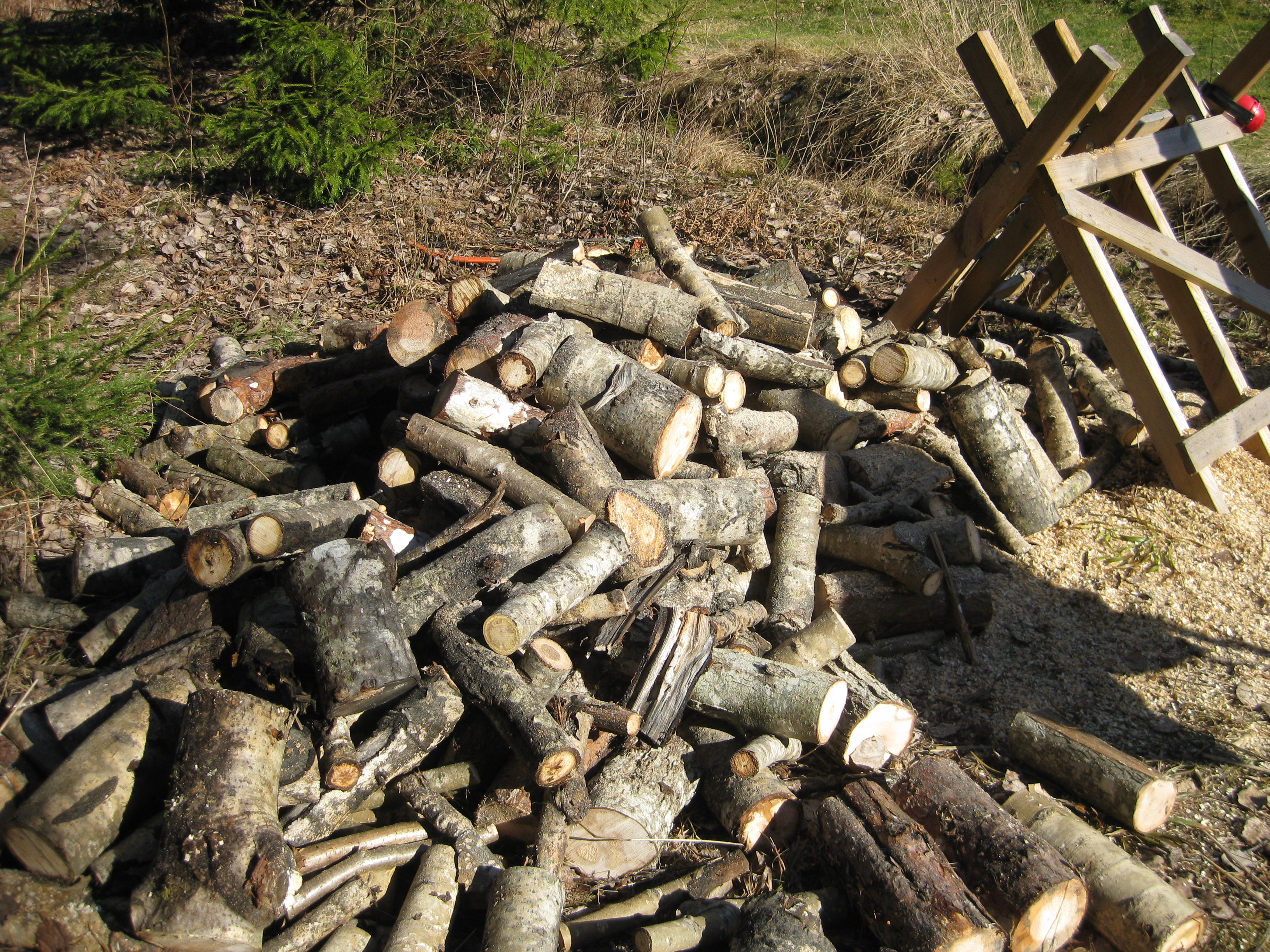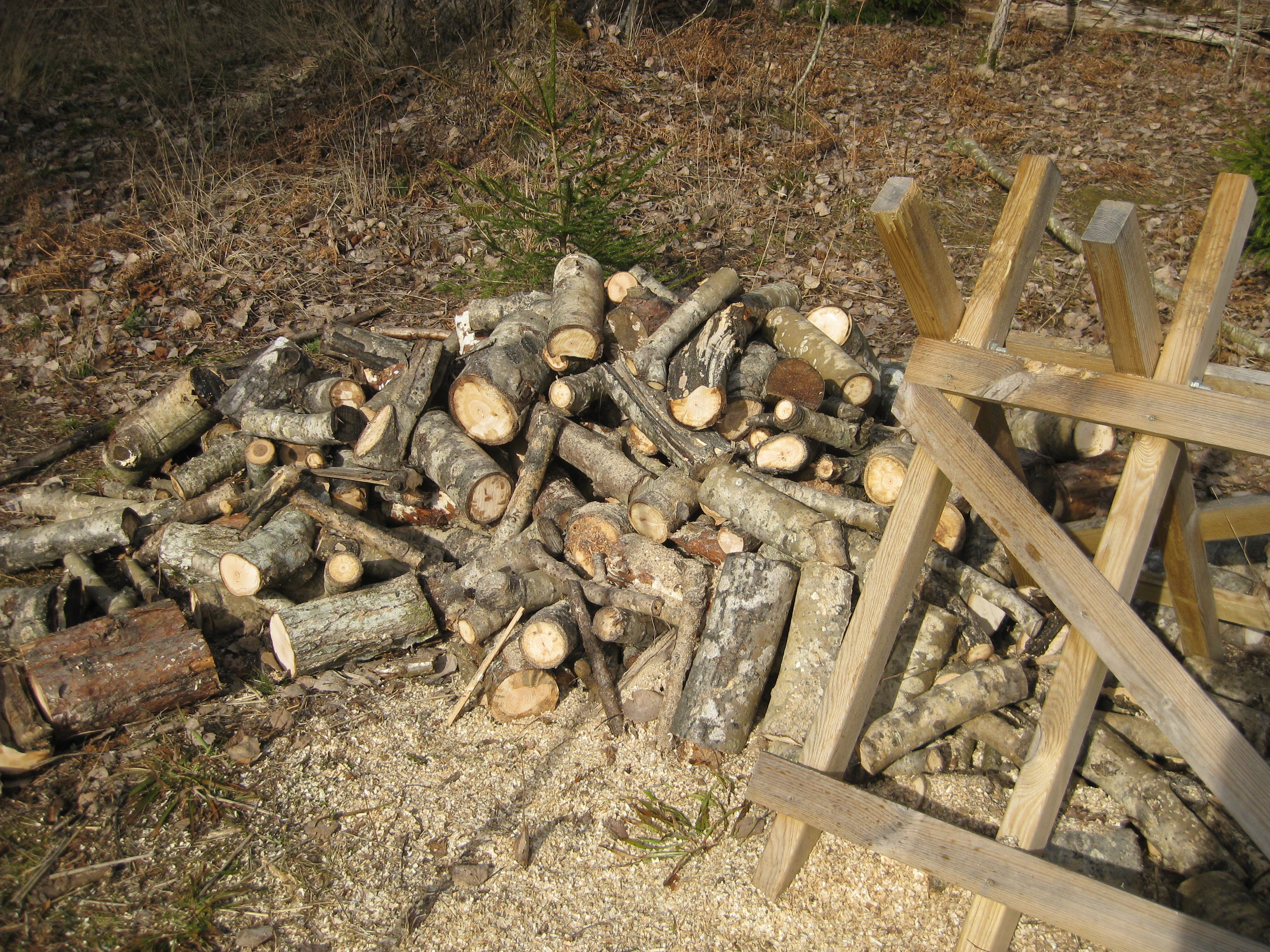 Tio plusgrader – och SOL – äntligen sol! 😀 Med hjälp av motorsågen skapar vi en större vedhög idag. Vi inspekterar de vindfällen som vi planerar att såga upp framöver, och vi njuter både förmiddagskaffe och lunch i solen, samt förbereder för kommande dagars ute-sittar-fika.