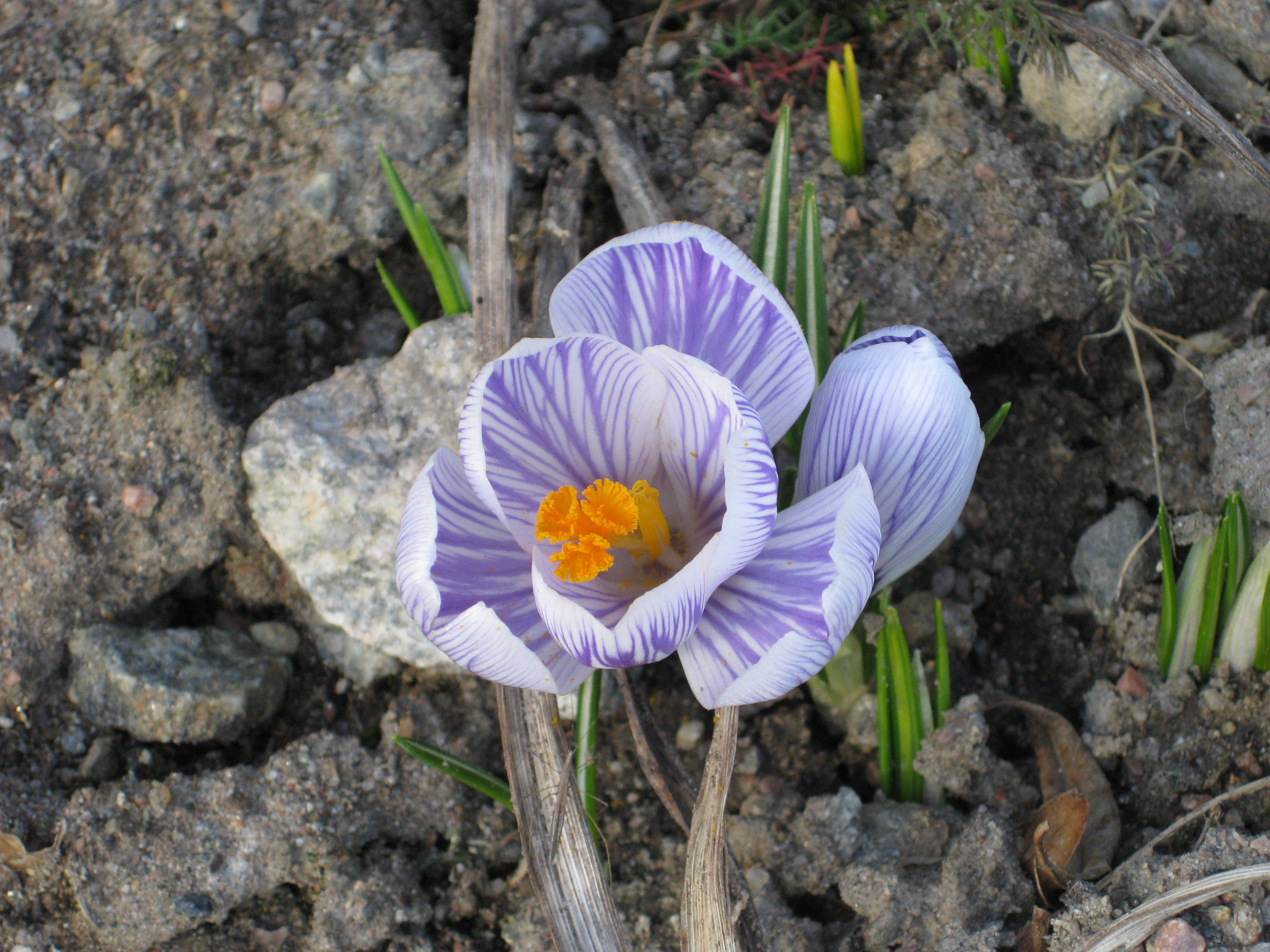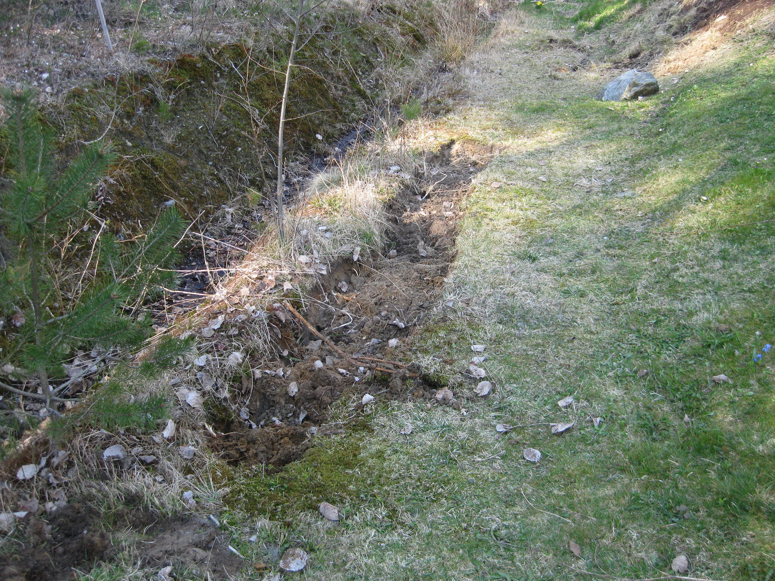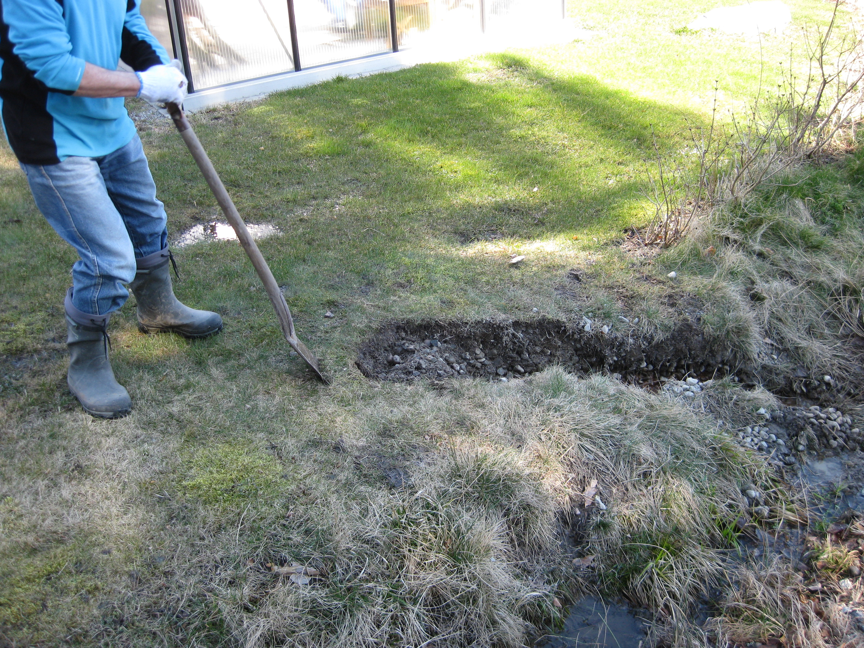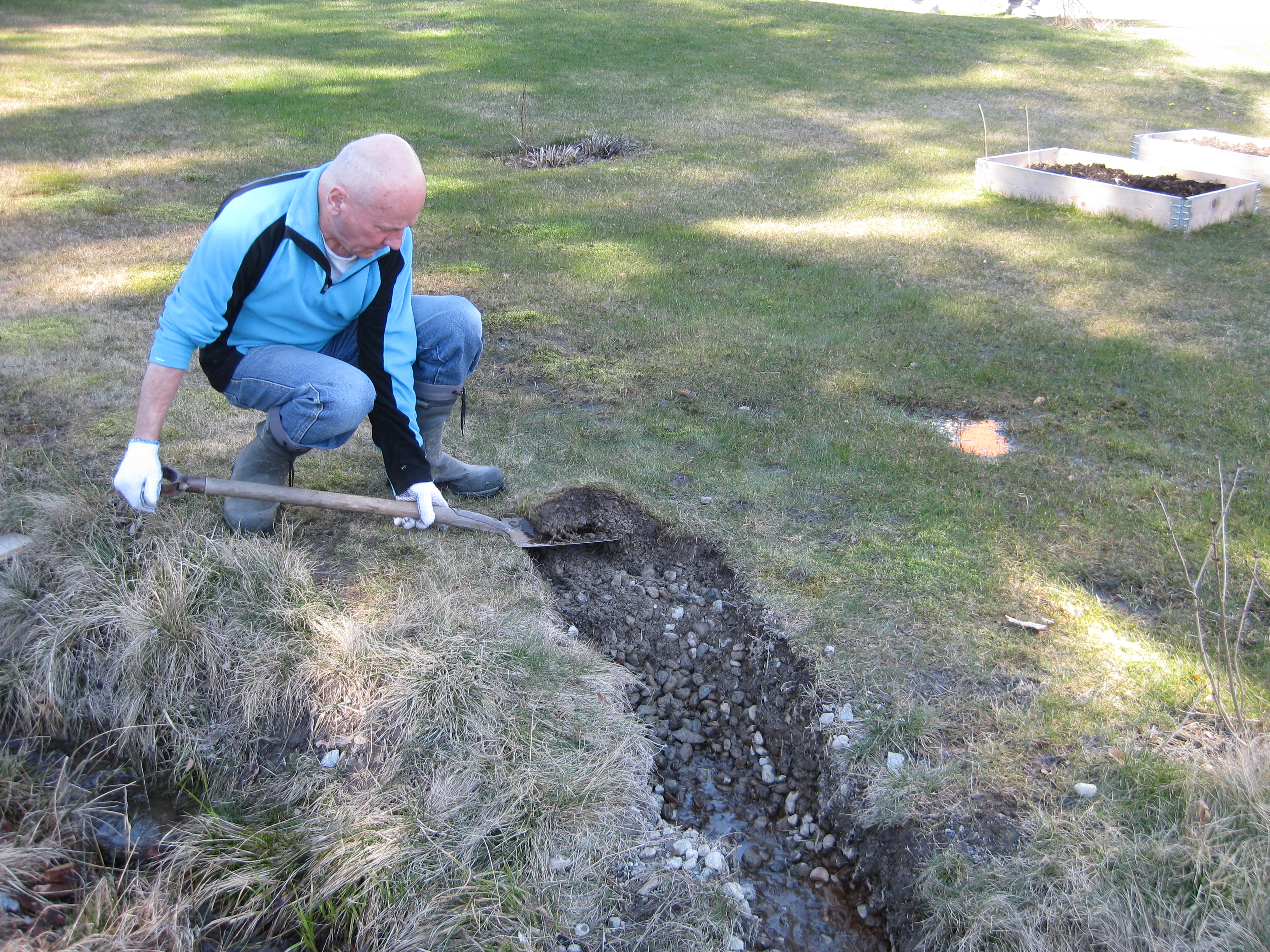 Ännu mer vårblommor! Håkan gräver ett dräneringsdike för att få bort allt vatten som står i gräsmattan ovanför växthuset – det har önskad effekt!