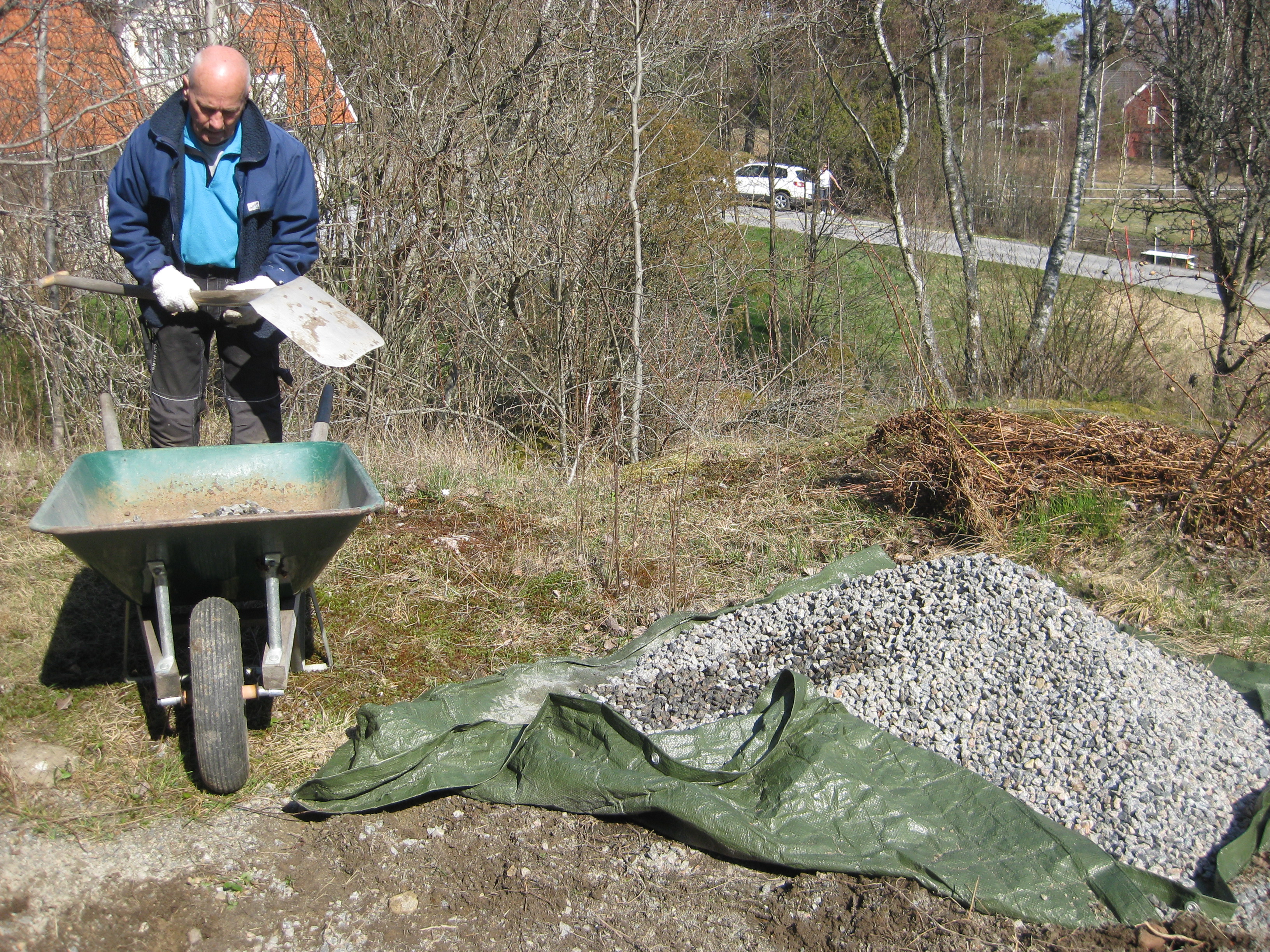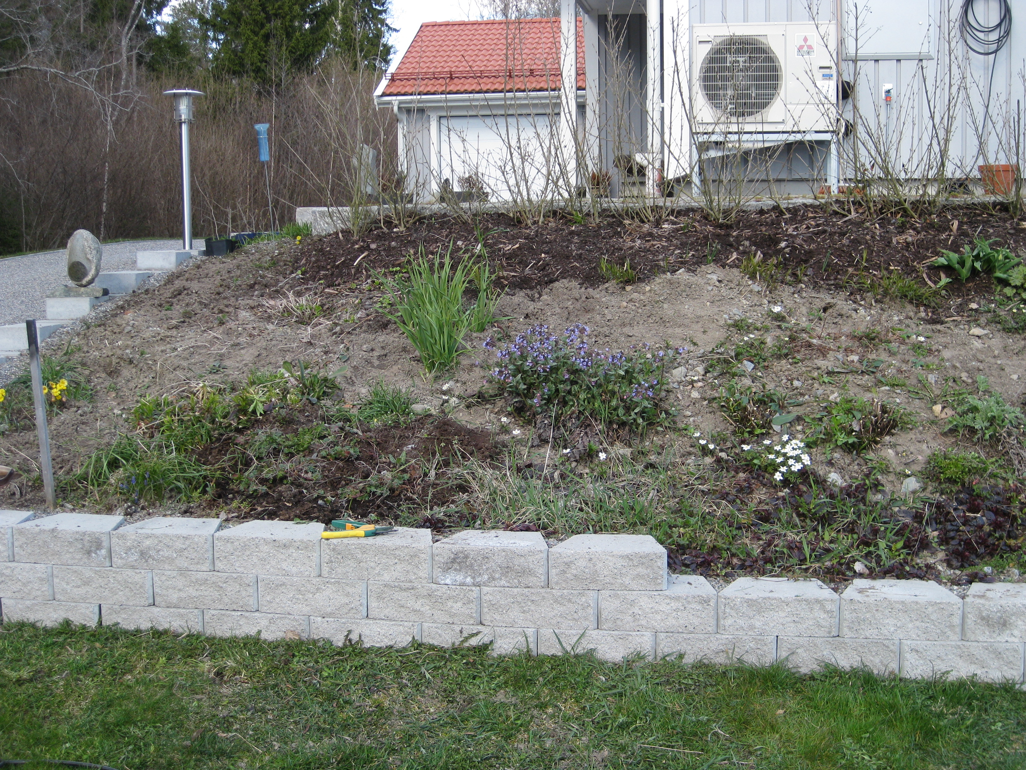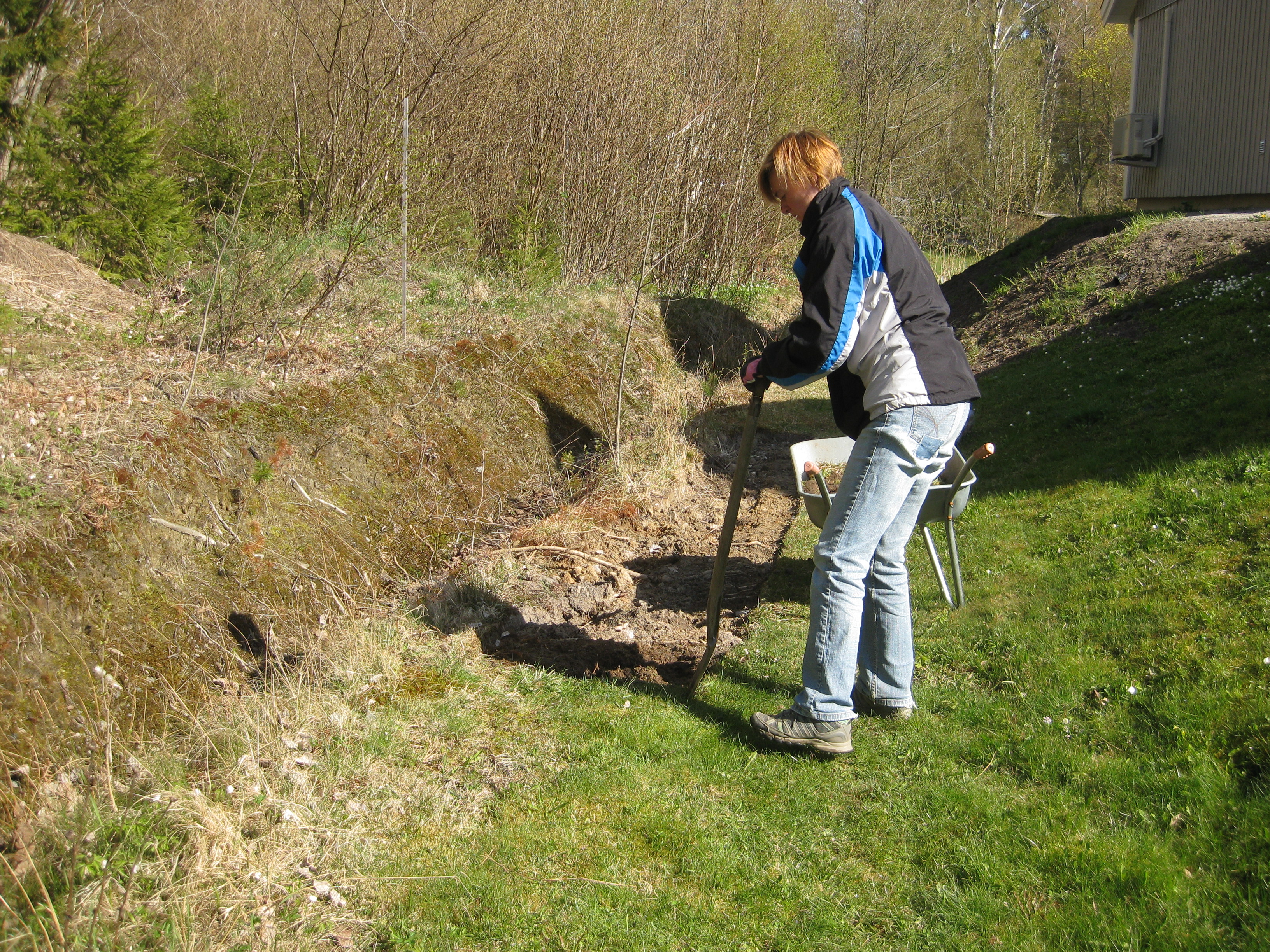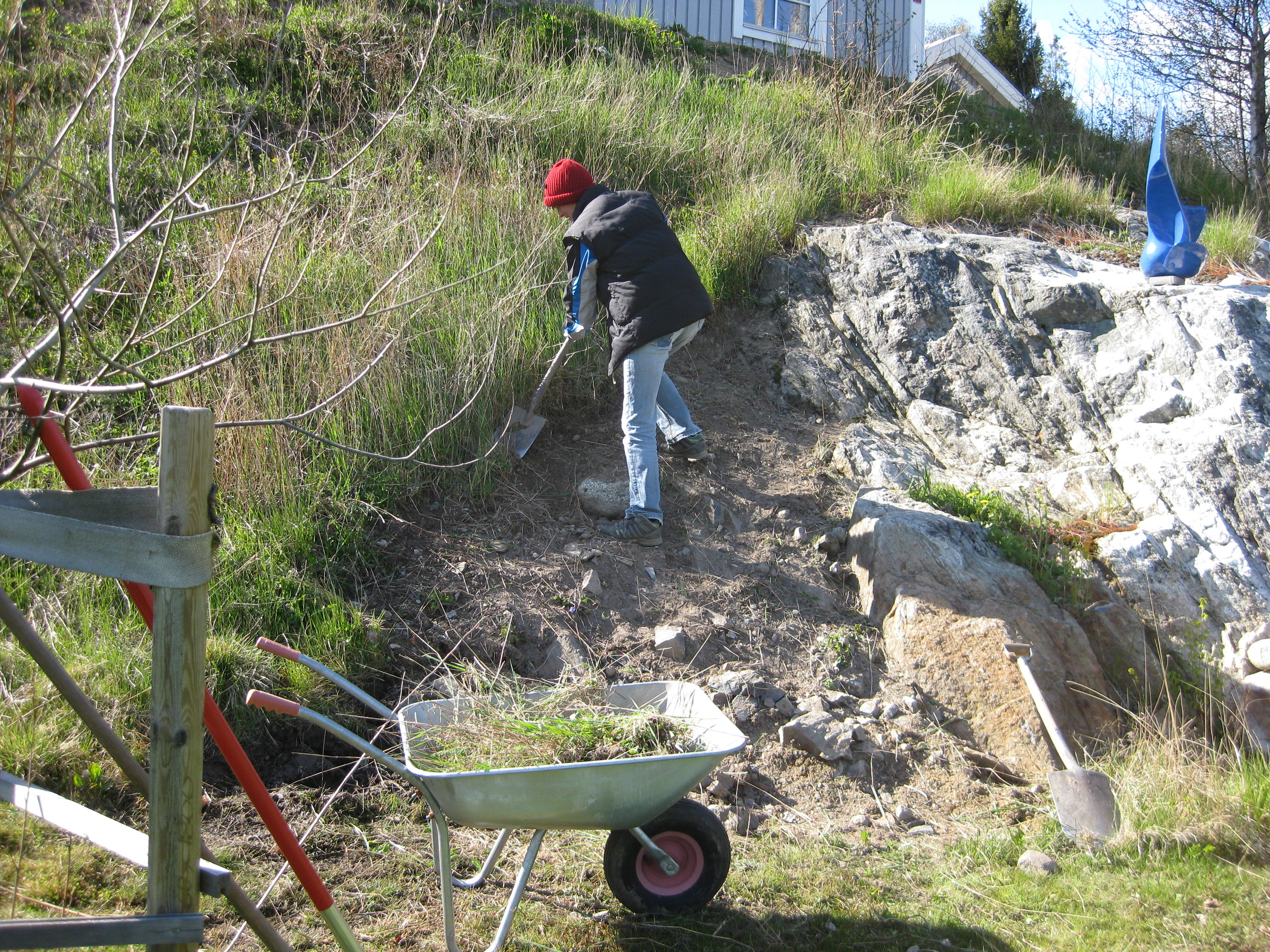 I växthuset tittar Blomman för dagen och tagetes upp ur sålådan, och en del pelargoner har börjat blomma. I rabatten har Pärlhyacinter och Bergenior börjat slå ut. Vi börjar snygga till bakom norra garaget, där vi ska lägga trädgårdsavfall i den lilla slänt som finns. Vi jämnar till och lägger lite grovt grus för att lättare kunna köra dit med skottkärrorna.