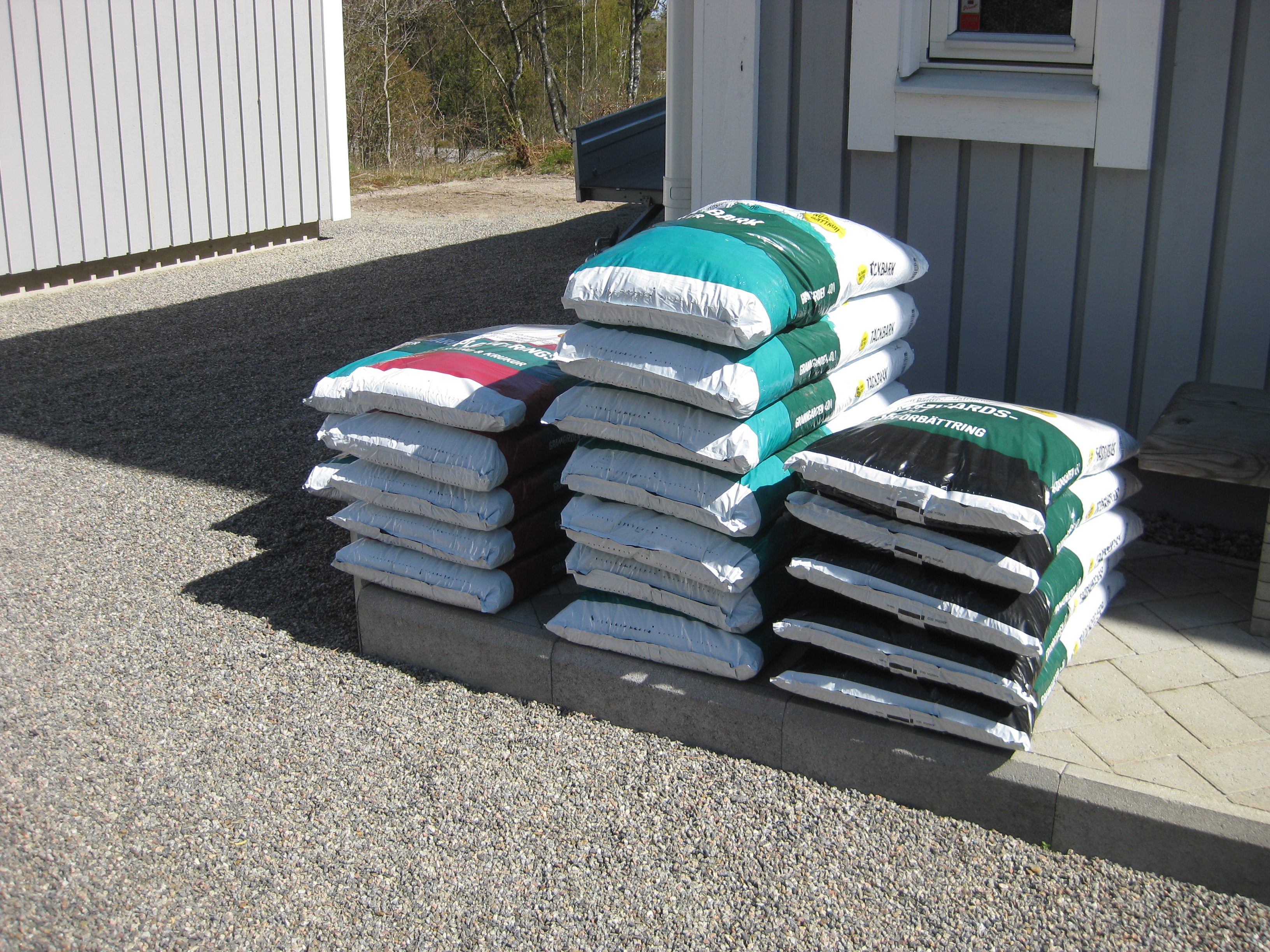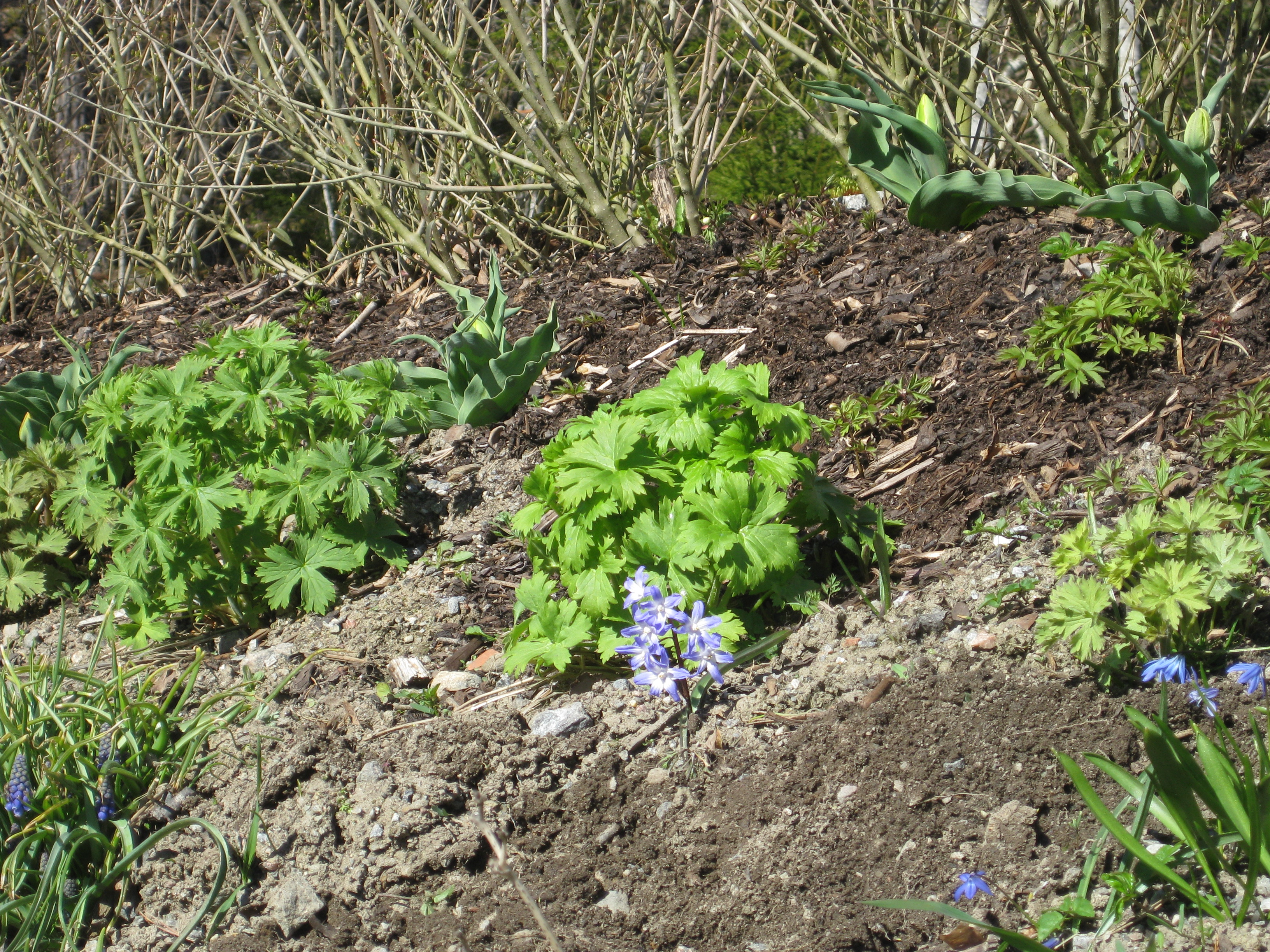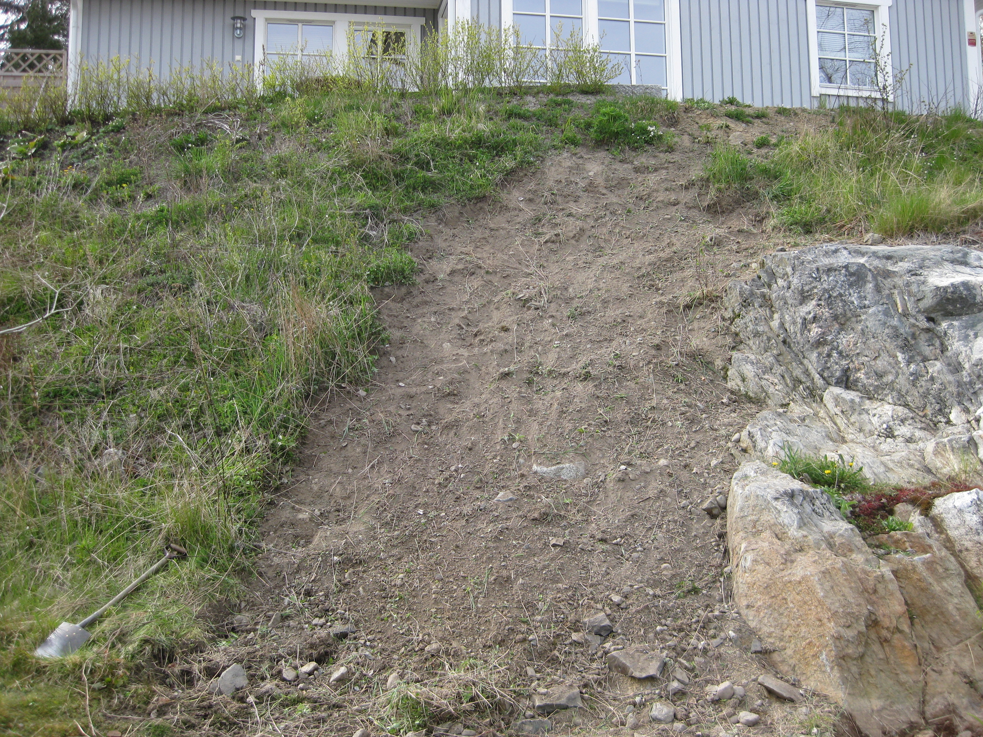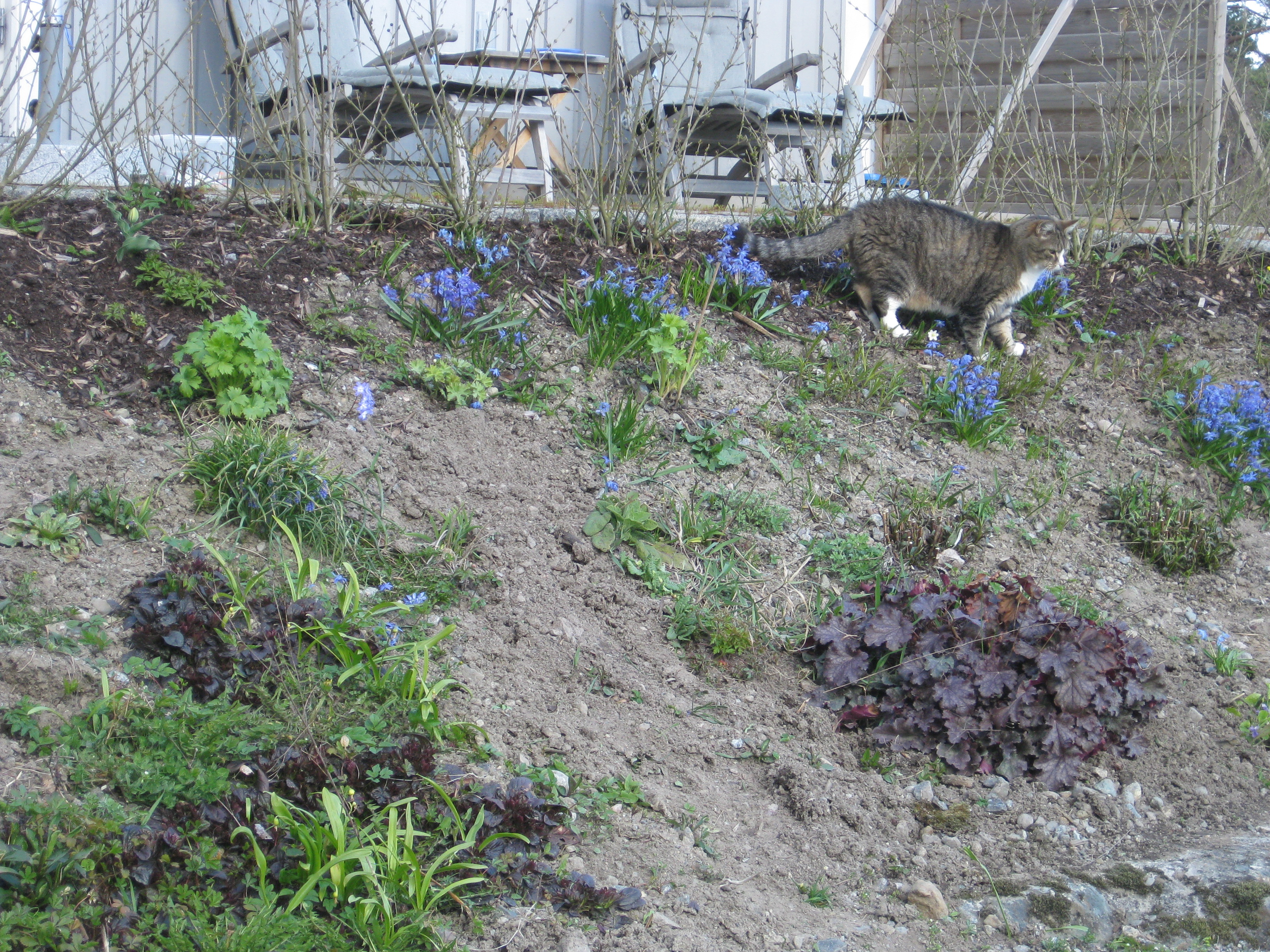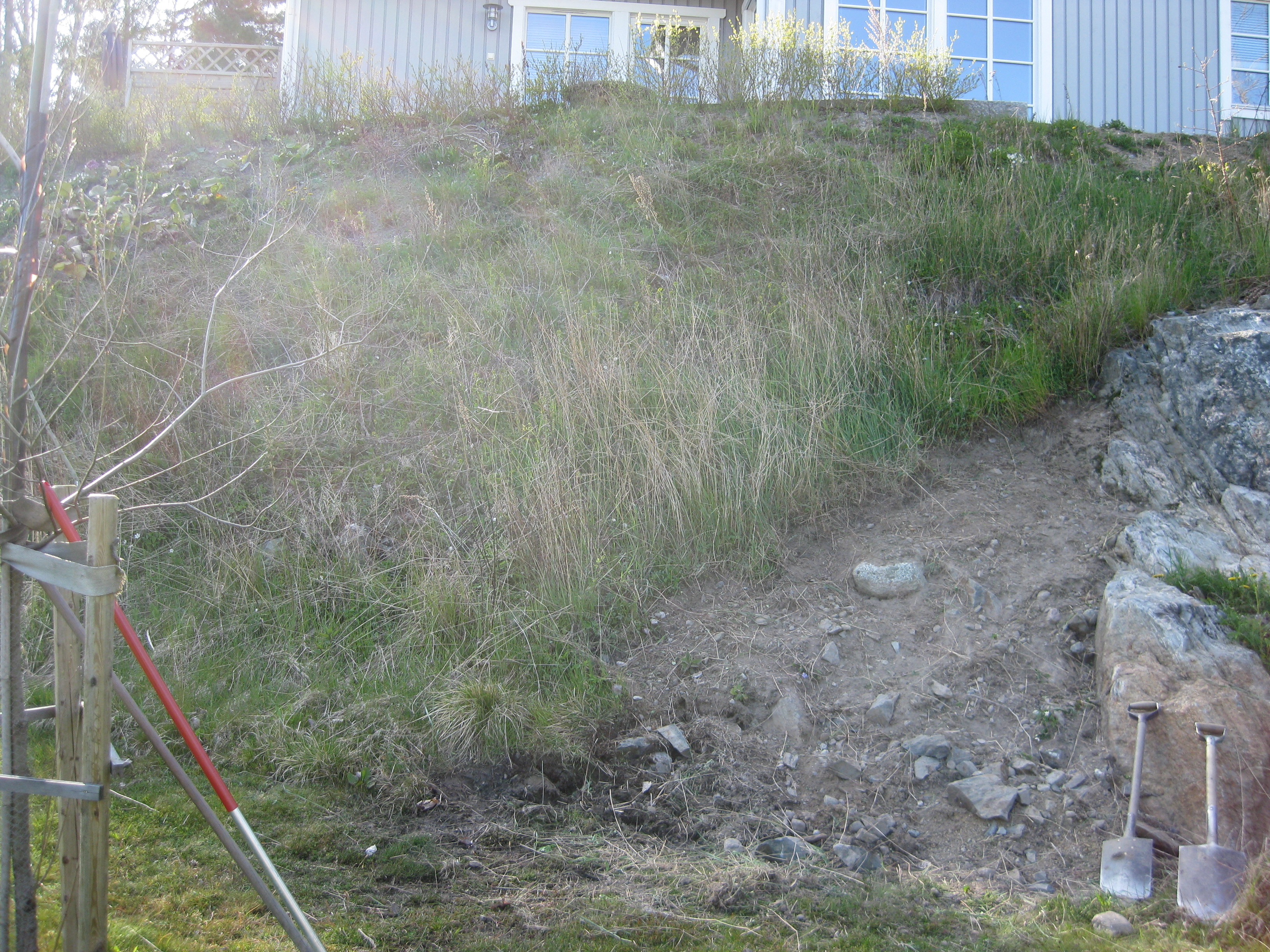 I växthuset tittar Blomman för dagen och tagetes upp ur sålådan, och en del pelargoner har börjat blomma. I rabatten har Pärlhyacinter och Bergenior börjat slå ut. Vi börjar snygga till bakom norra garaget, där vi ska lägga trädgårdsavfall i den lilla slänt som finns. Vi jämnar till och lägger lite grovt grus för att lättare kunna köra dit med skottkärrorna.
