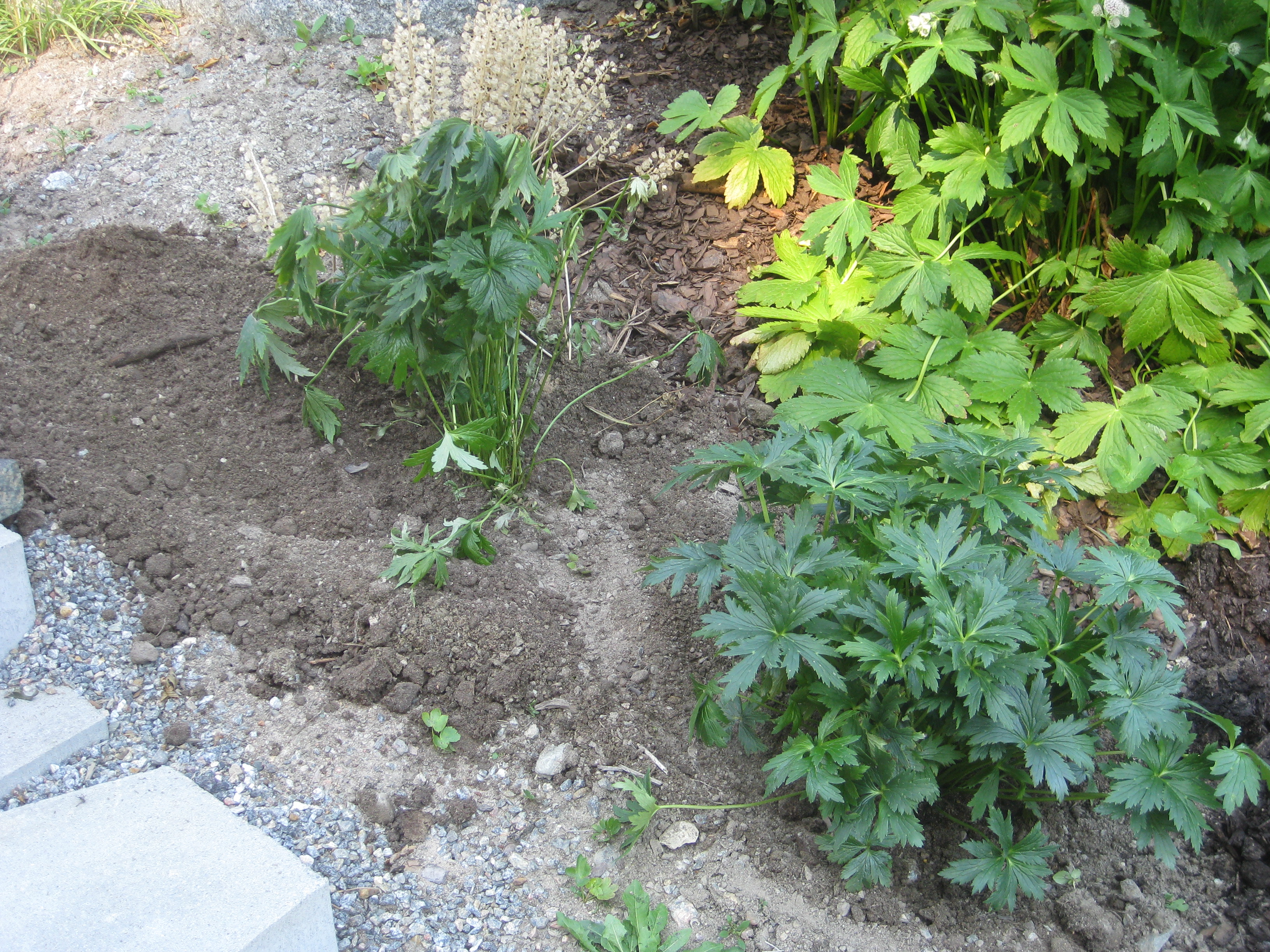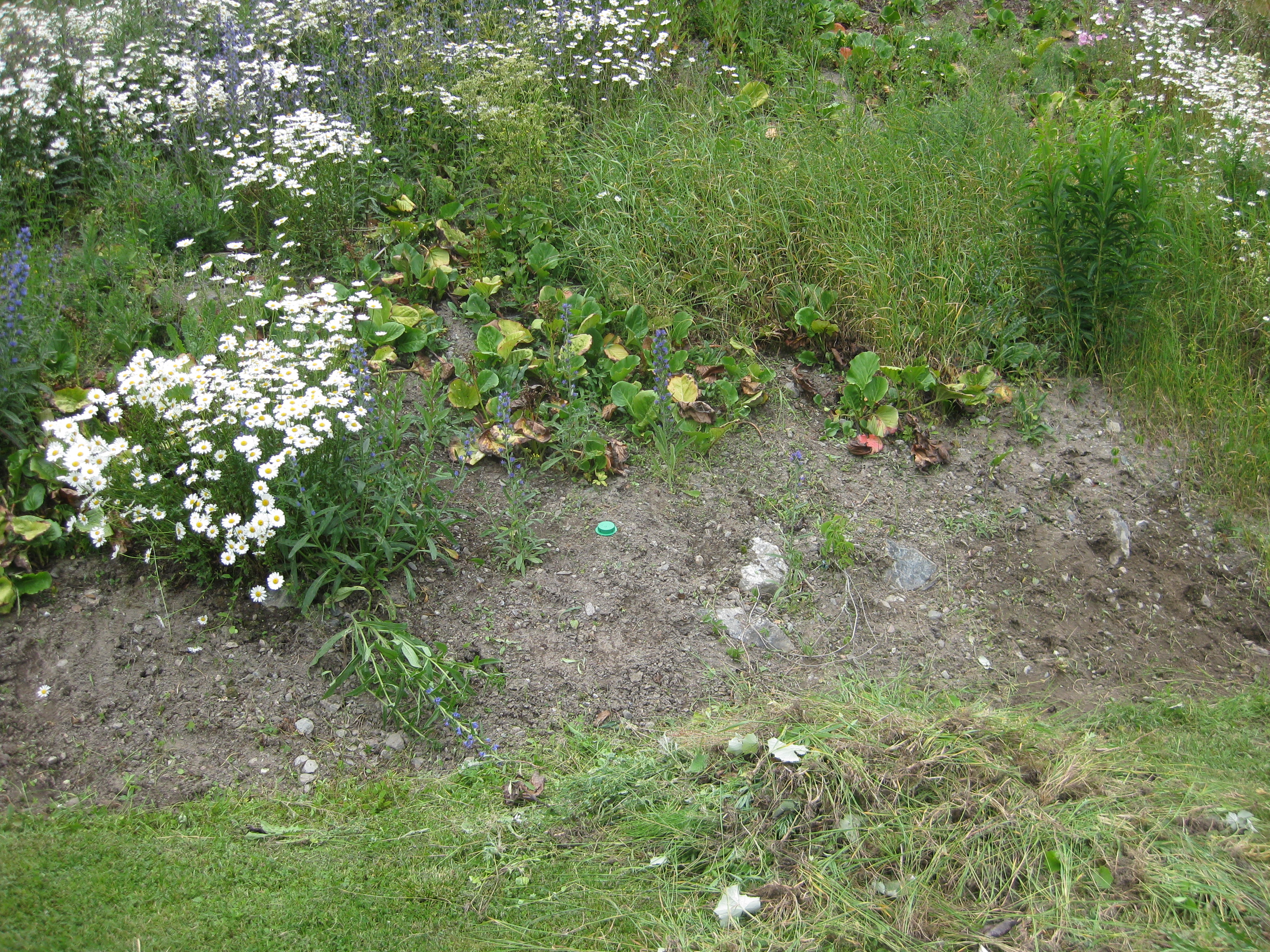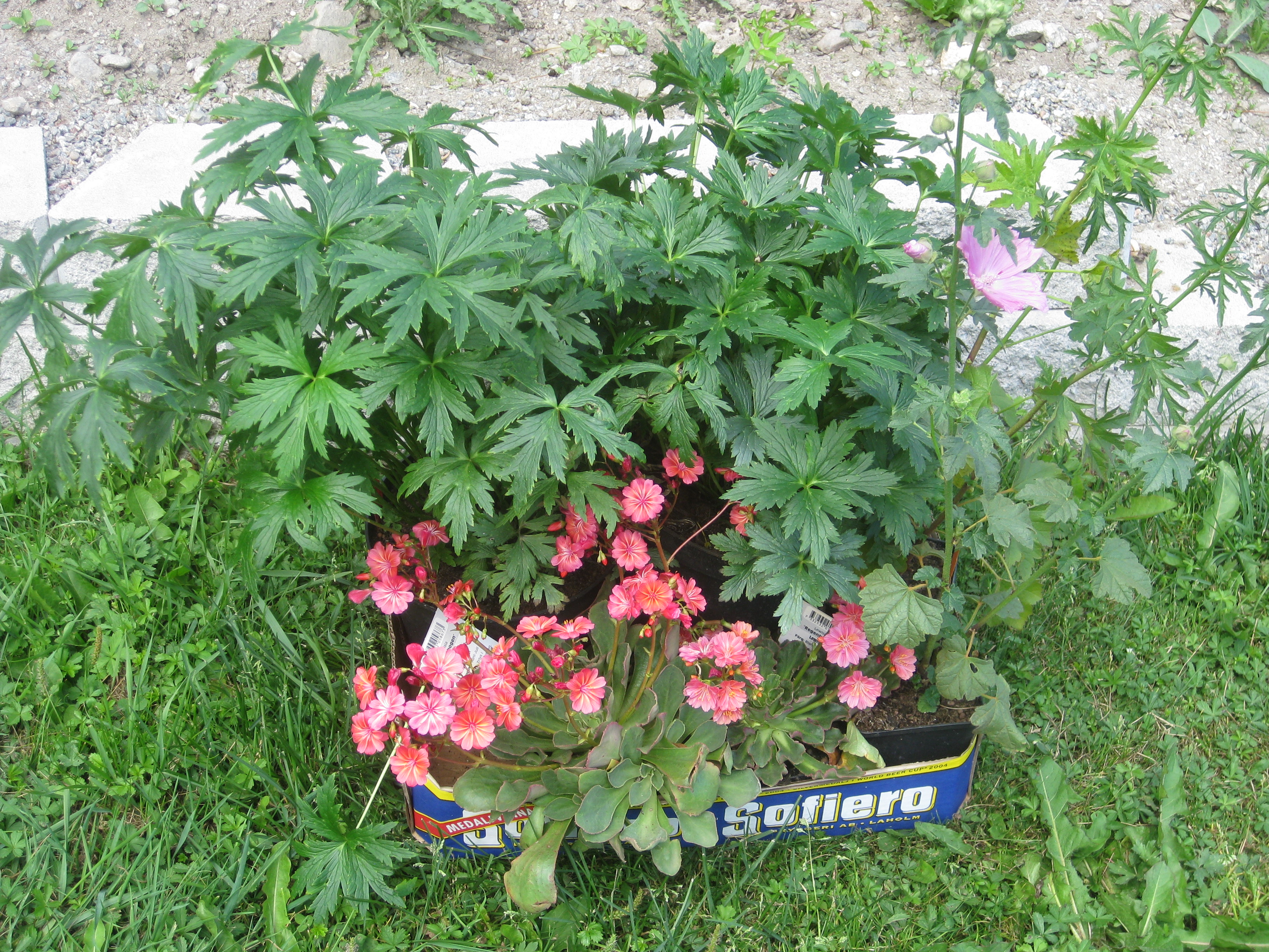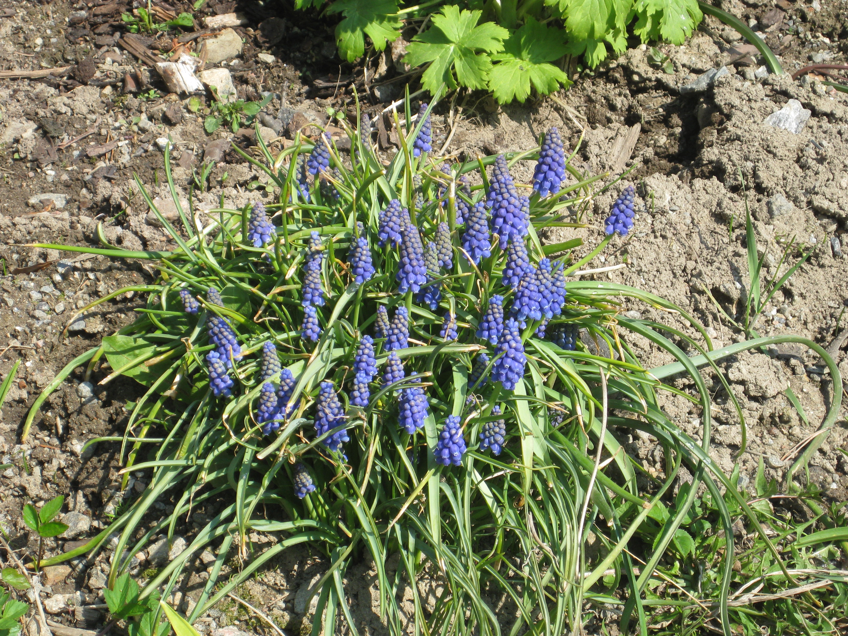 I växthuset tittar Blomman för dagen och tagetes upp ur sålådan, och en del pelargoner har börjat blomma. I rabatten har Pärlhyacinter och Bergenior börjat slå ut. Vi börjar snygga till bakom norra garaget, där vi ska lägga trädgårdsavfall i den lilla slänt som finns. Vi jämnar till och lägger lite grovt grus för att lättare kunna köra dit med skottkärrorna.