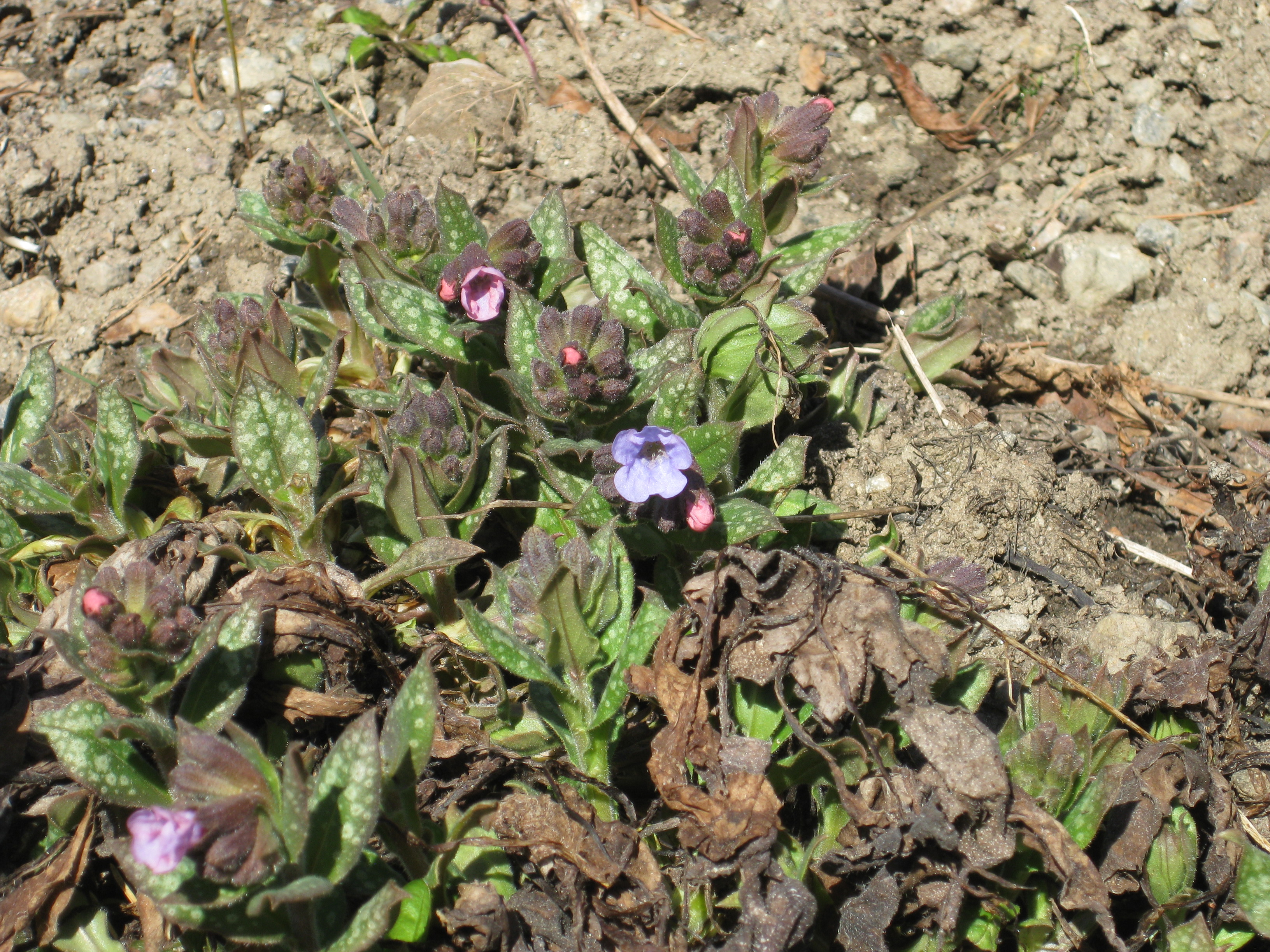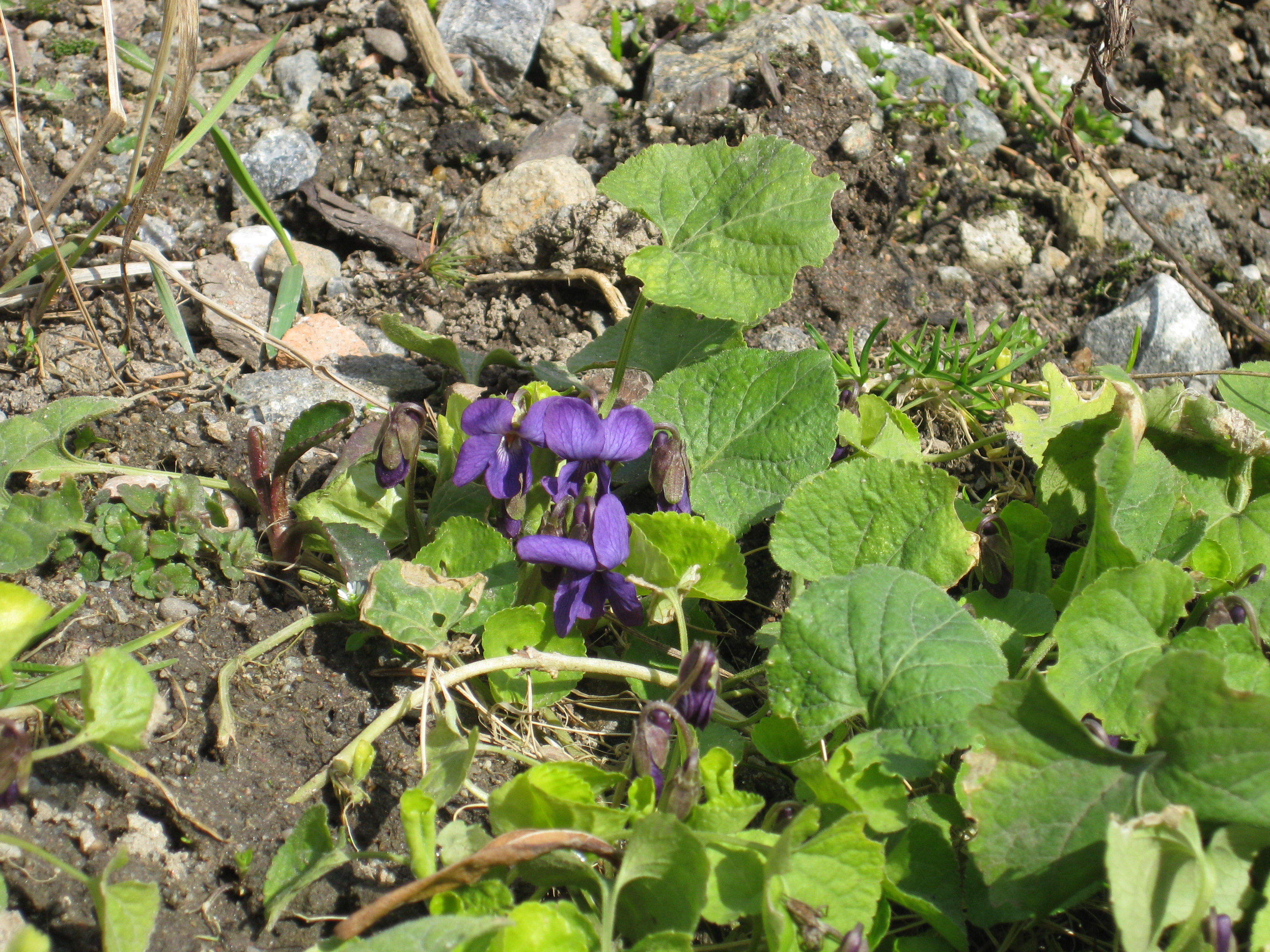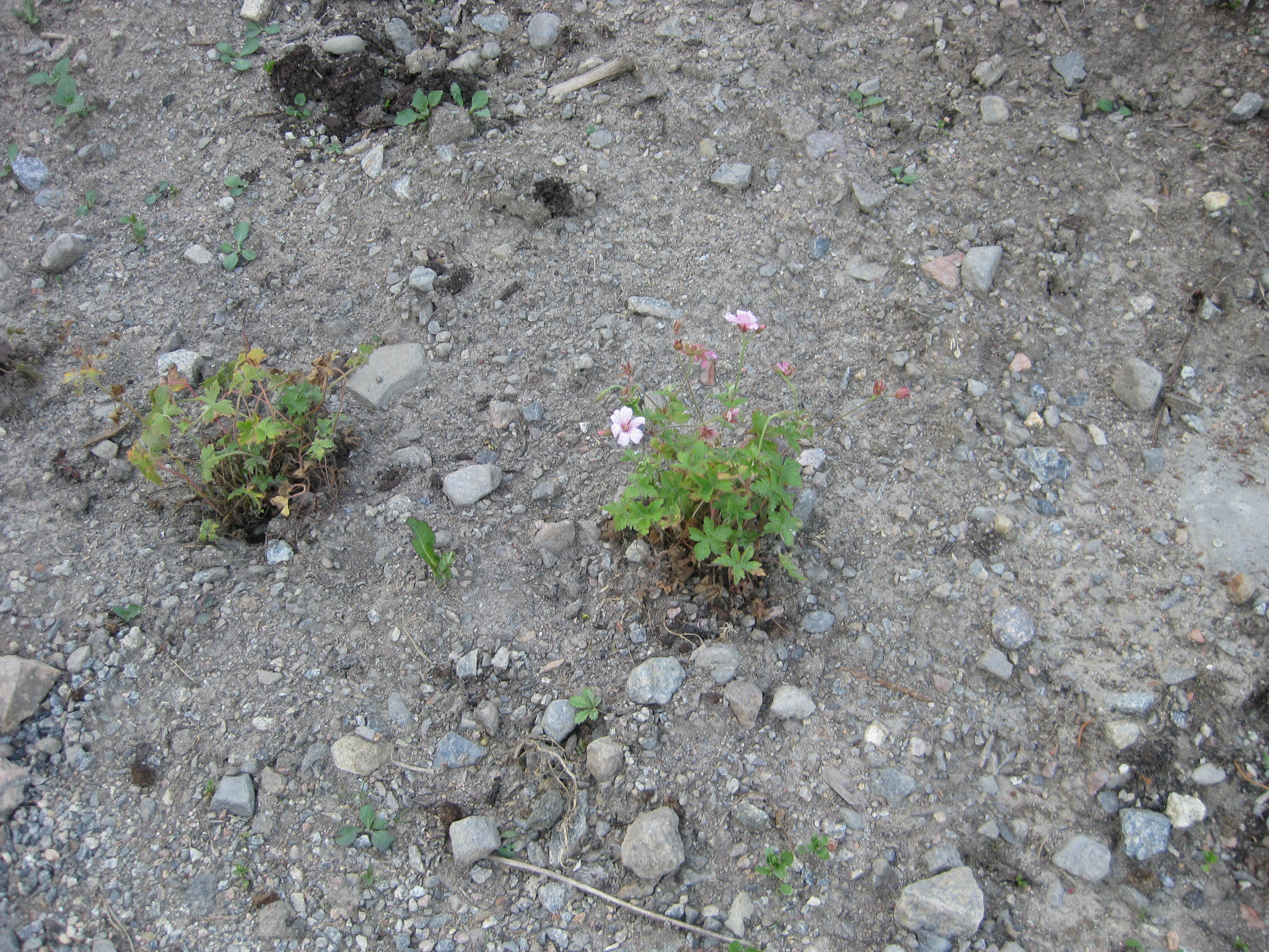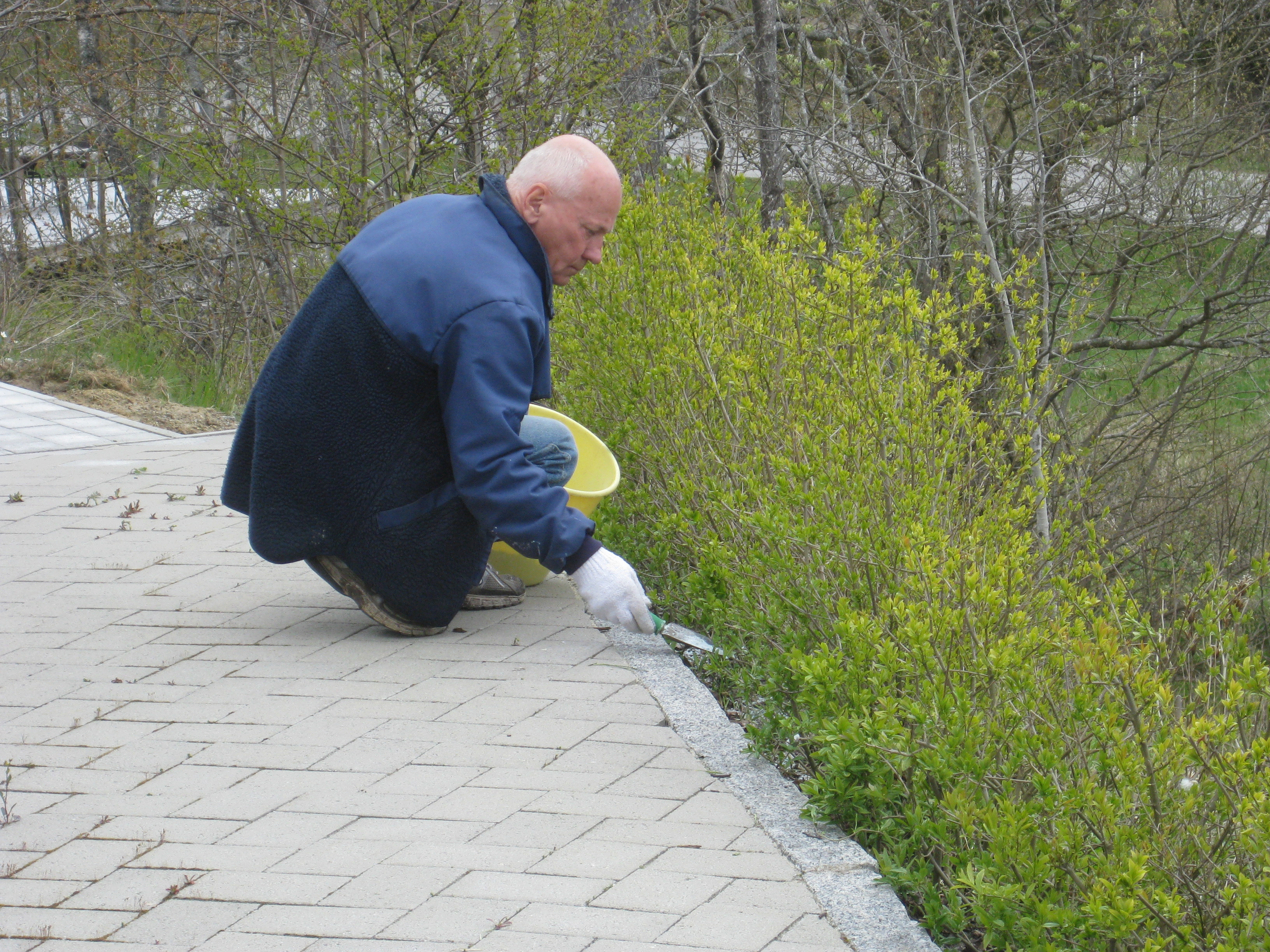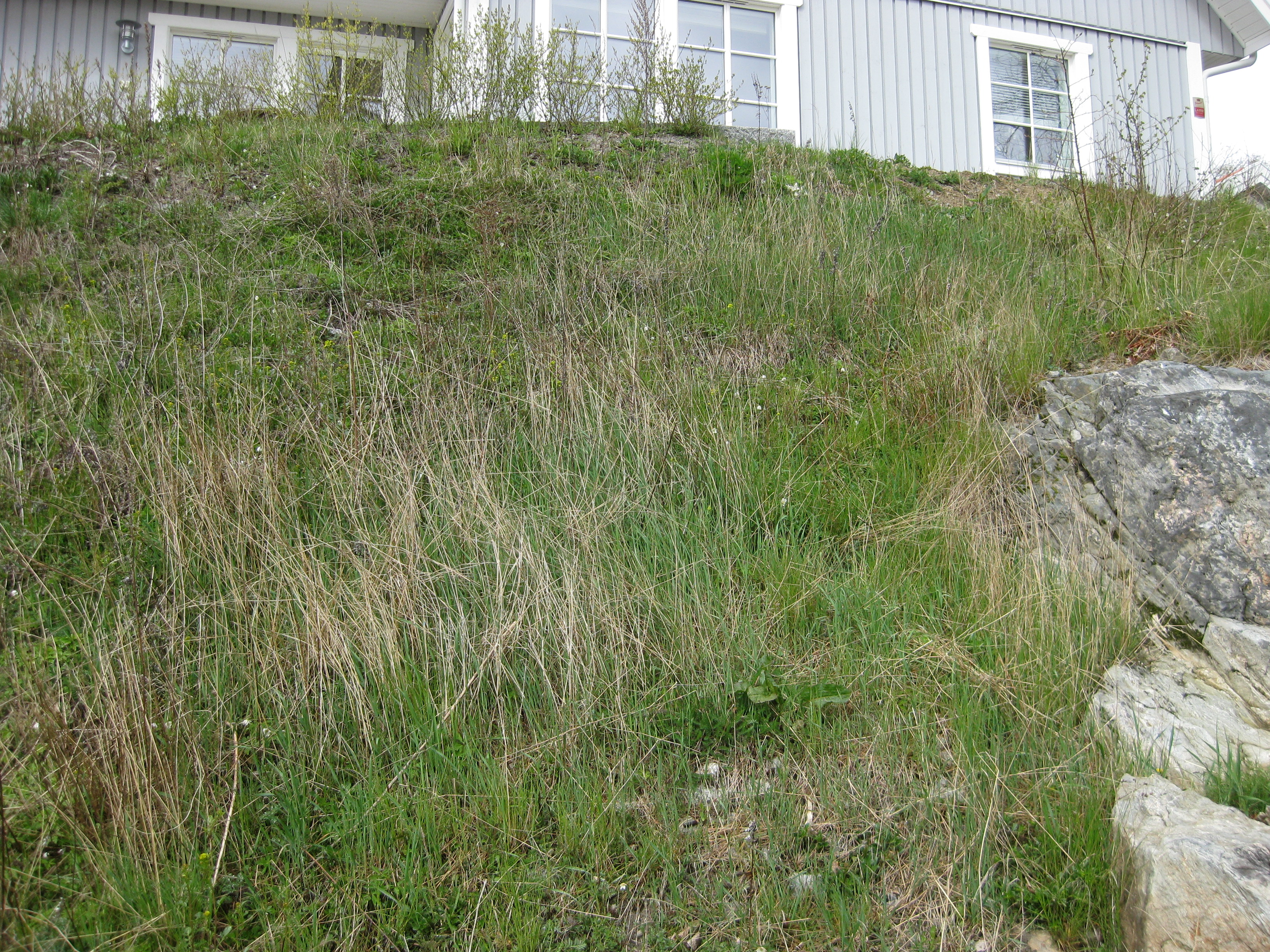 I växthuset tittar Blomman för dagen och tagetes upp ur sålådan, och en del pelargoner har börjat blomma. I rabatten har Pärlhyacinter och Bergenior börjat slå ut. Vi börjar snygga till bakom norra garaget, där vi ska lägga trädgårdsavfall i den lilla slänt som finns. Vi jämnar till och lägger lite grovt grus för att lättare kunna köra dit med skottkärrorna.