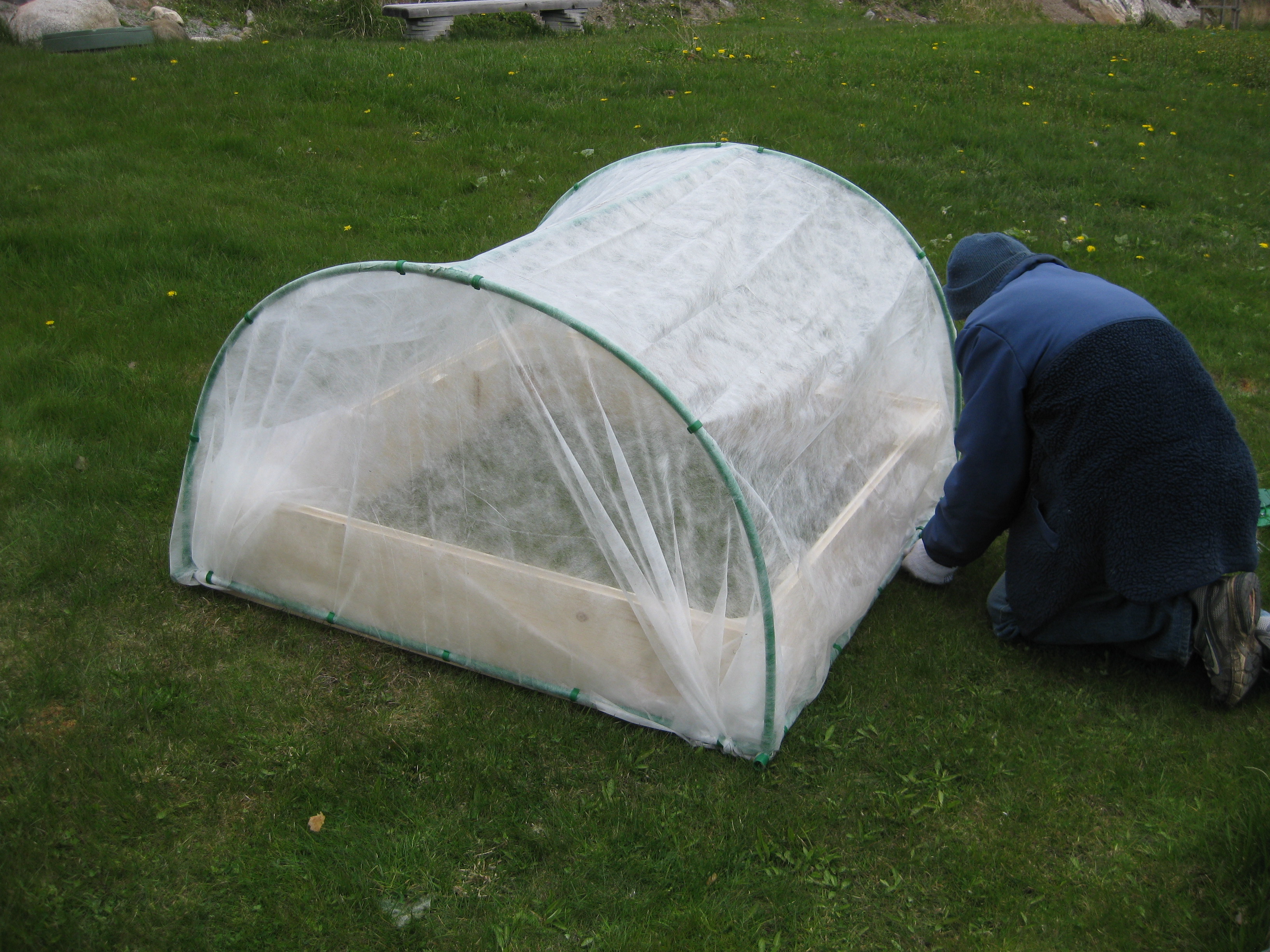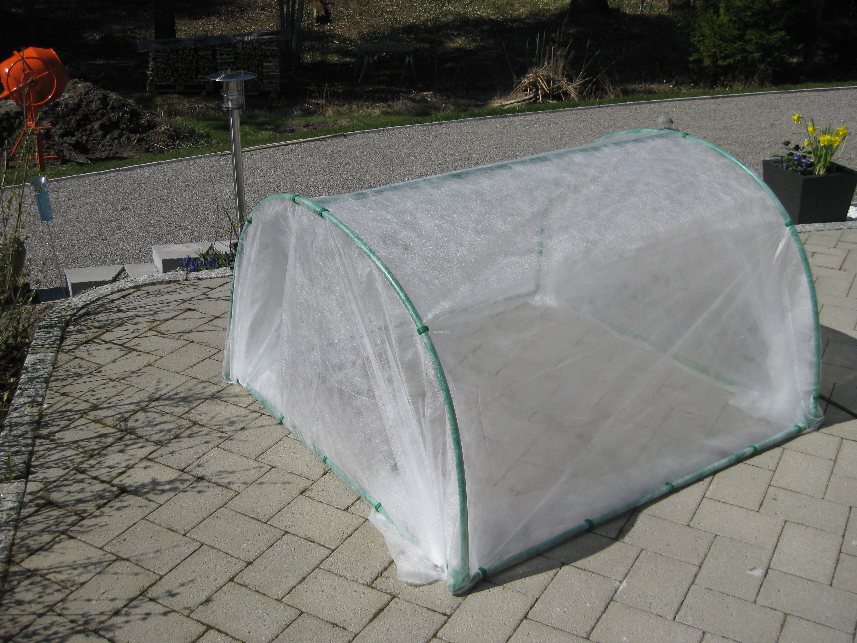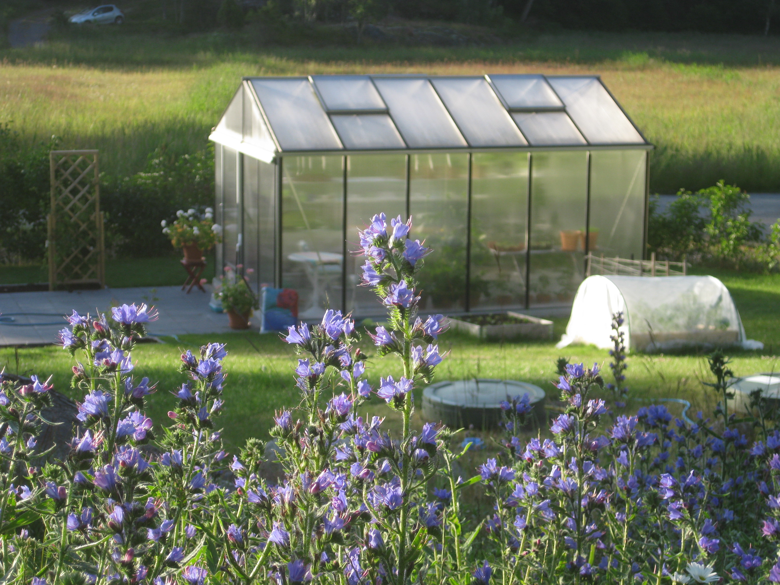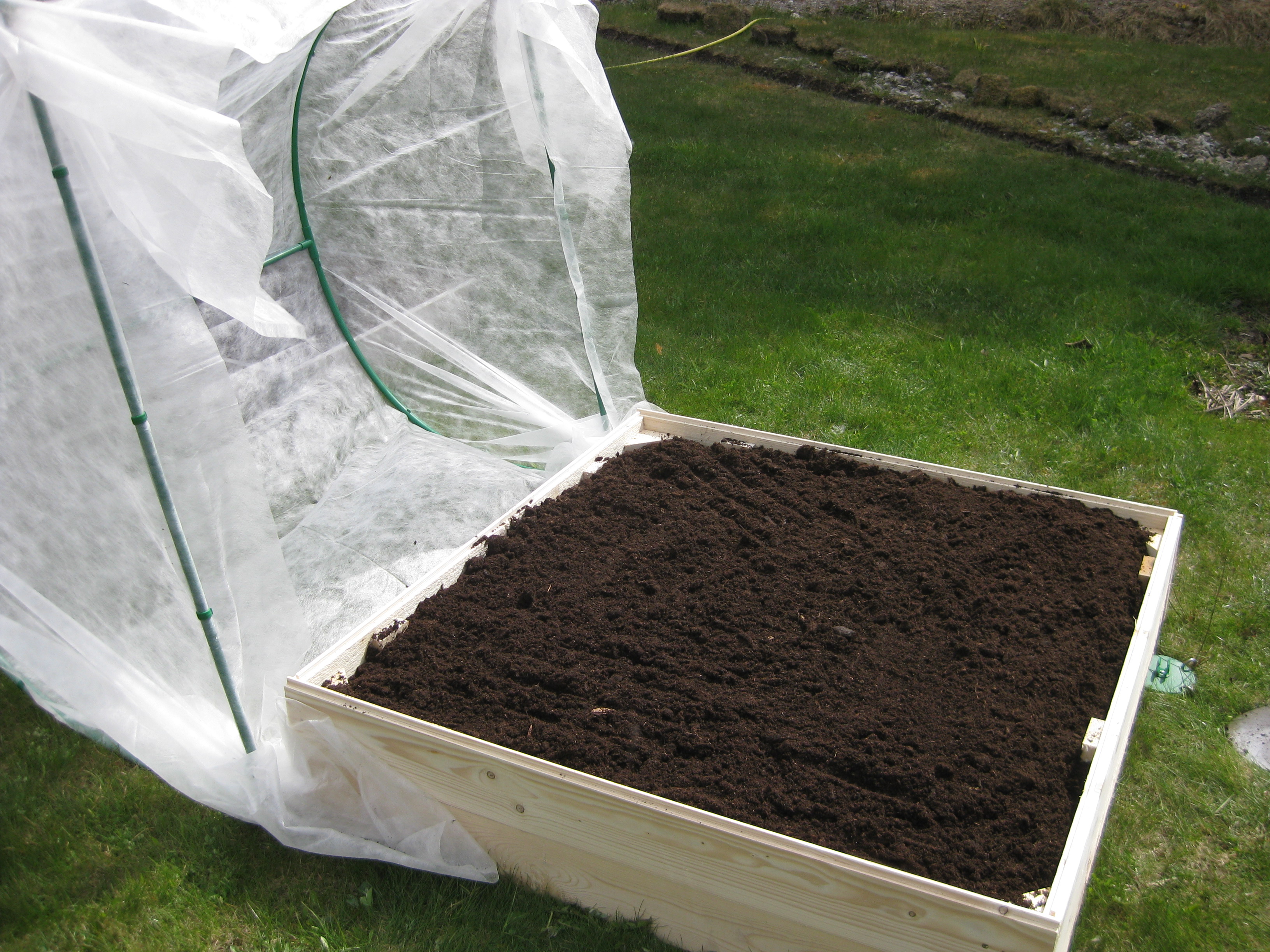 Vi sätter ihop en odlingstunnel, eller vad det kan kallas, som ska skydda kommande grönsakssådd mot diverse odjur. Håkan ska bygga en pallkrage att sätta under den. Tulpanerna blommar, och inte en enda har angripits av rådjur – mysko. Eller så fungerar det nya anti-rådjursmedlet… Vi klipper ner kaprifolerna lite. Båda verkar ha klarat vintern, och den ena är riktigt buskig och fin. Bergeniorna blommar i slänten, och Katarina sår blomkål i badrummet. 🙂