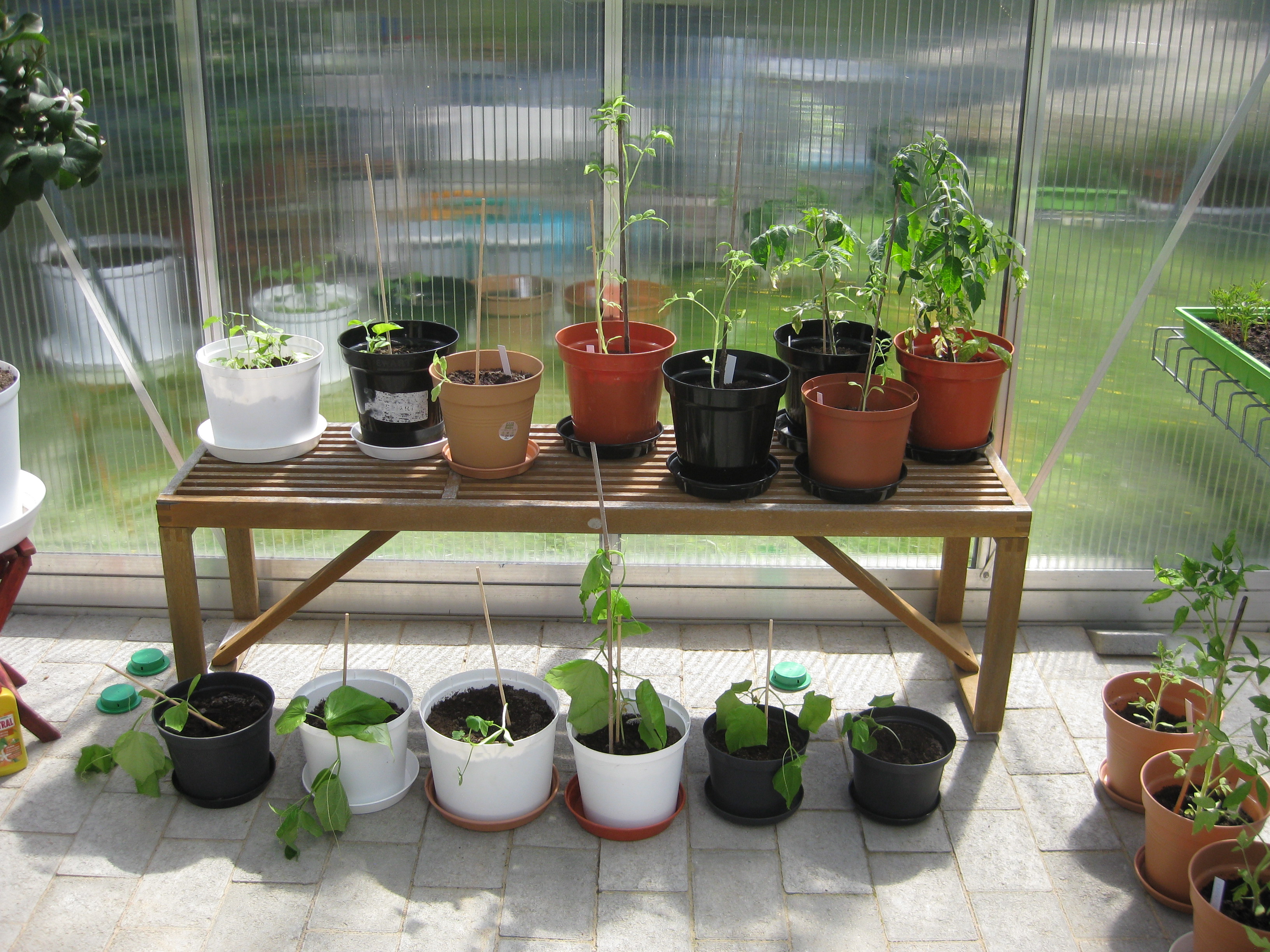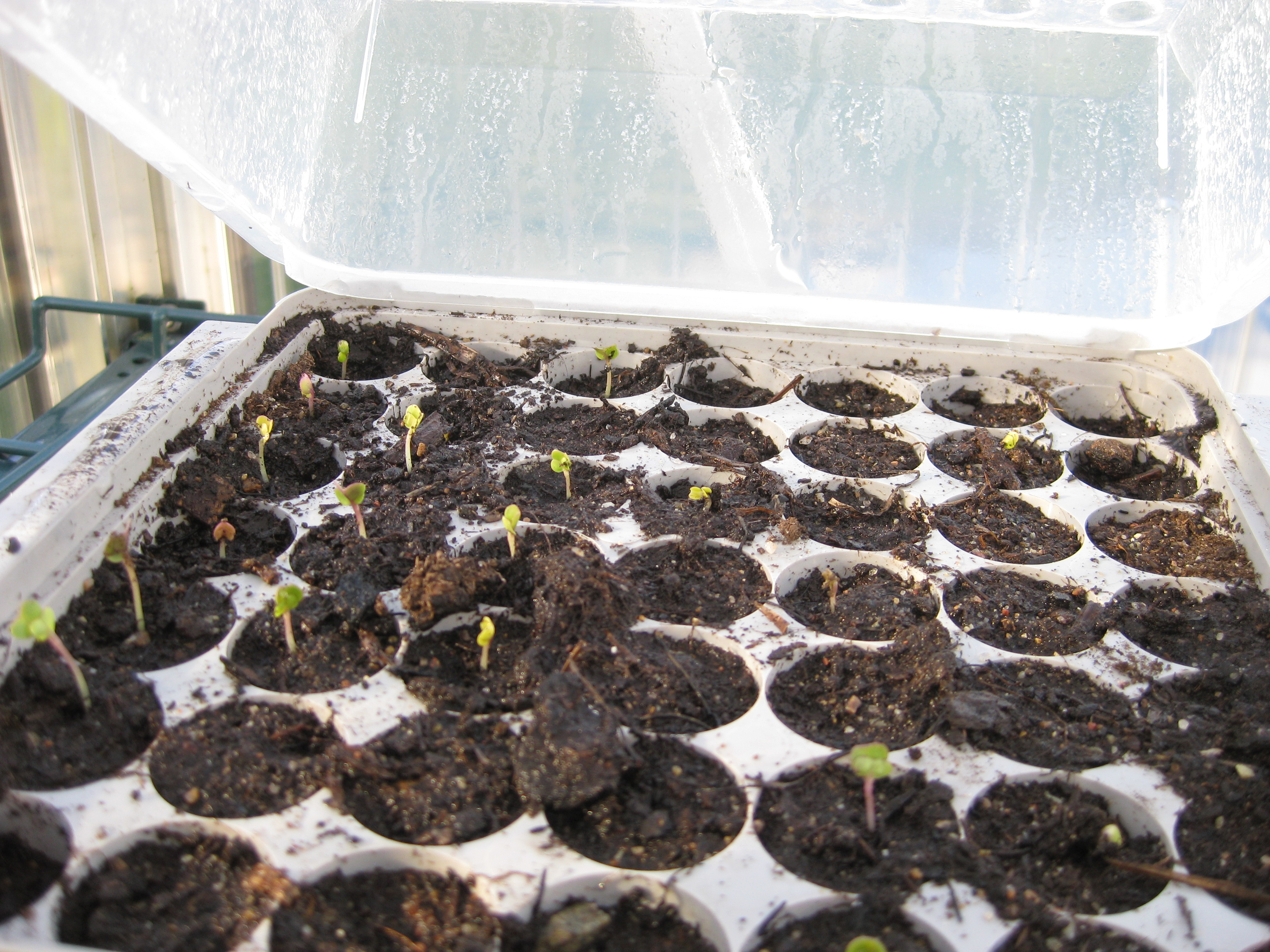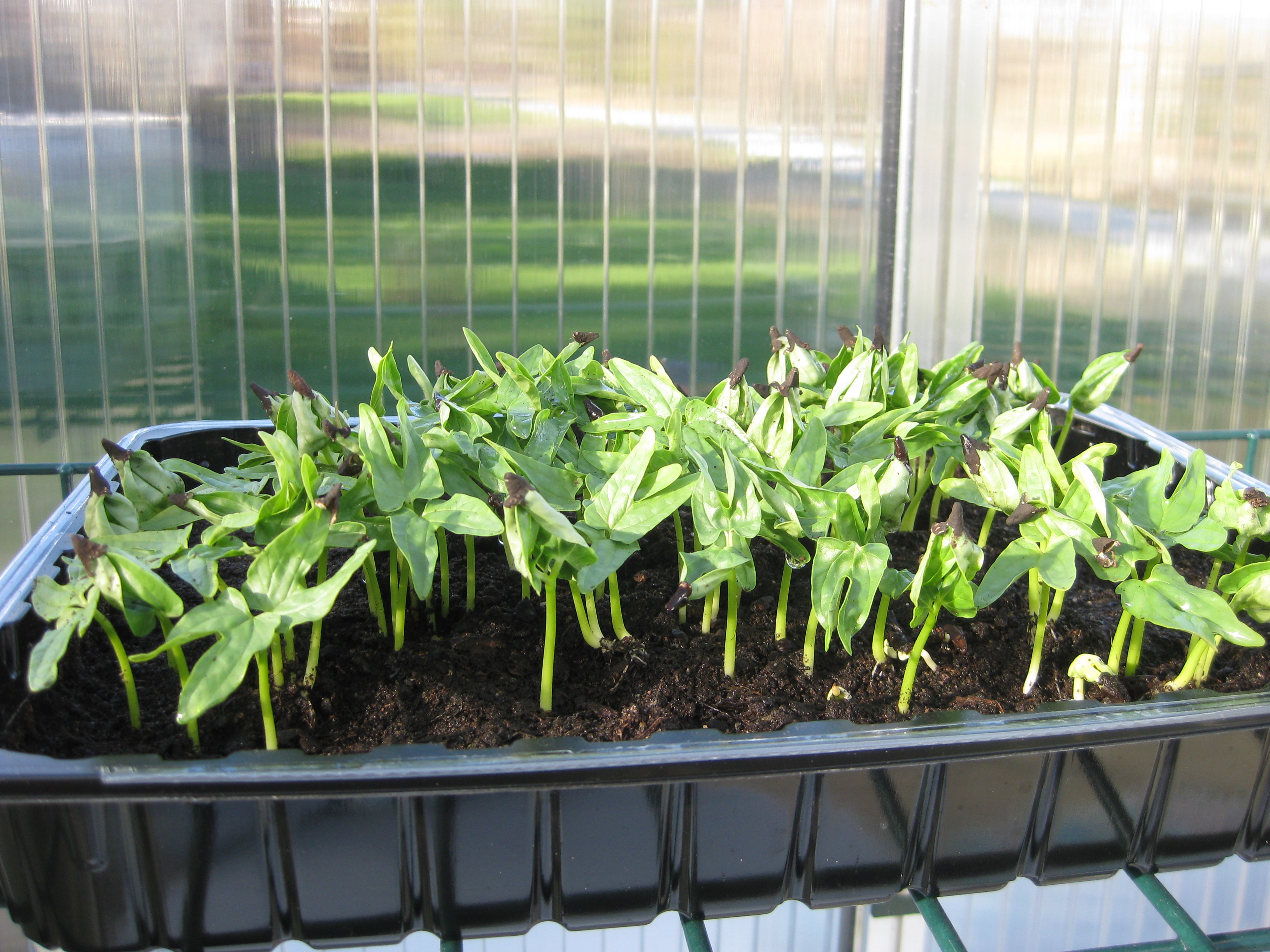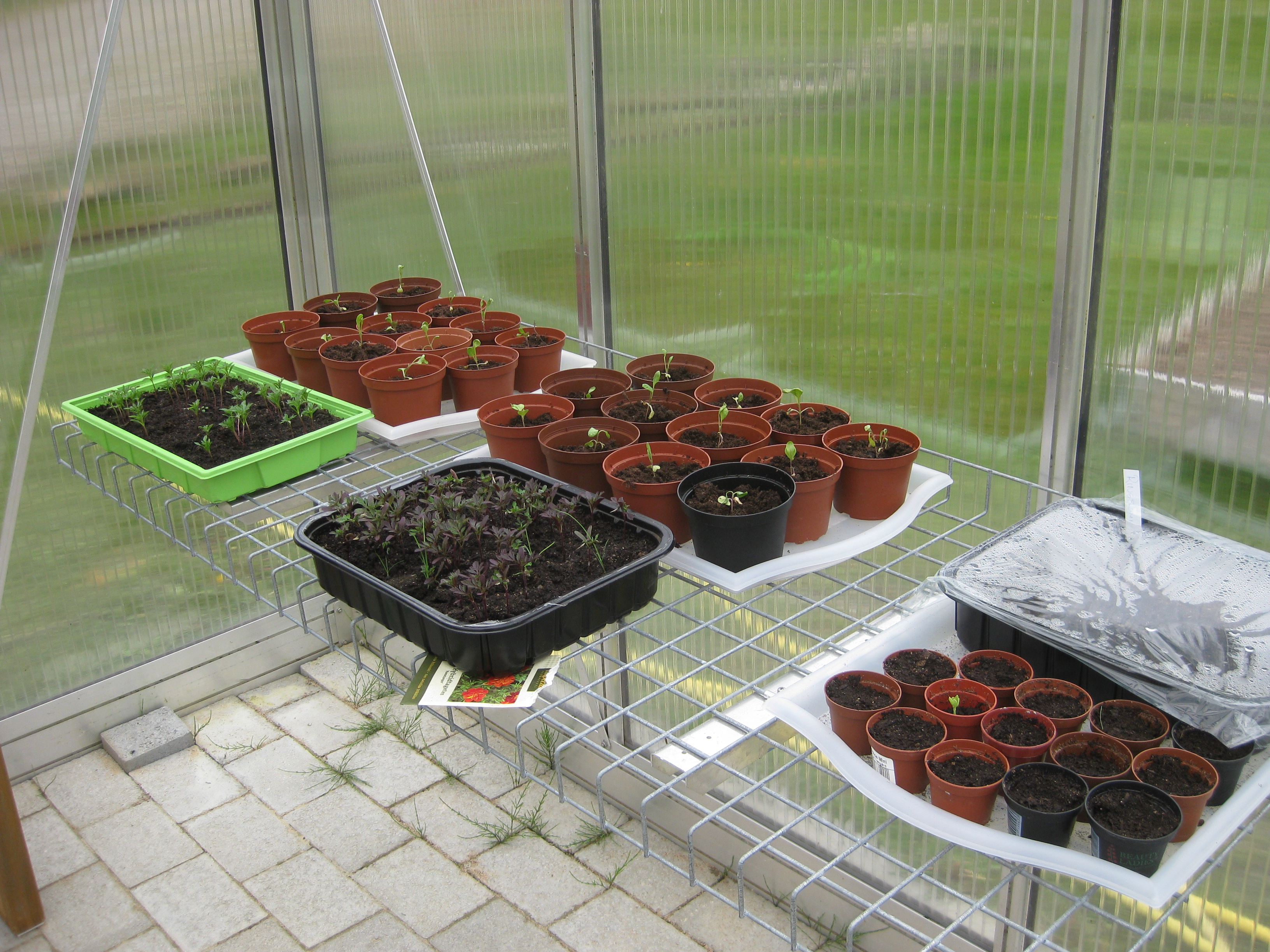Nu är det dags att tömma badrummet på sådd och flytta alltsammans till växthuset! Äntligen! Potatisen börjar sticka upp, och rädisorna växer med en farlig fart under sin huva i pallkragen. Vi sår lite bönor och sopar sättsand vid växthusets uteplats.