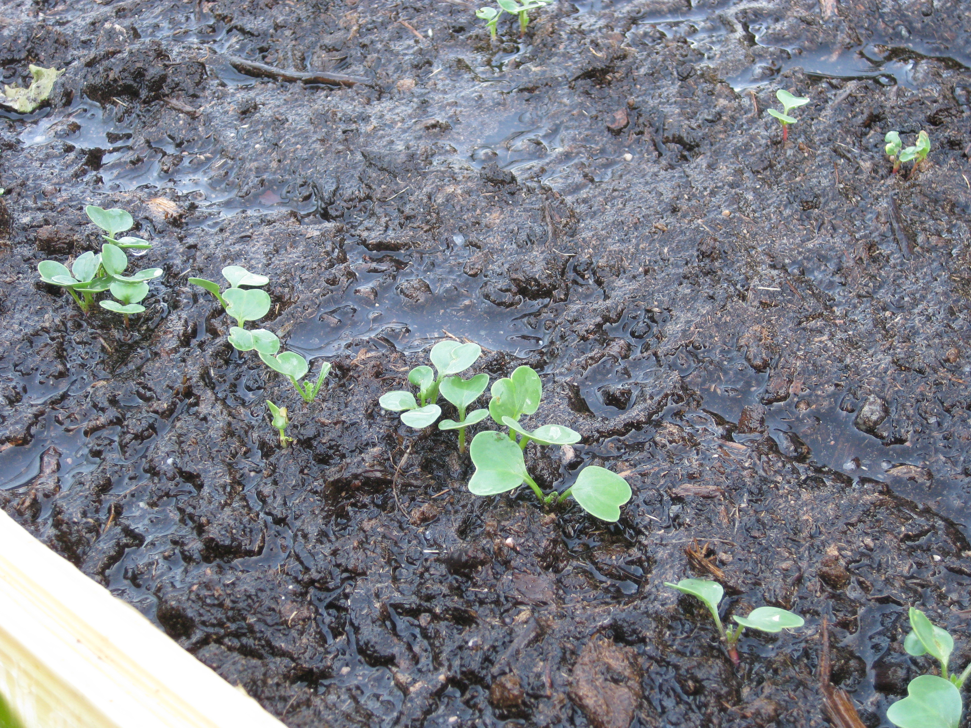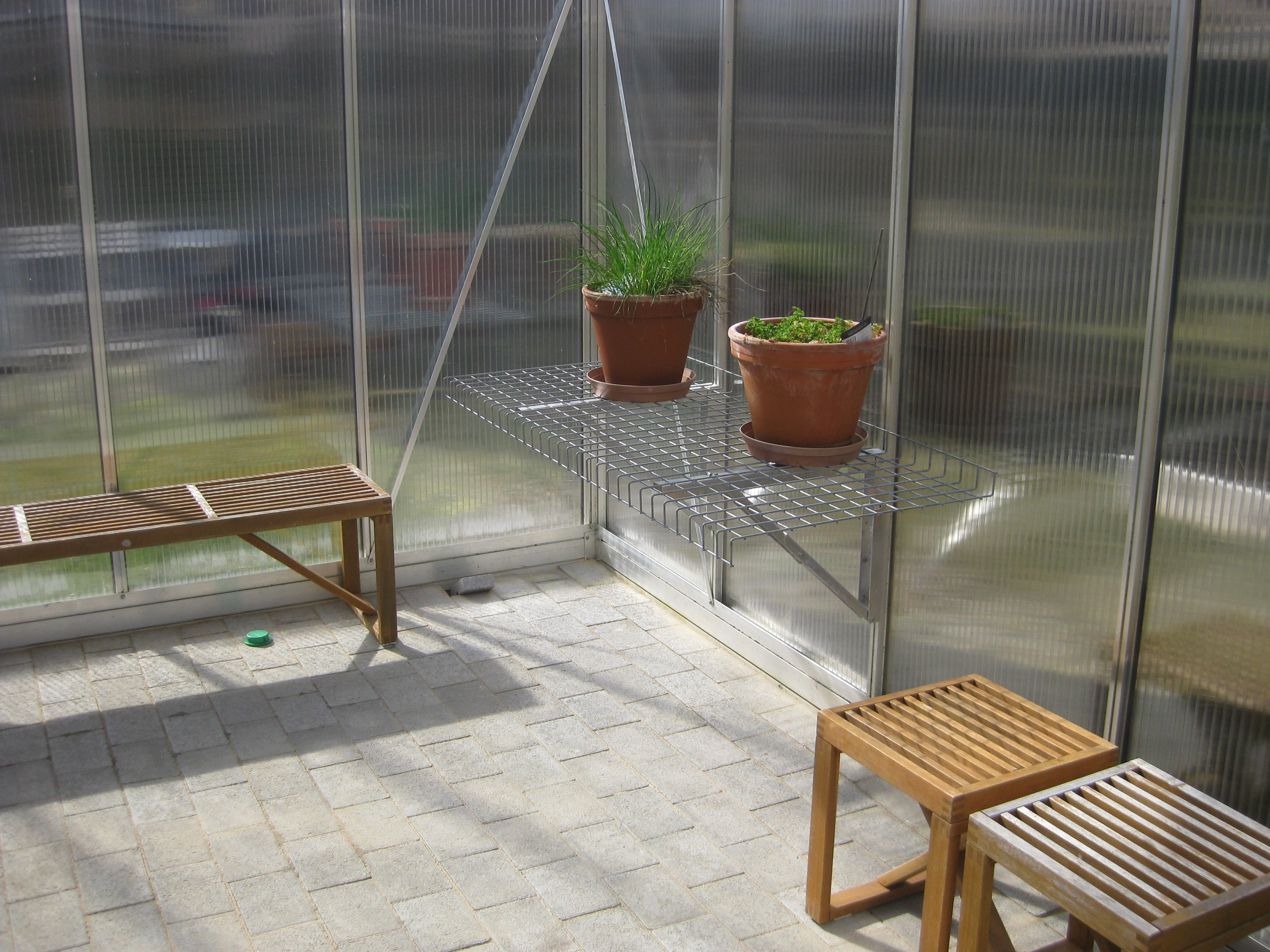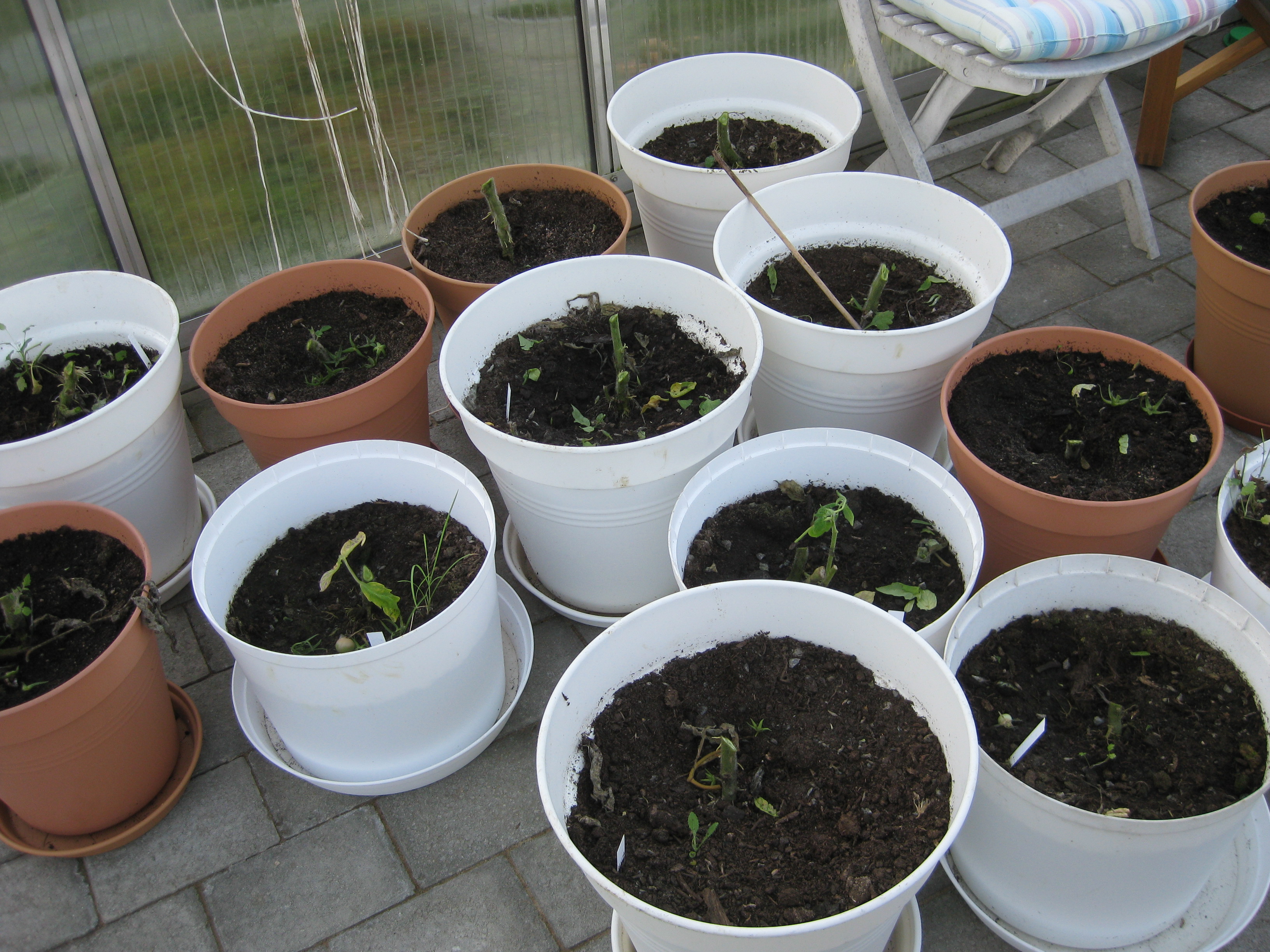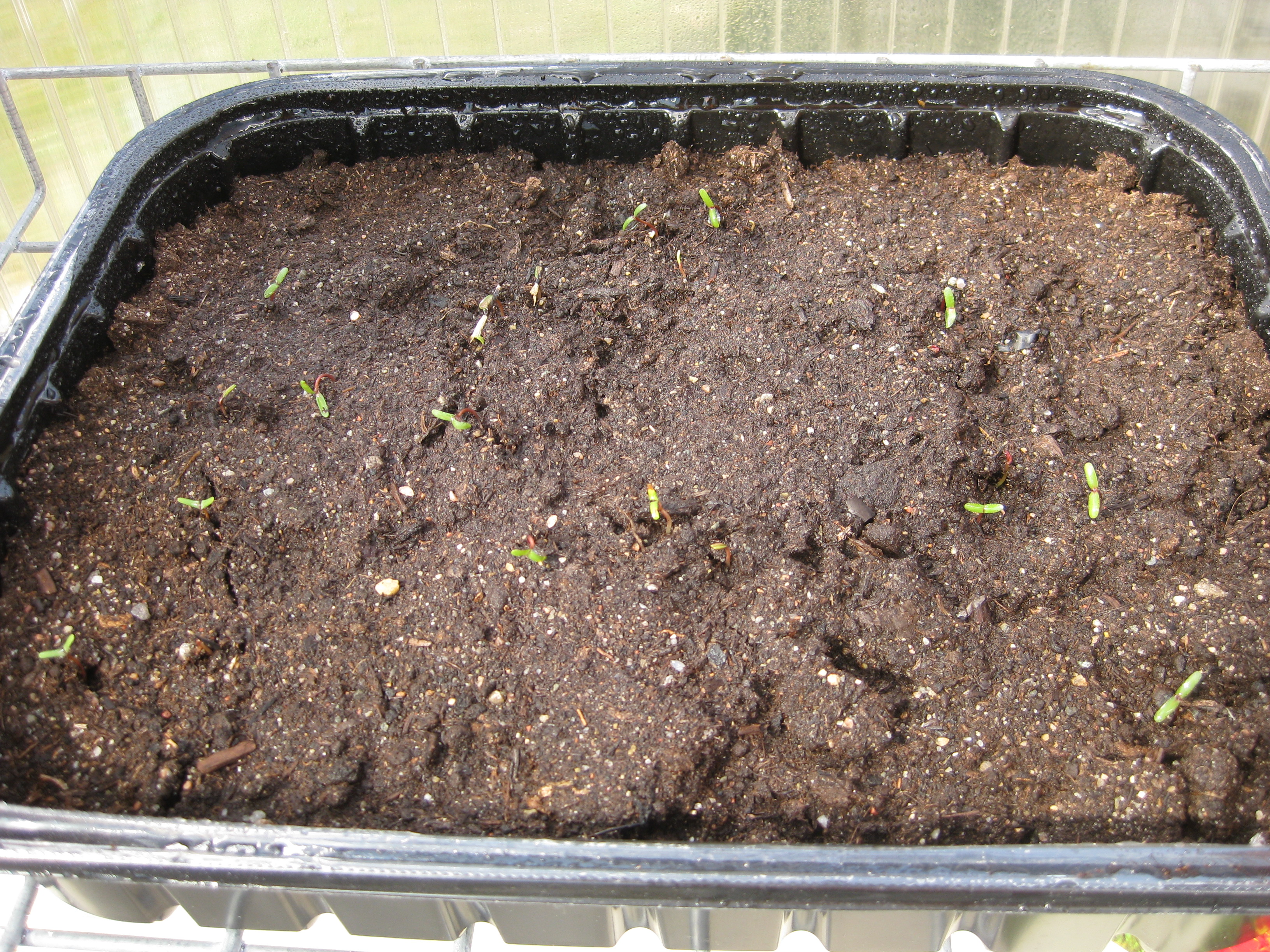 Nu är det dags att tömma badrummet på sådd och flytta alltsammans till växthuset! Äntligen! Potatisen börjar sticka upp, och rädisorna växer med en farlig fart under sin huva i pallkragen. Vi sår lite bönor och sopar sättsand vid växthusets uteplats.