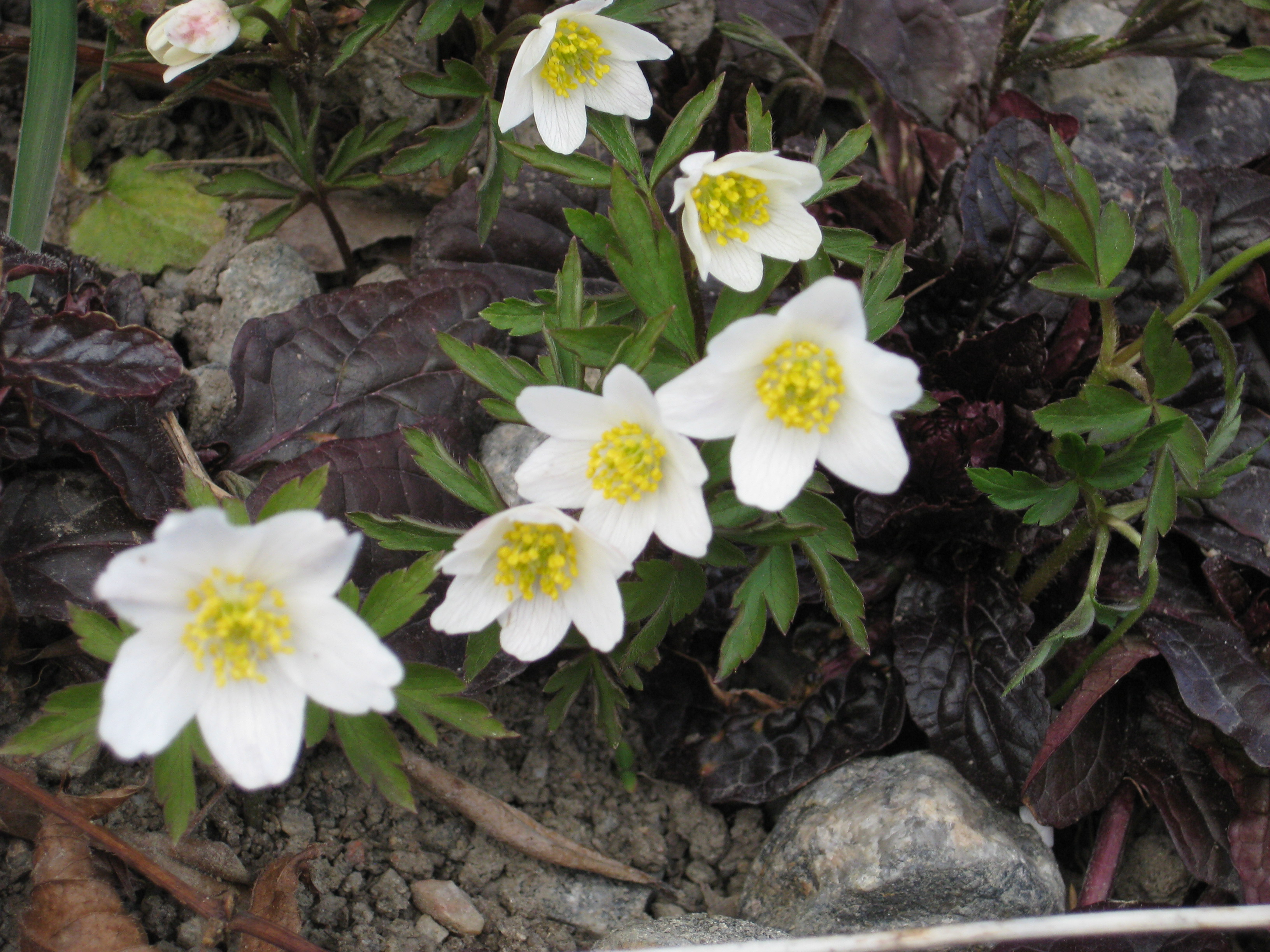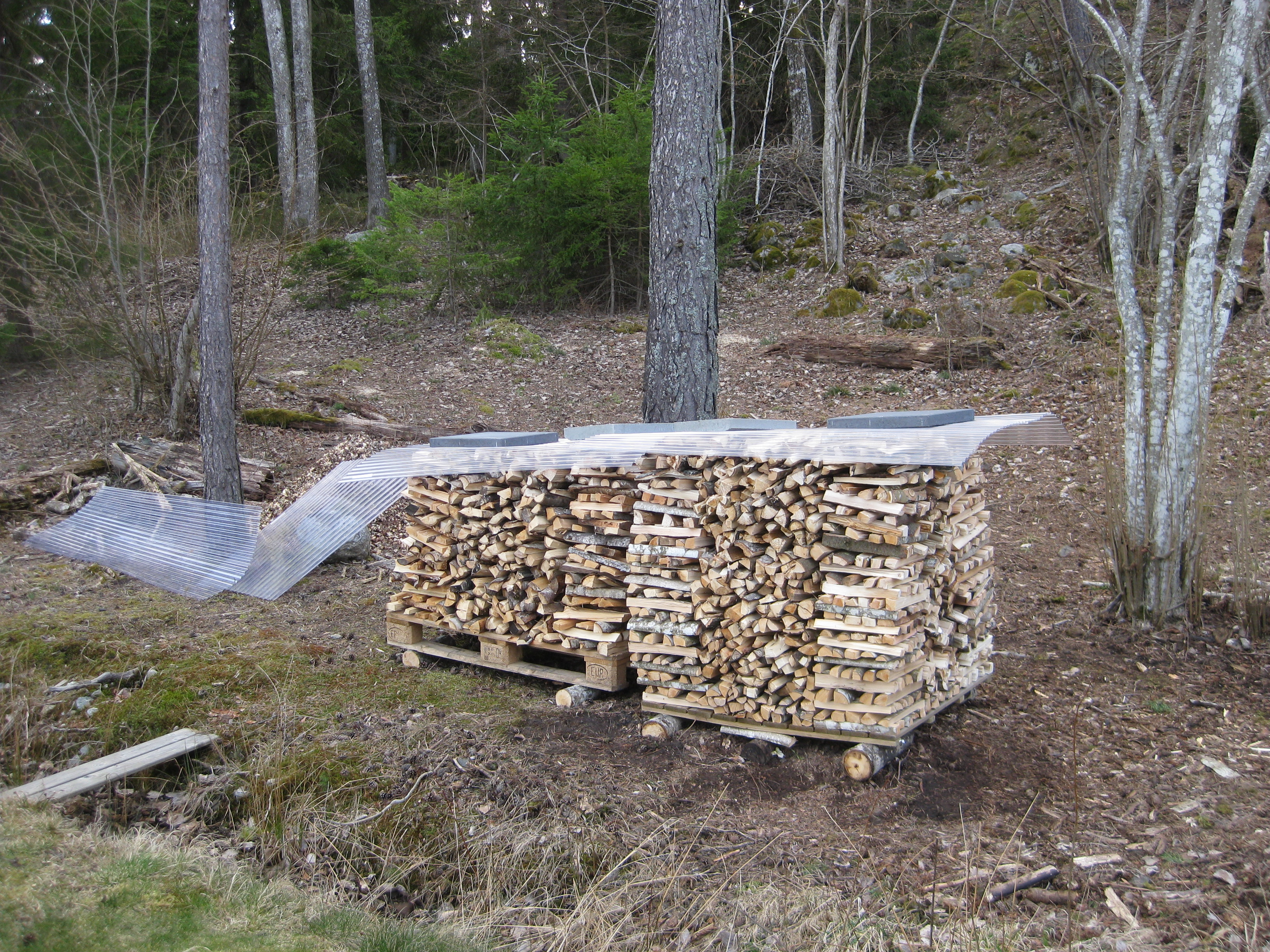 Vi staplar upp den ved som Håkan klyvt under gårdagen, och täcker över med plast. Vi hittar en del saker i trädgården, vitsippor, ett skelett och små påskliljor som slagit ut. Vi tar bort vinterståndarna på prästkragarna och kör dessa i kompostkvarnen.