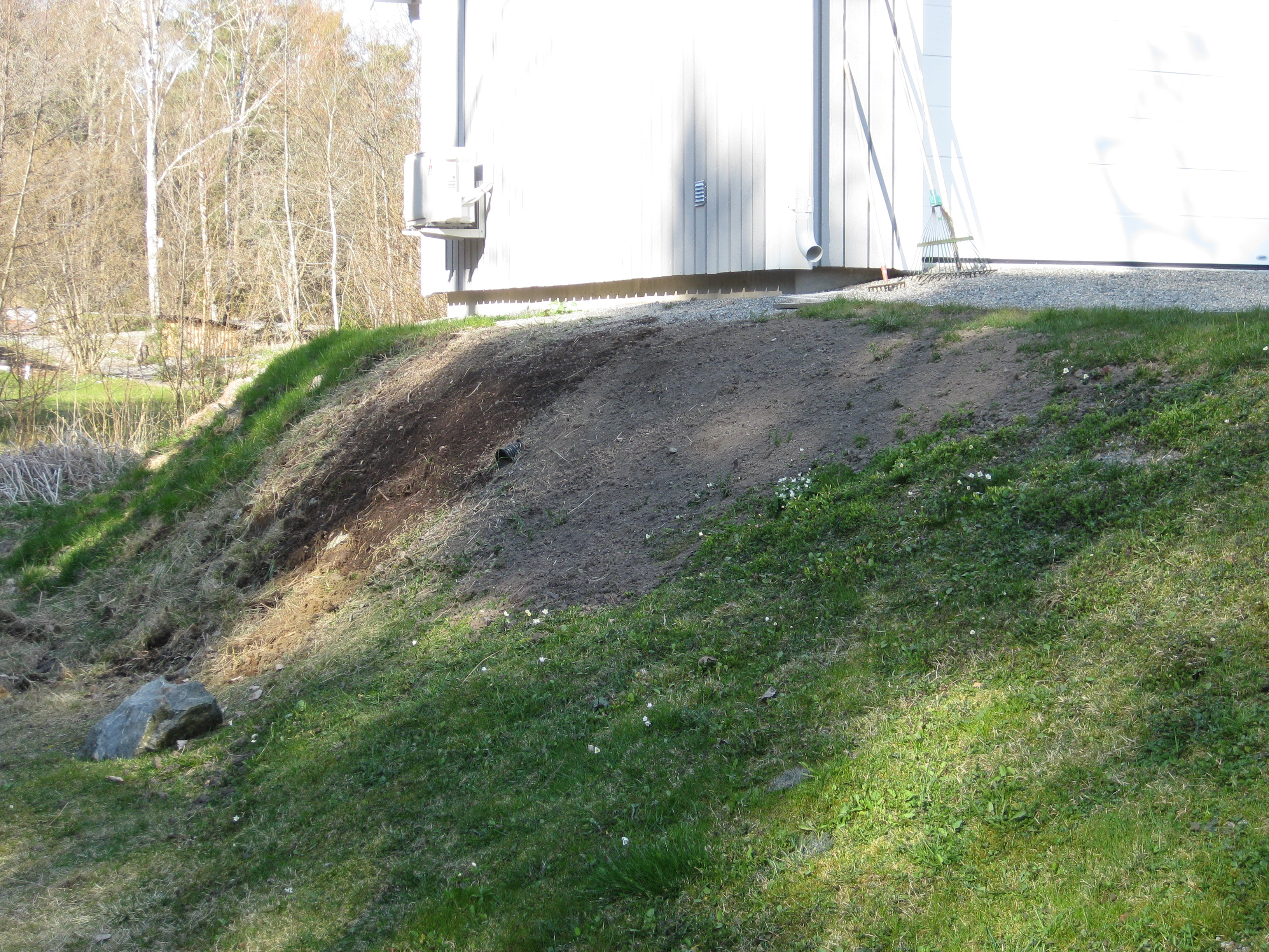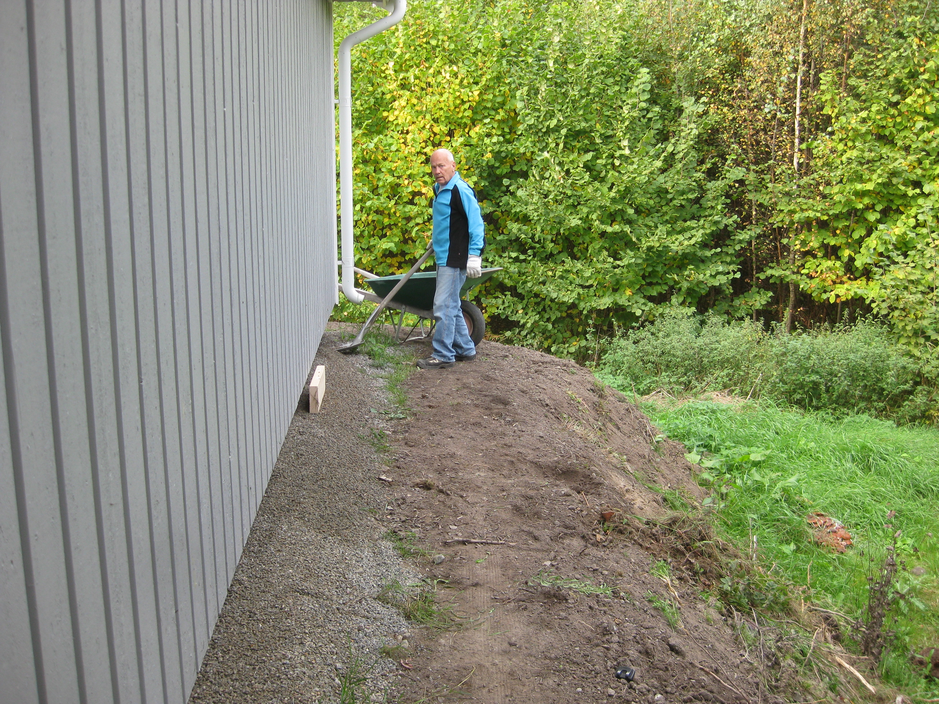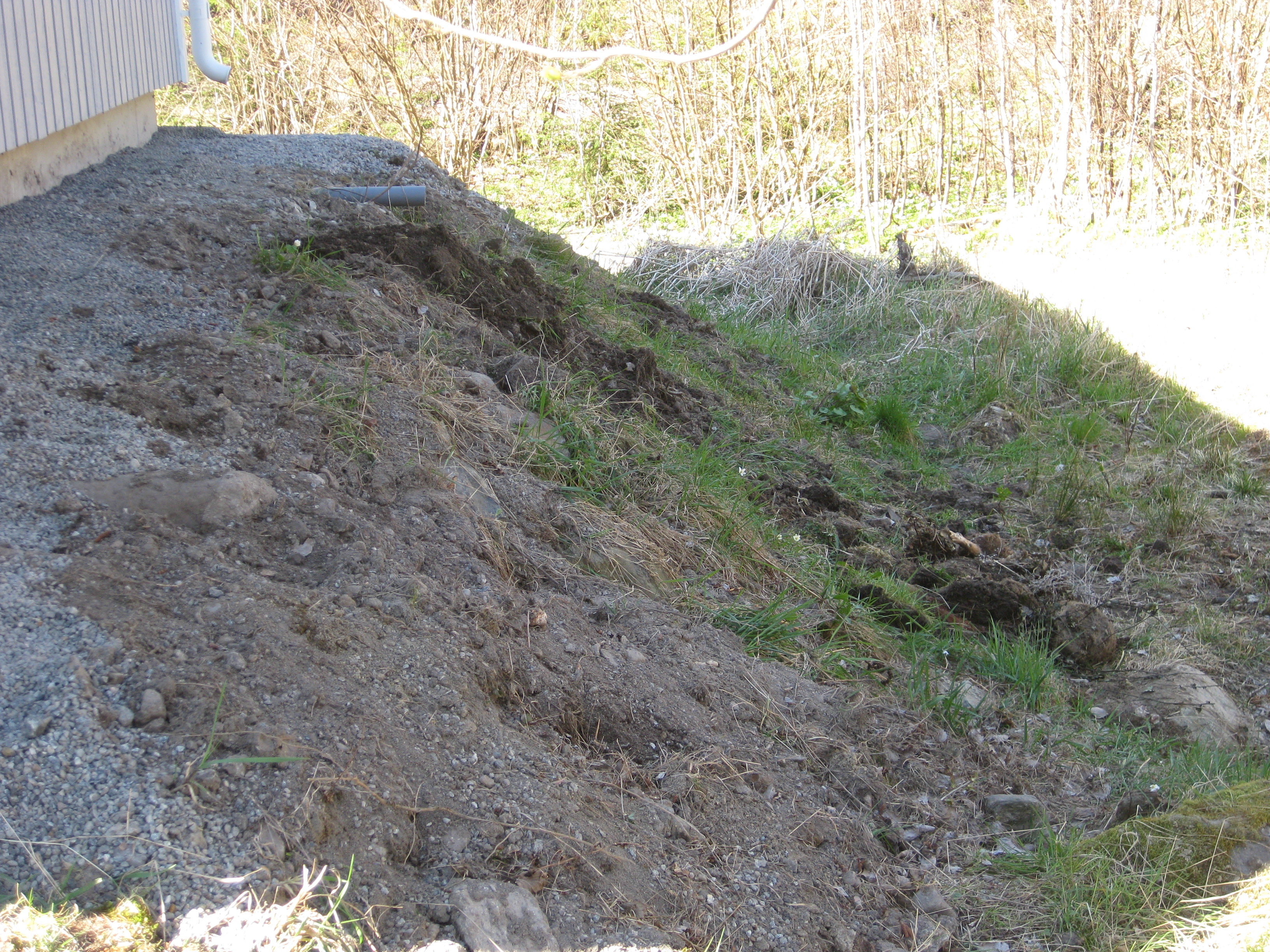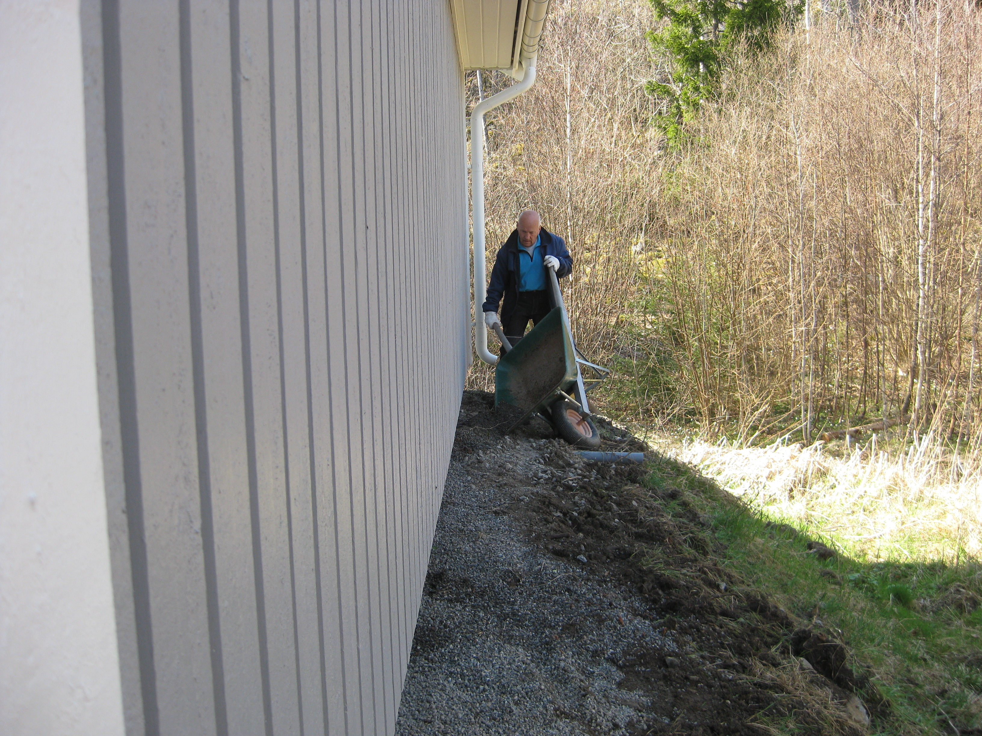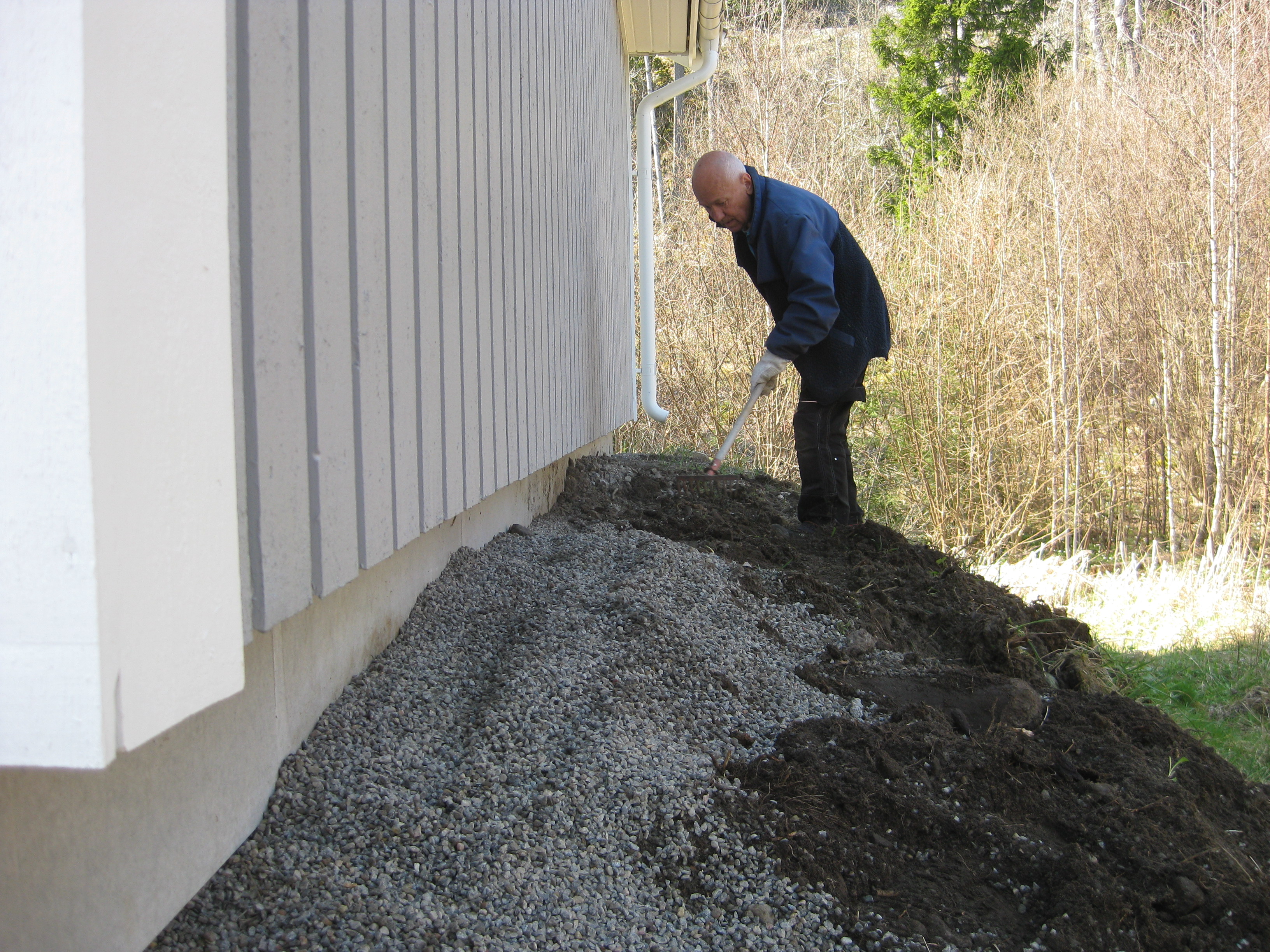Håkan skarvar dräneringsrör, så att vi kan fylla på med lite material bakom norra garaget. Kompostarbete pågår, och det grävs potatisland. Håkan jämnar till och gör fint i slänten vid garaget, på västra sidan.