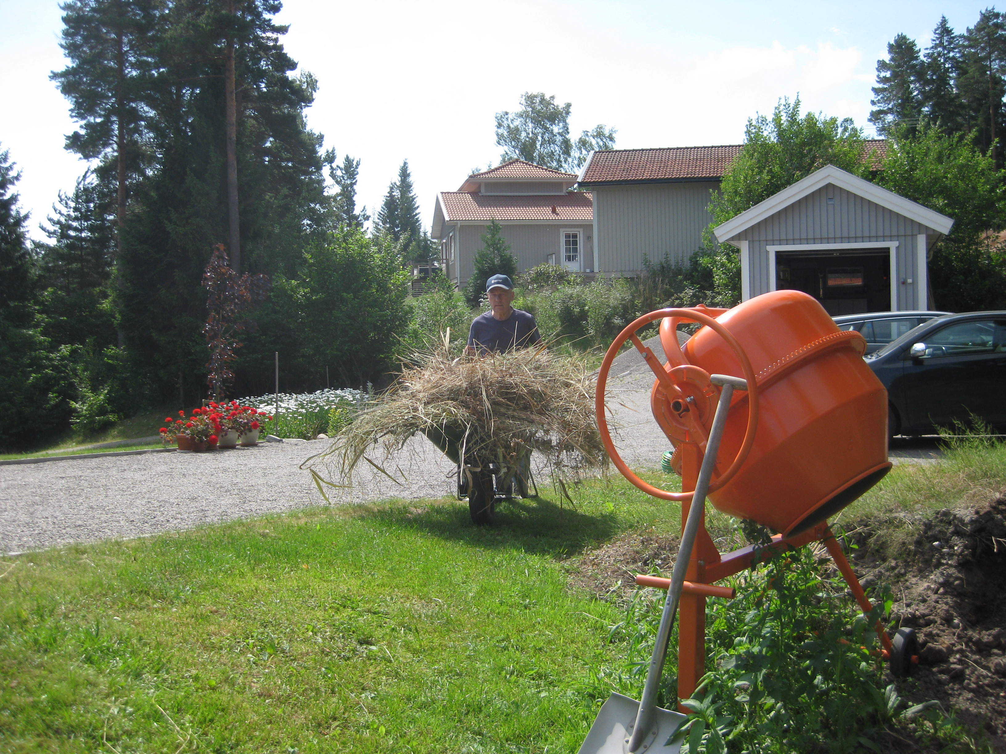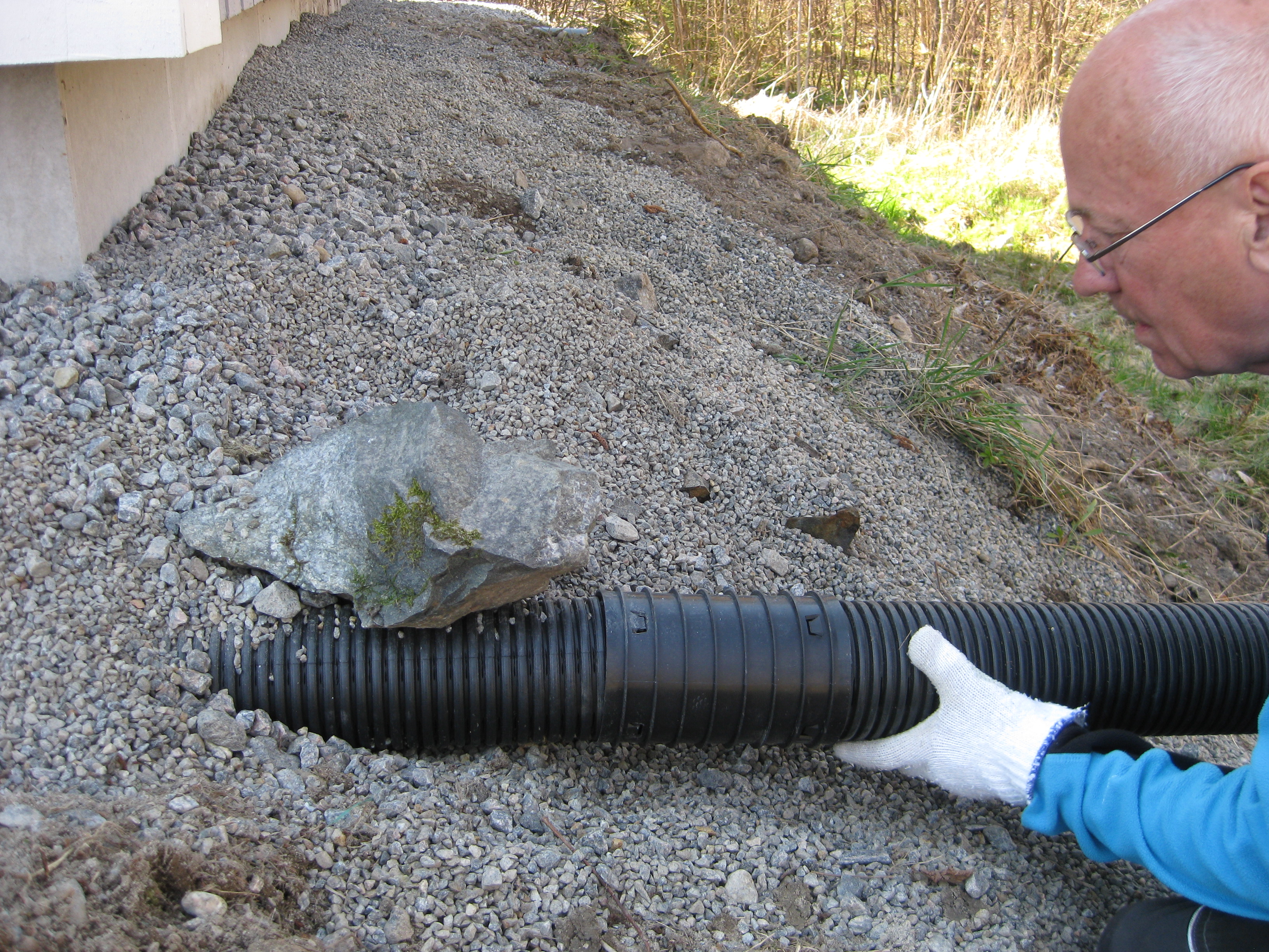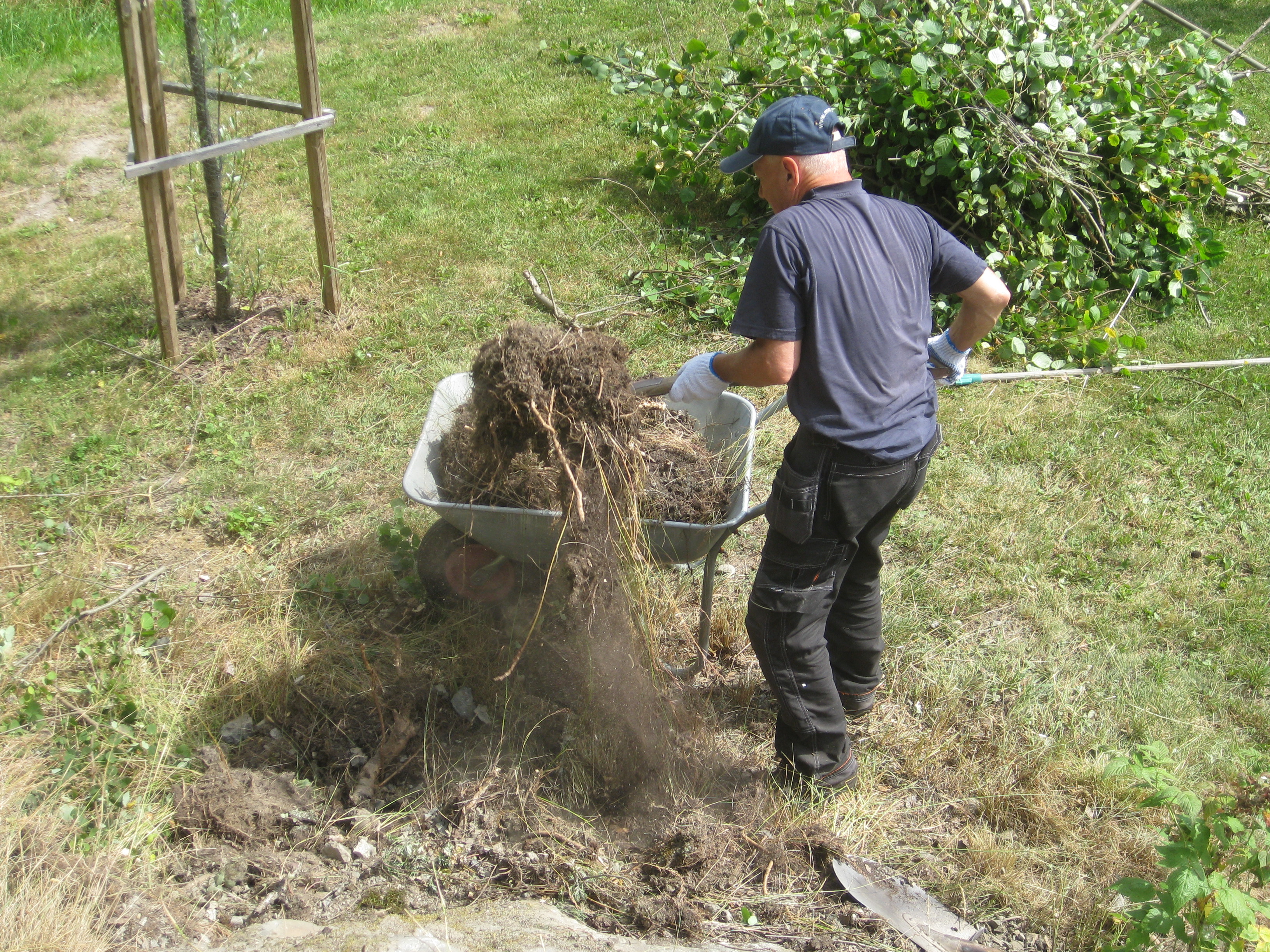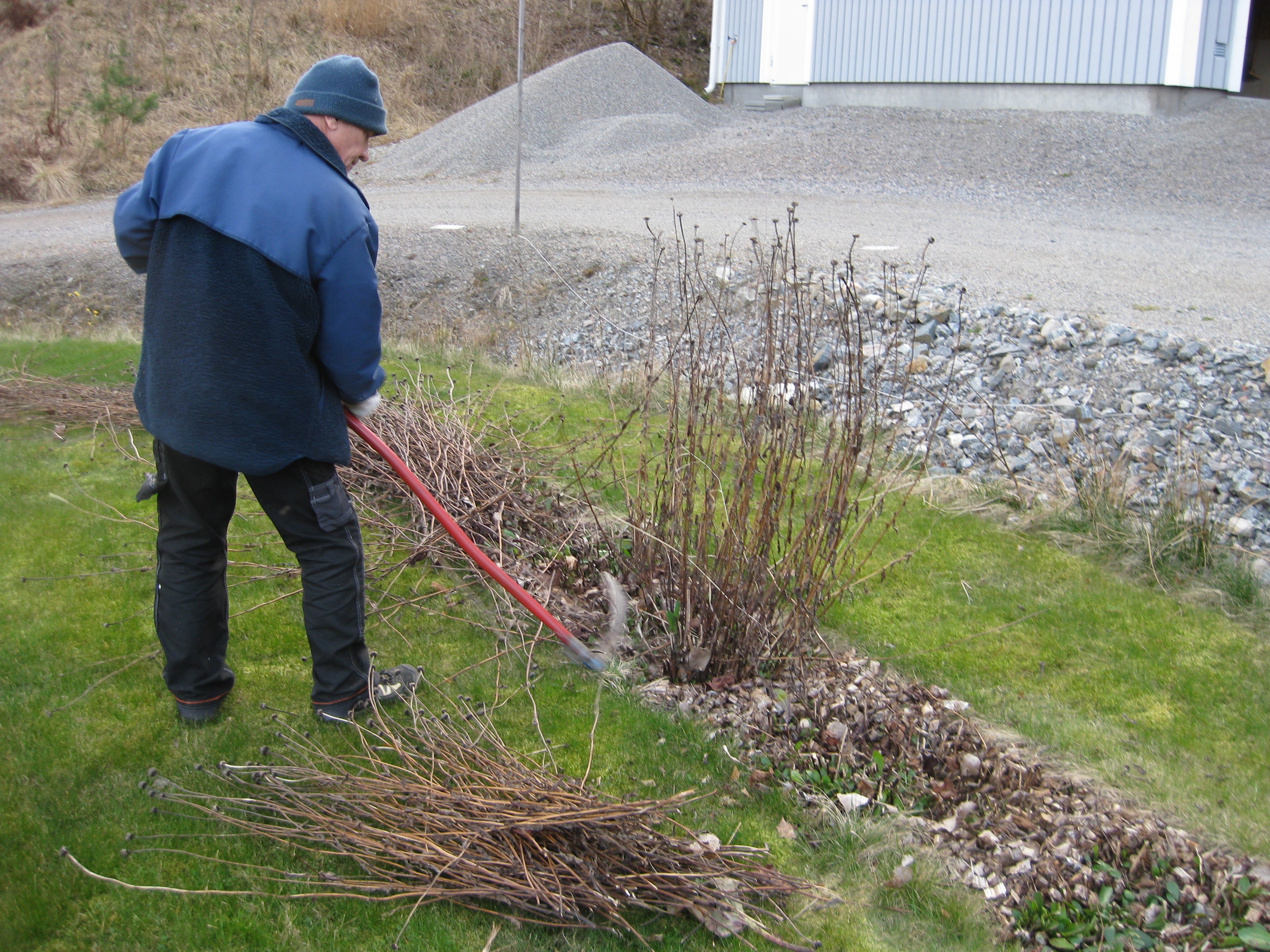 Håkan skarvar dräneringsrör, så att vi kan fylla på med lite material bakom norra garaget. Kompostarbete pågår, och det grävs potatisland. Håkan jämnar till och gör fint i slänten vid garaget, på västra sidan.