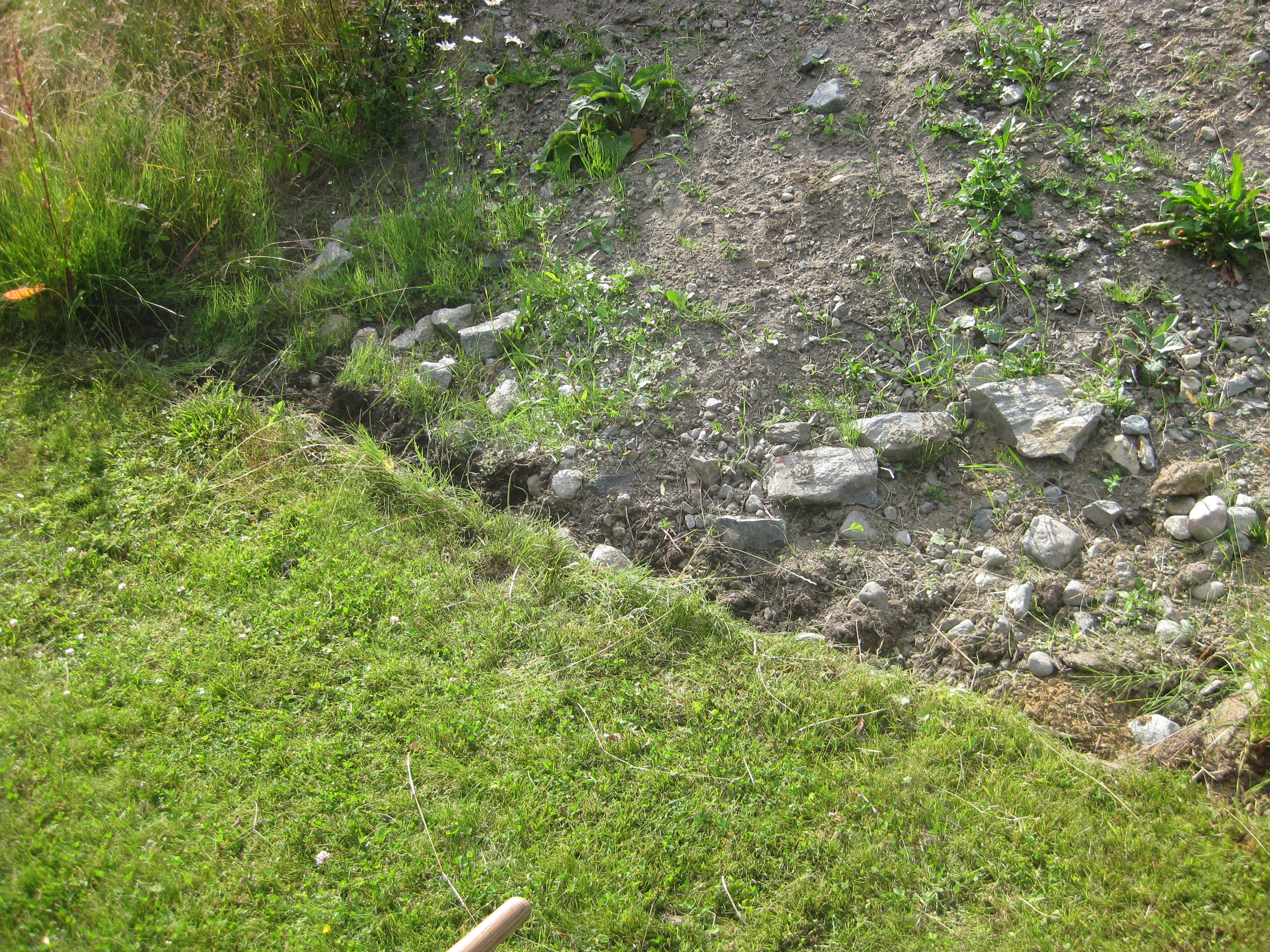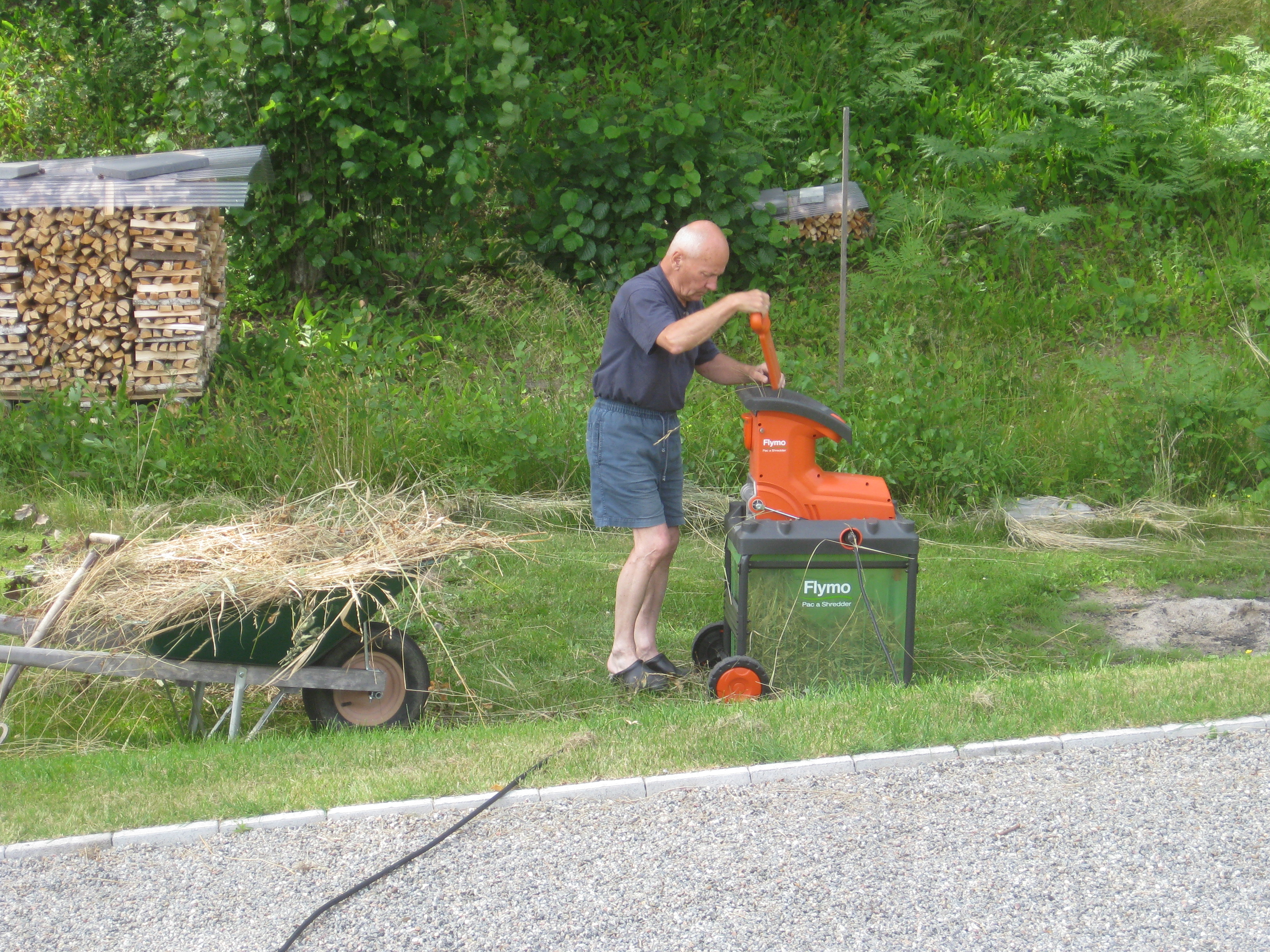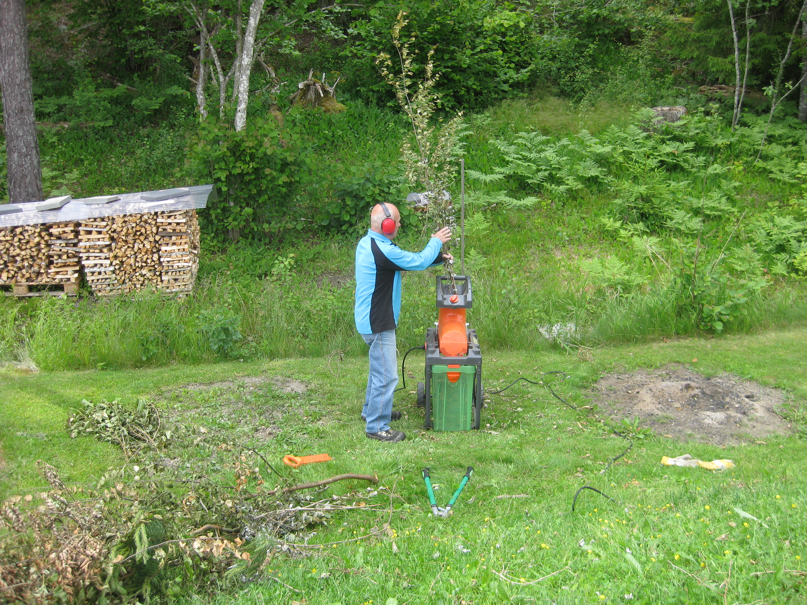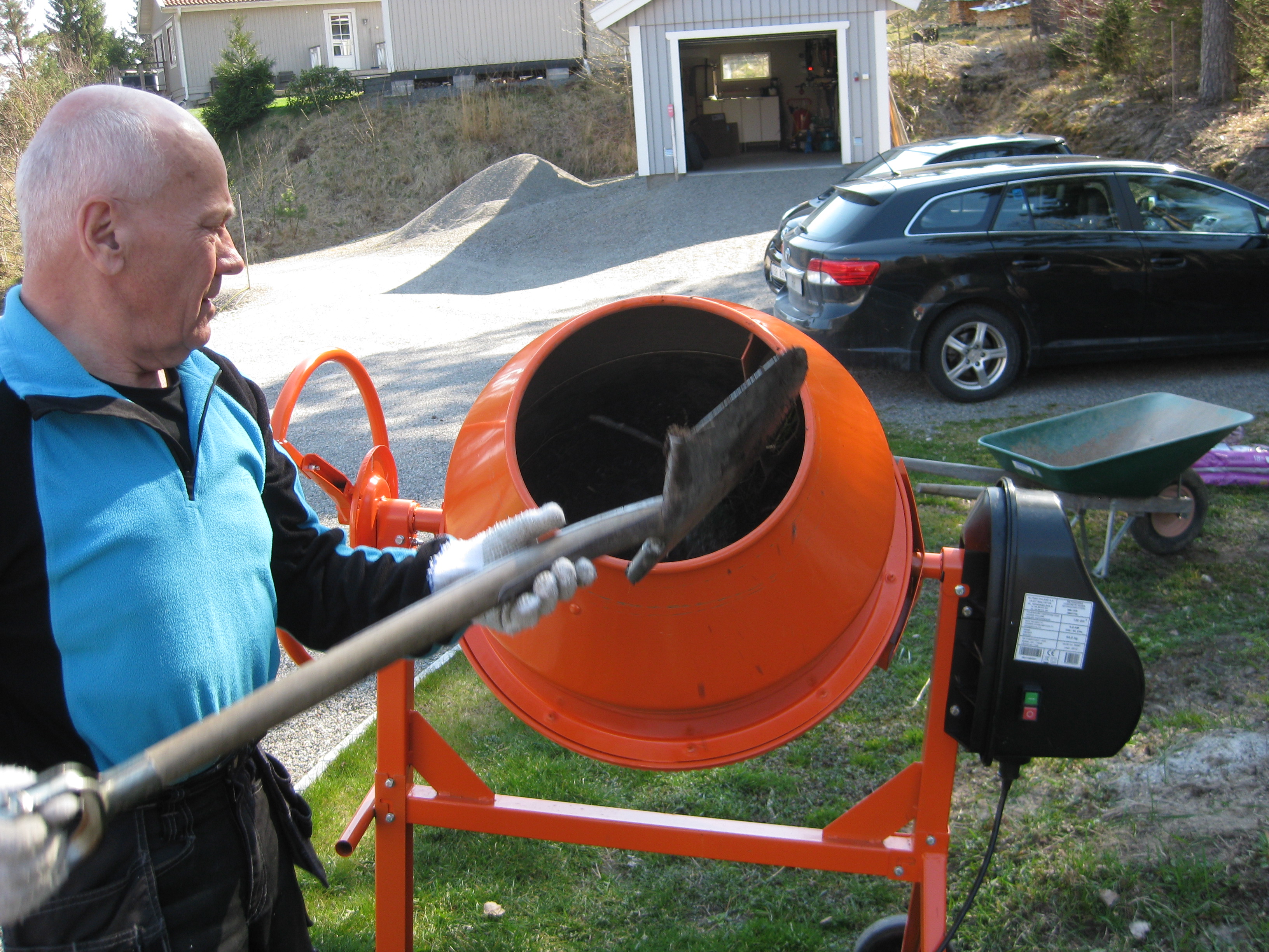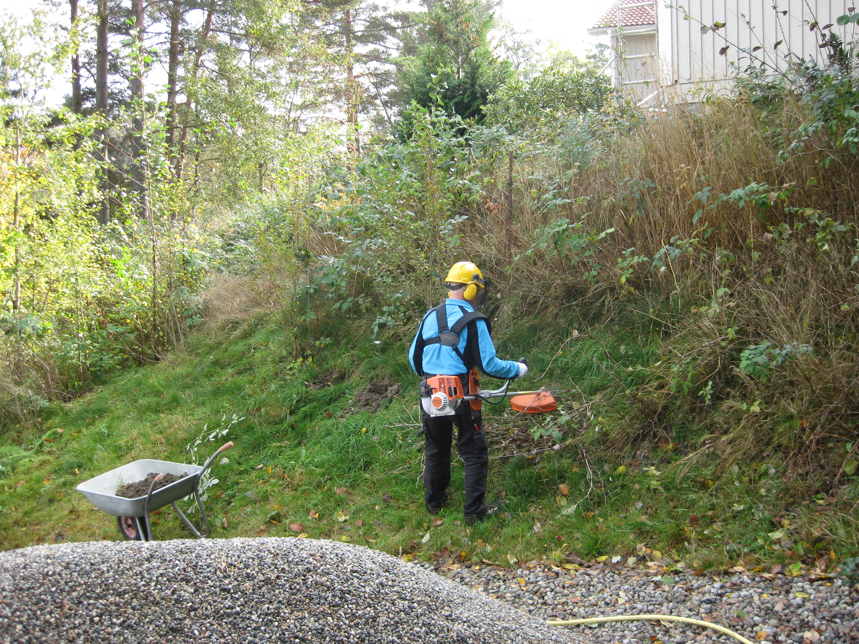 Håkan skarvar dräneringsrör, så att vi kan fylla på med lite material bakom norra garaget. Kompostarbete pågår, och det grävs potatisland. Håkan jämnar till och gör fint i slänten vid garaget, på västra sidan.