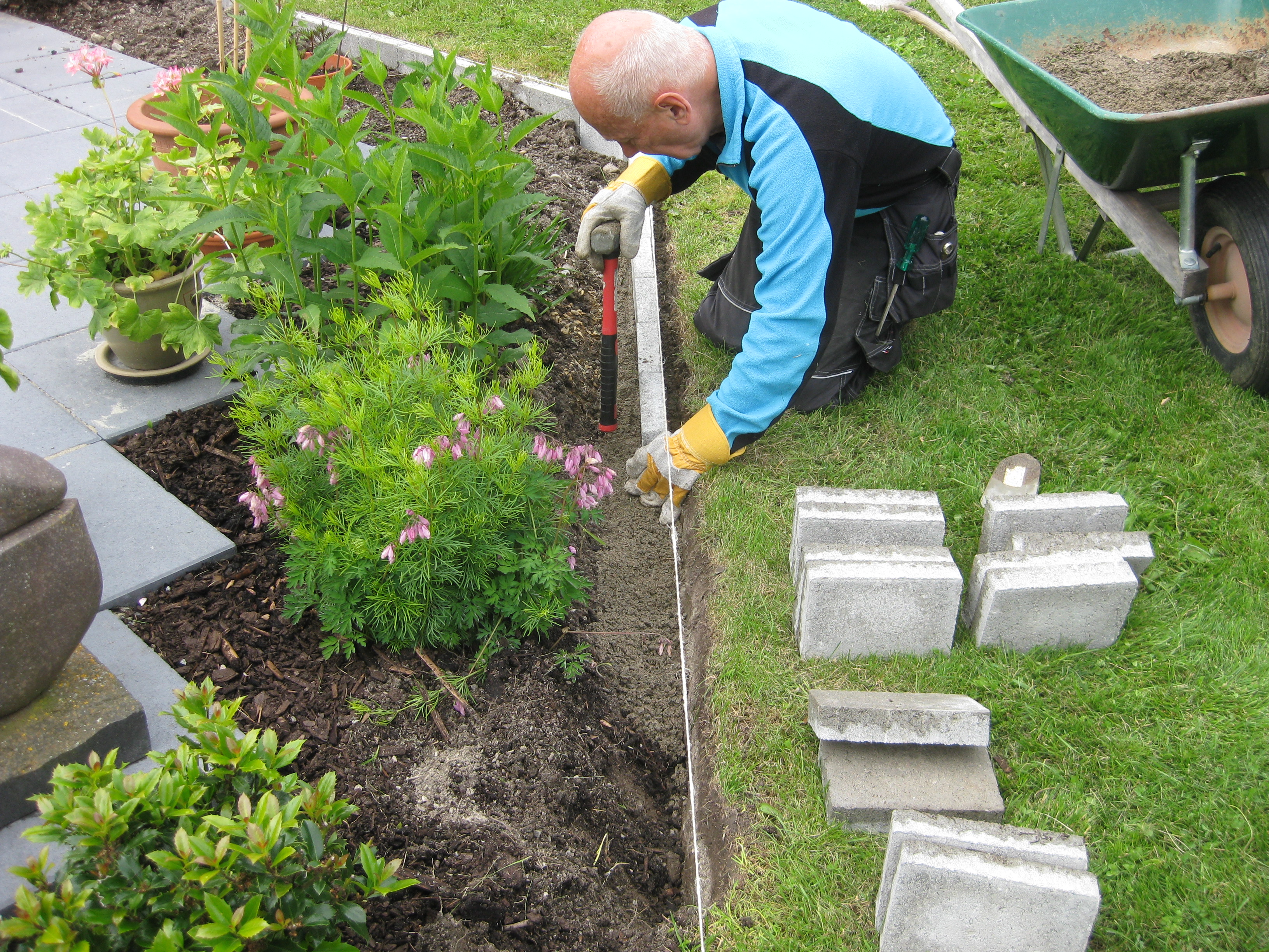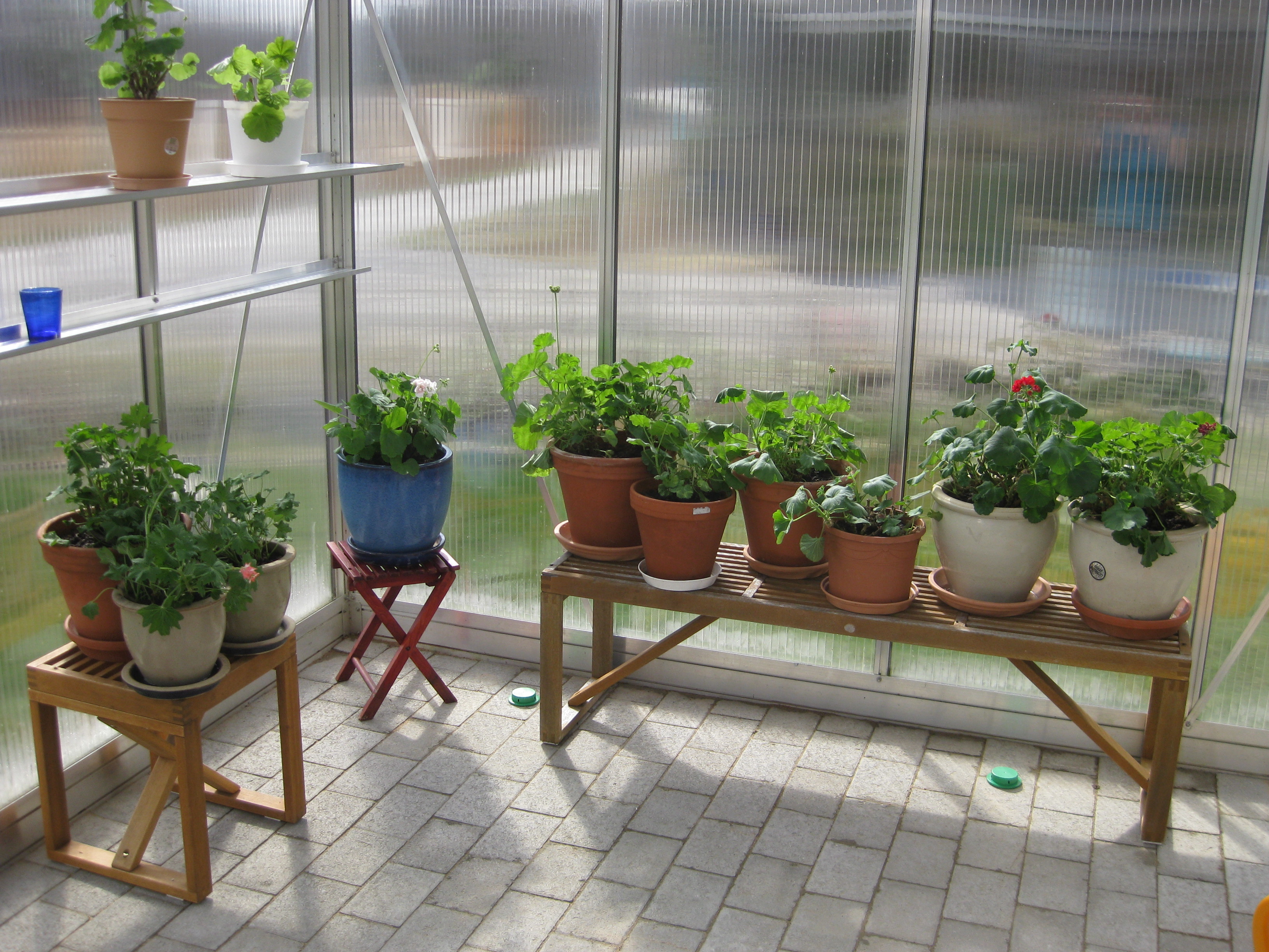 Omplantering av pelargonerna står på agendan. Parallellt pågår byggandet.