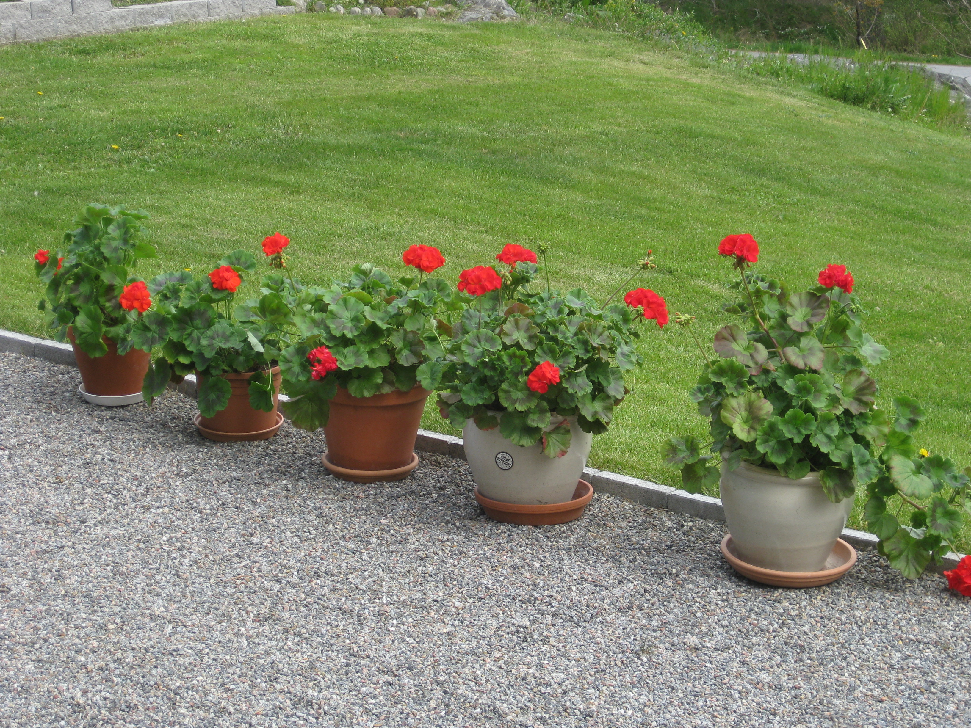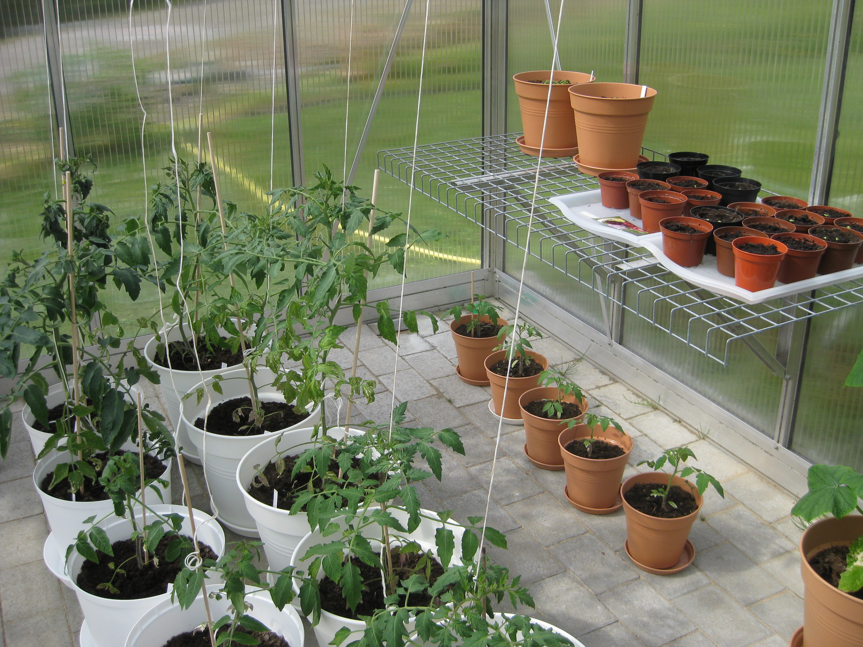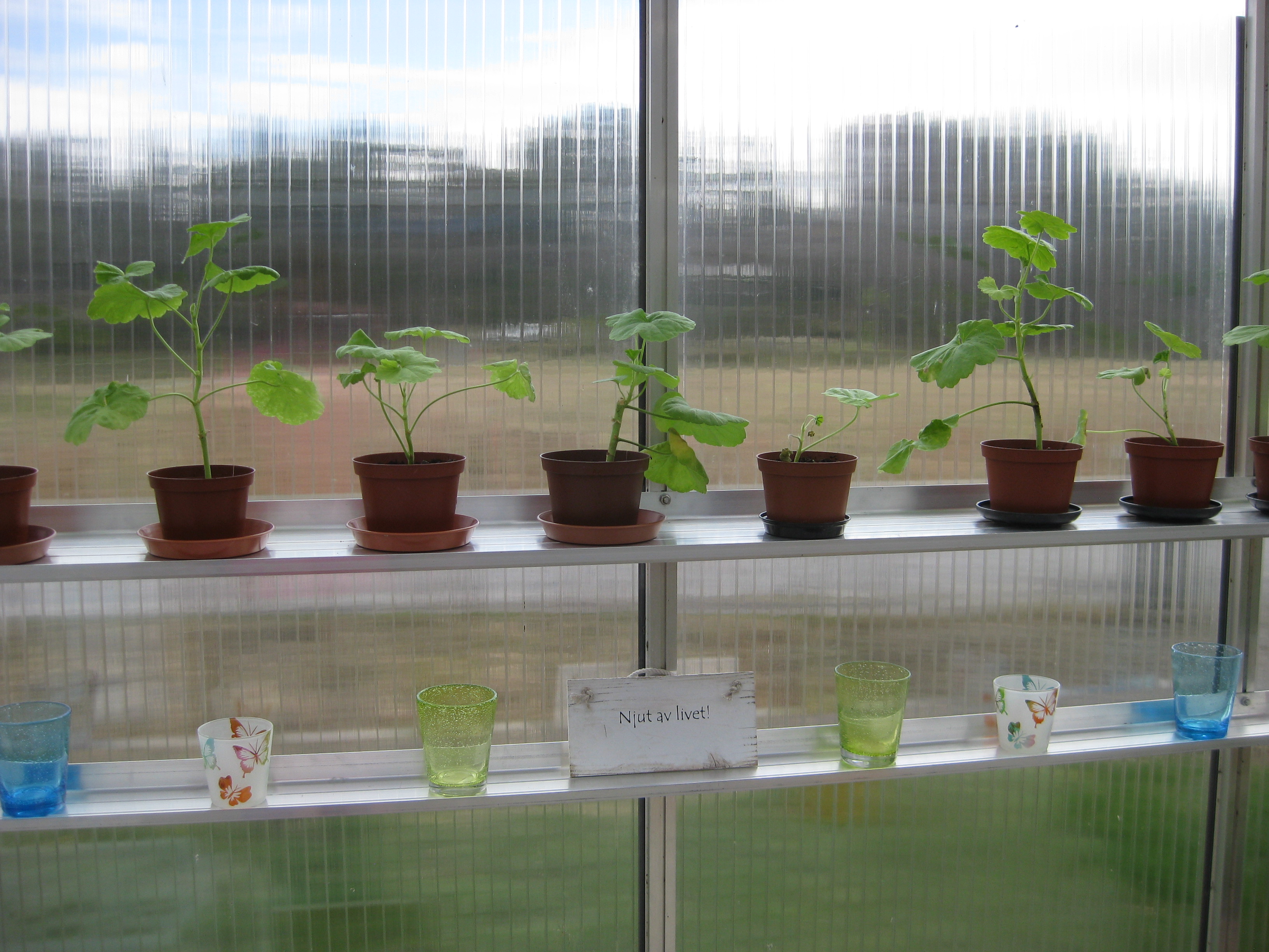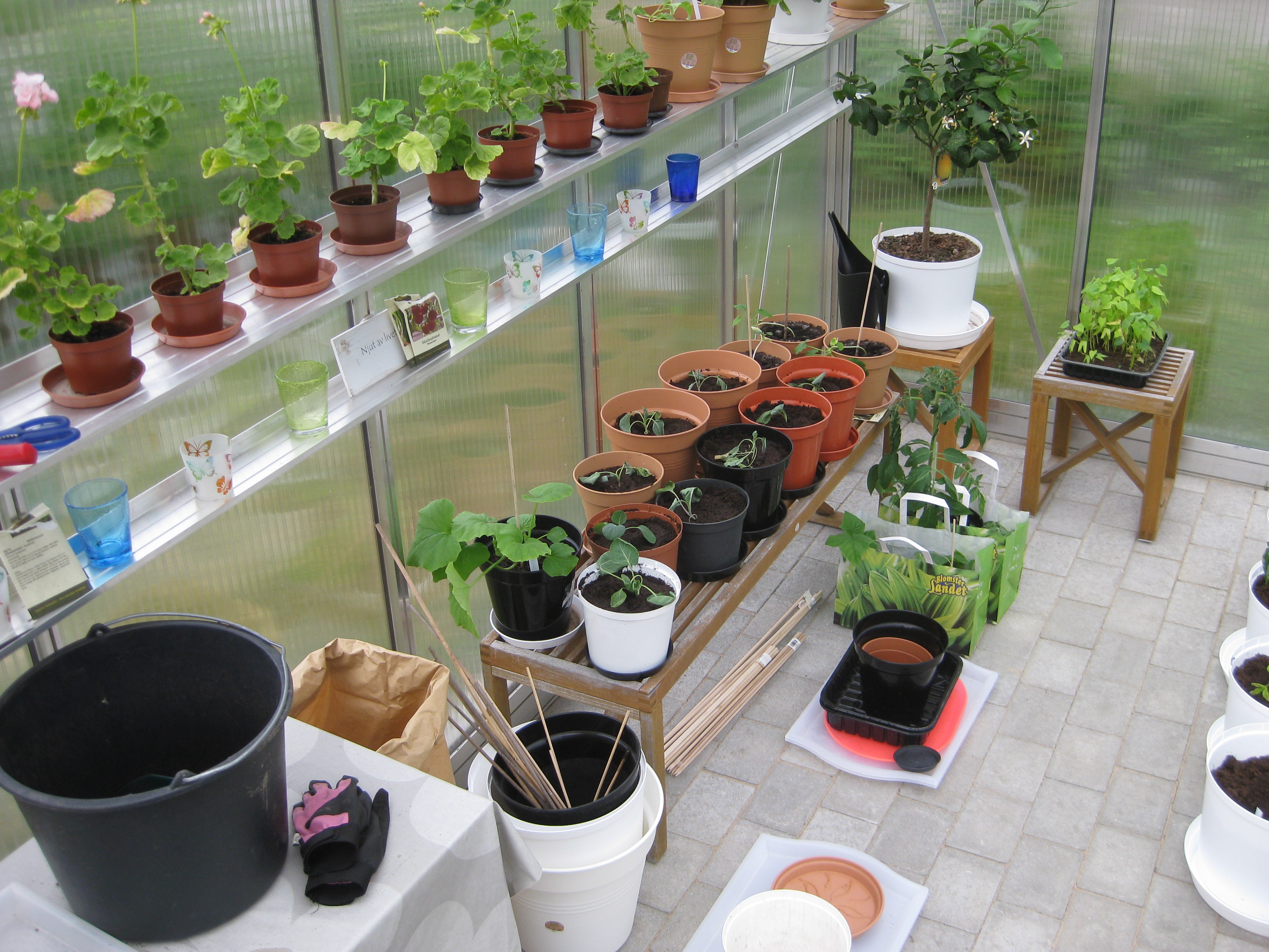 Vi flyttar ut alla pelargoner i växthuset. Håkan gödslar gräsmattan, Katarina planterar om gurkmeloner och sommarblommor som flyttas ut i garaget.