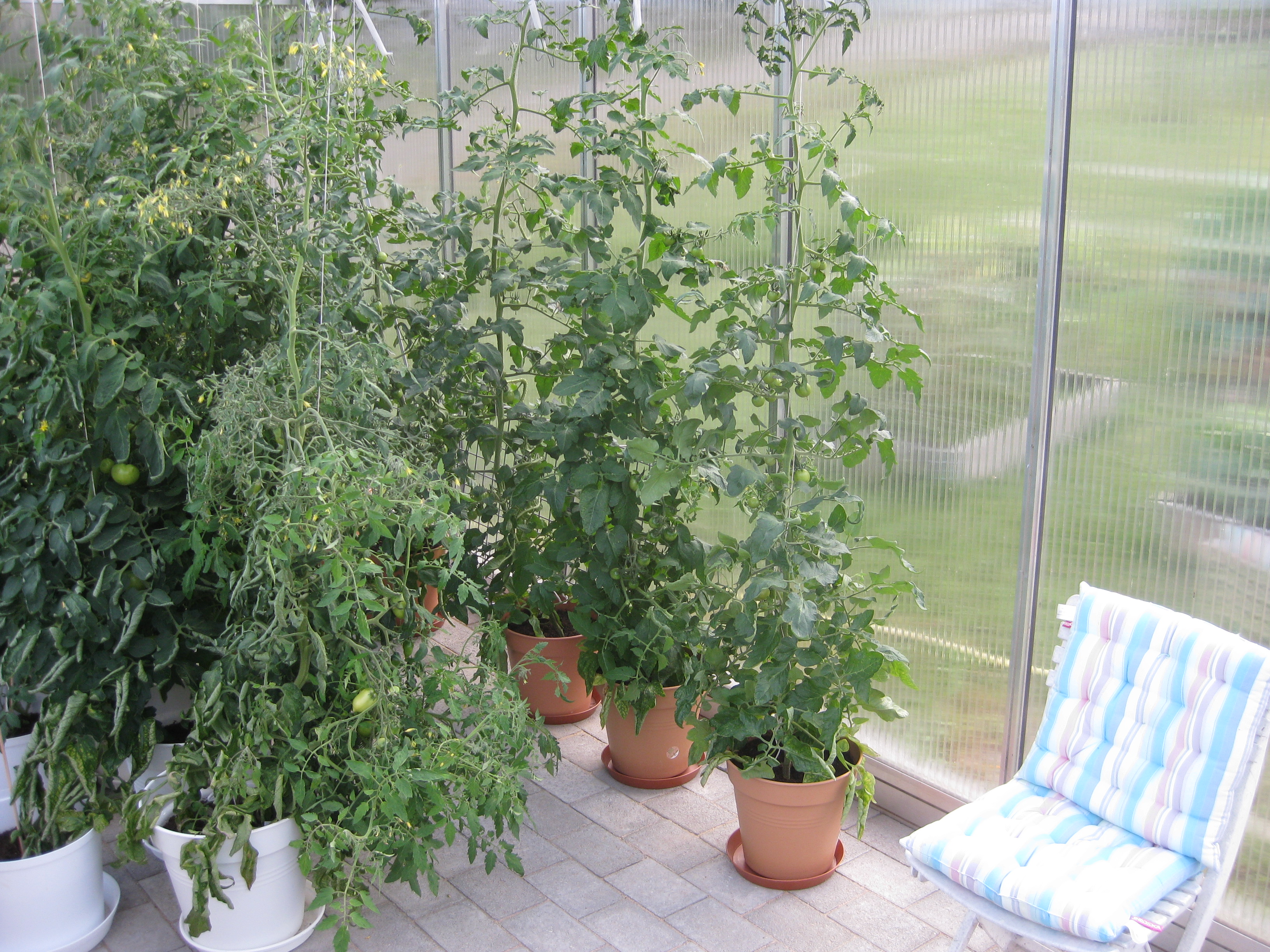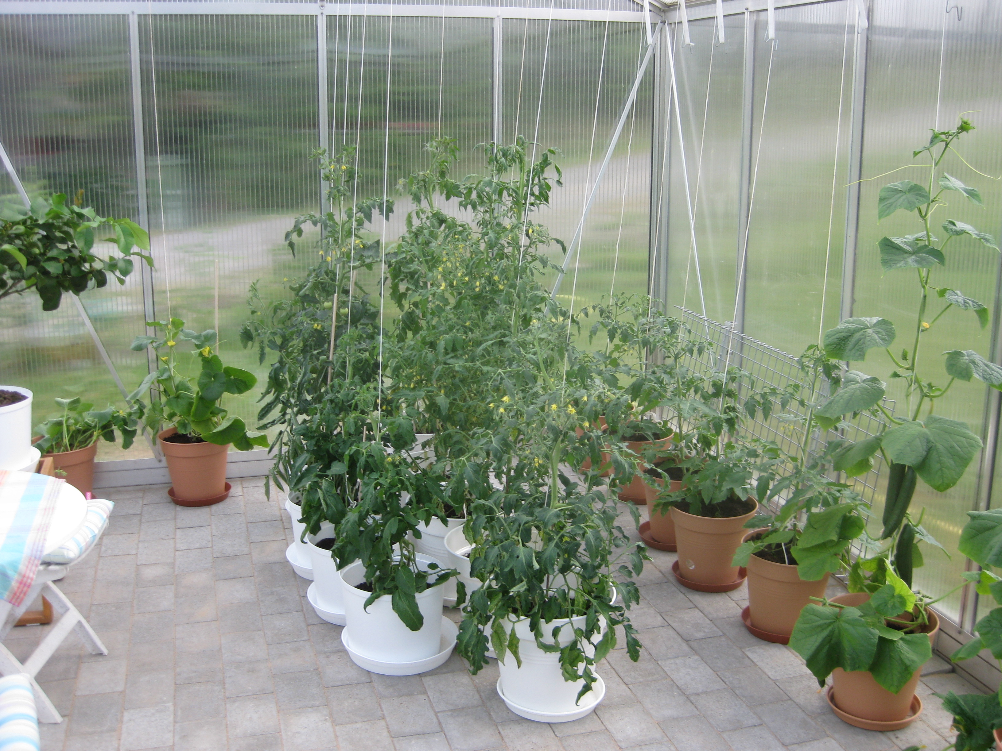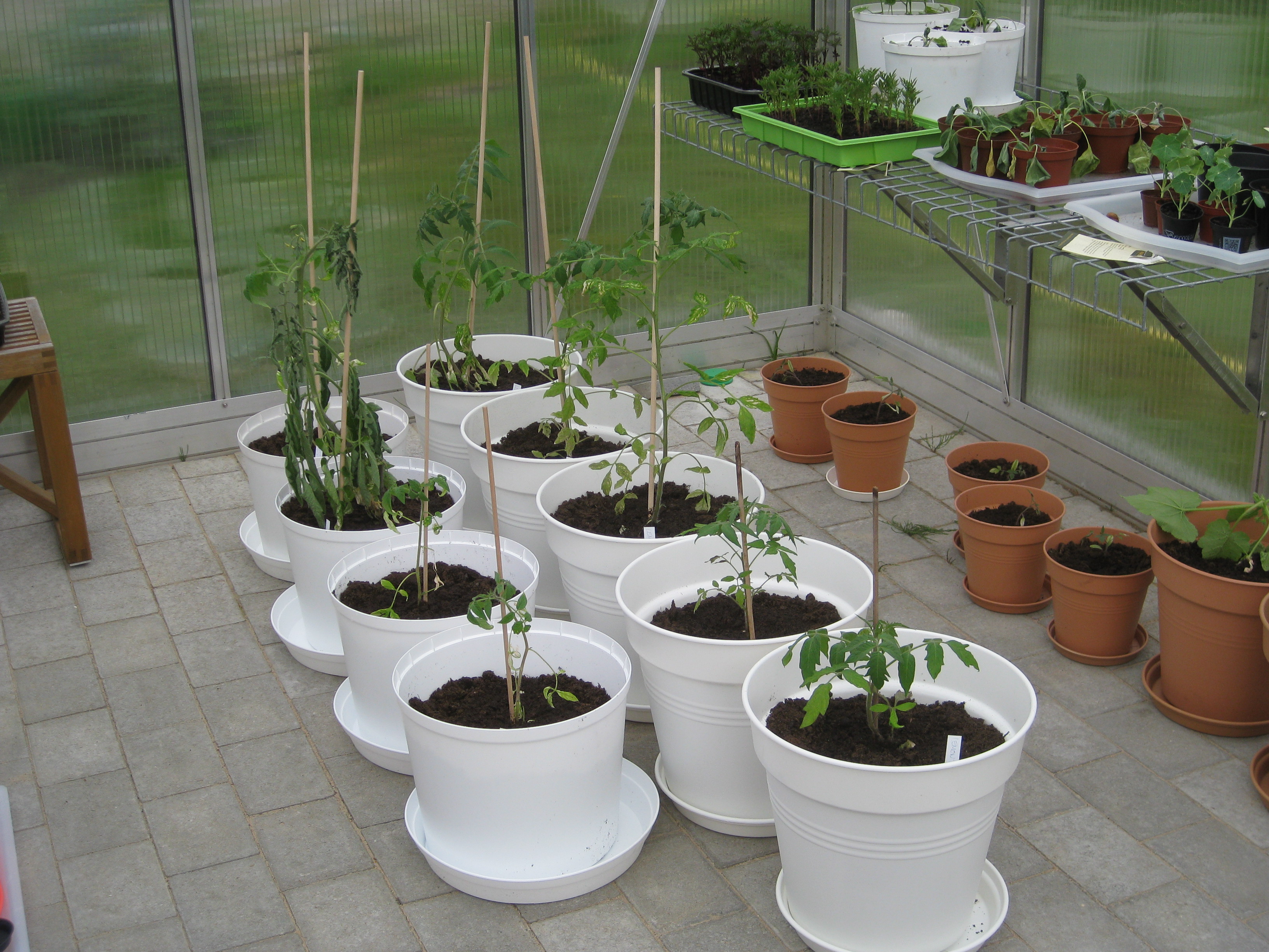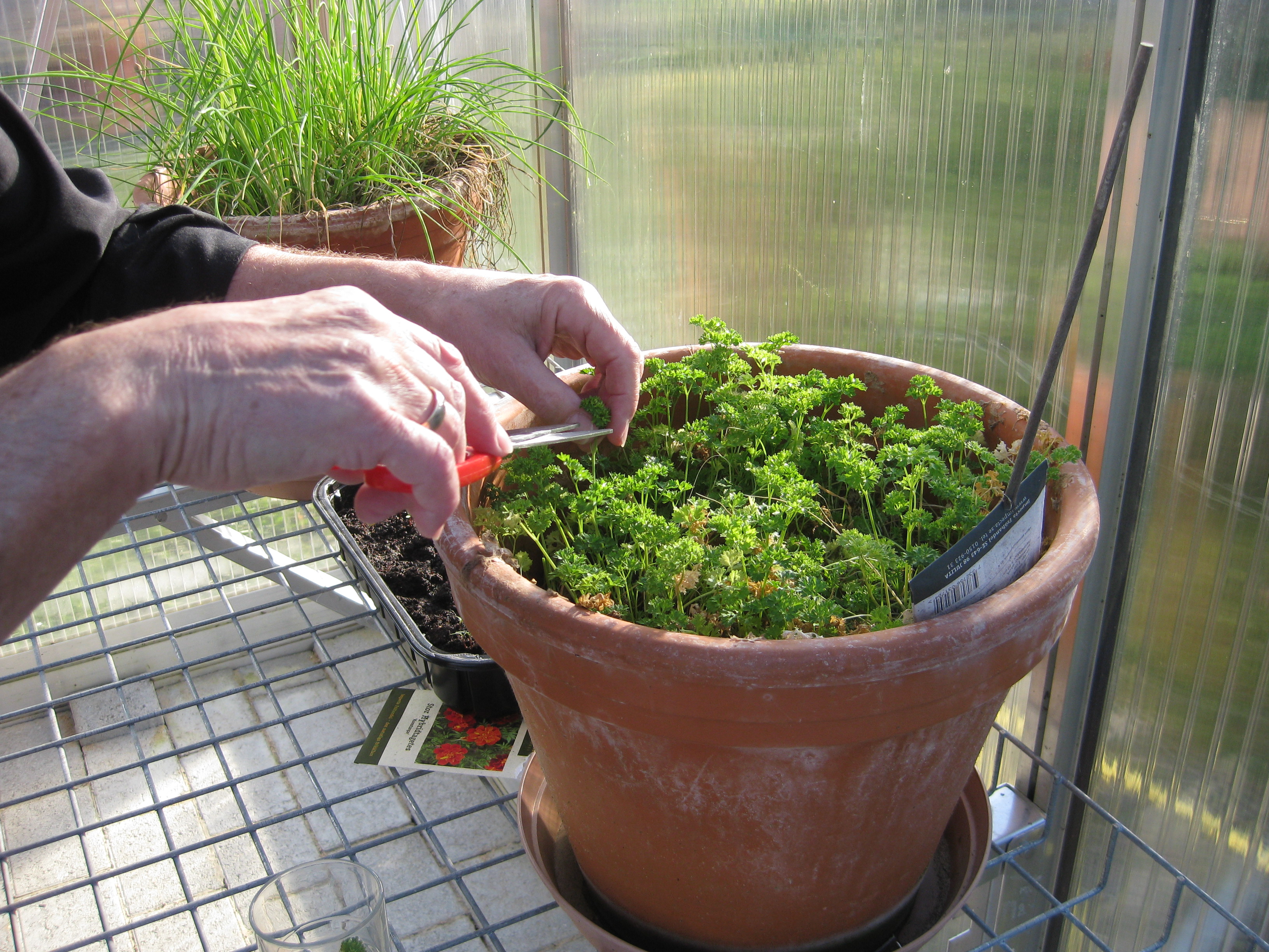 Vi flyttar ut alla pelargoner i växthuset. Håkan gödslar gräsmattan, Katarina planterar om gurkmeloner och sommarblommor som flyttas ut i garaget.