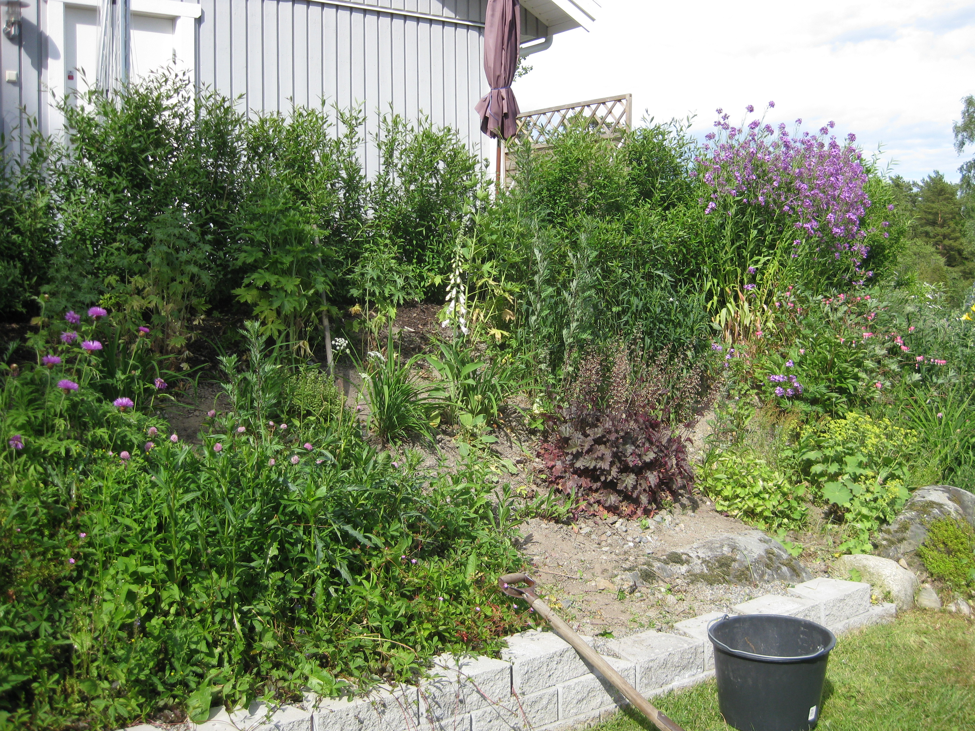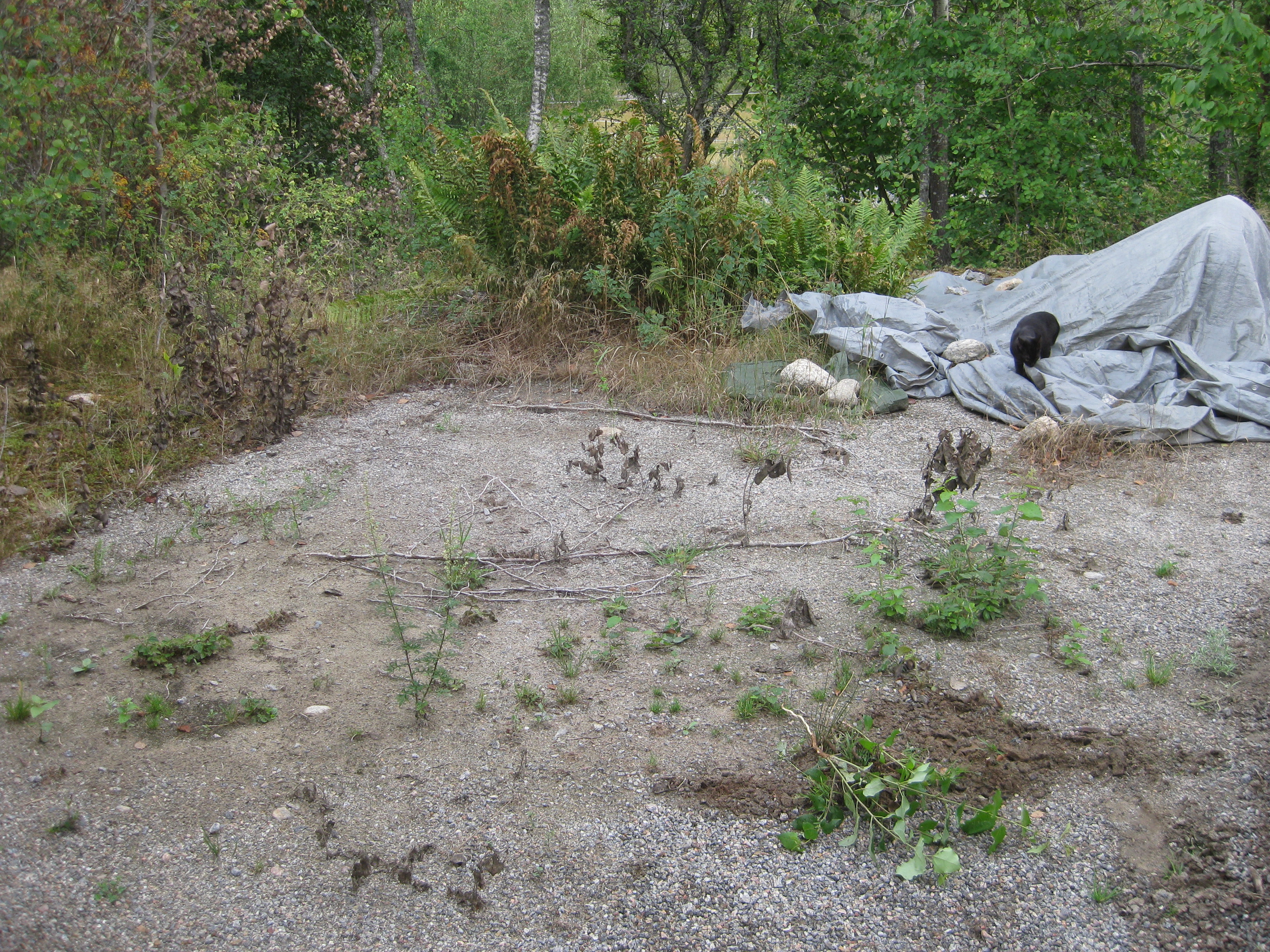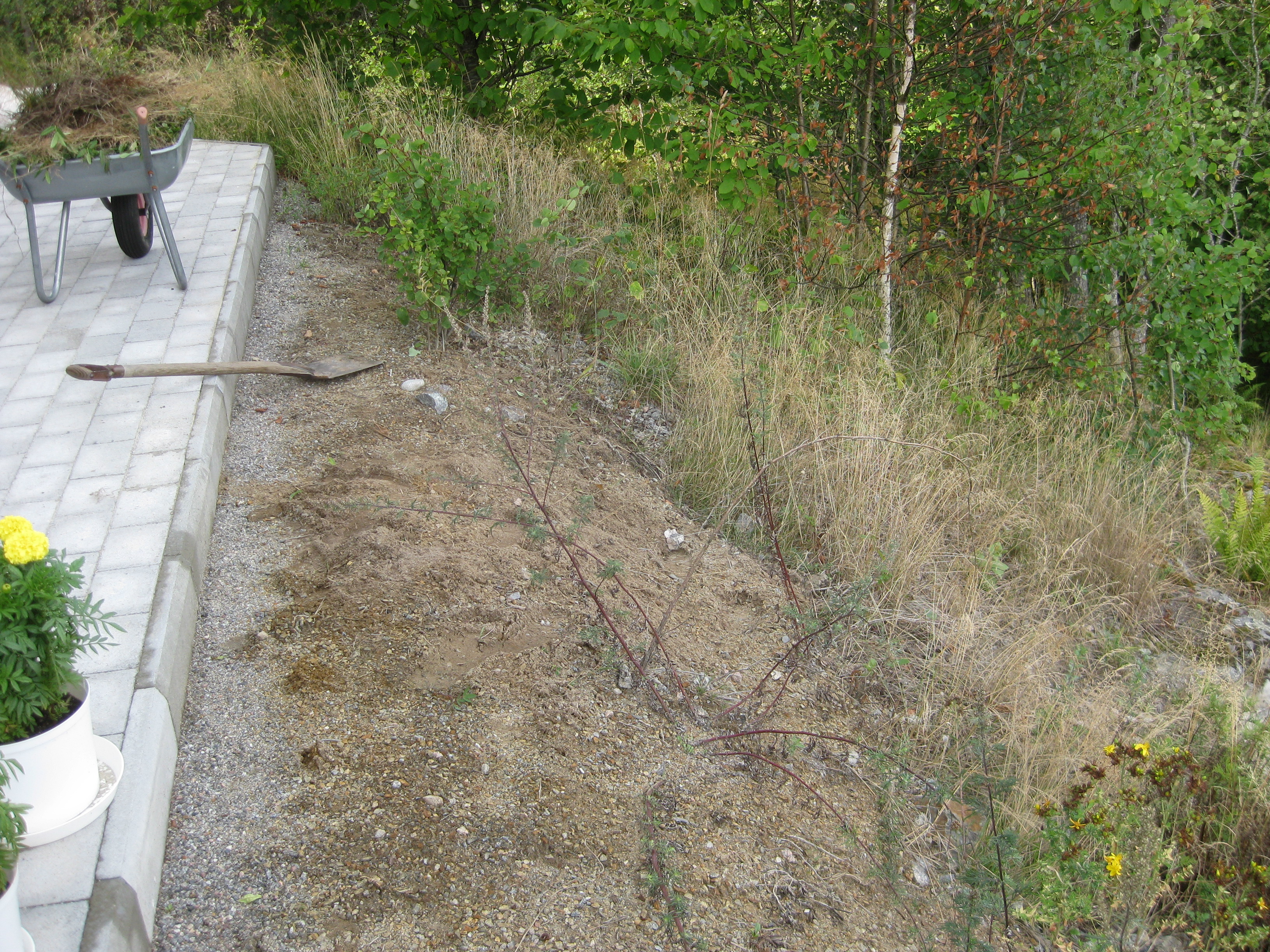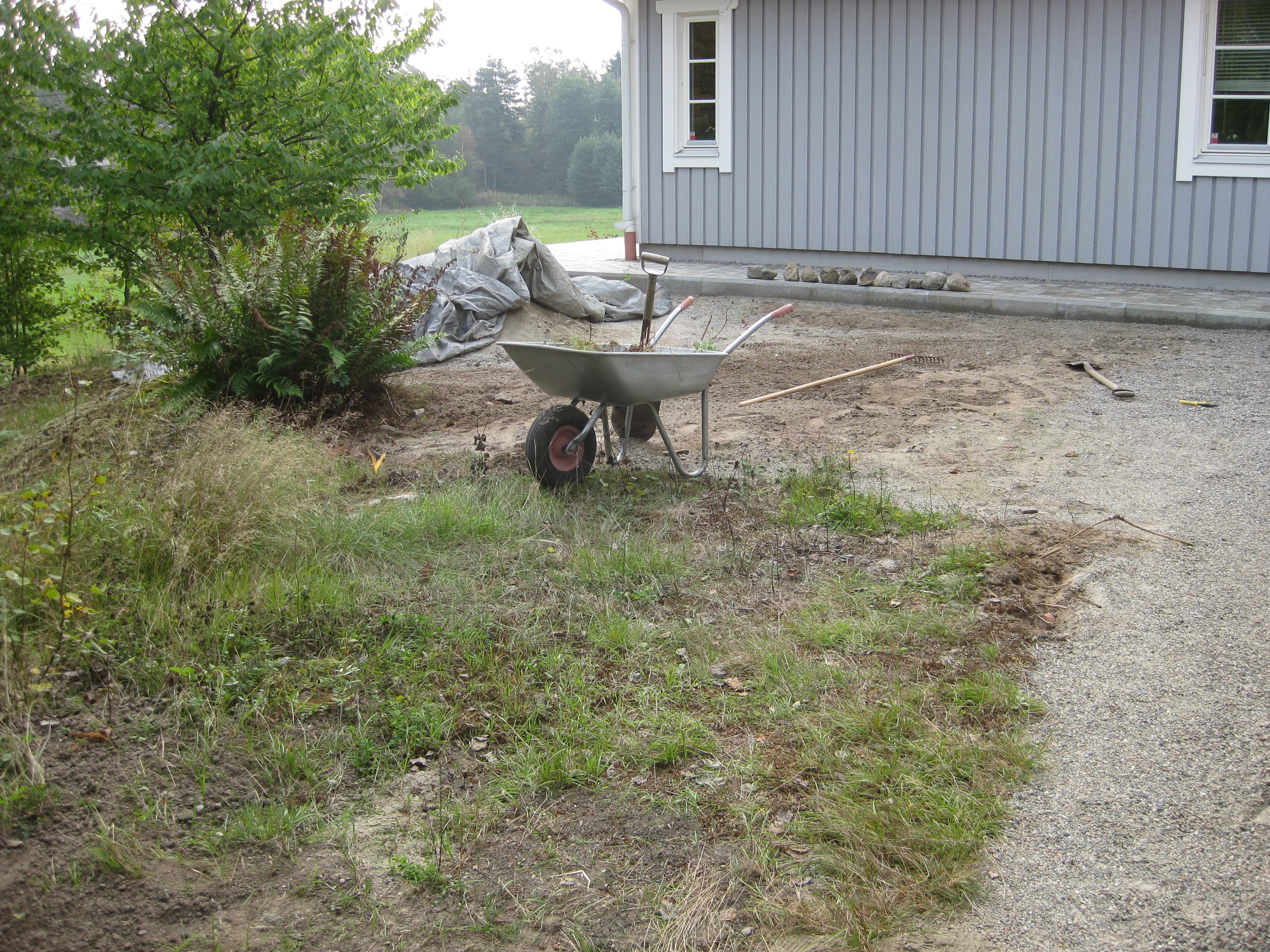 Nästa omöjliga projekt på agendan: städa upp på baksidan. Det betyder gräva bort ogräs, snygga till, kratta och jämna med grus. Det går ju bra detta! Vi hinner med en liten snabb-rensning i rabatten också – inte så komplicerat eftersom det mesta där just nu verkar vara ogräs….