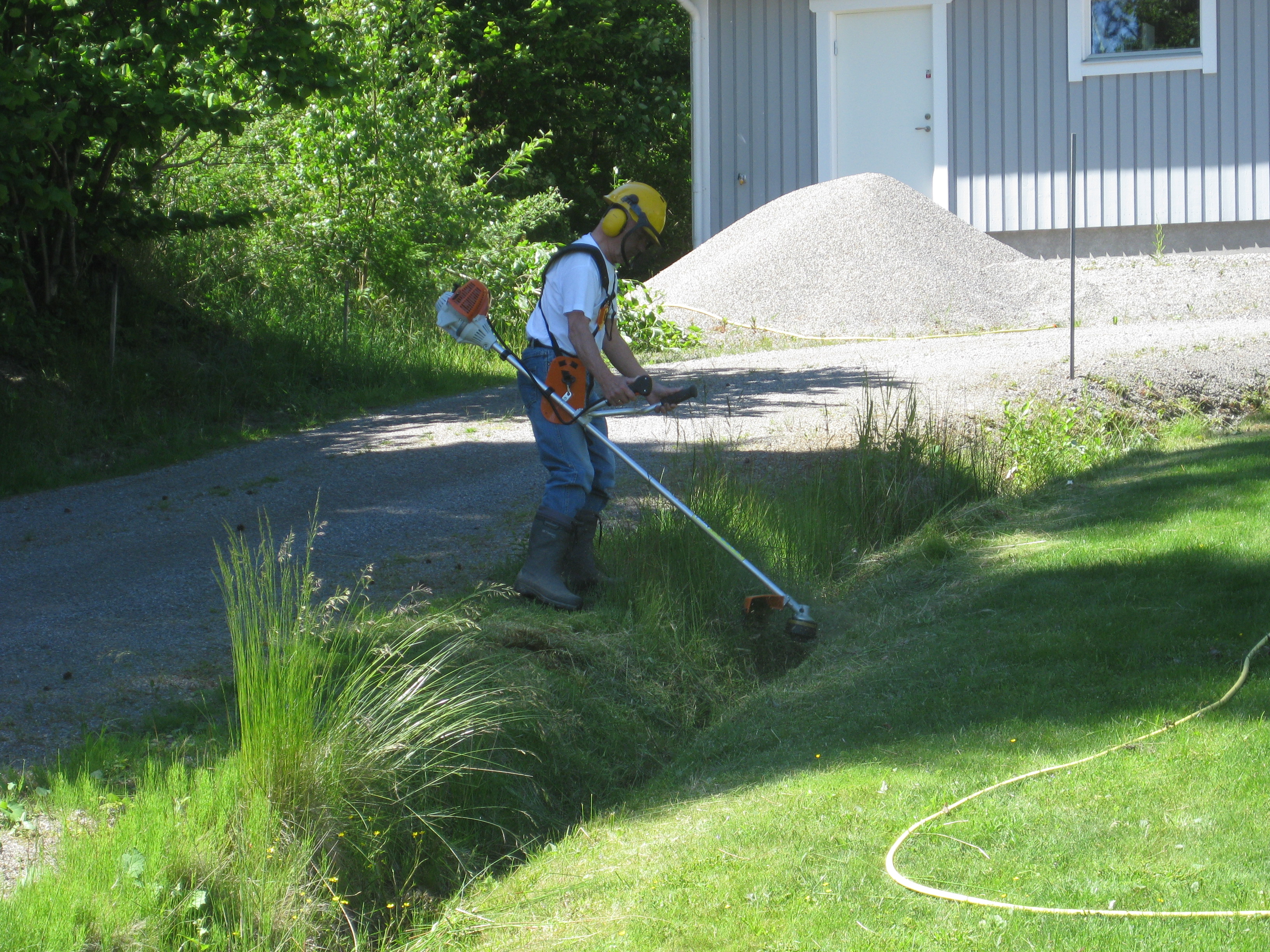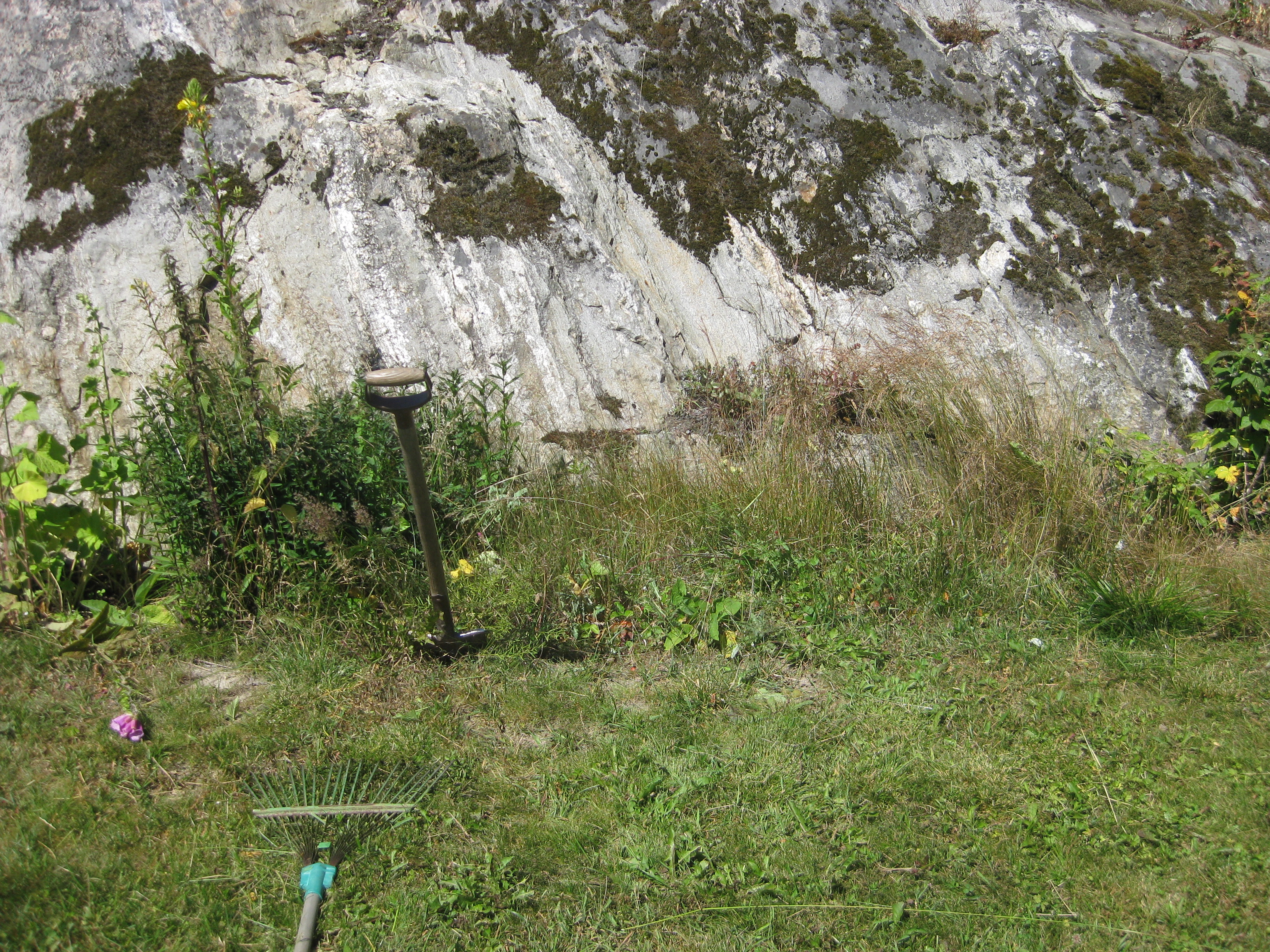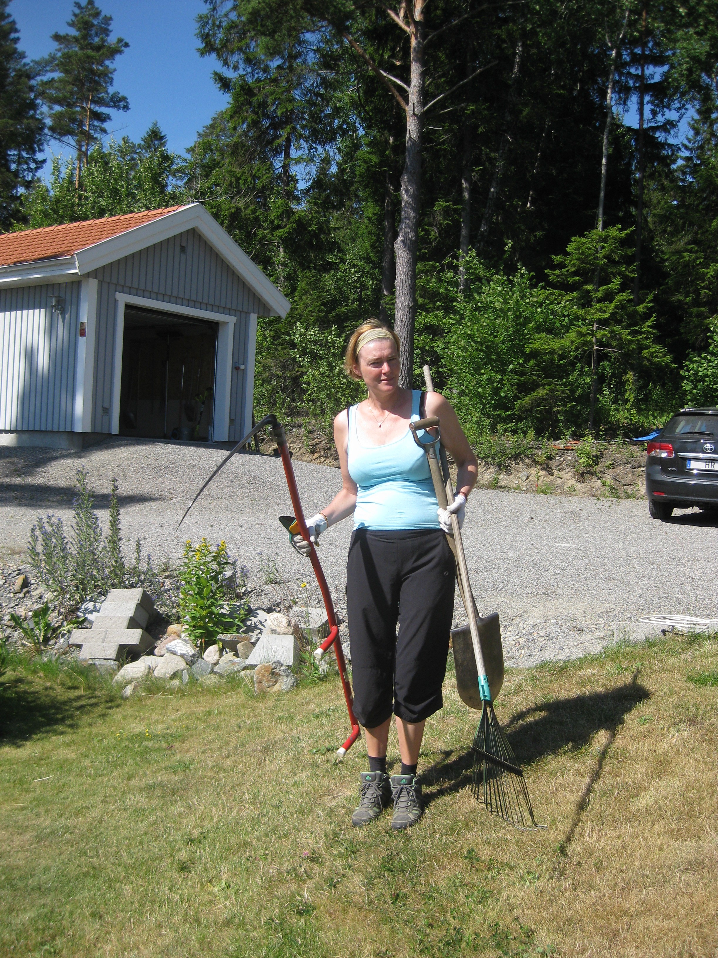 Nästa omöjliga projekt på agendan: städa upp på baksidan. Det betyder gräva bort ogräs, snygga till, kratta och jämna med grus. Det går ju bra detta! Vi hinner med en liten snabb-rensning i rabatten också – inte så komplicerat eftersom det mesta där just nu verkar vara ogräs….