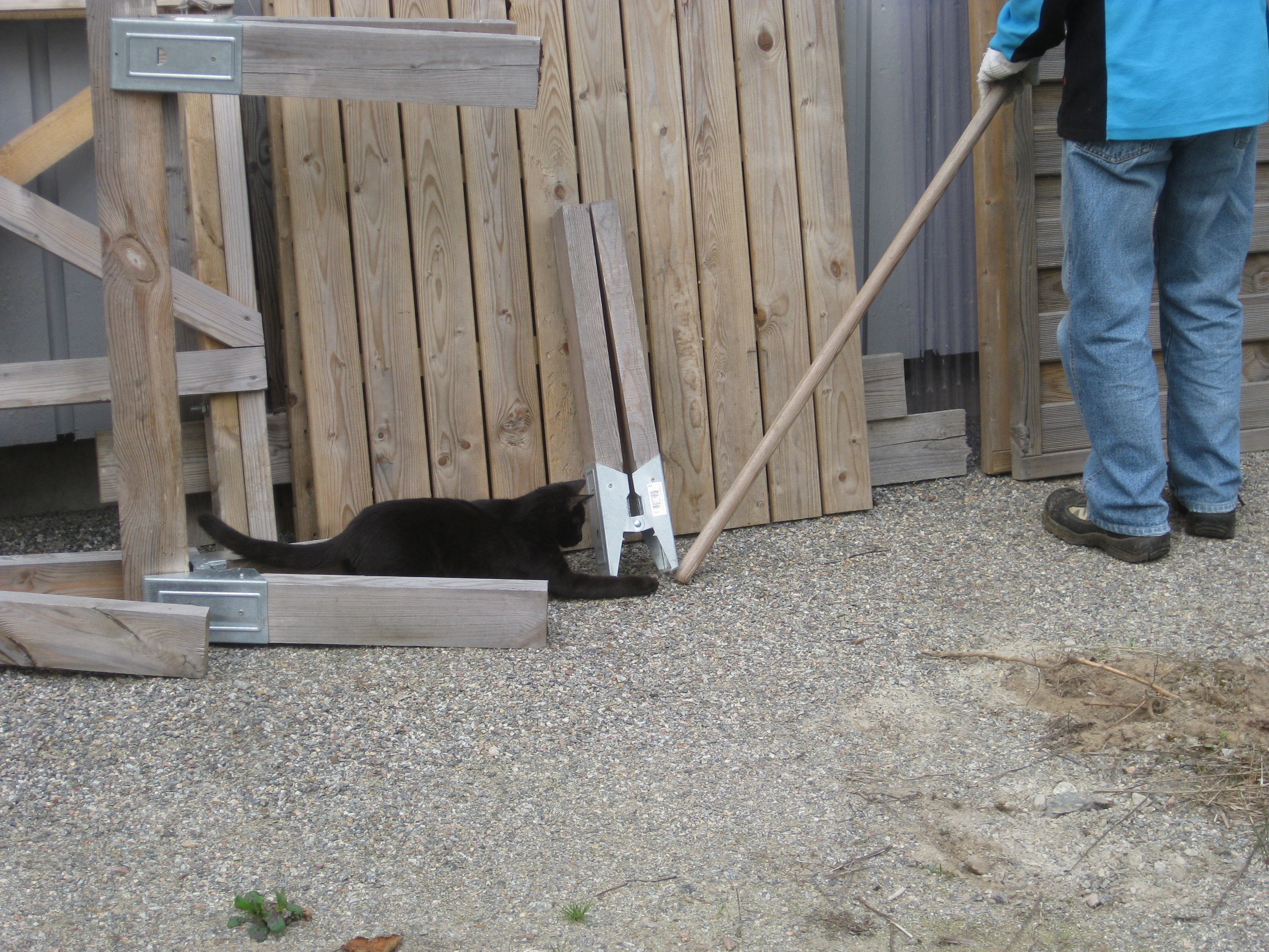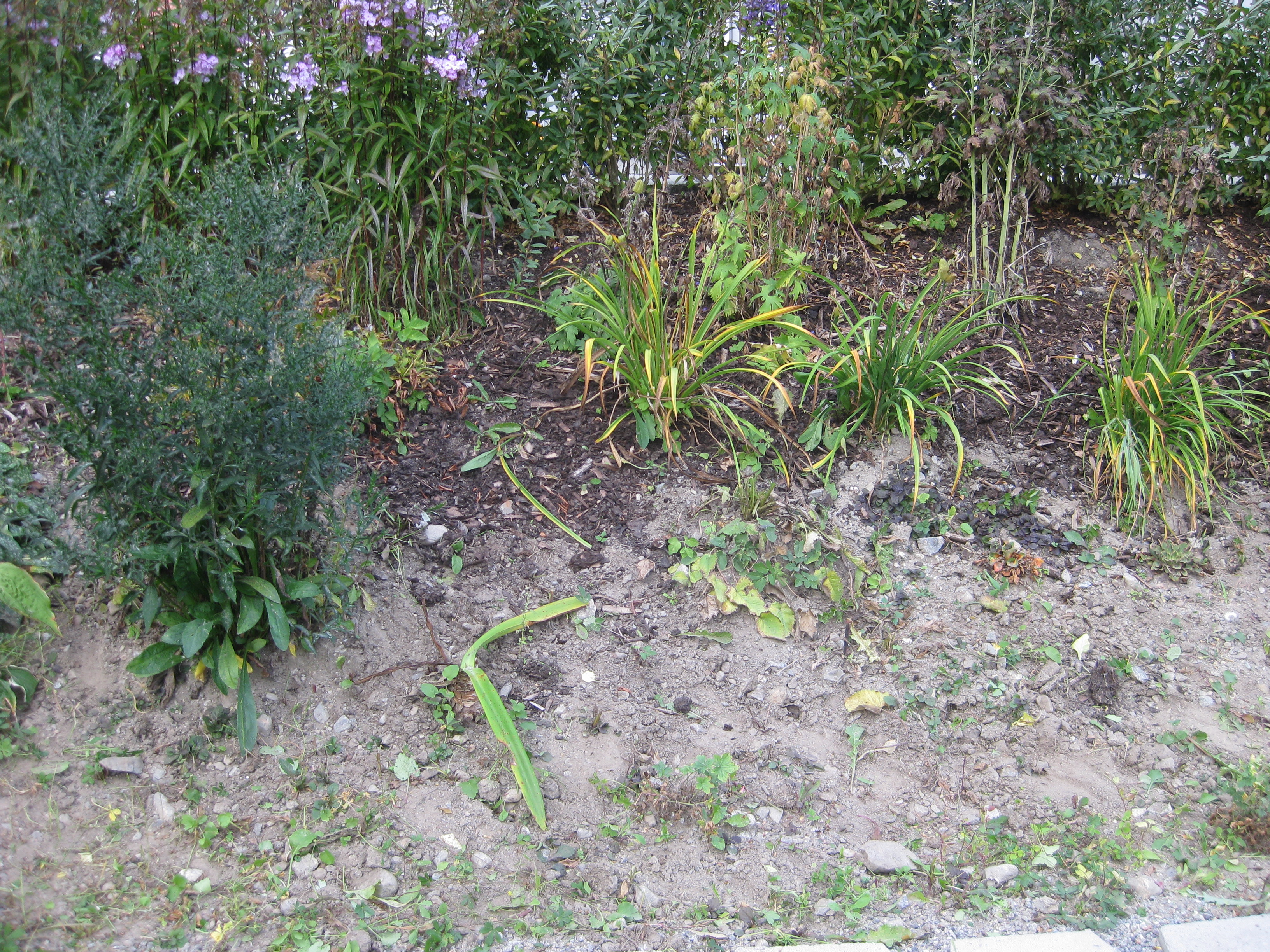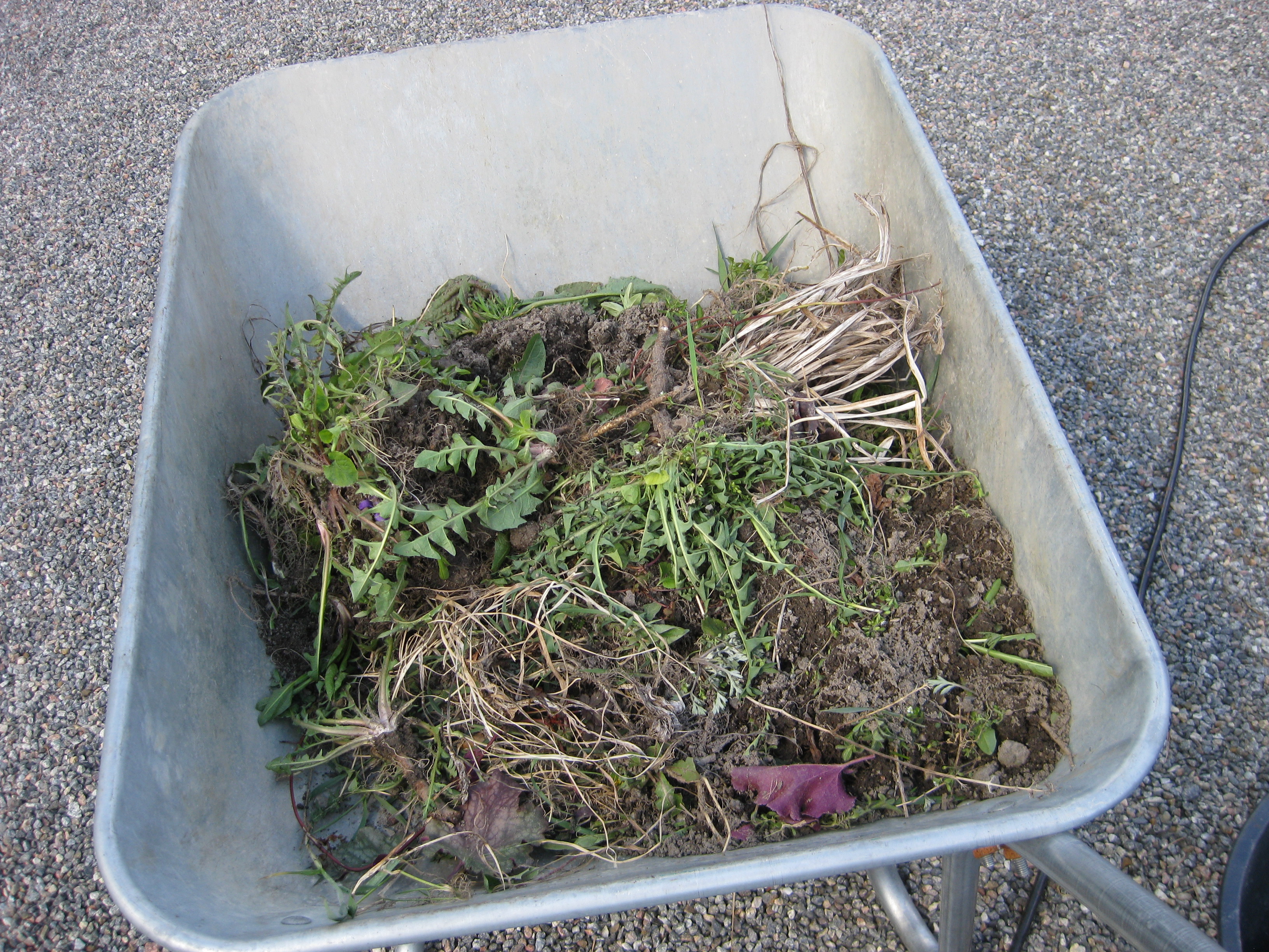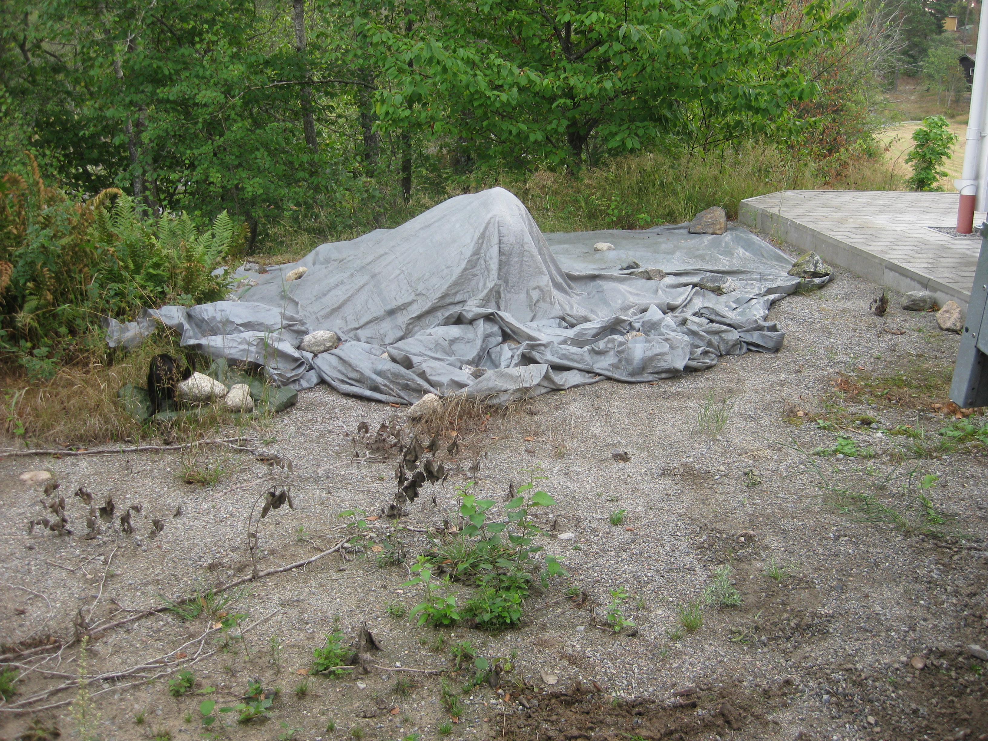 Nästa omöjliga projekt på agendan: städa upp på baksidan. Det betyder gräva bort ogräs, snygga till, kratta och jämna med grus. Det går ju bra detta! Vi hinner med en liten snabb-rensning i rabatten också – inte så komplicerat eftersom det mesta där just nu verkar vara ogräs….