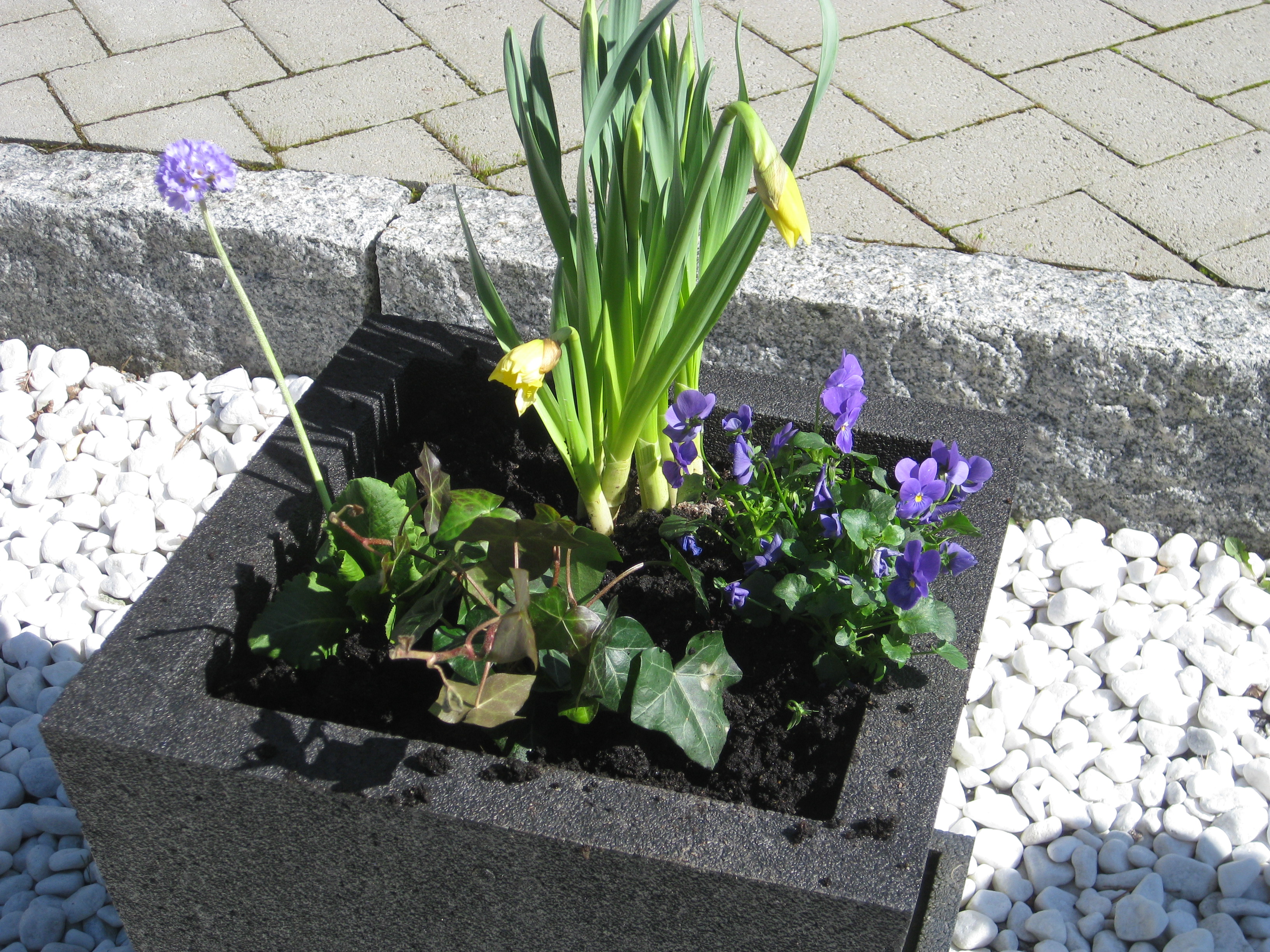 Vi gör vårfint i uteblomkrukorna inför stundande påskhelg, och avrundar dagen med fika i växthuset.
