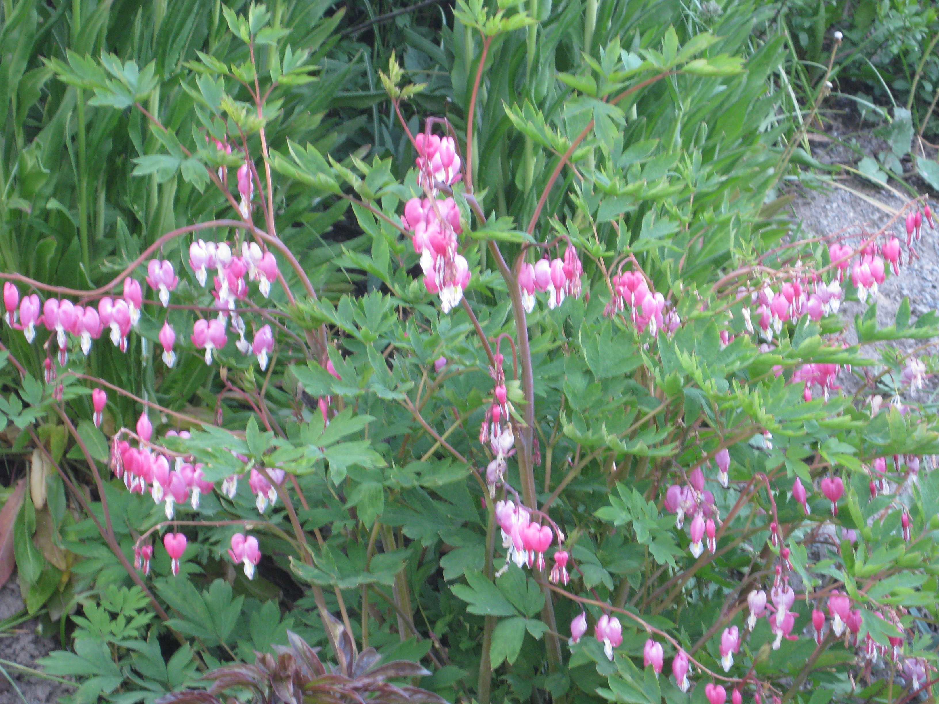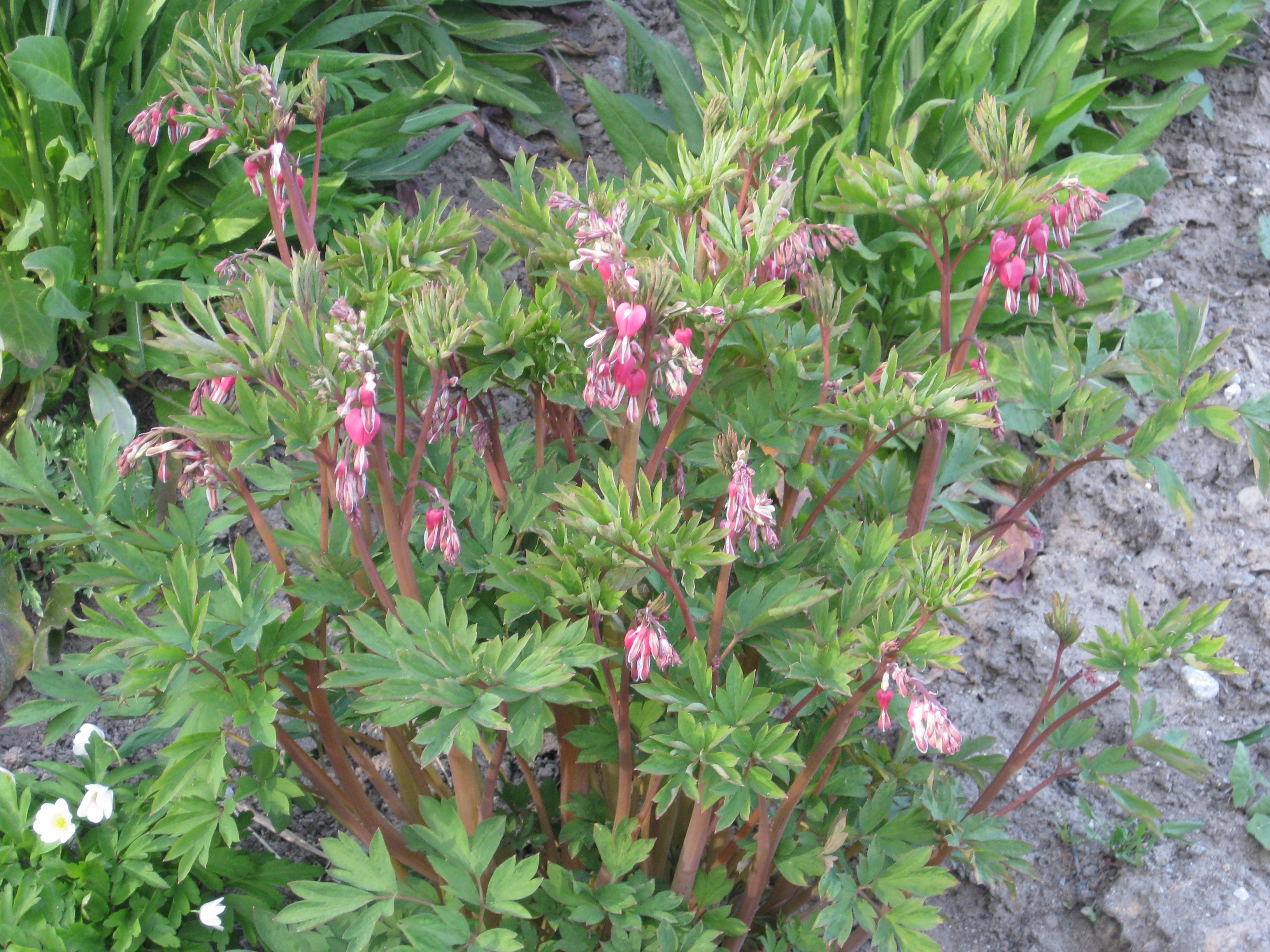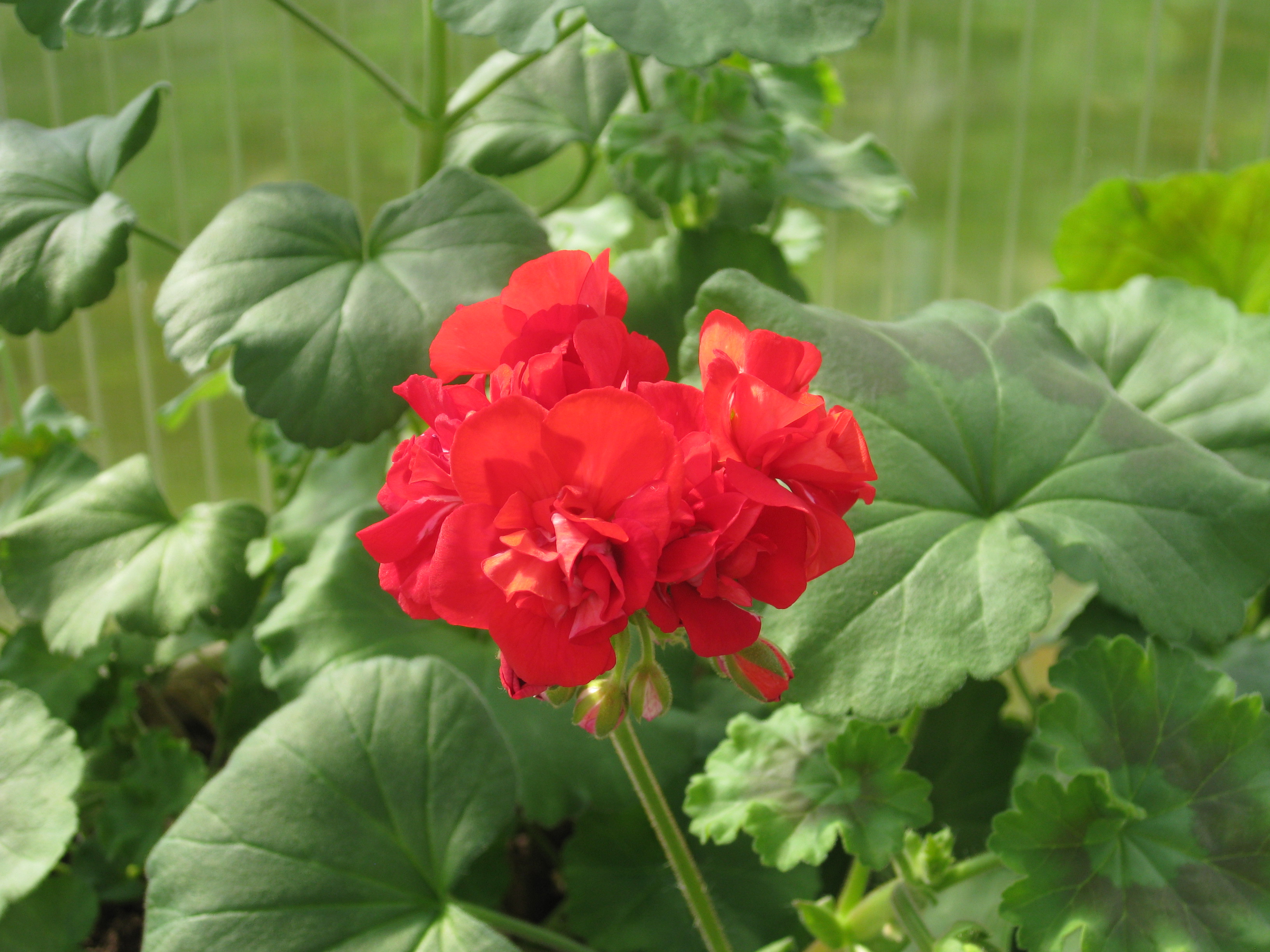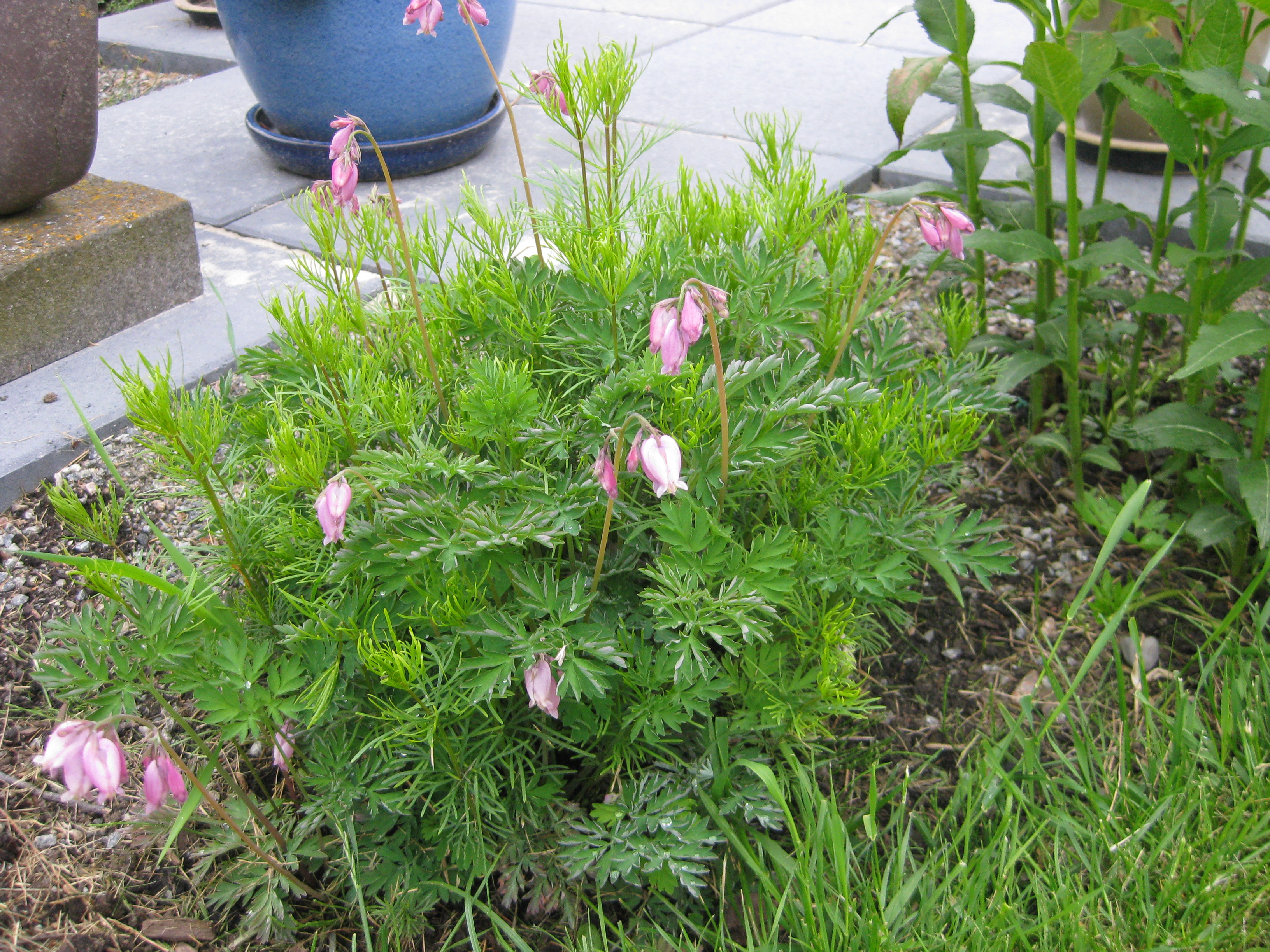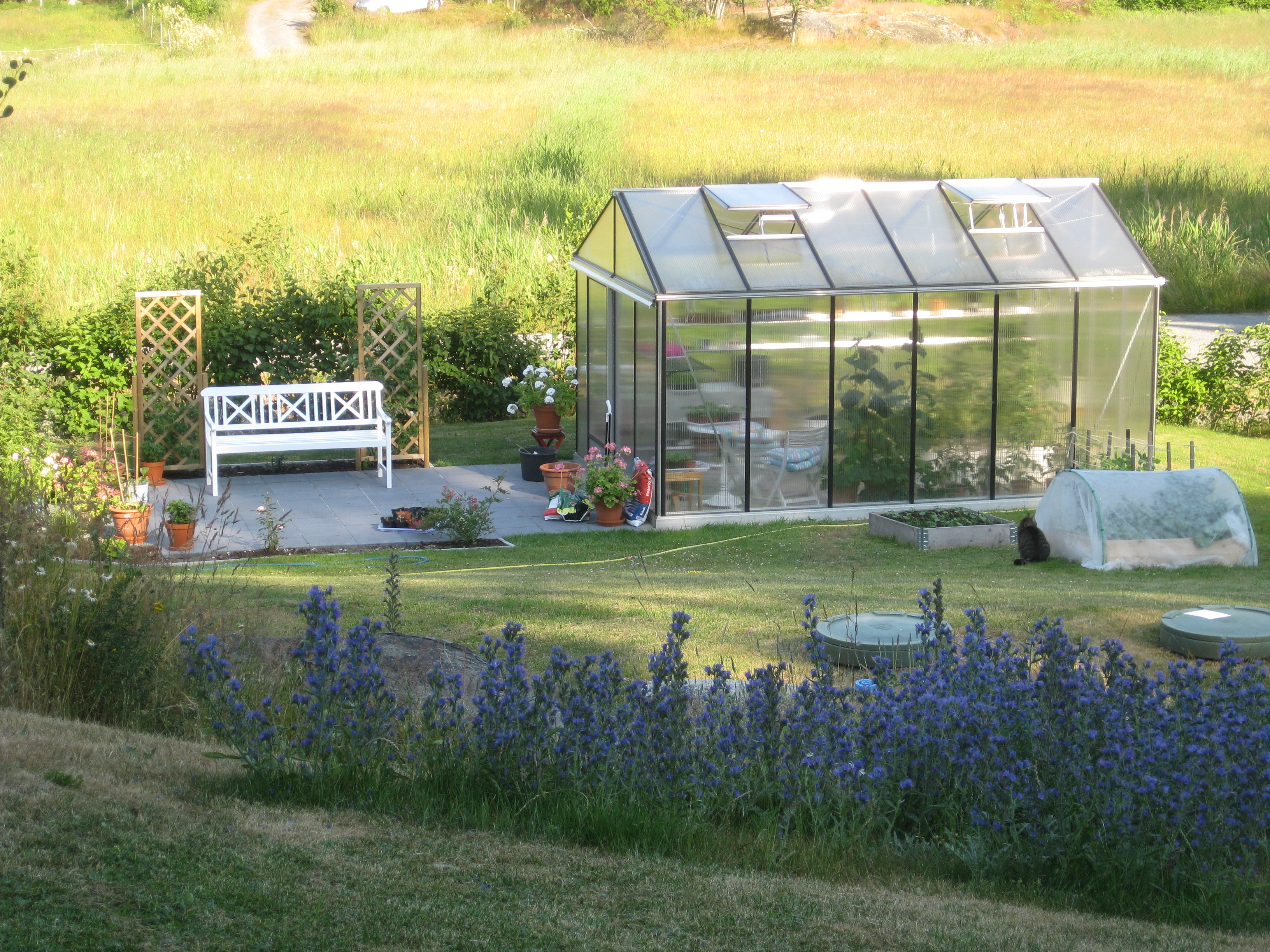 I växthuset blommar pelargoner och i rabatten håller Löjtnanshjärtan på att slå ut.