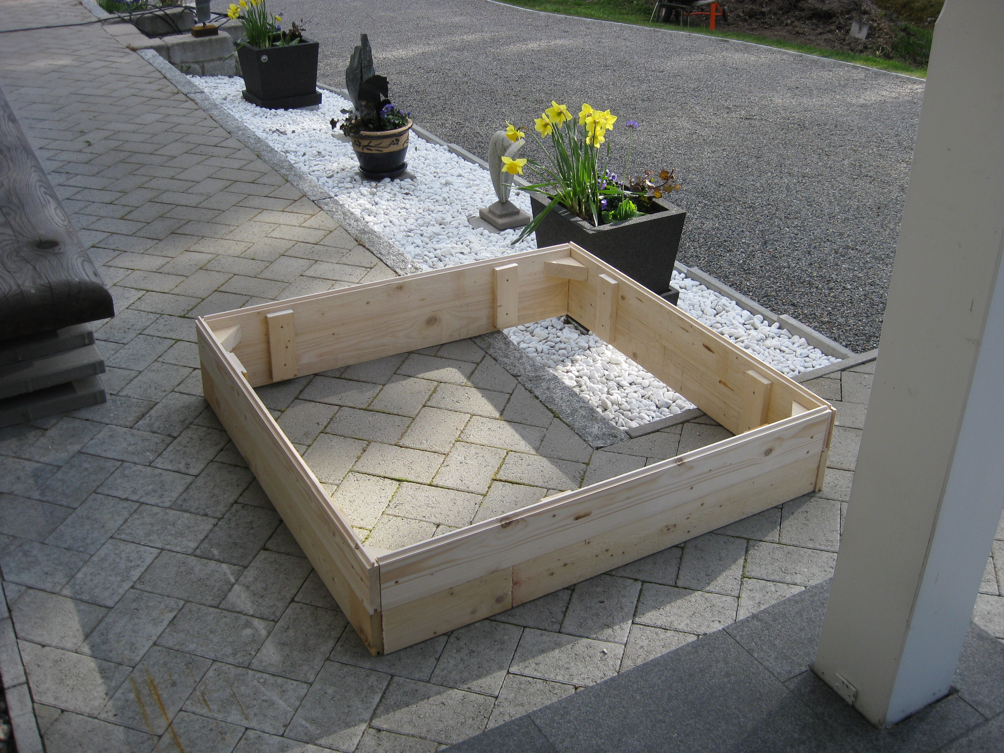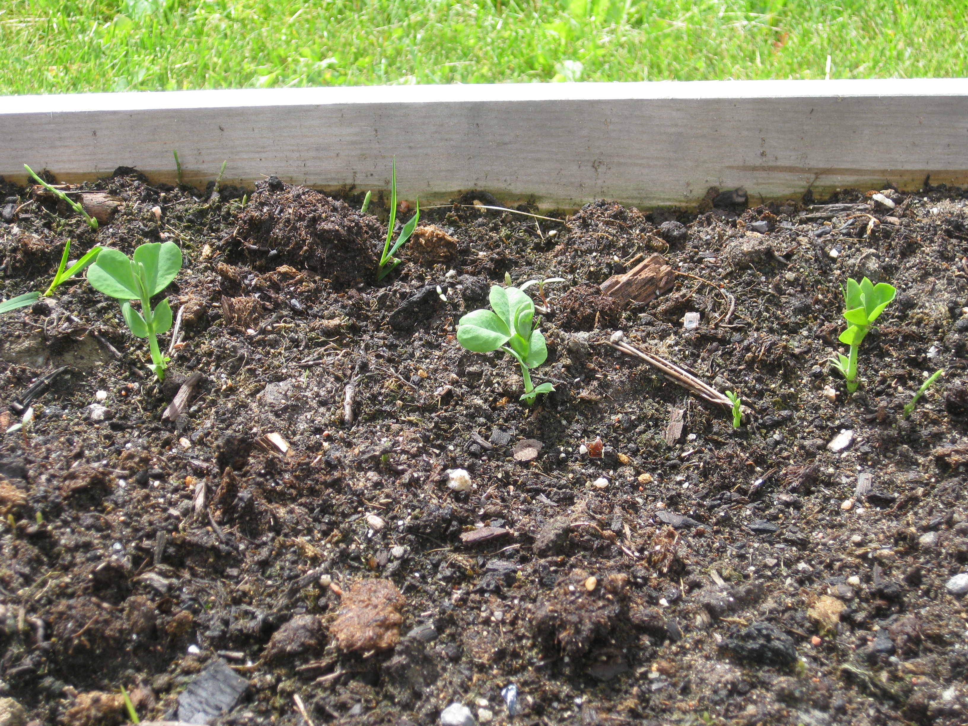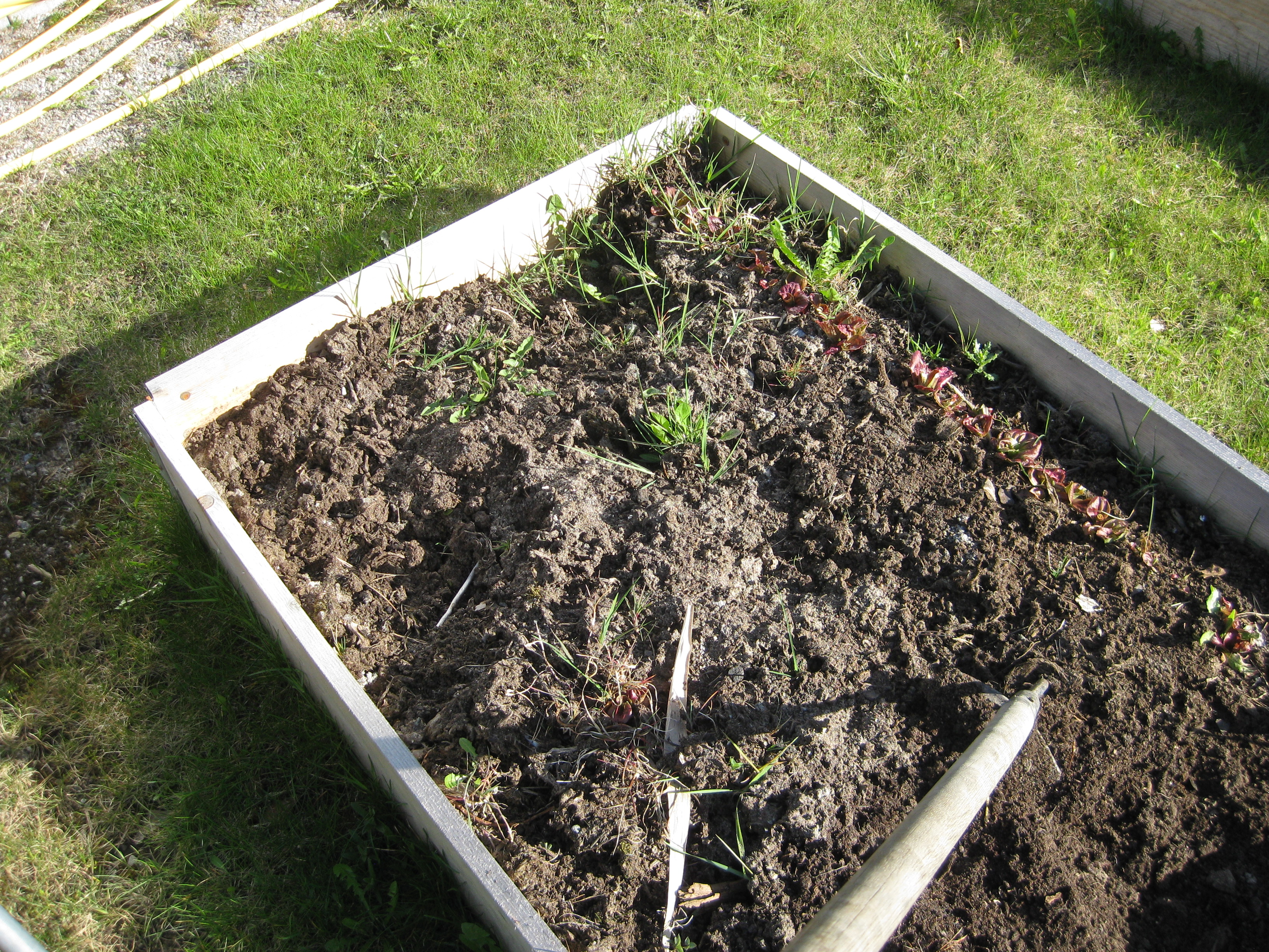 En rabatt och pallkragarna rensas från ogräs. Snart är det dags att så bönor.