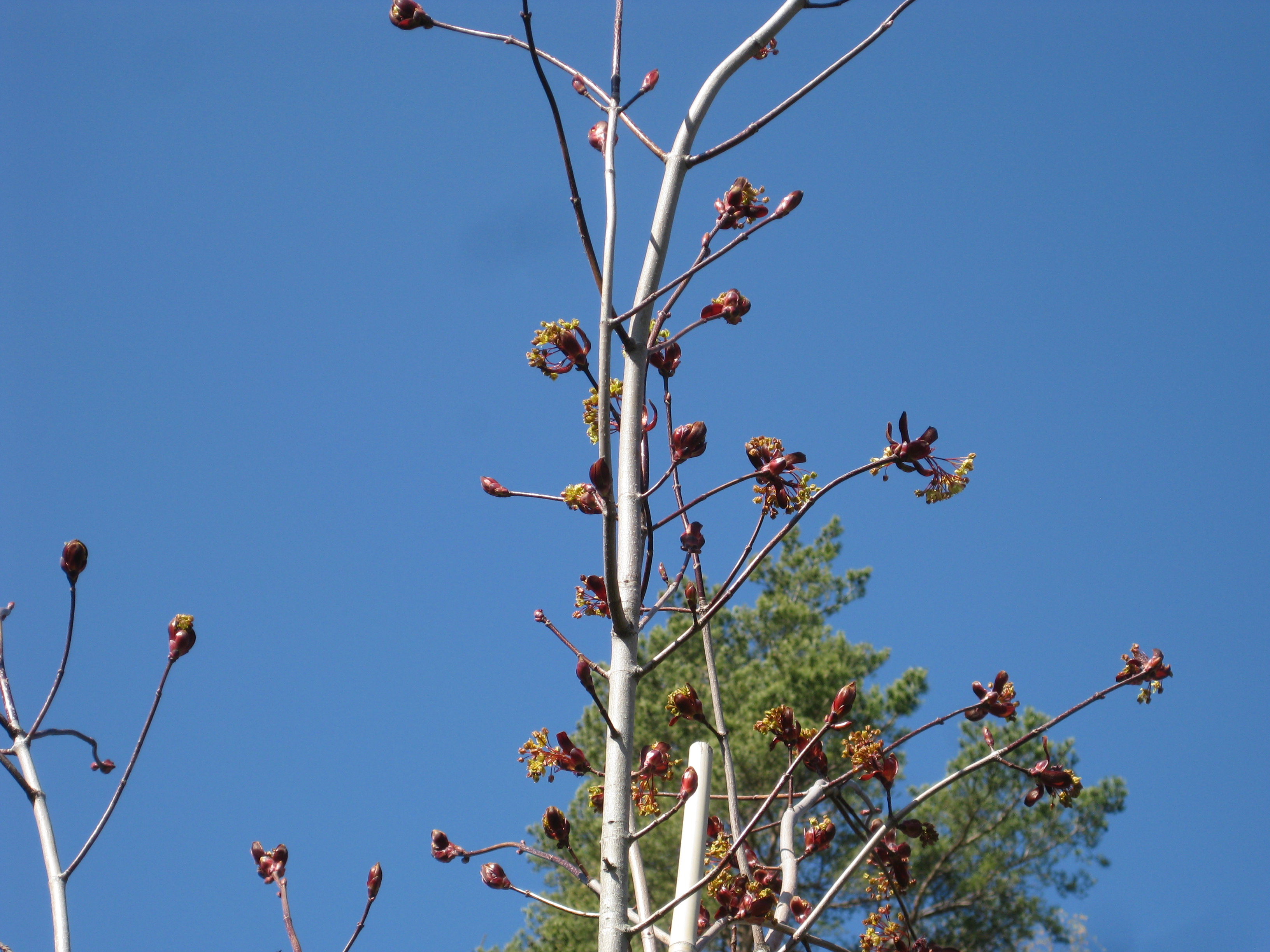 Blodlönnen håller på att slå ut, och detsamma gäller för pilarna, om än den ena av två pilar ser lite ankommen ut. Den får lite vatten så hoppas vi den piggnar till. För övrigt gödslar vi och lägger täckbark runt samtliga träd och buskar i trädgården. Fint!