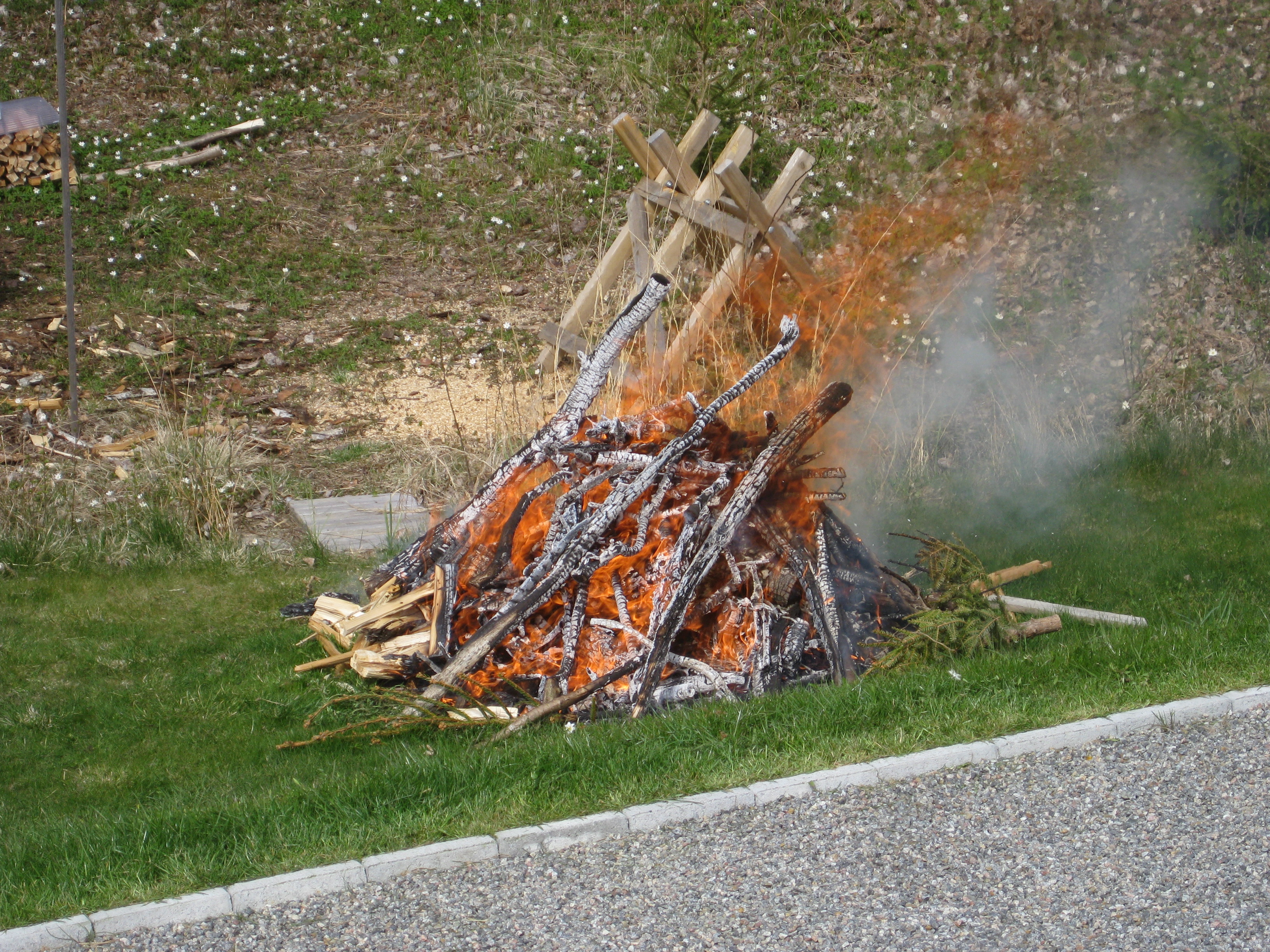 Perfekt dag att elda, då det för en gångs skull blåser åt ”rätt” håll.. Vi ogräsbekämpar i stenpartiet, och Katarinas omöjliga projekt avancerar en bit till.