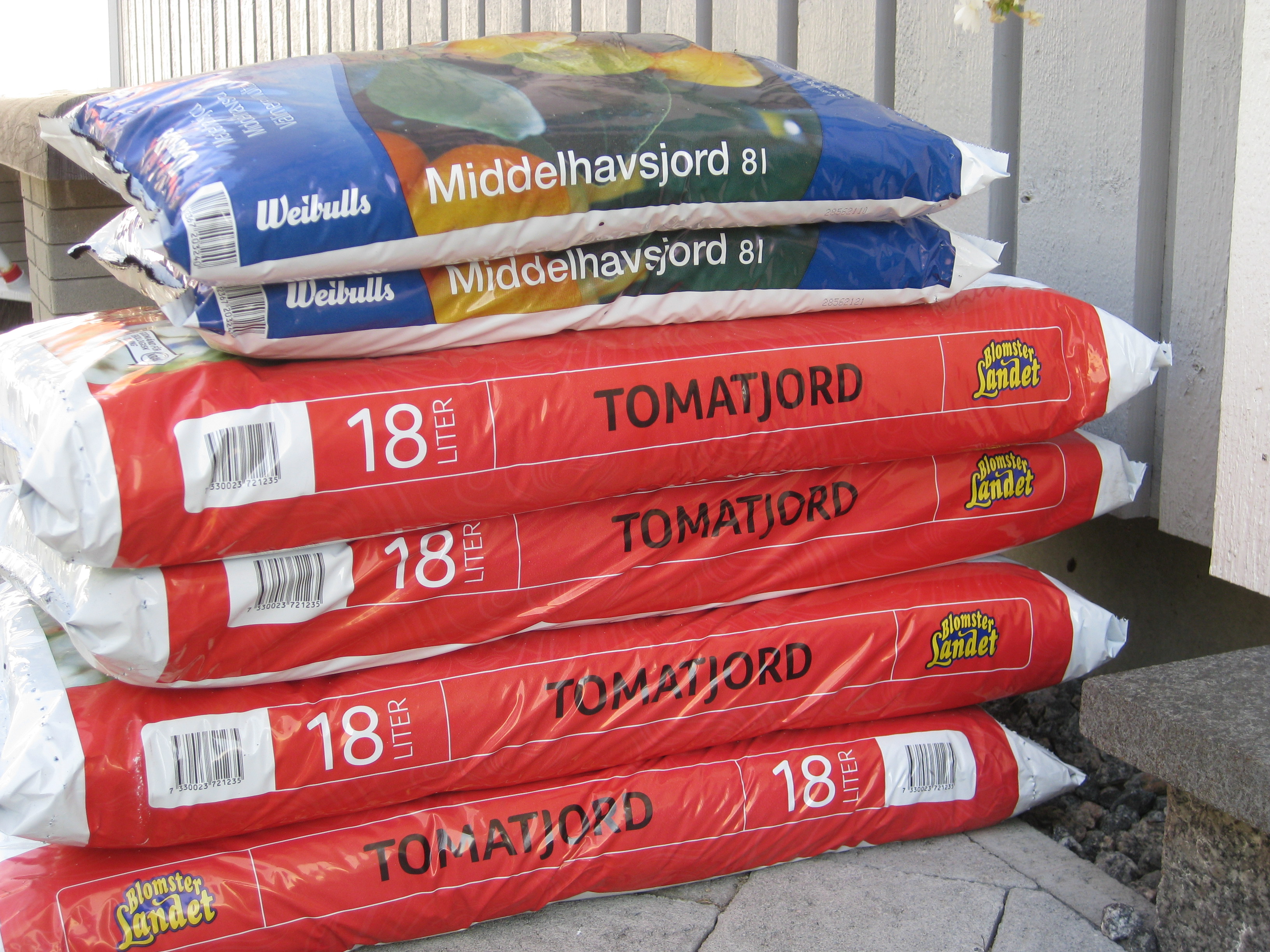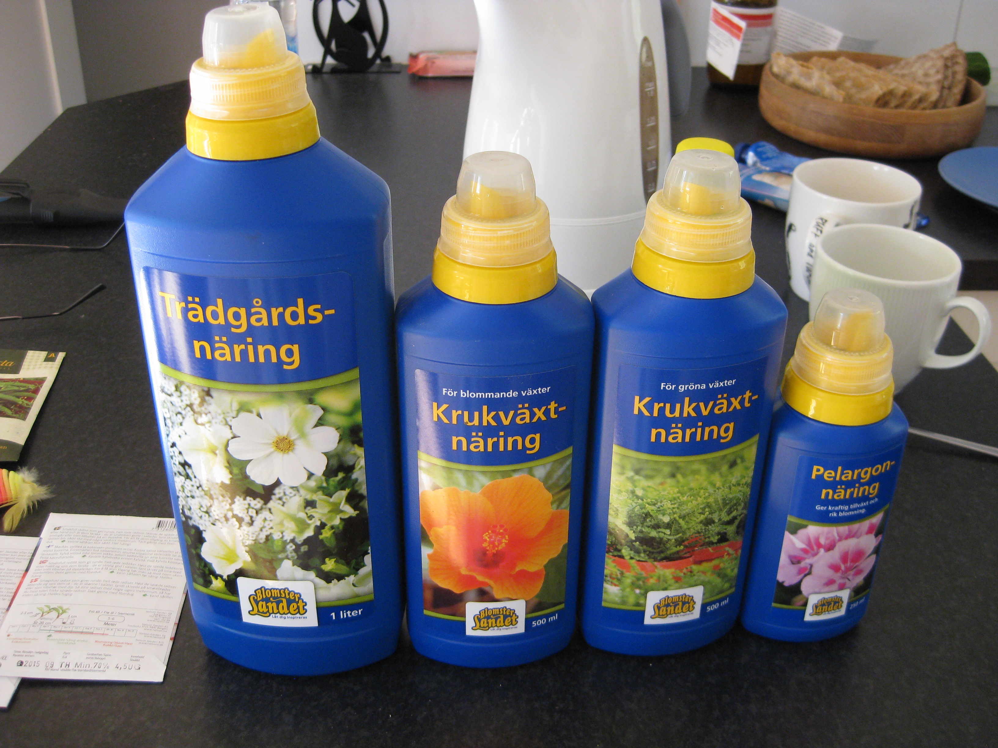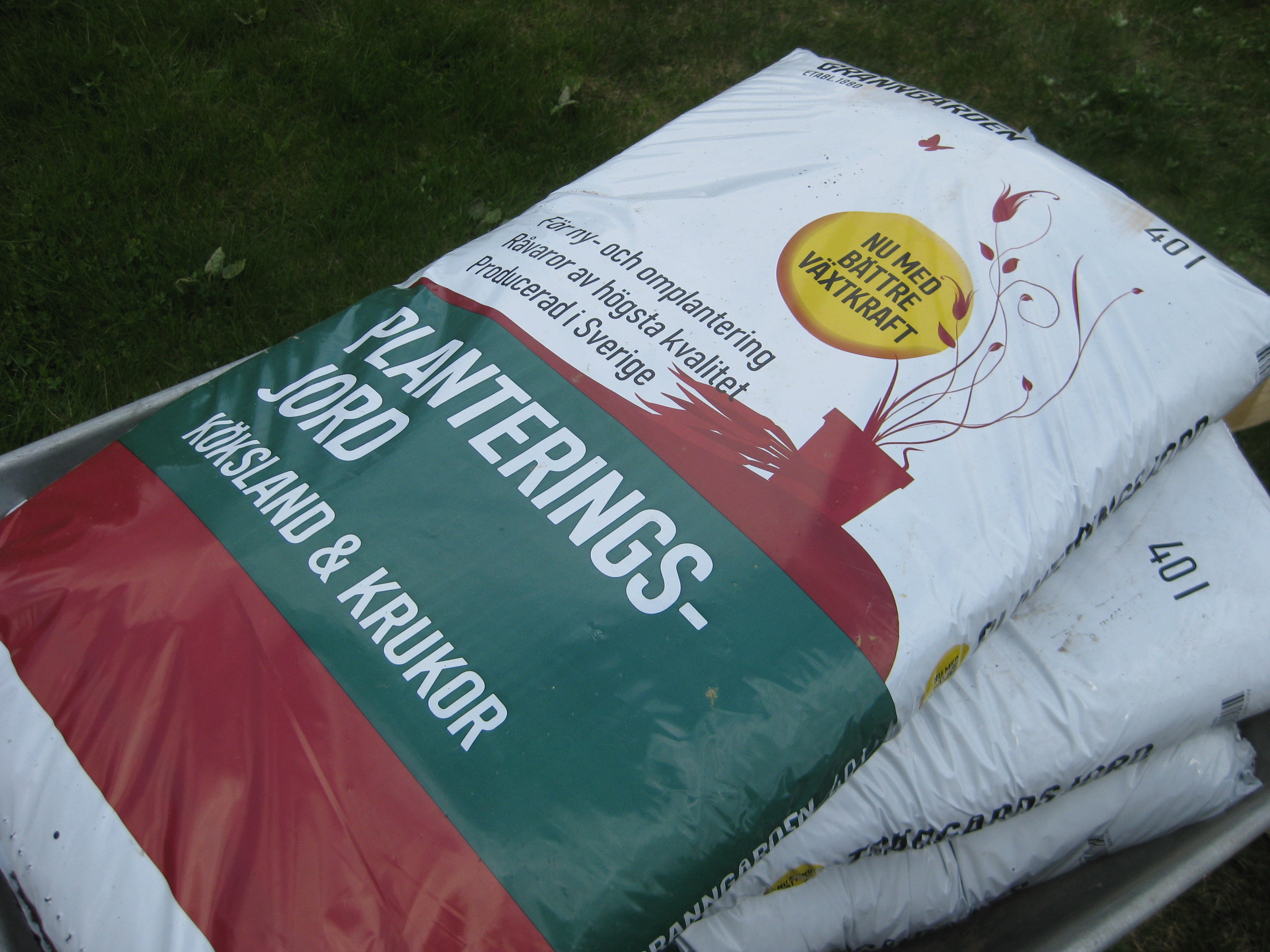 Vi laddar upp för kommande säsong. Hm. Växtnäring är en hel vetenskap. Krukväxtnäring är en sak, fast är det blommande växter ska de ha något annat, för att inte tala om Pelargoner… Samma sak när man ska köpa jord nuförtiden. Alla växter har sin egen jord. Var det möjligen bättre förr?
