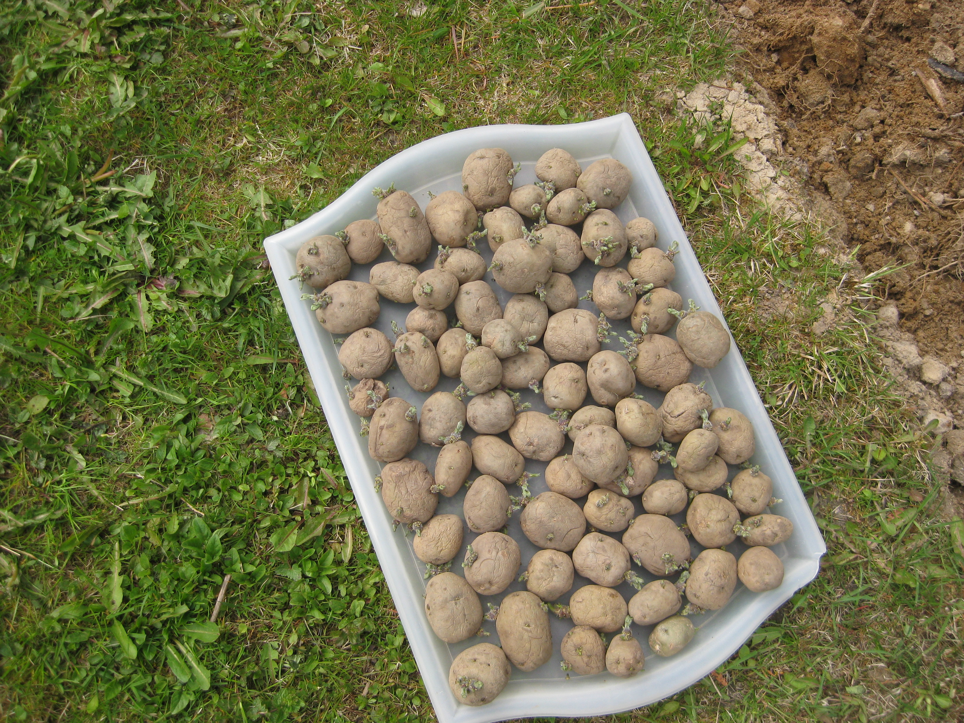 Vi noterar ogräs i stenläggningen vid växthuset som behöver bekämpas! Katarina gräver potatisland, och Håkan tillverkar en pallkrage!