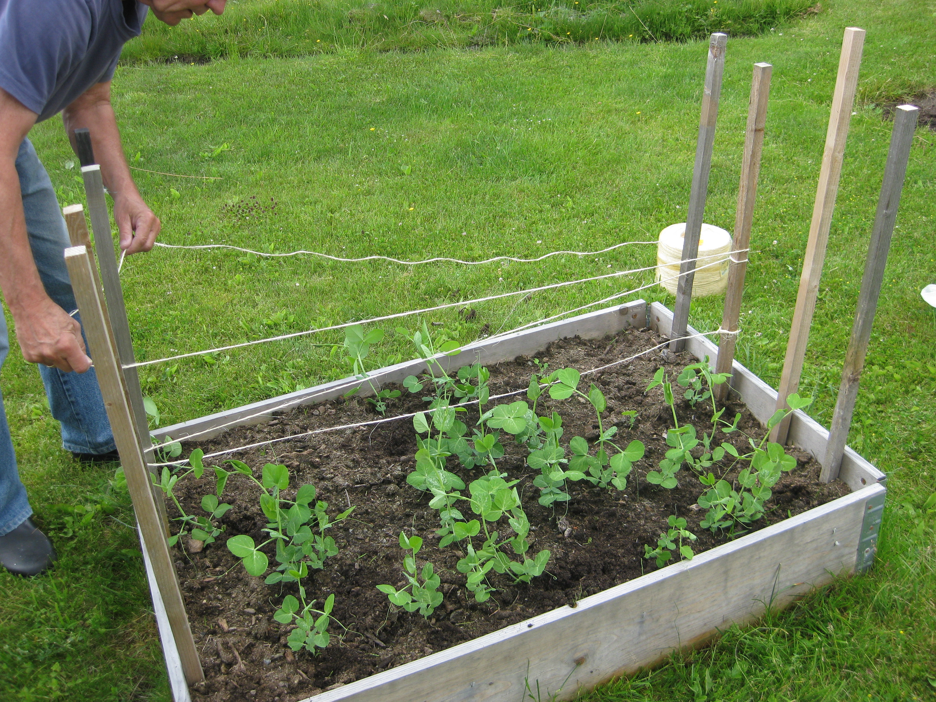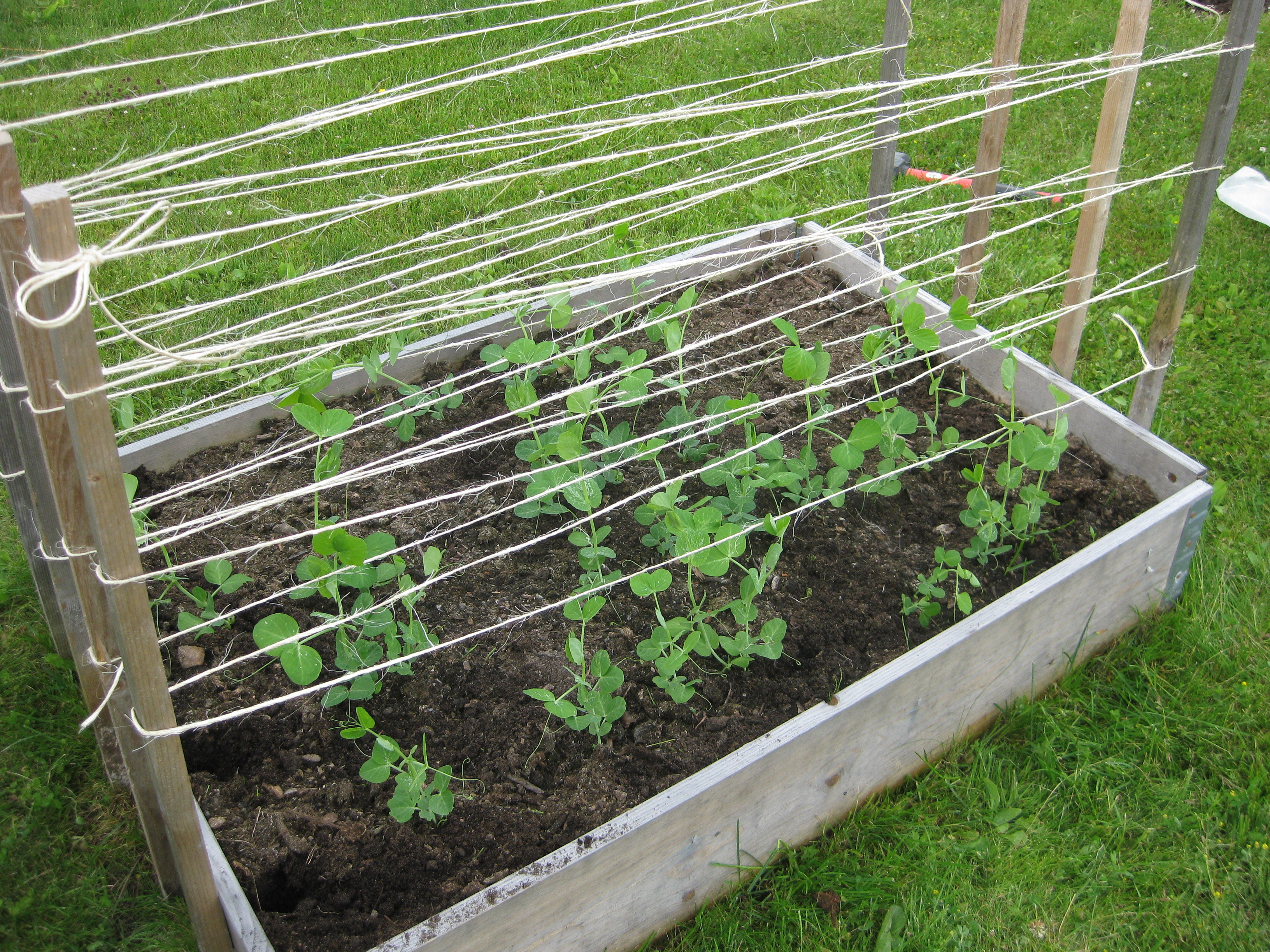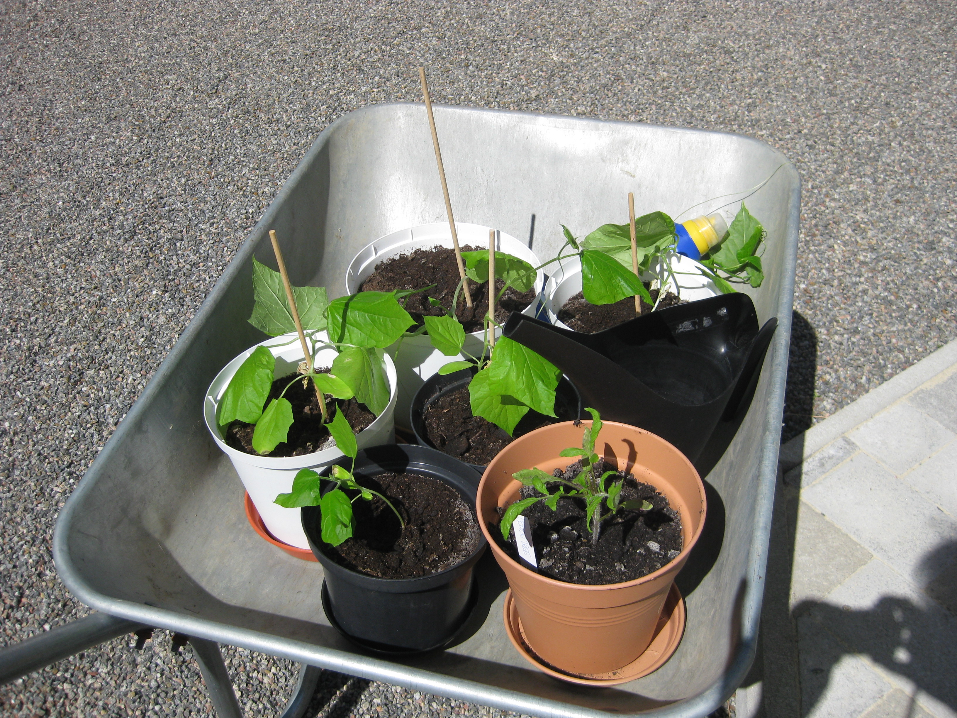 Squash och gurka är på gång i växthuset, liksom Stockrosor. Vi sätter upp stöd för våra Haricots verts i pallkragen. På eftermiddagen kör vi teamwork på terrassen! 🙂
