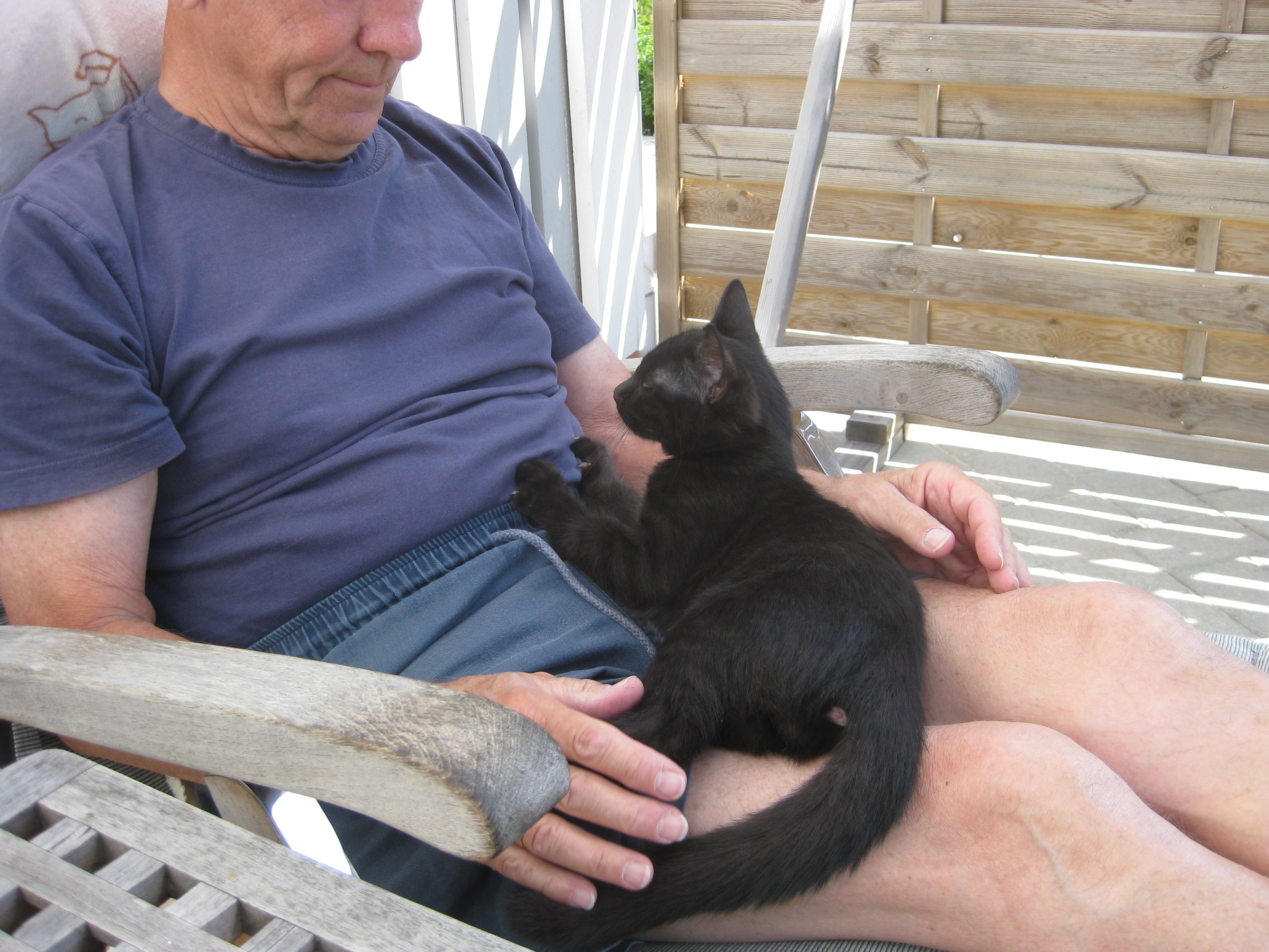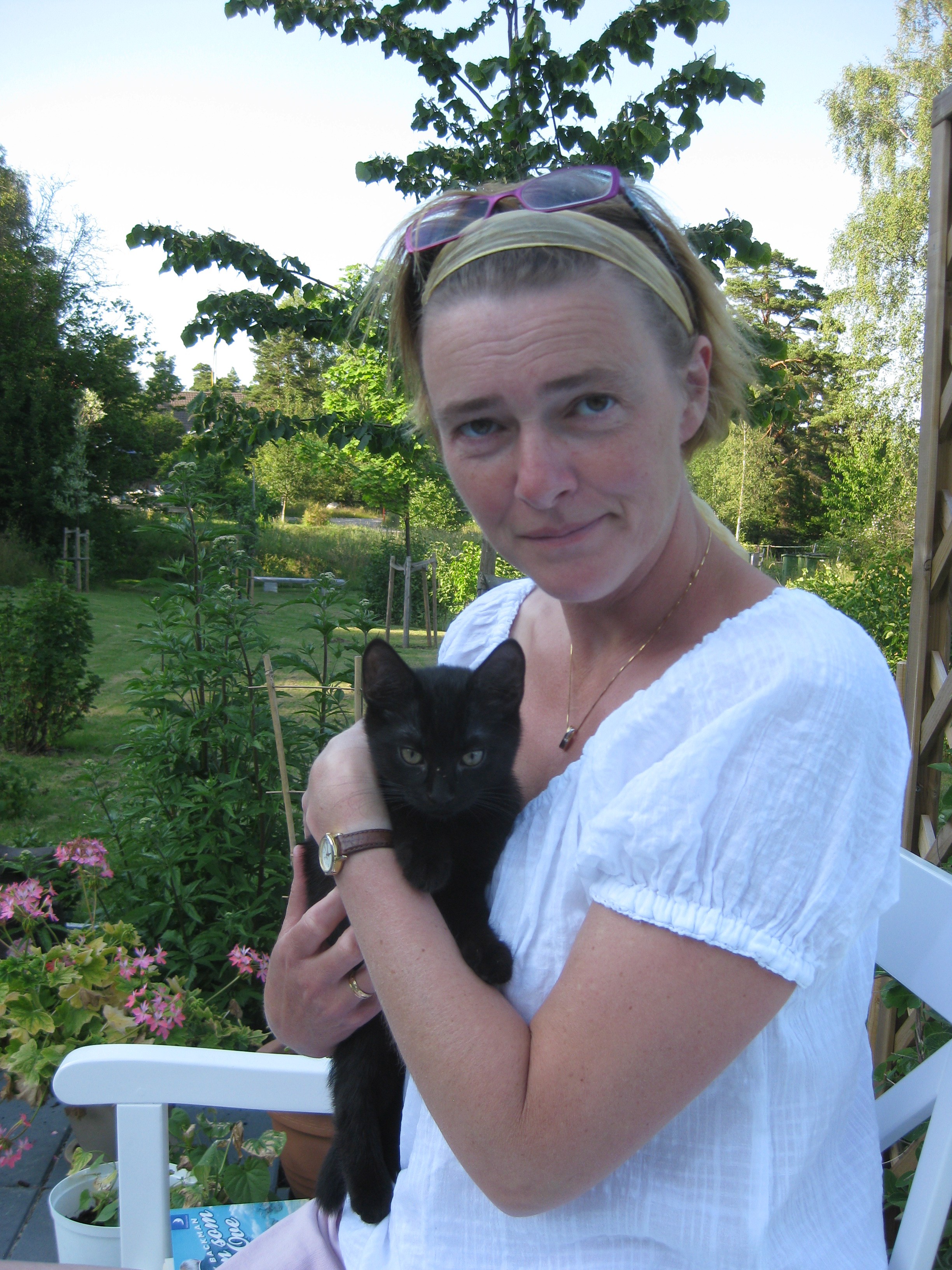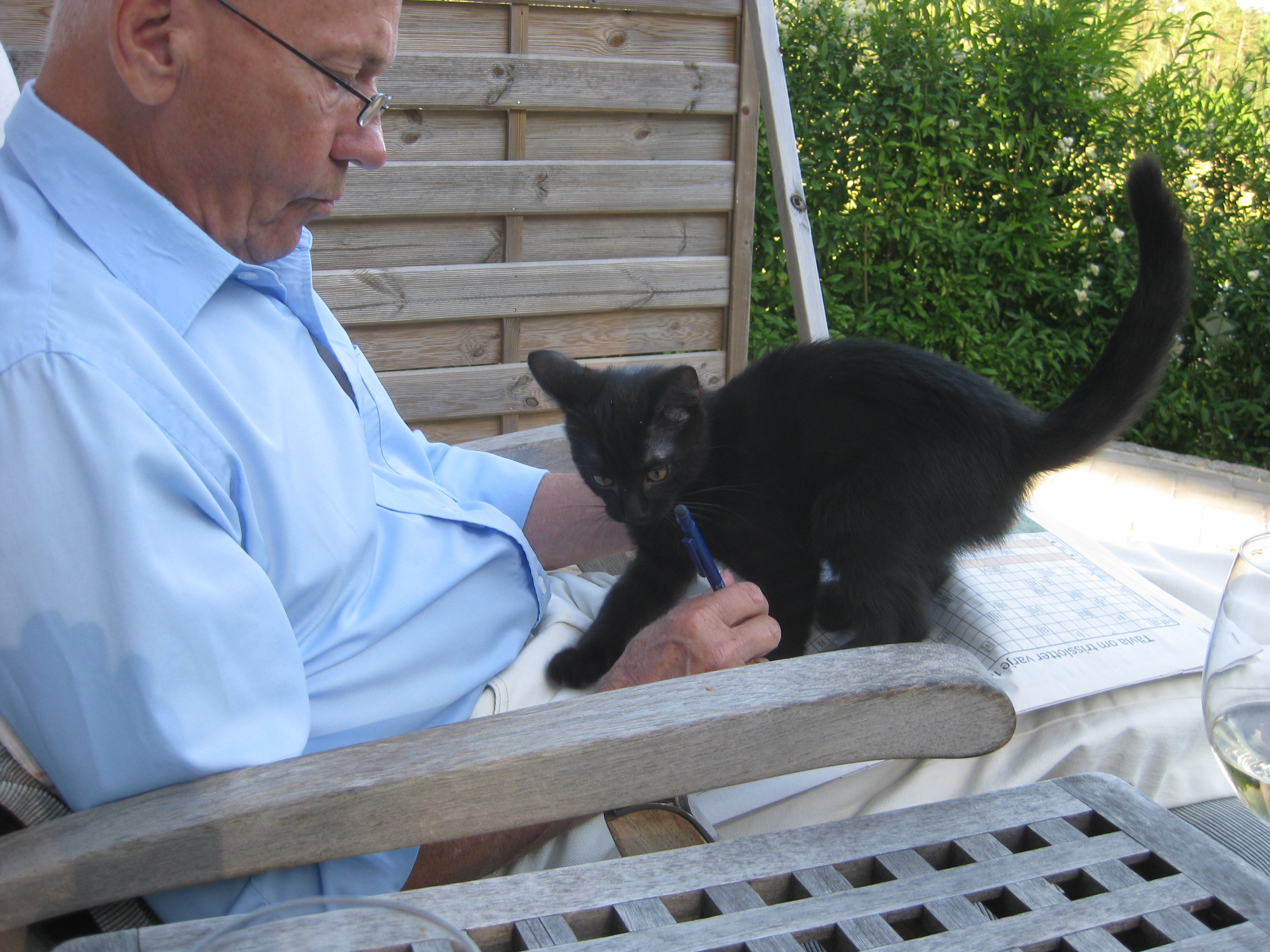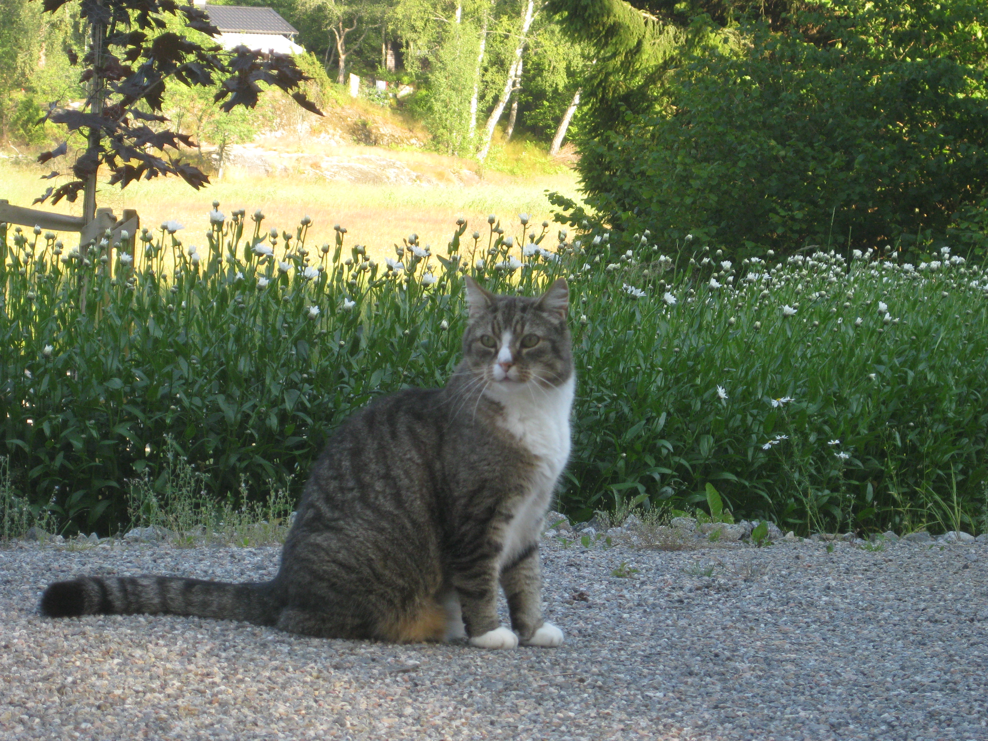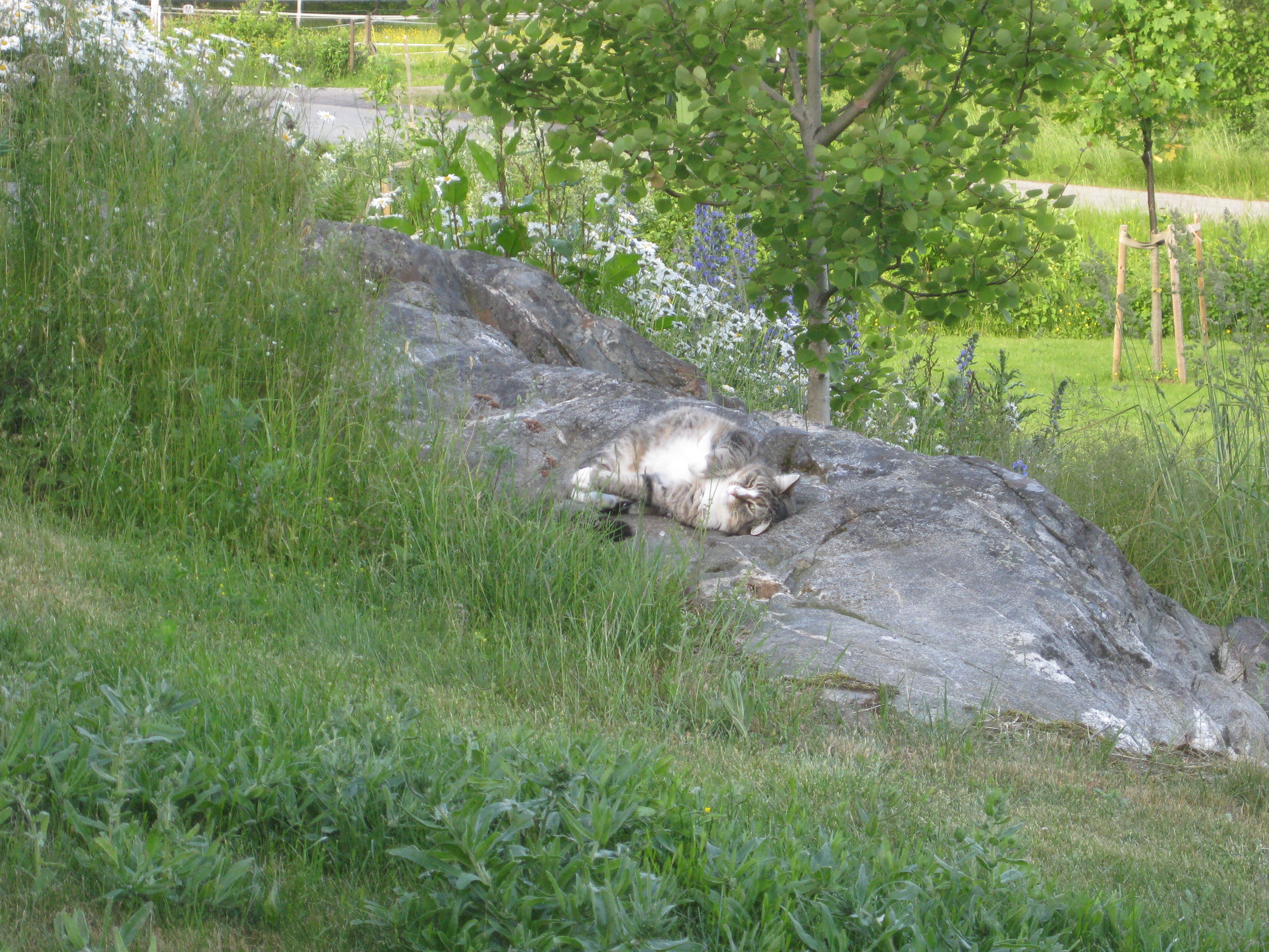 Varierande uppgifter i trädgården: kela med kattunge, bära verktyg, klättra i träd, göra färdigt stenkant, beundra prästkragar, städa berget, fotografera, mala vass, kela mera med kattunge… Moses far runt som Jehu i trädgården. Full fart upp i ett högt träd, och full fart ner – han borde ha slagit ihjäl sig, men katter verkar alltid landa på fötterna. Emellertid blir matte lite skärrad av detta upptåg, och bestämmer att kissen får vara inne på eftermiddagen.